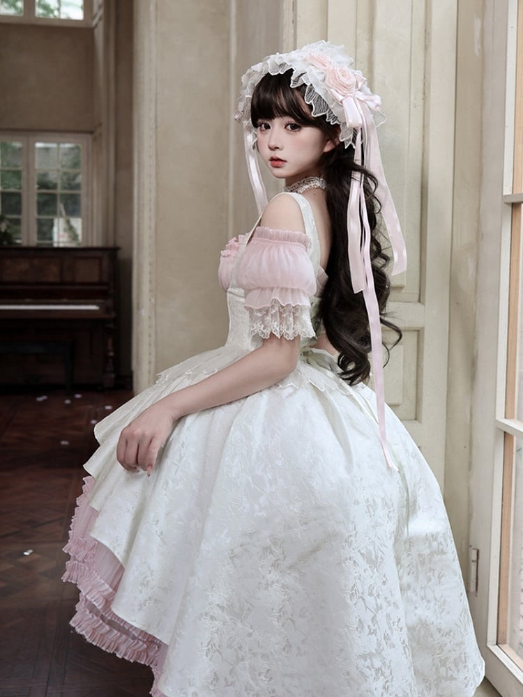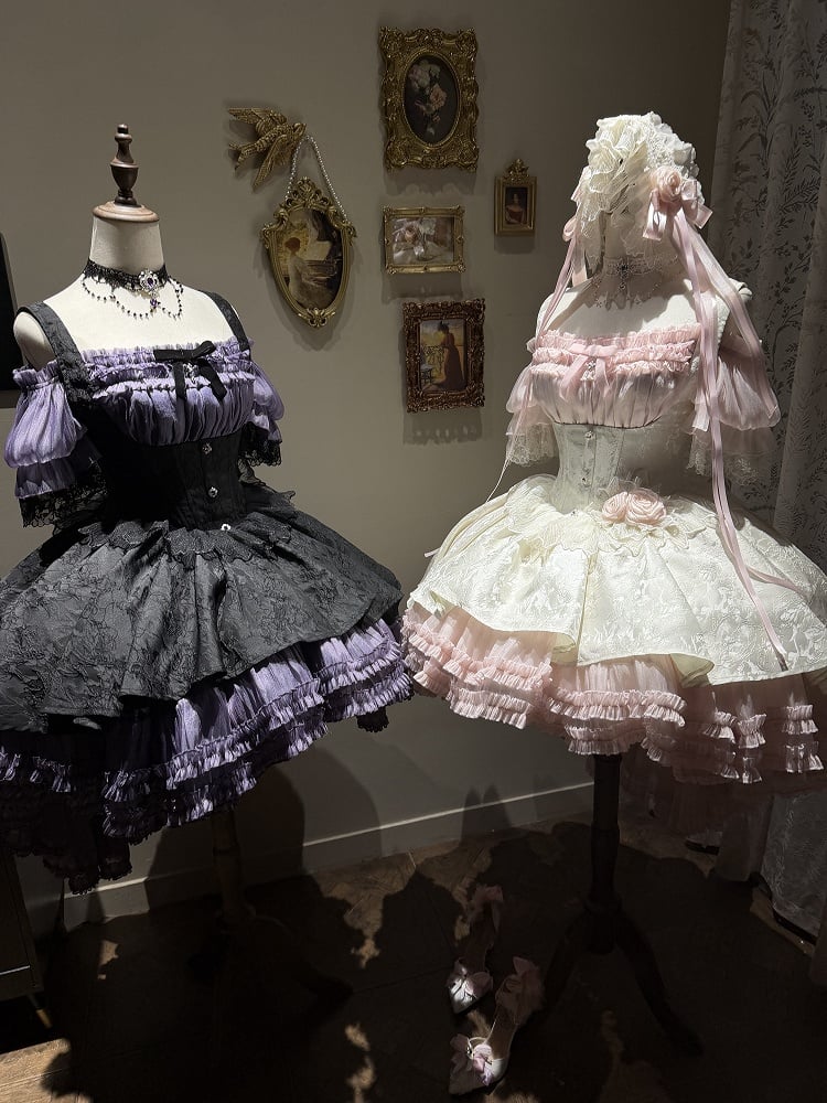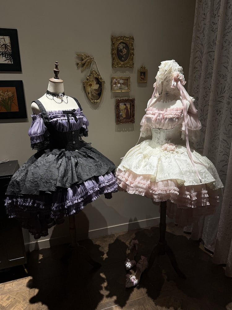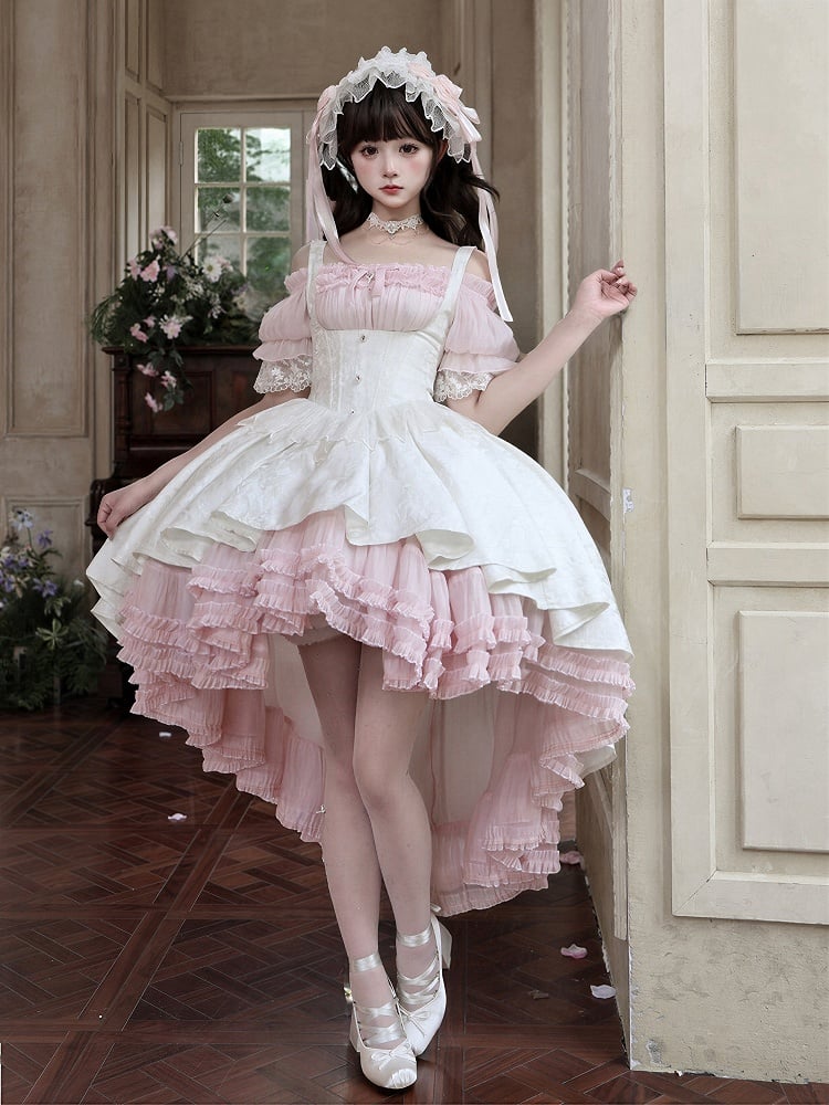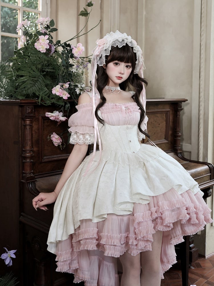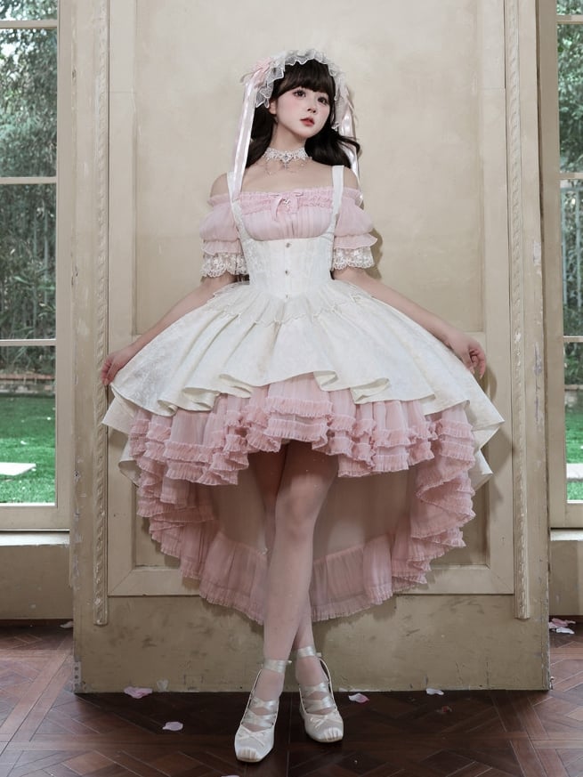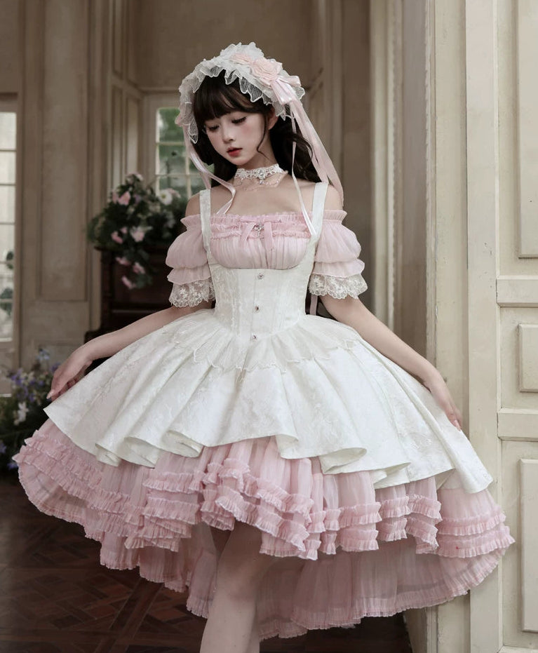 ❤︎【4月28日予約締切】ピンク×ホワイトエレガントゴシックロリータコルセットレイヤードJSKドレス+オフショルダーレースパフトップス❤︎ ⚠️人気商品のためお届けに4ヶ月ほどかかってしまう場合がございます