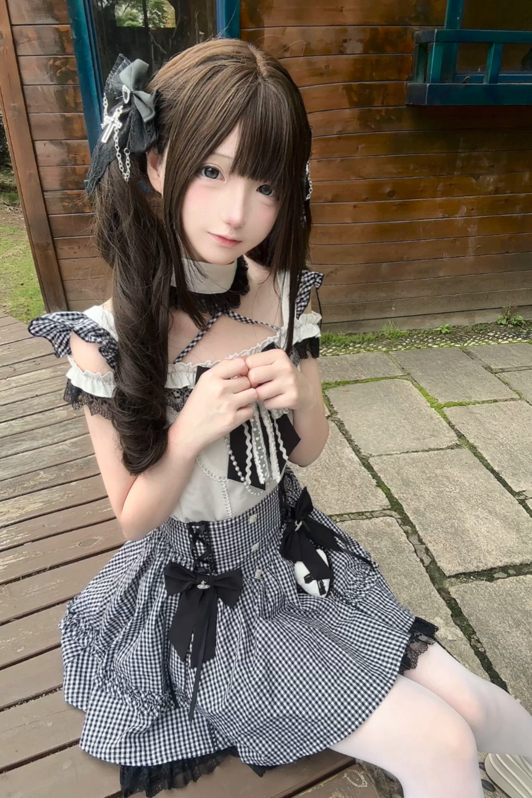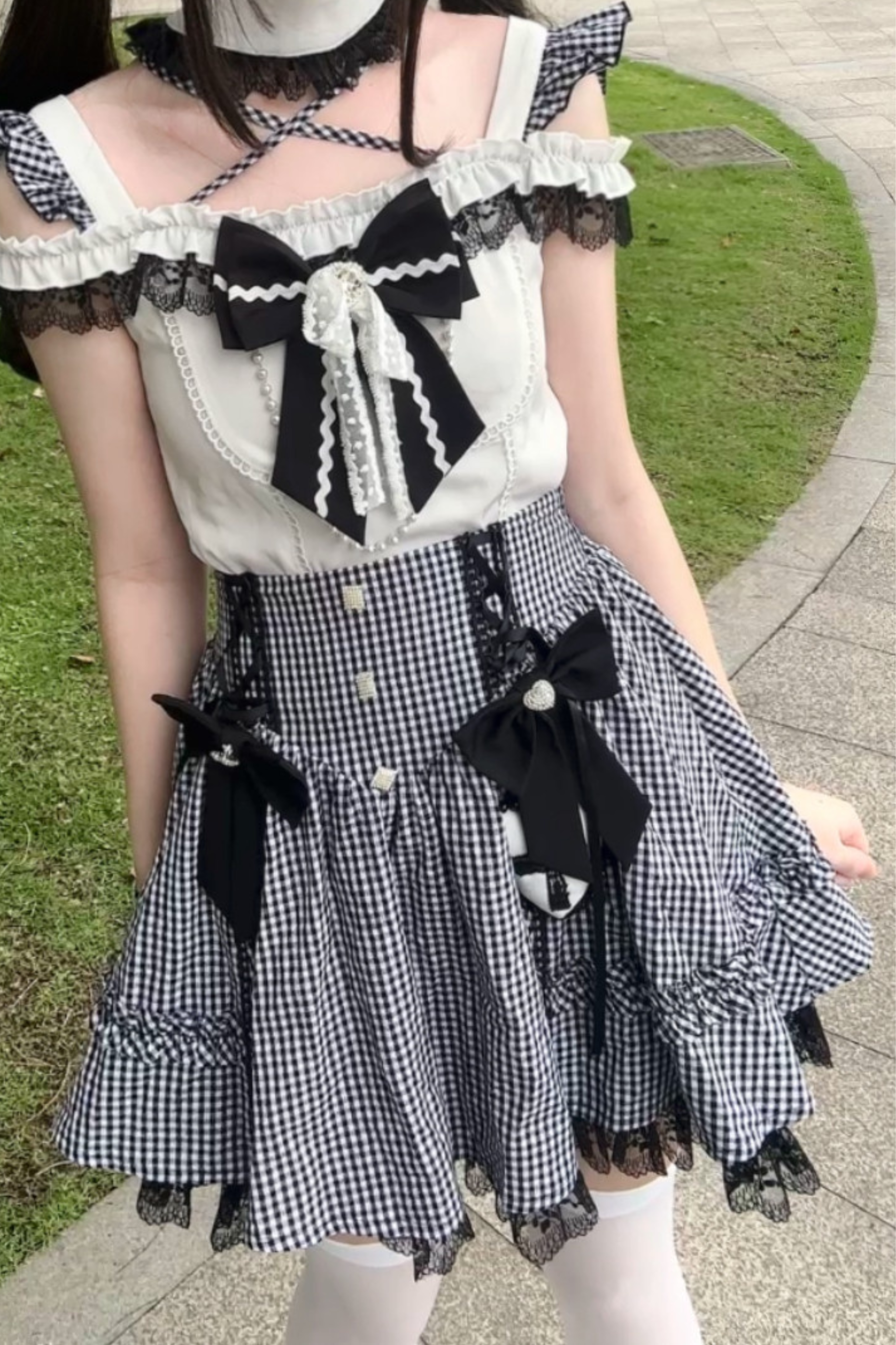 チェックオフショルダートップス+スカート