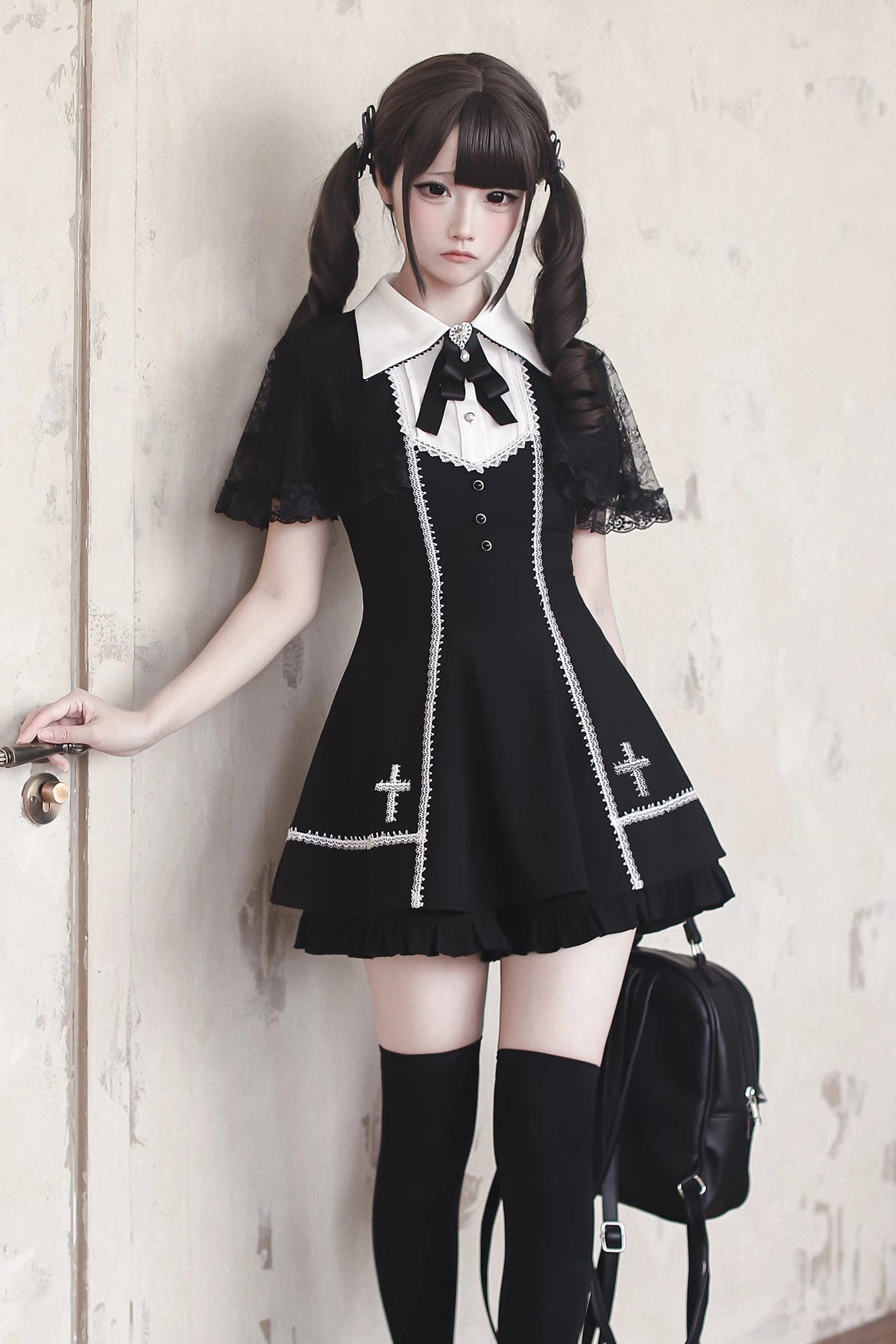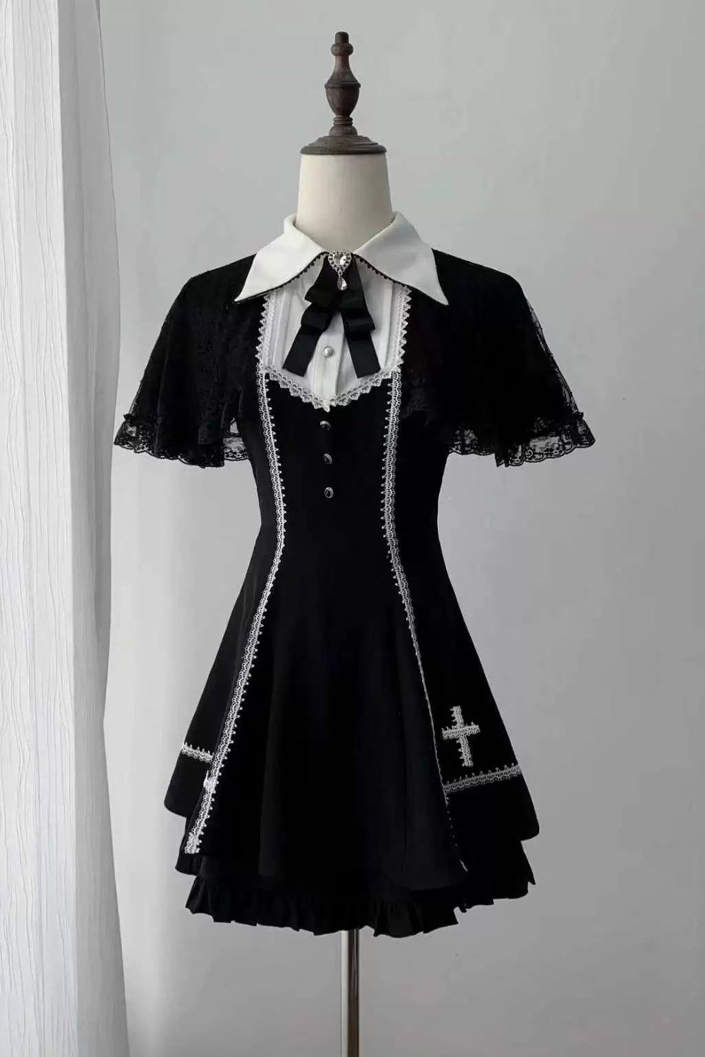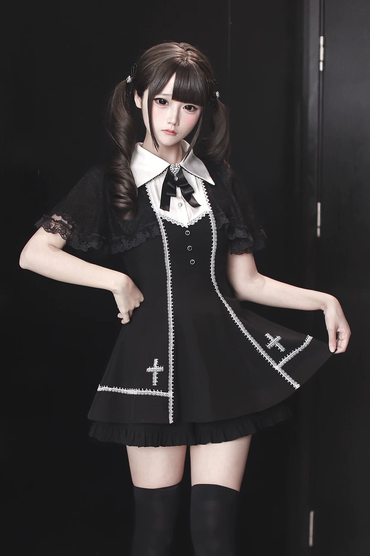 ❤︎【4月29日予約締切】ブラックゴシックケープスリーブクロスディテールリボンカラードレスセットアップ❤︎                                                ⚠️人気商品のためお届けに2ヶ月ほどかかってしまう場合がございます