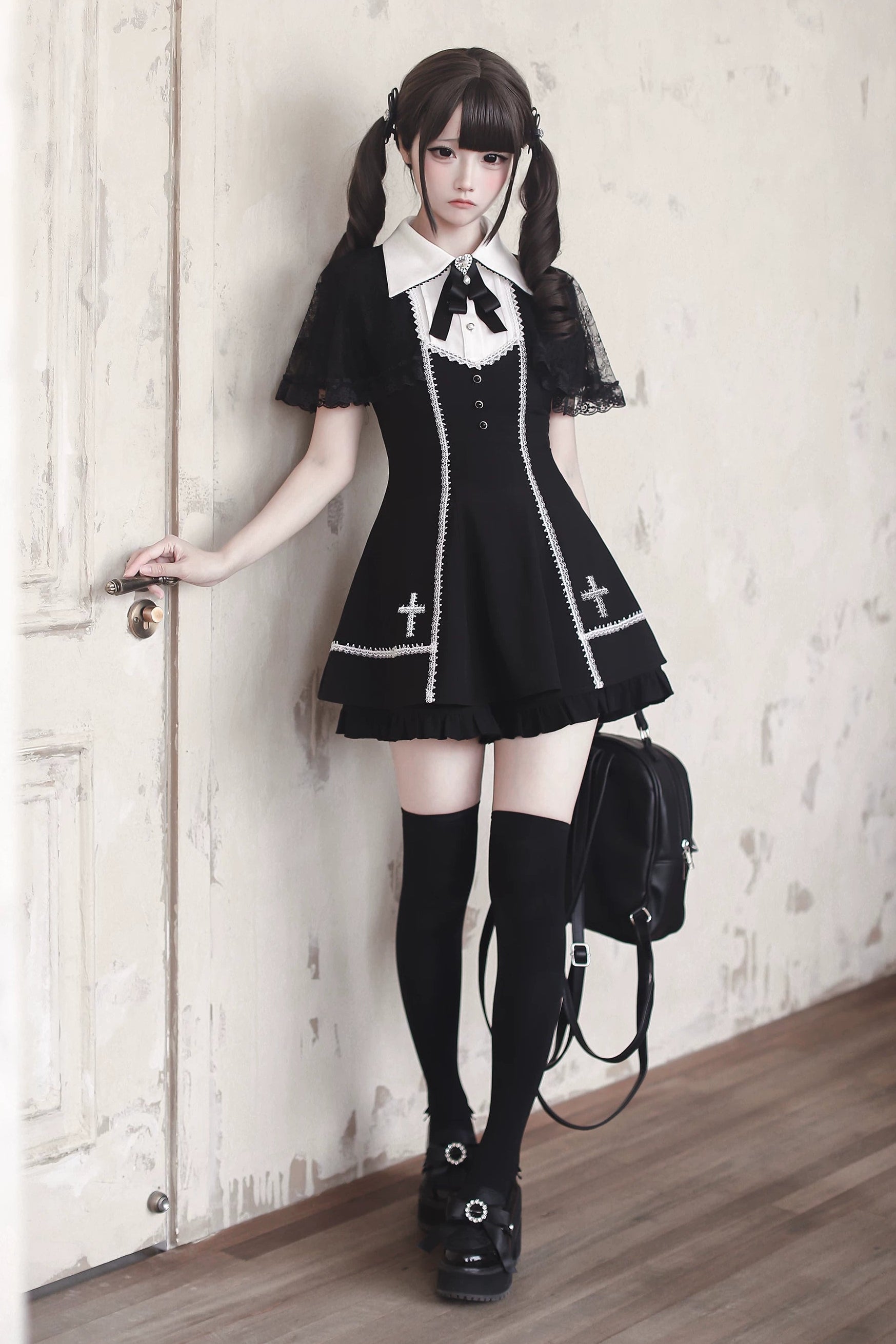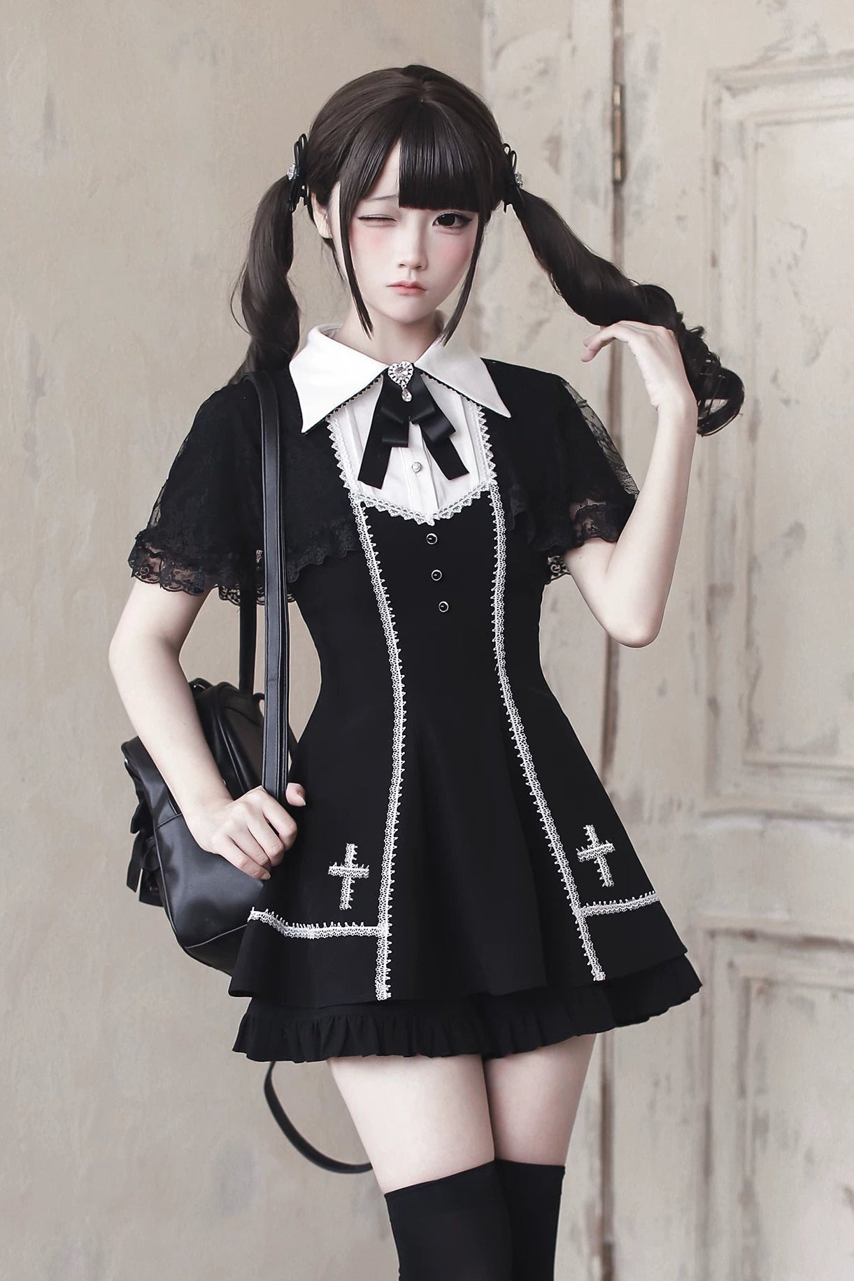 【4月29日予約締切】ブラックゴシックケープスリーブクロスディテールリボンカラードレスセットアップ