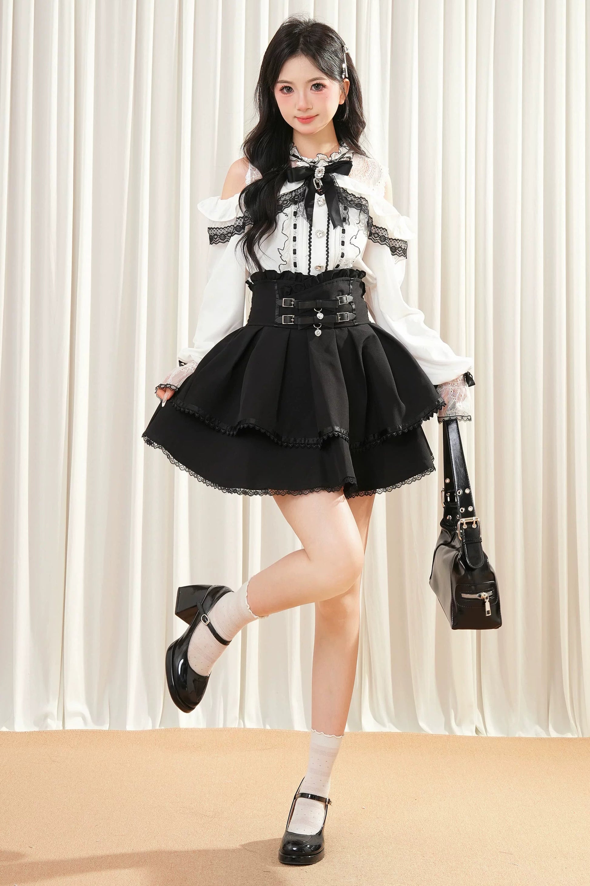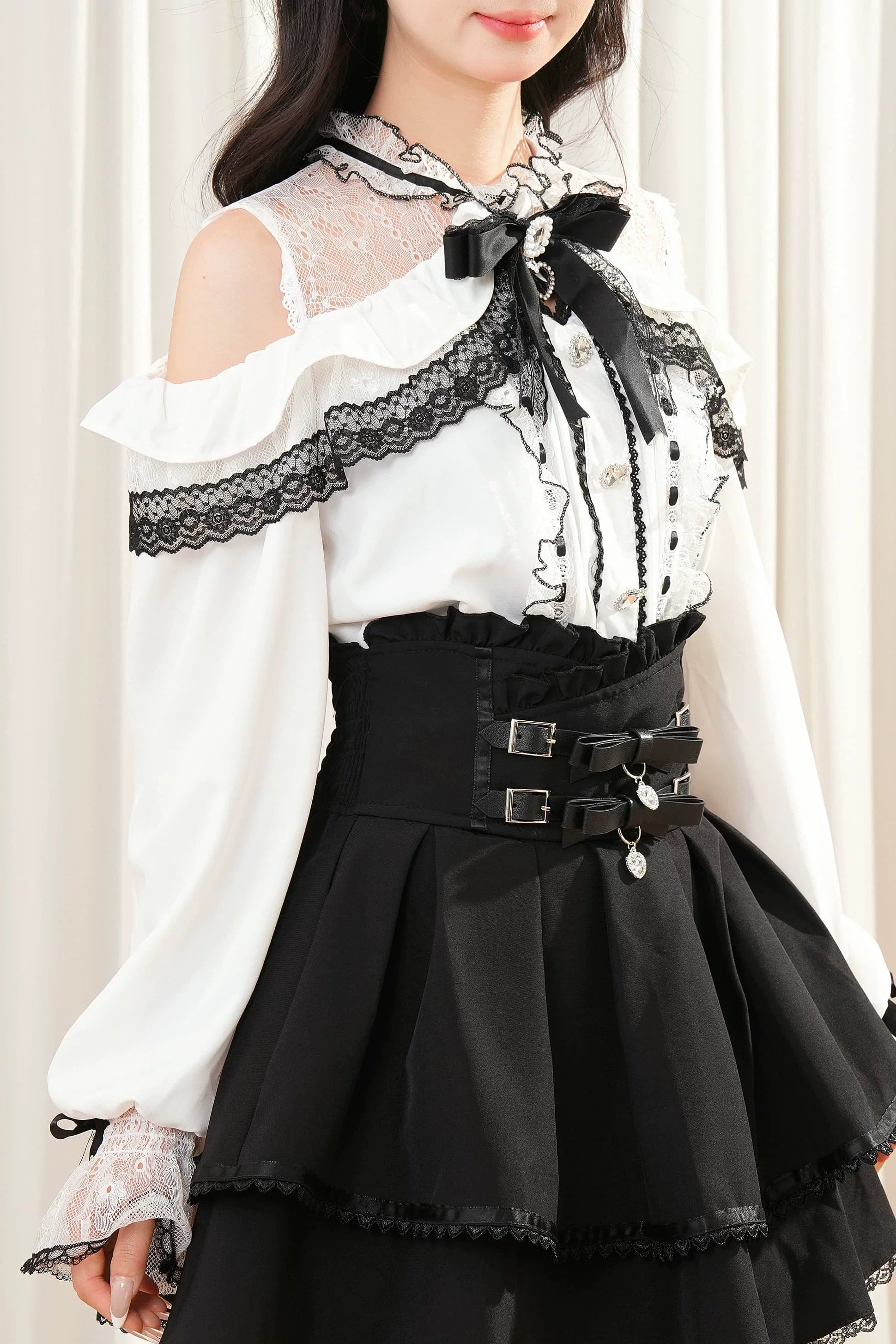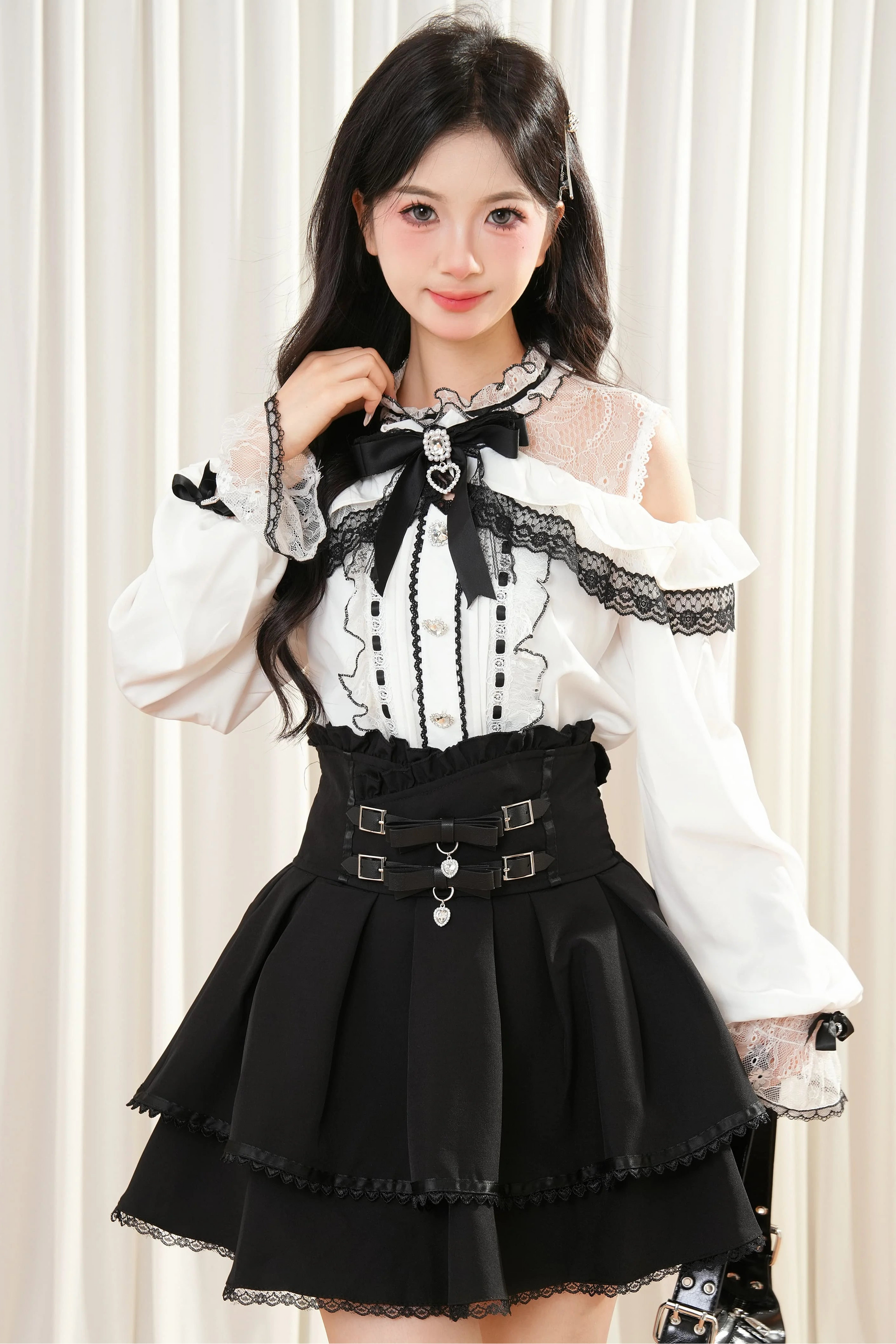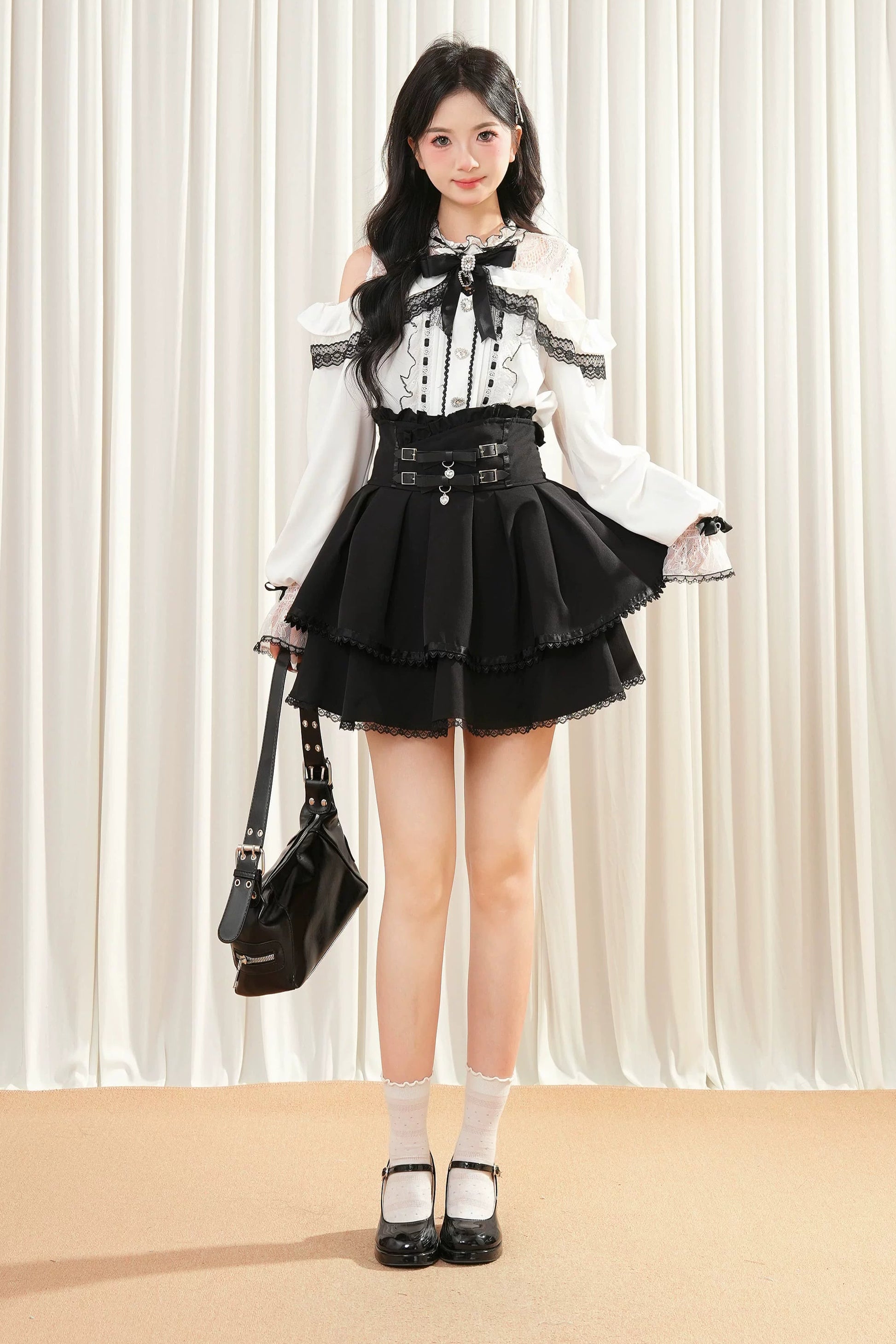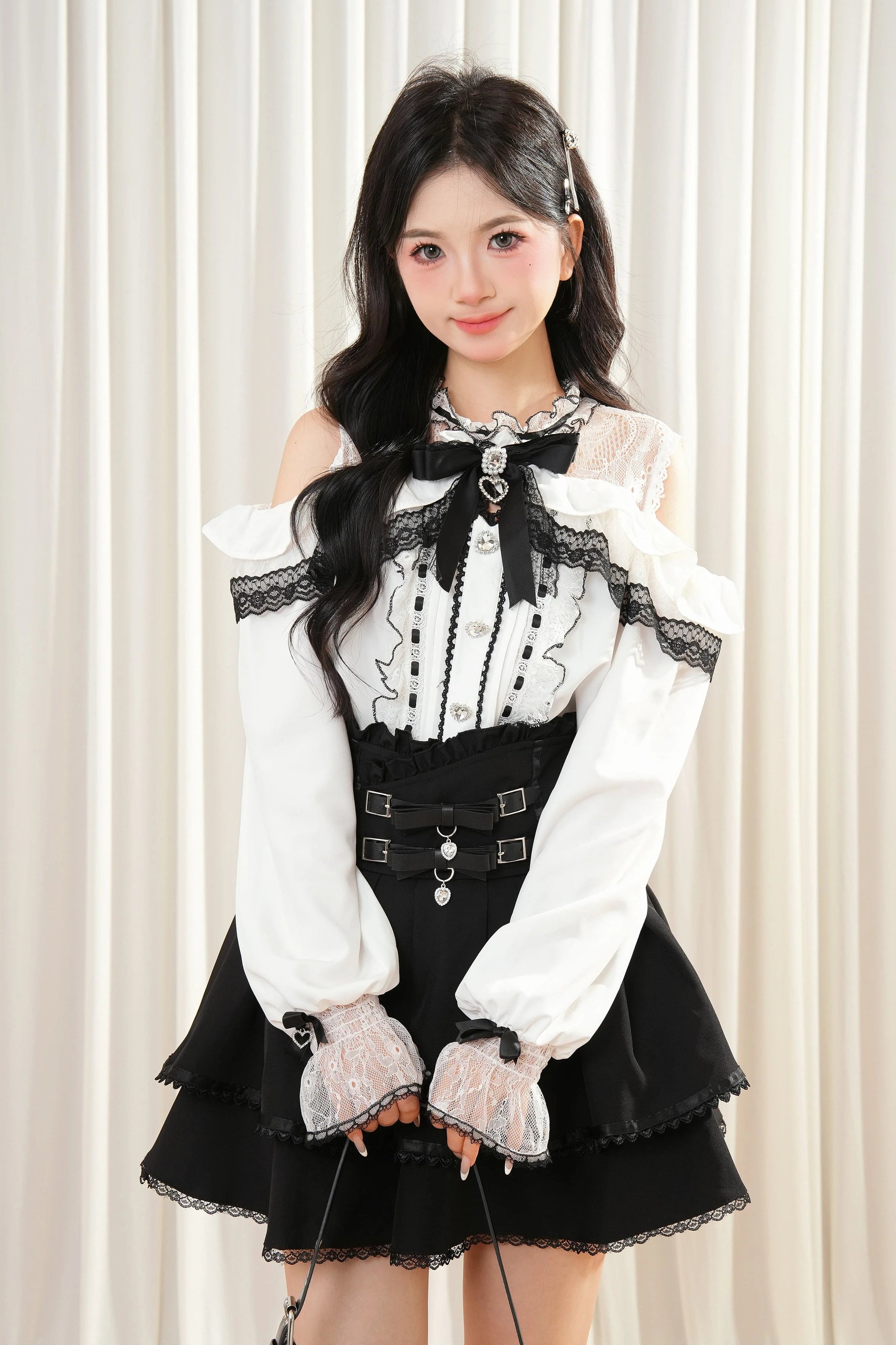 レースリボンオフショルダートップス+スカート
