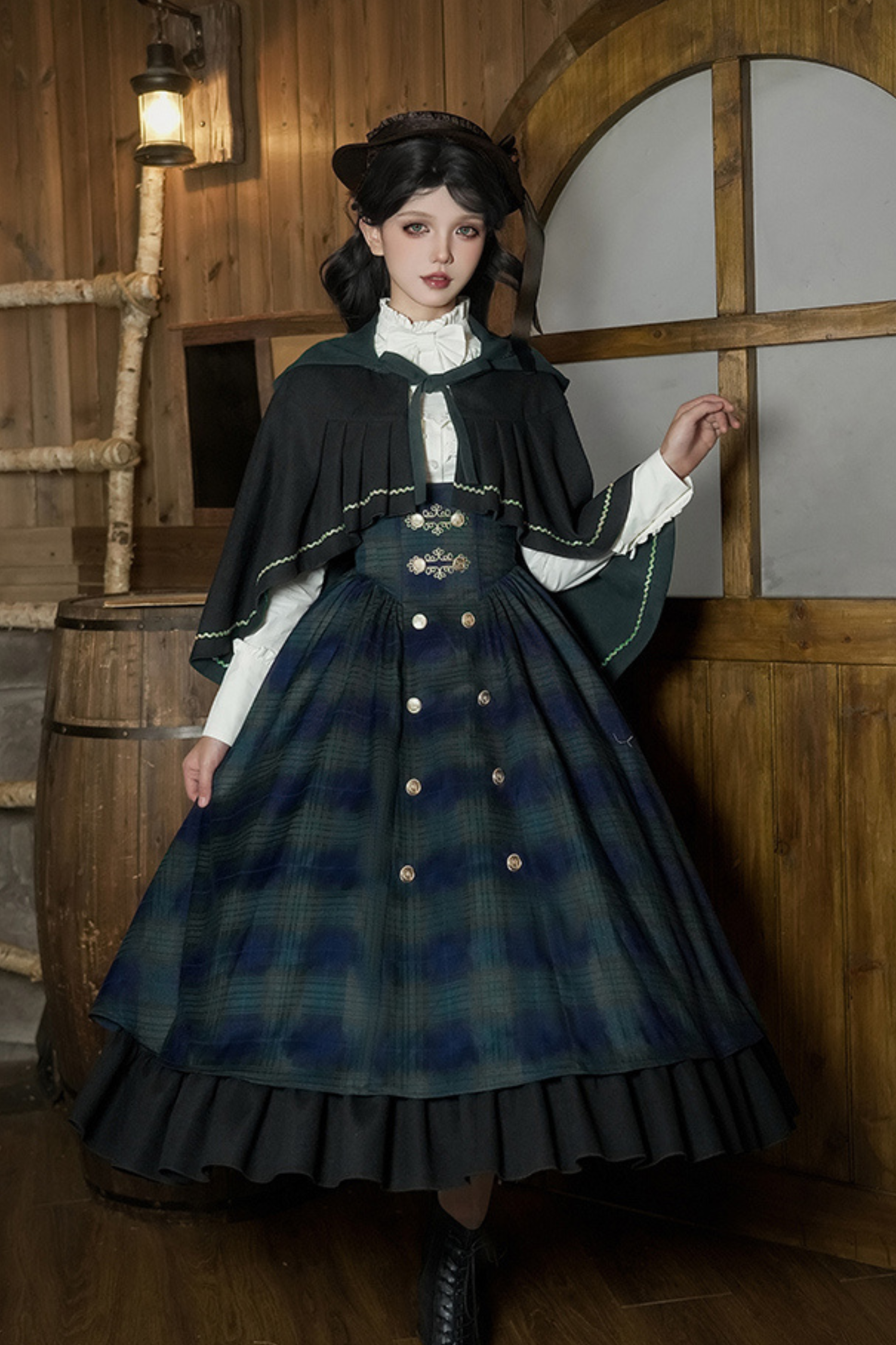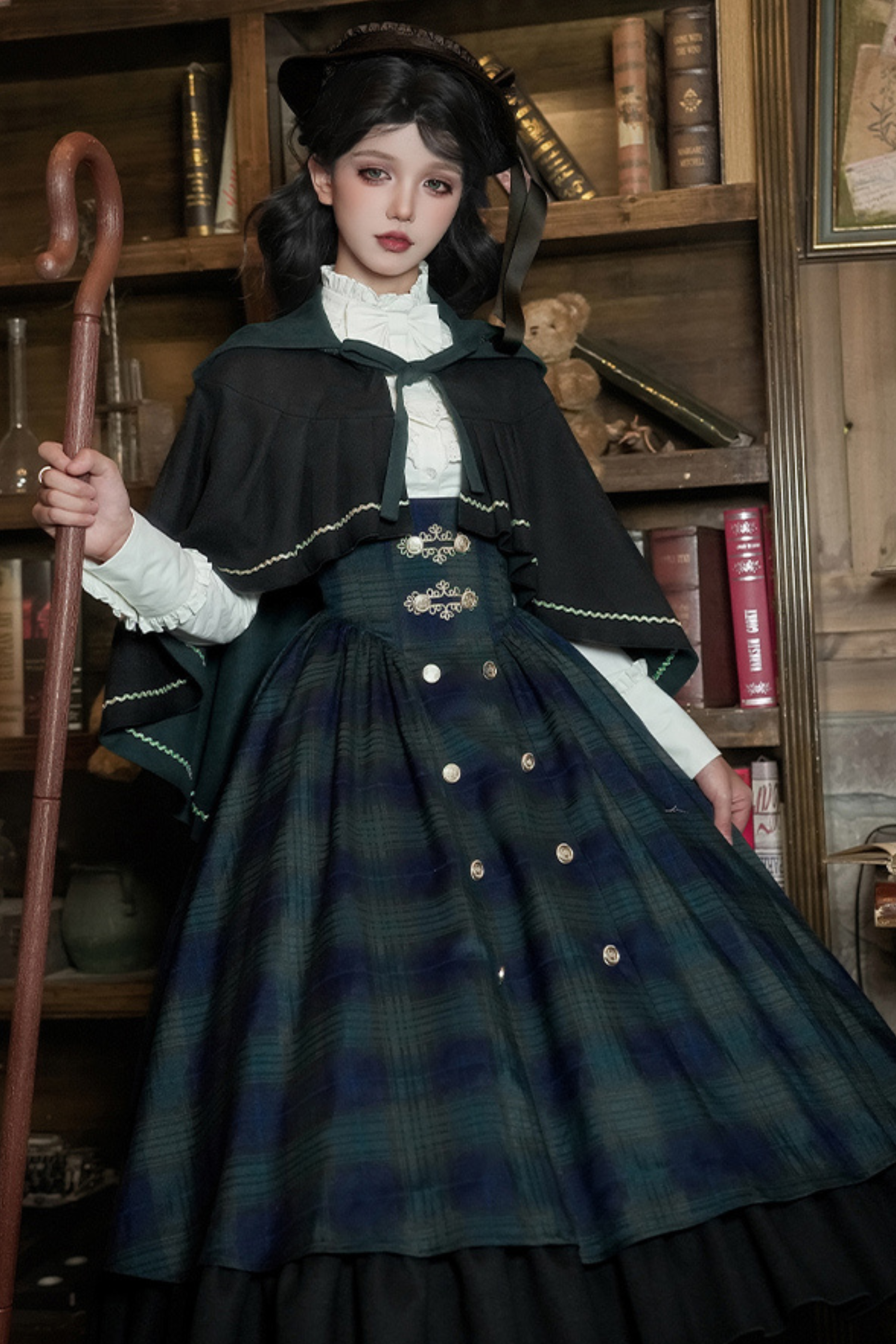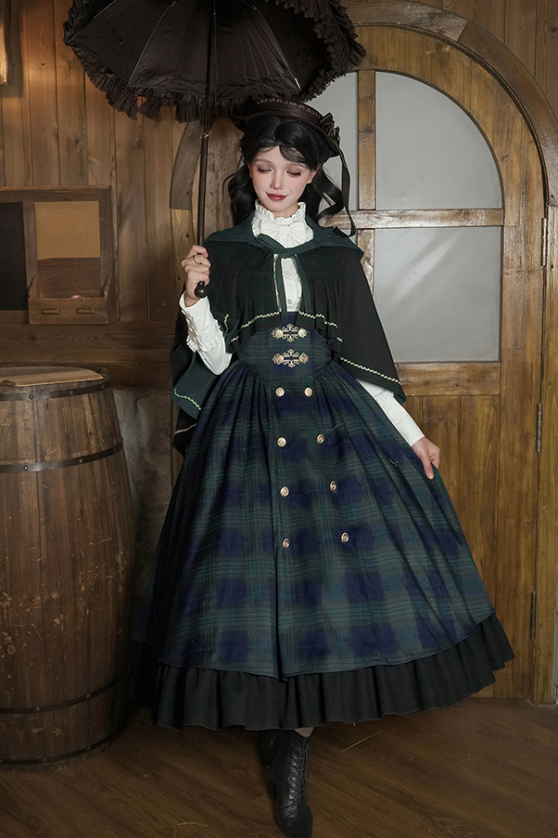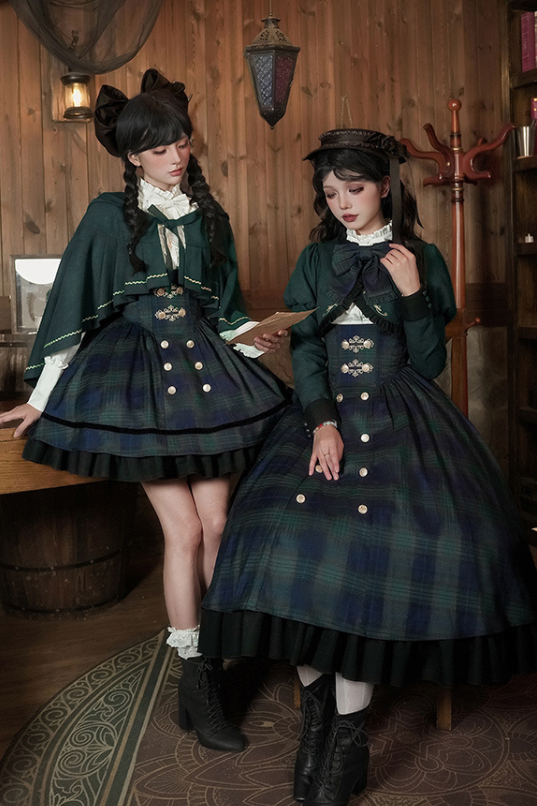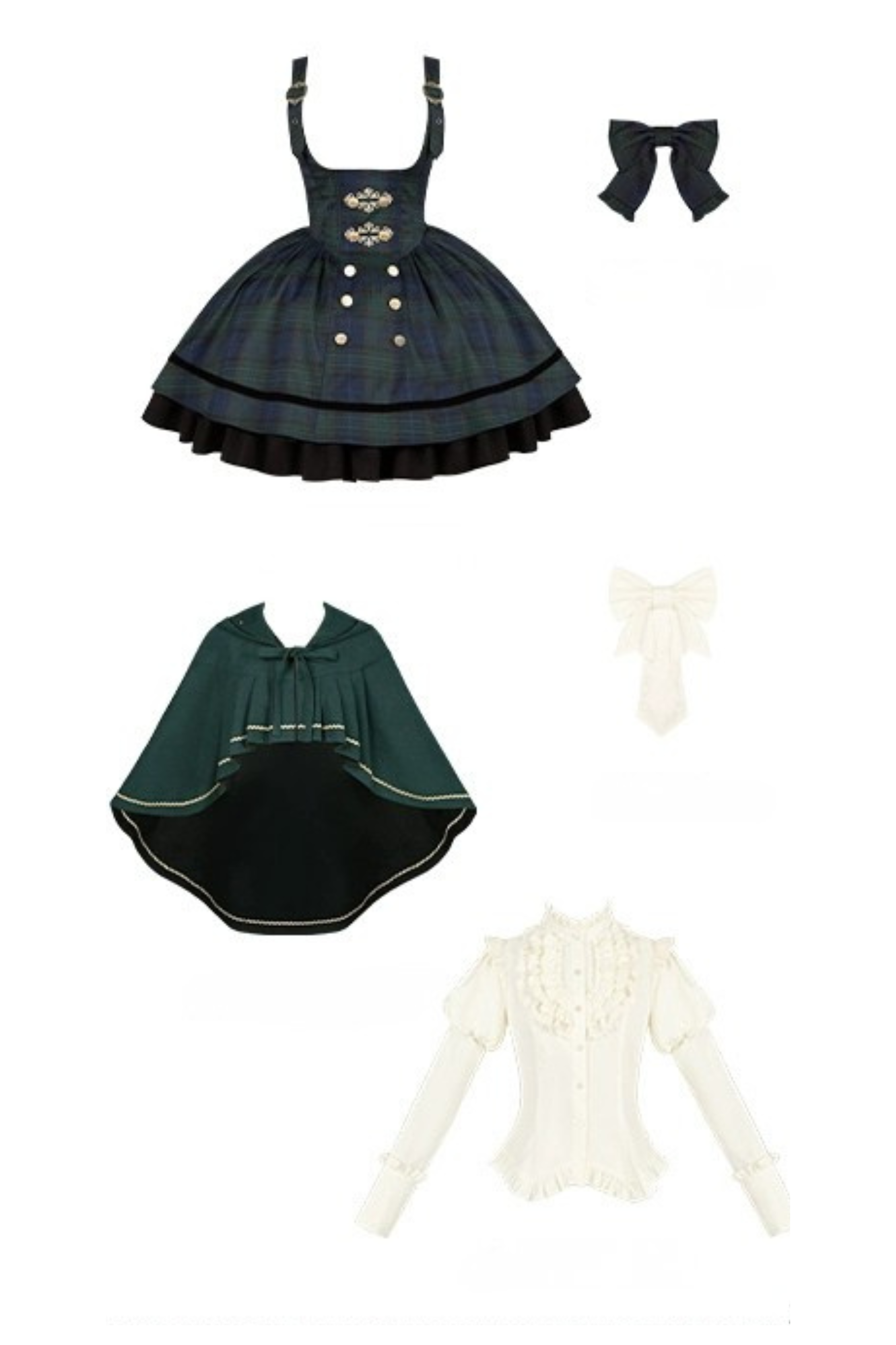 レトロカレッジスタイルチェックロリータスカート+ジャケット+マント+ブラウス+リボン+ネックレス