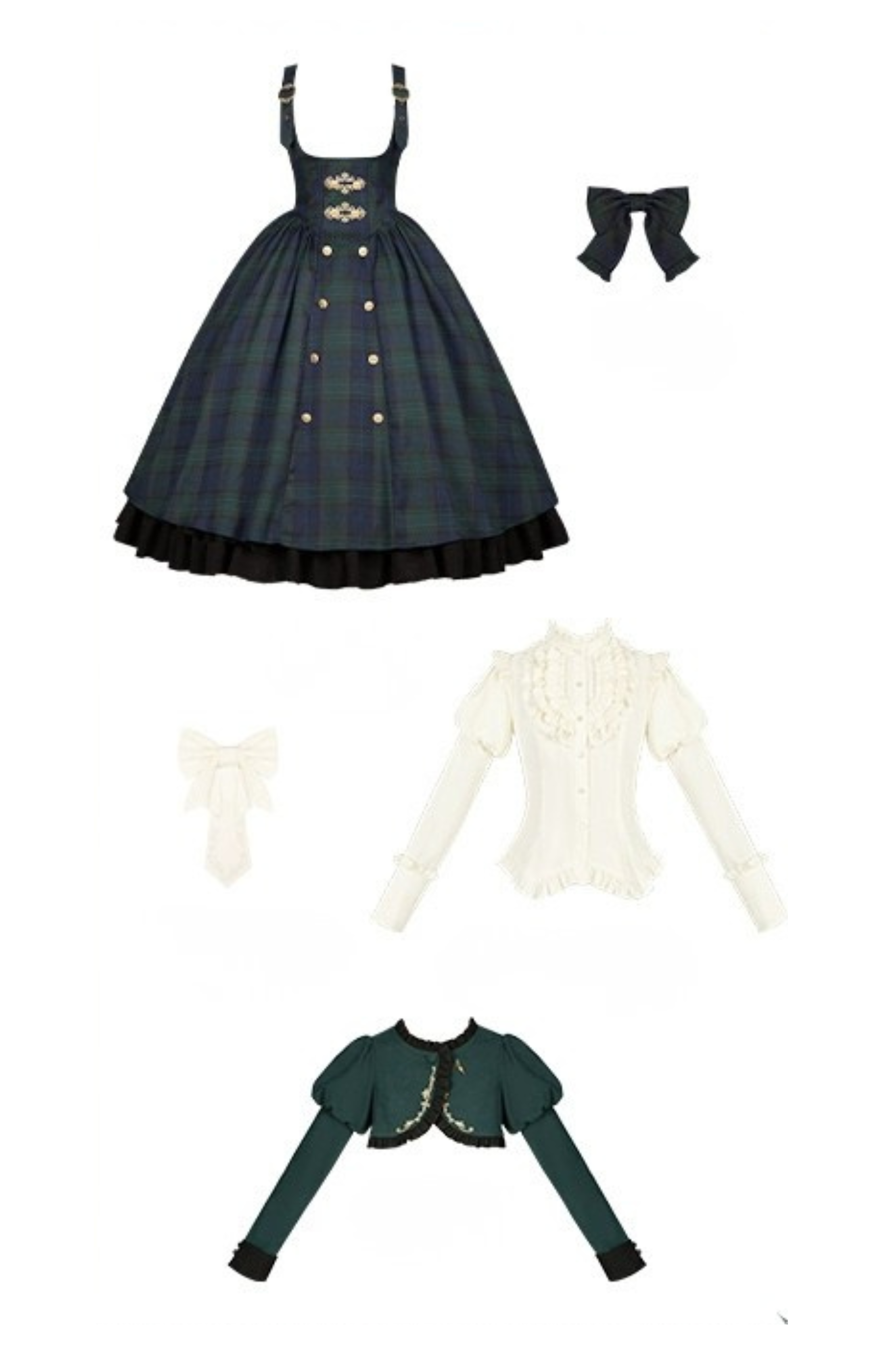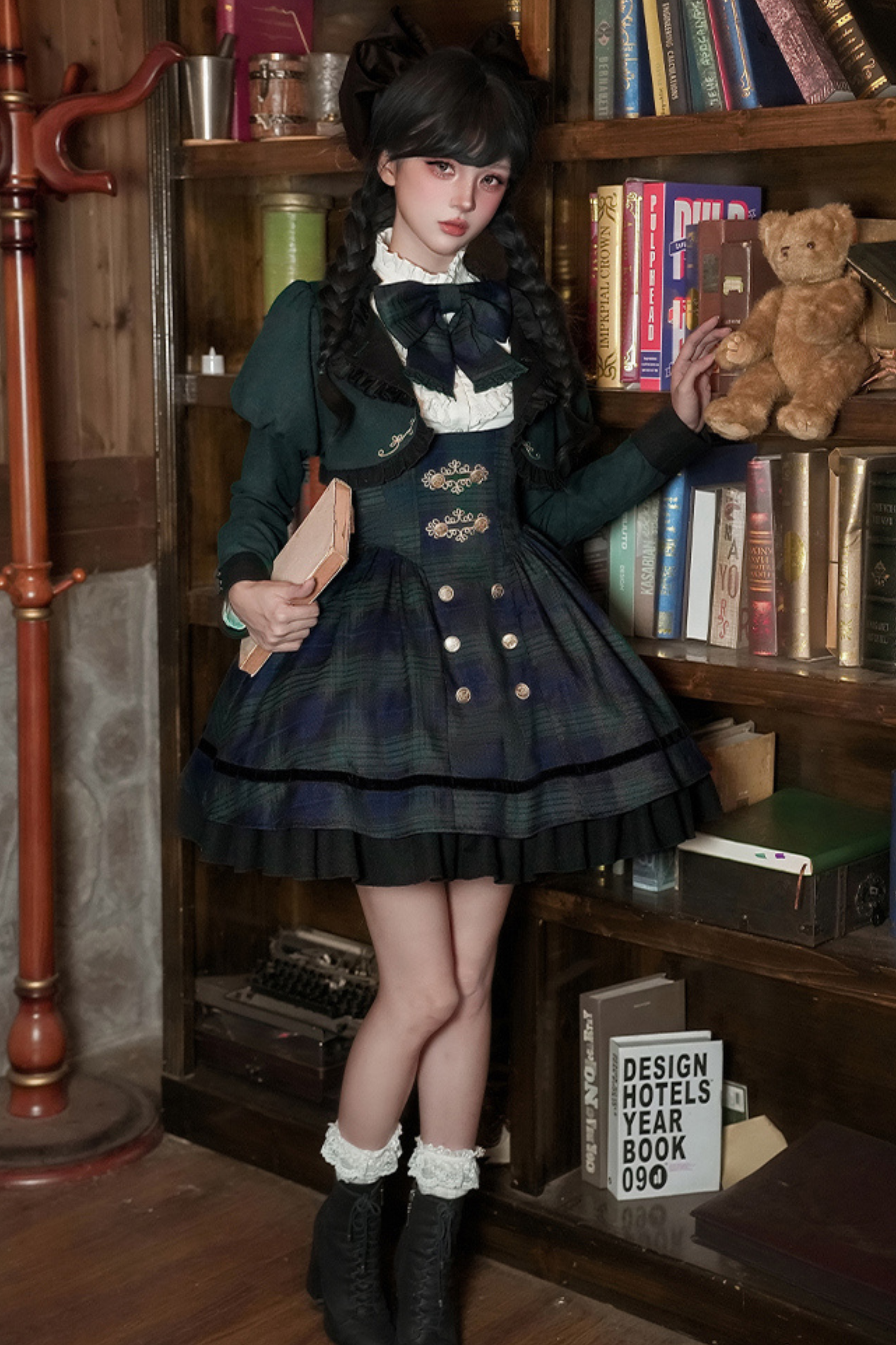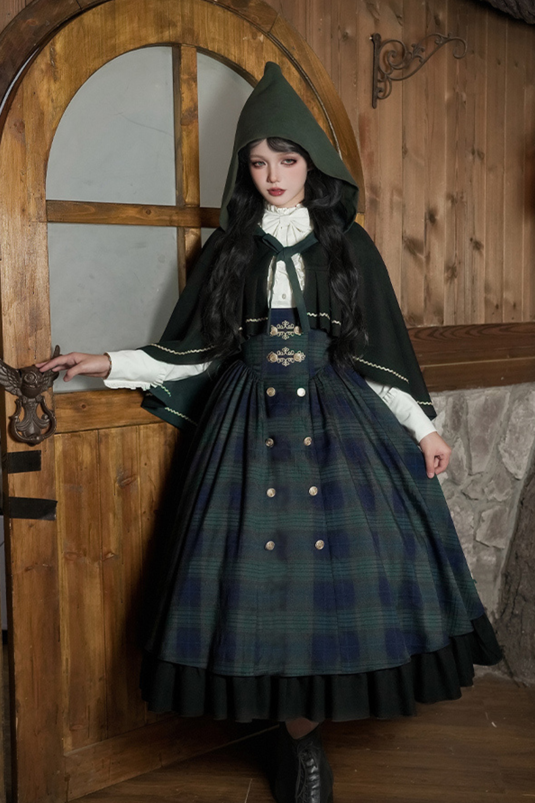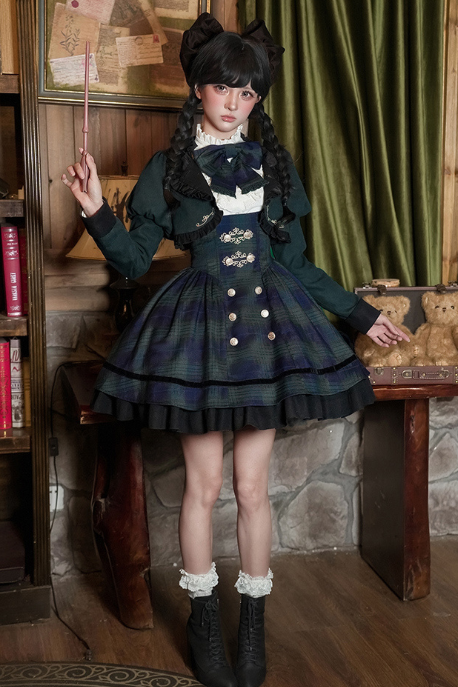 レトロカレッジスタイルチェックロリータスカート+ジャケット+マント+ブラウス+リボン+ネックレス