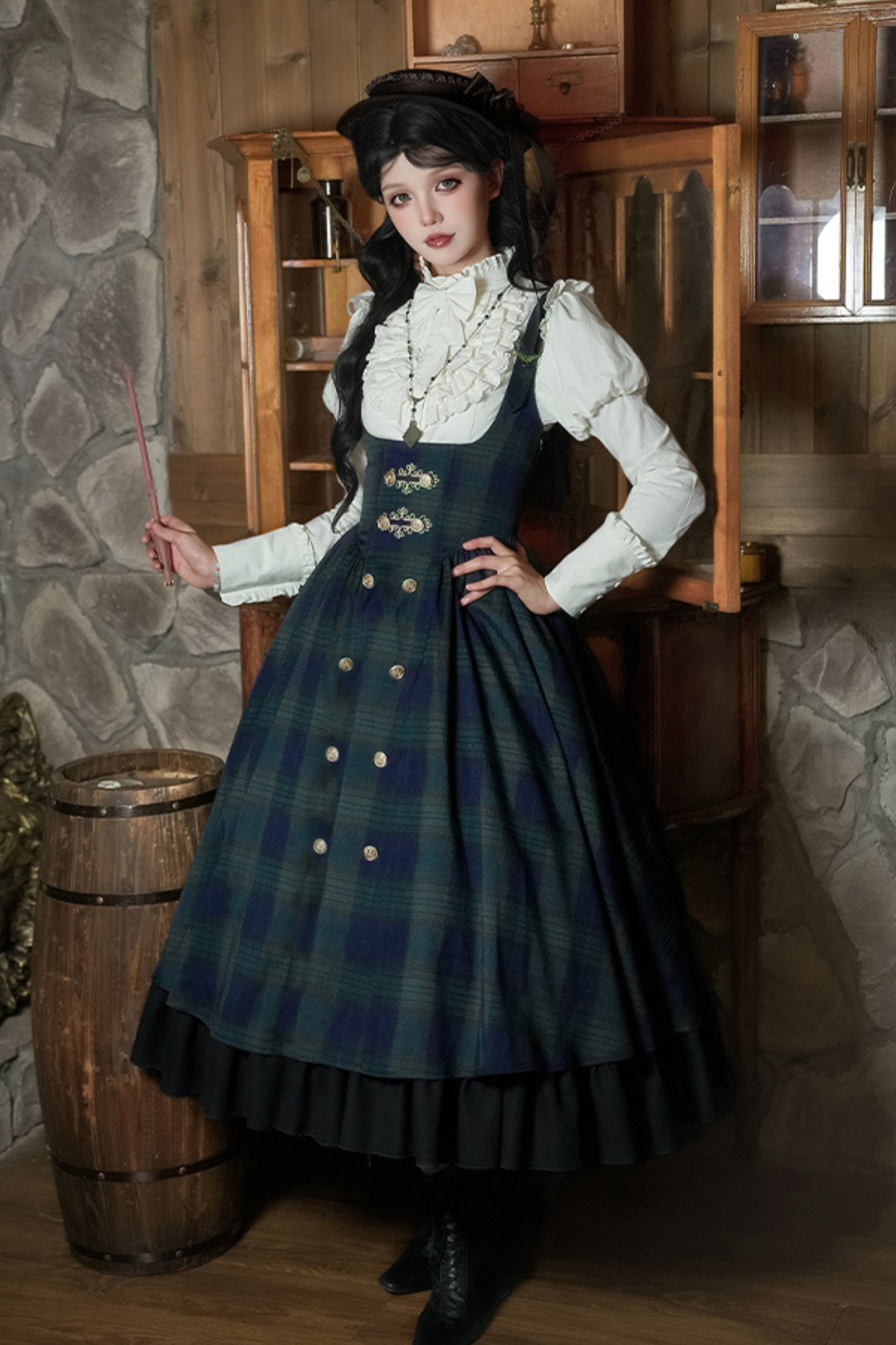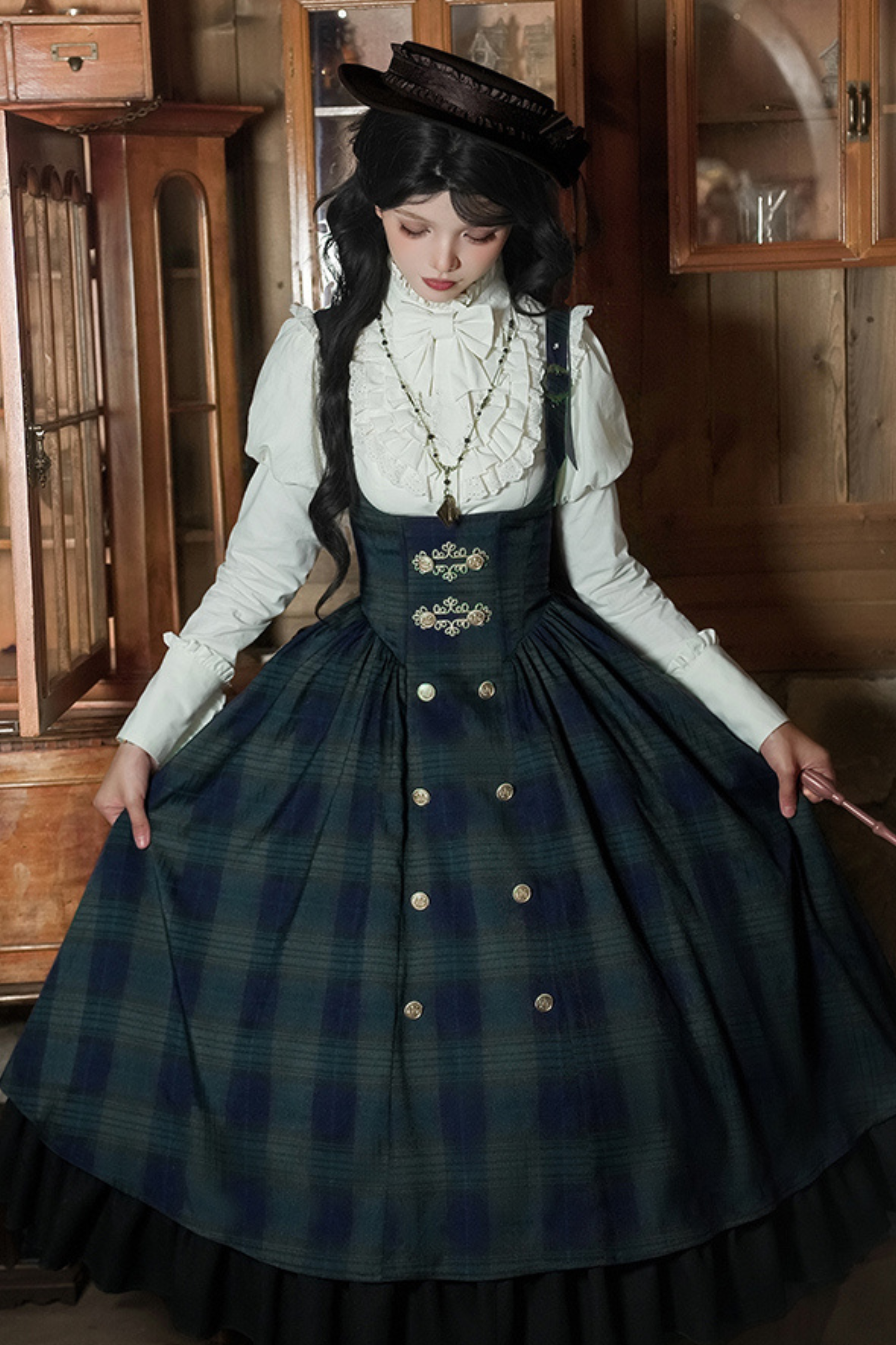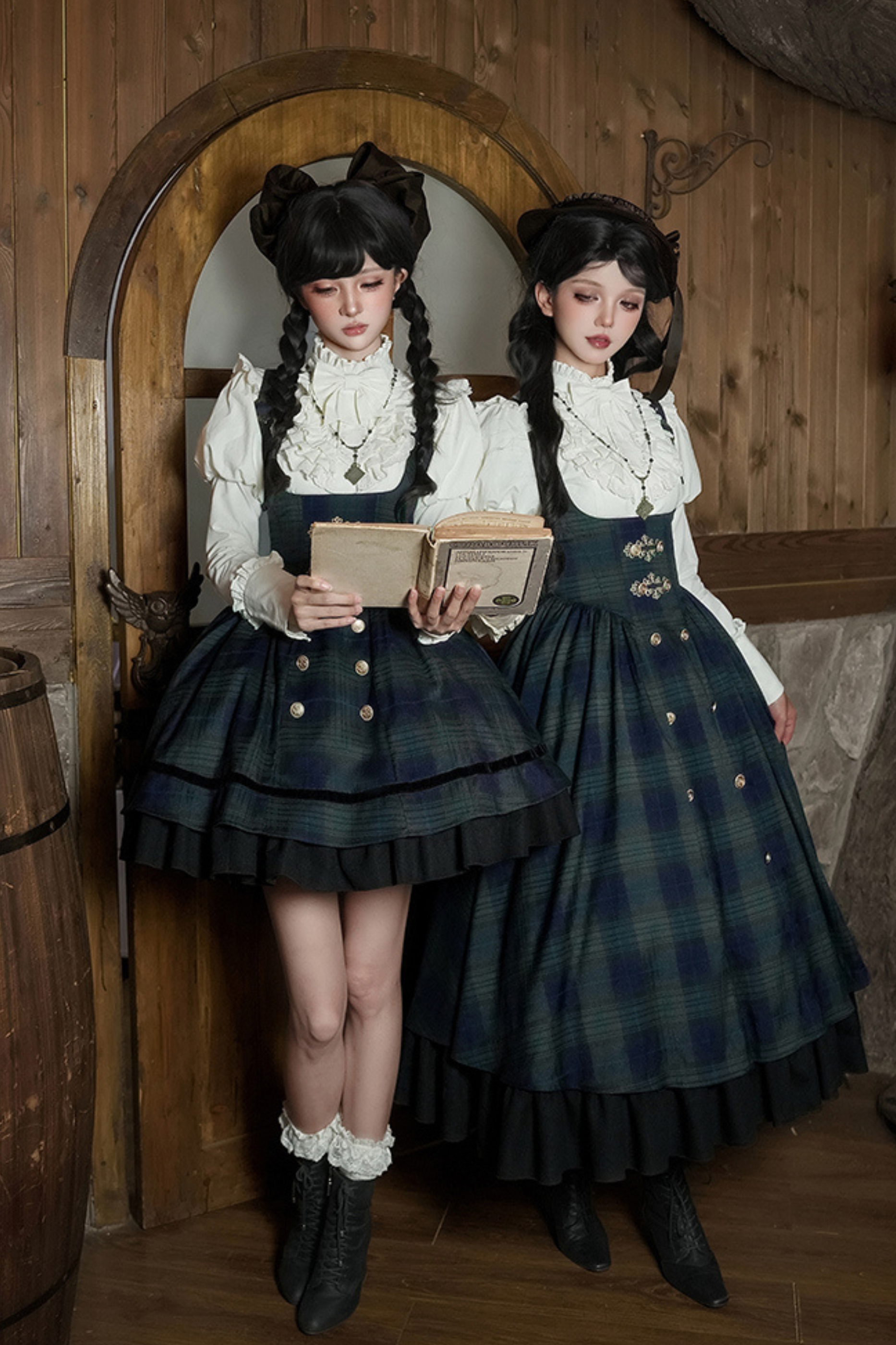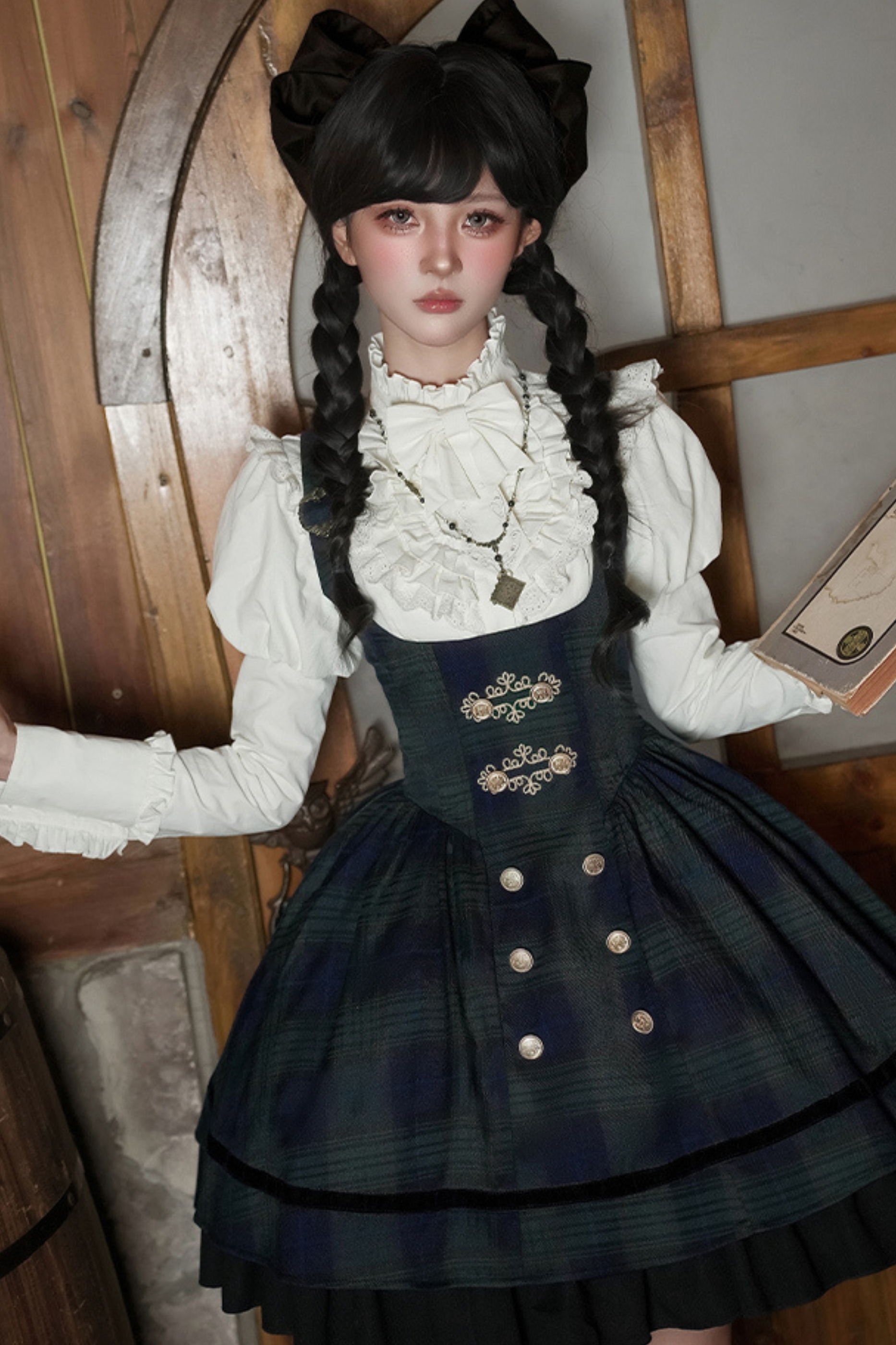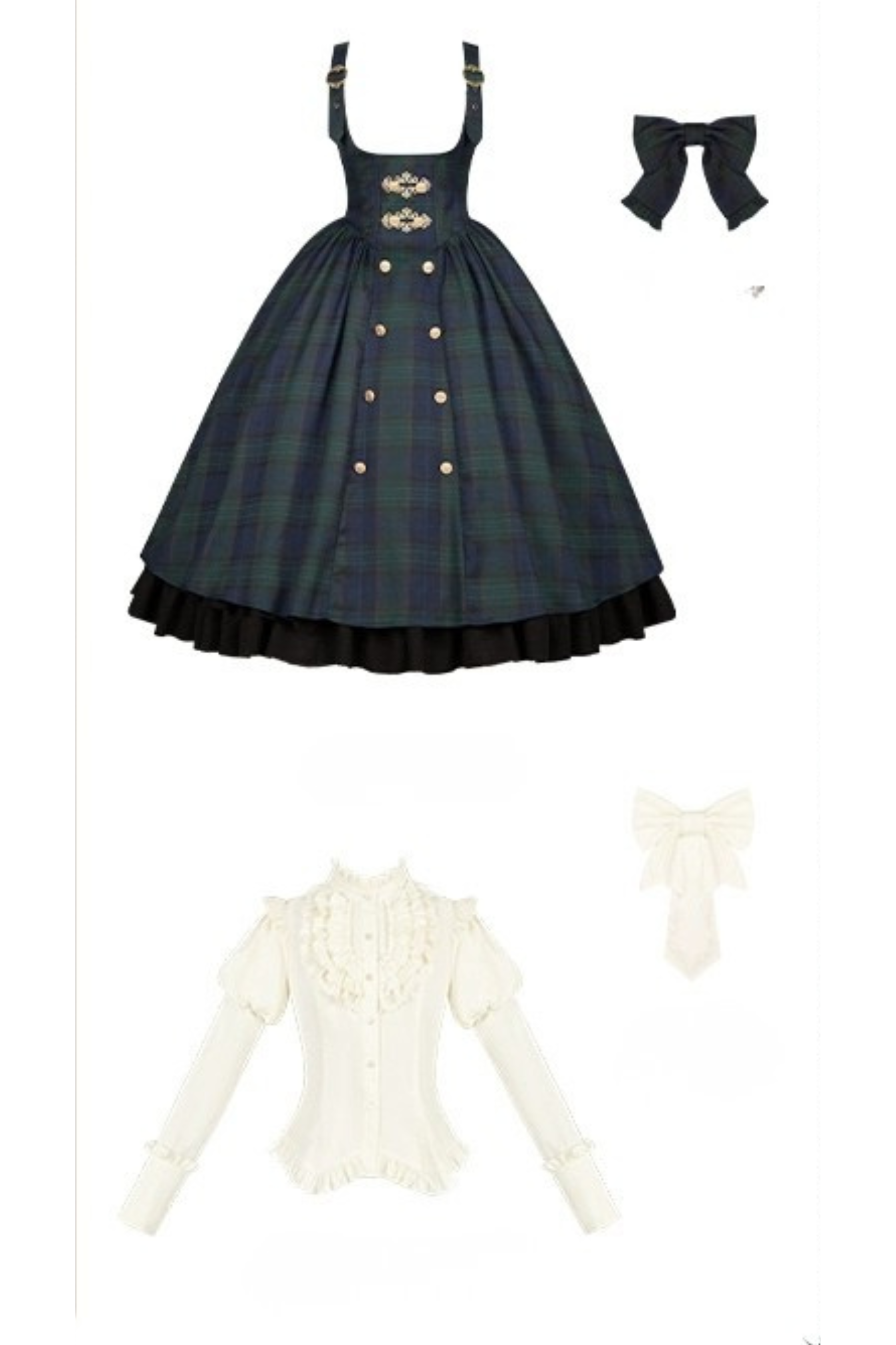 レトロカレッジスタイルチェックロリータスカート+ジャケット+マント+ブラウス+リボン+ネックレス