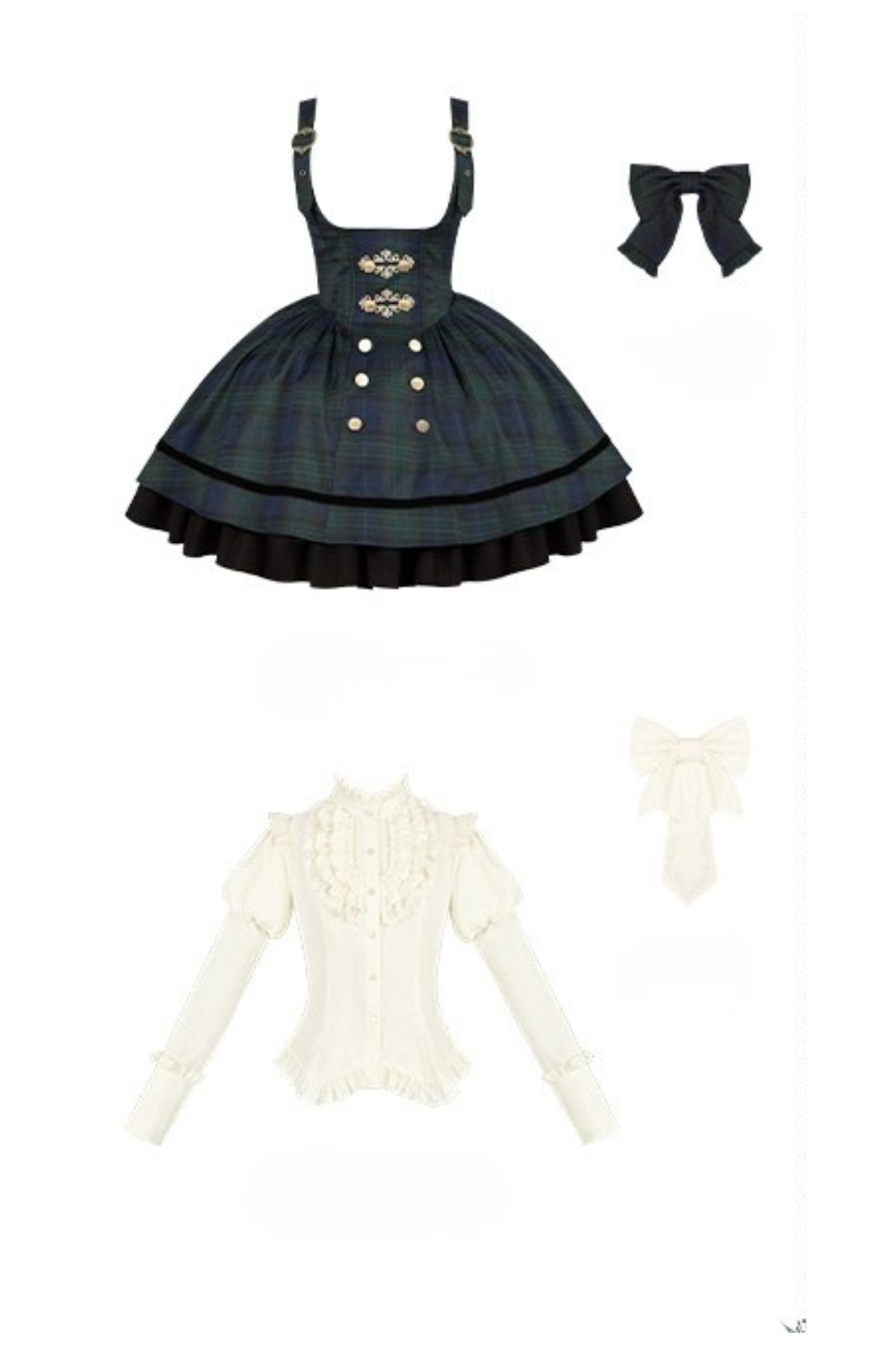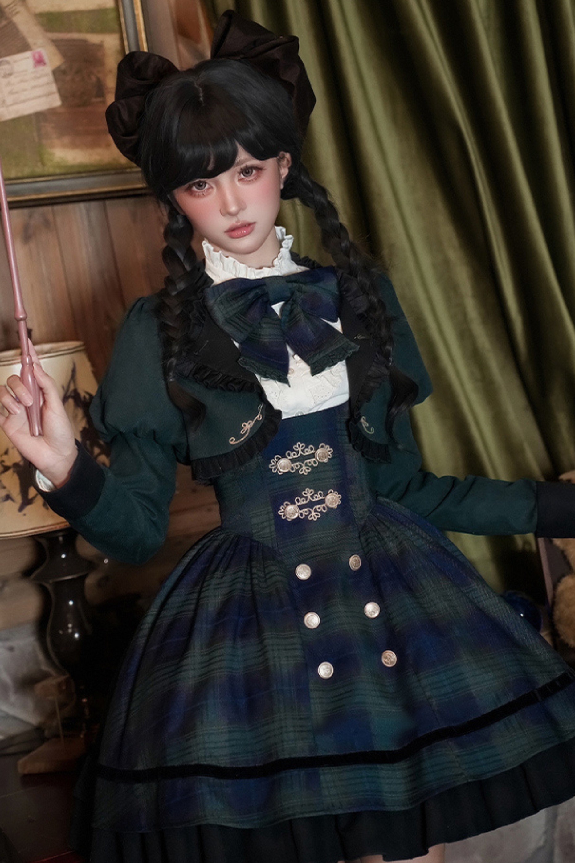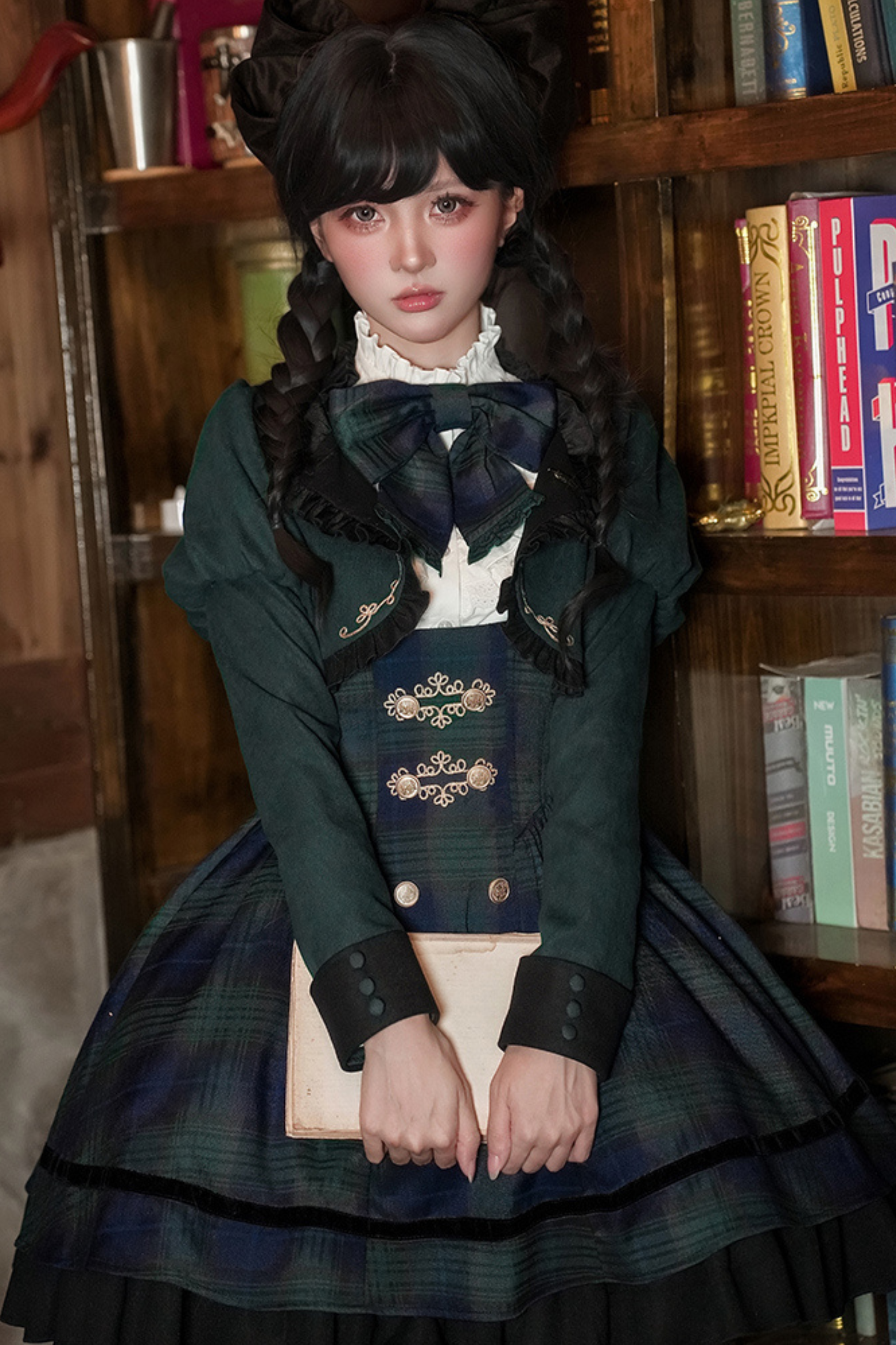 ❤レトロカレッジスタイルチェックロリータスカート+ジャケット+マント+ブラウス+リボン+ネックレス❤