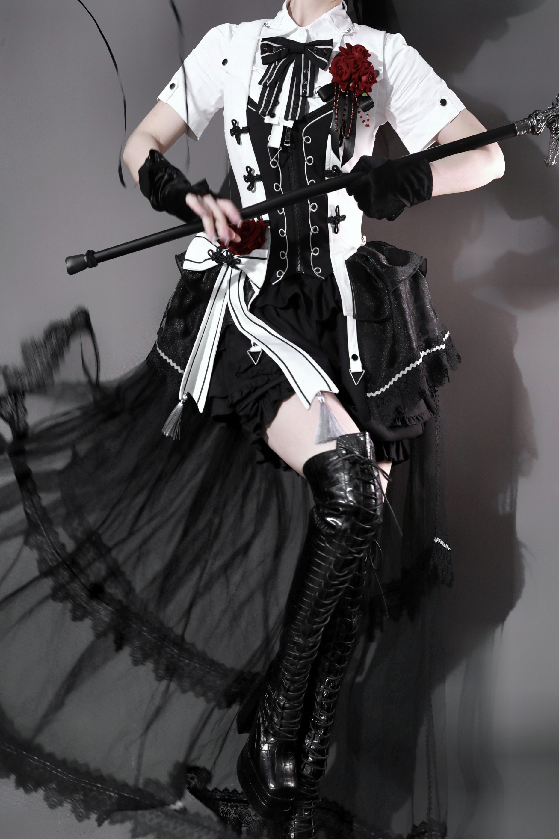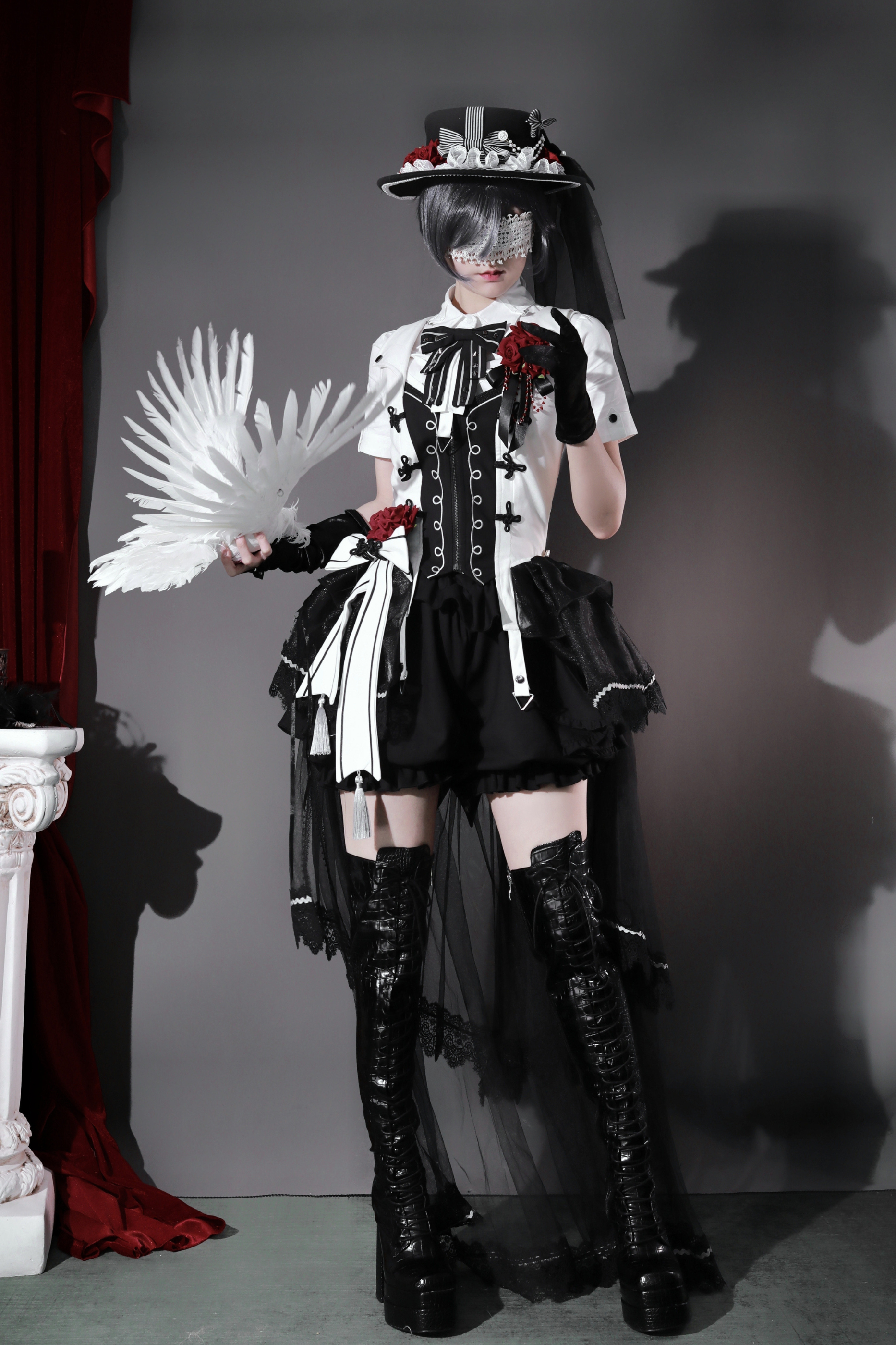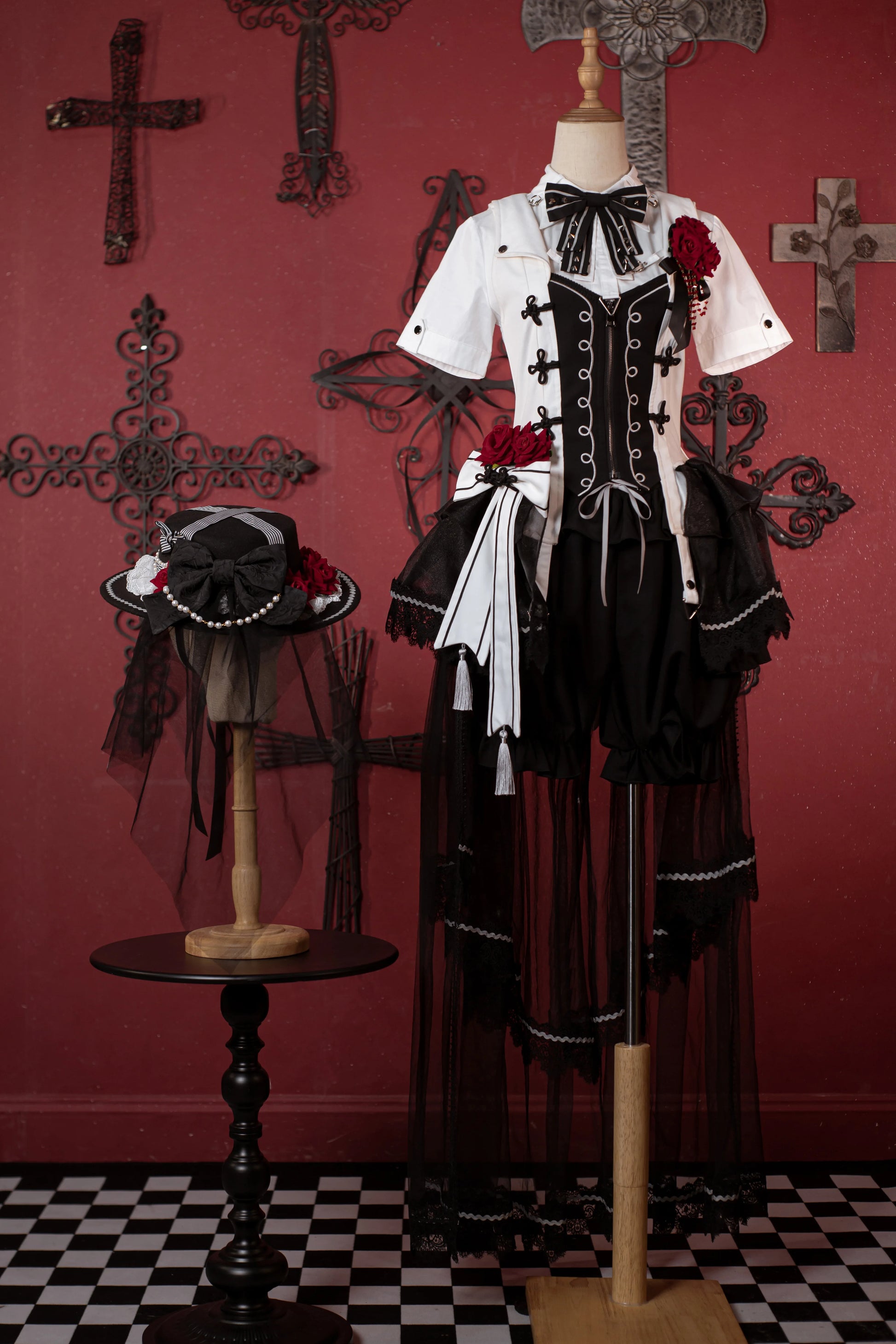 半袖シャツ.ベスト(トレーン付き).南瓜パンツ.シルクハット.ブローチ.コサージュ.ローズリボン1.リボン (黒)