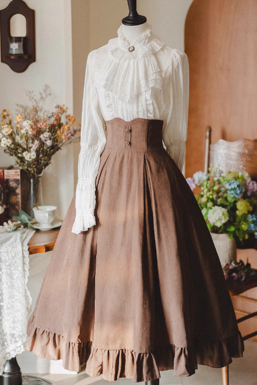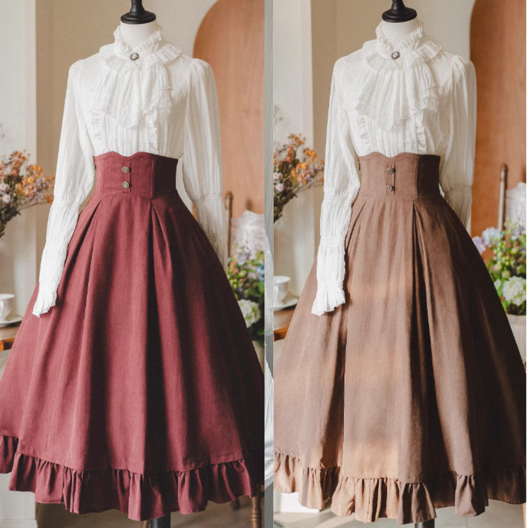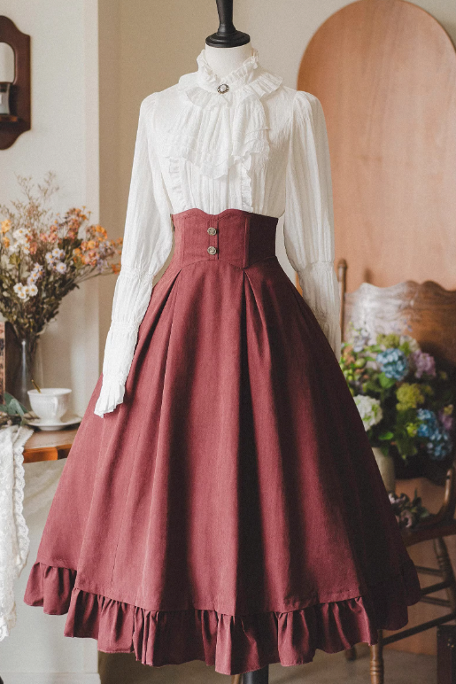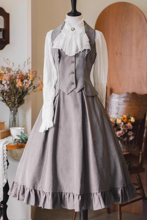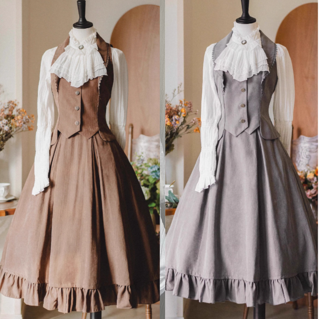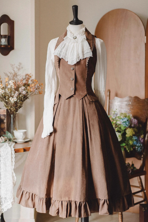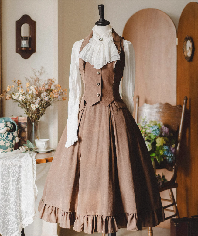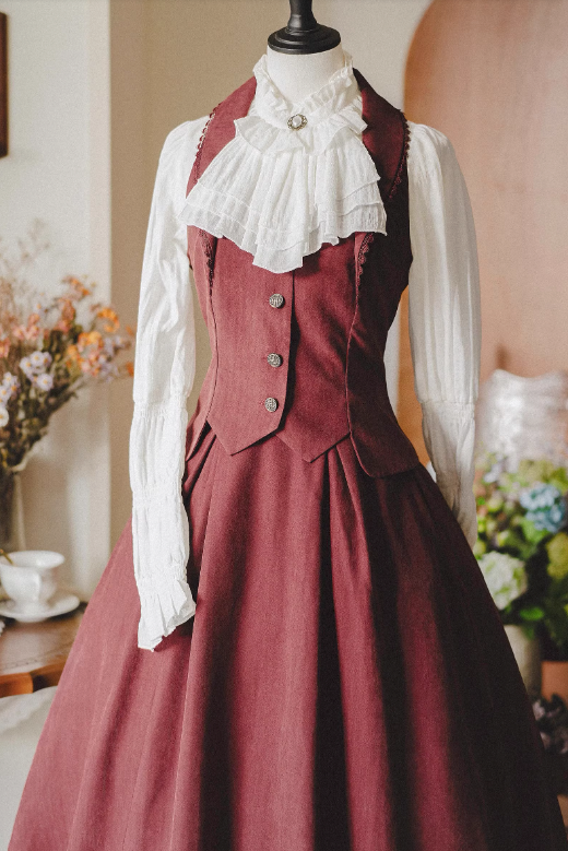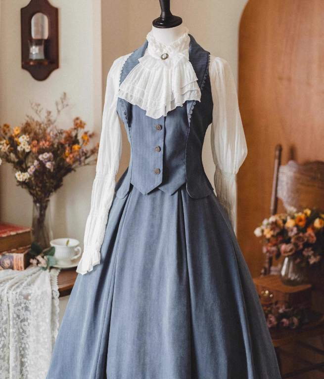 クラシカルレトロブラウス+カラーベスト+フレアロングスカート