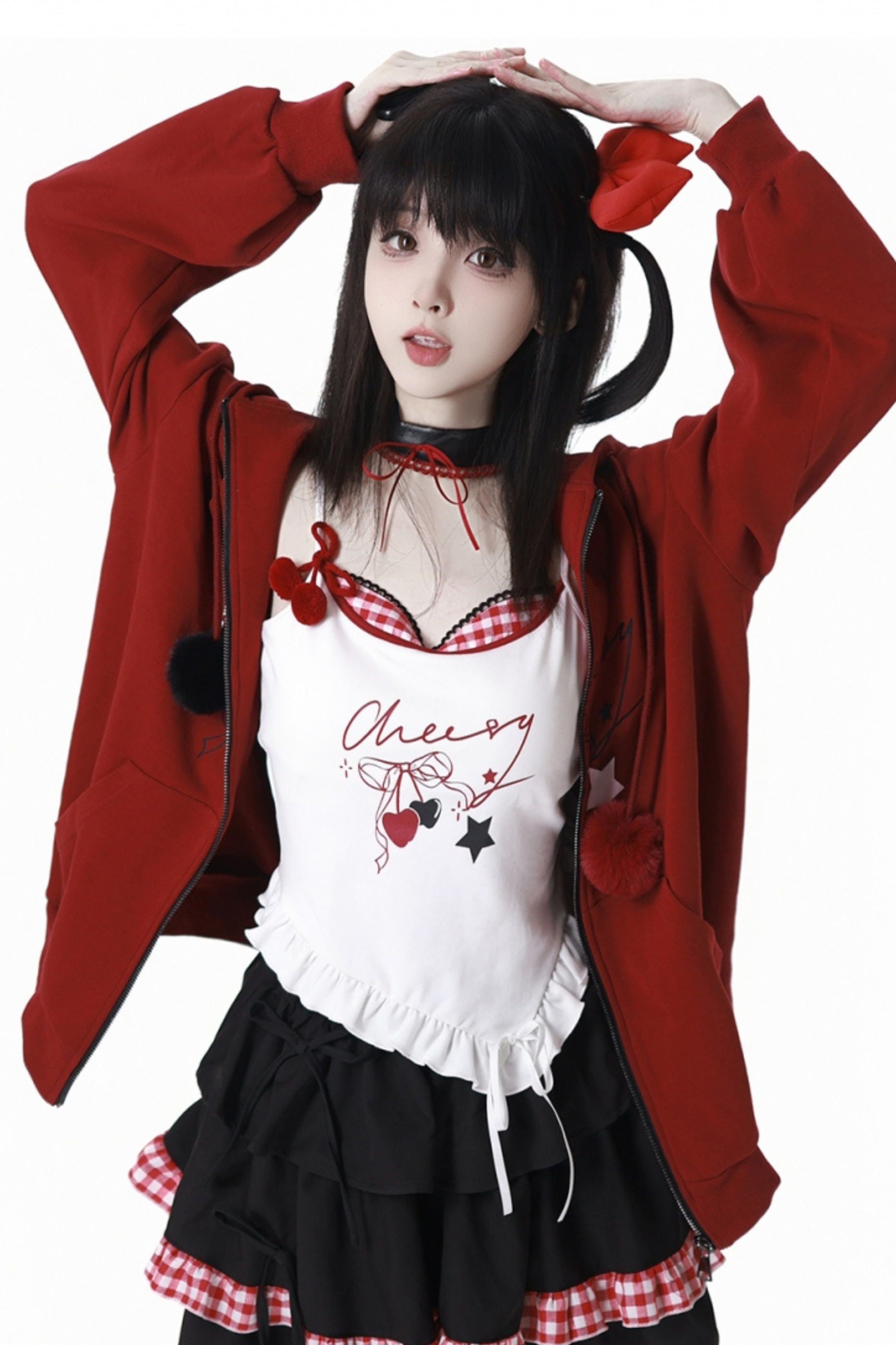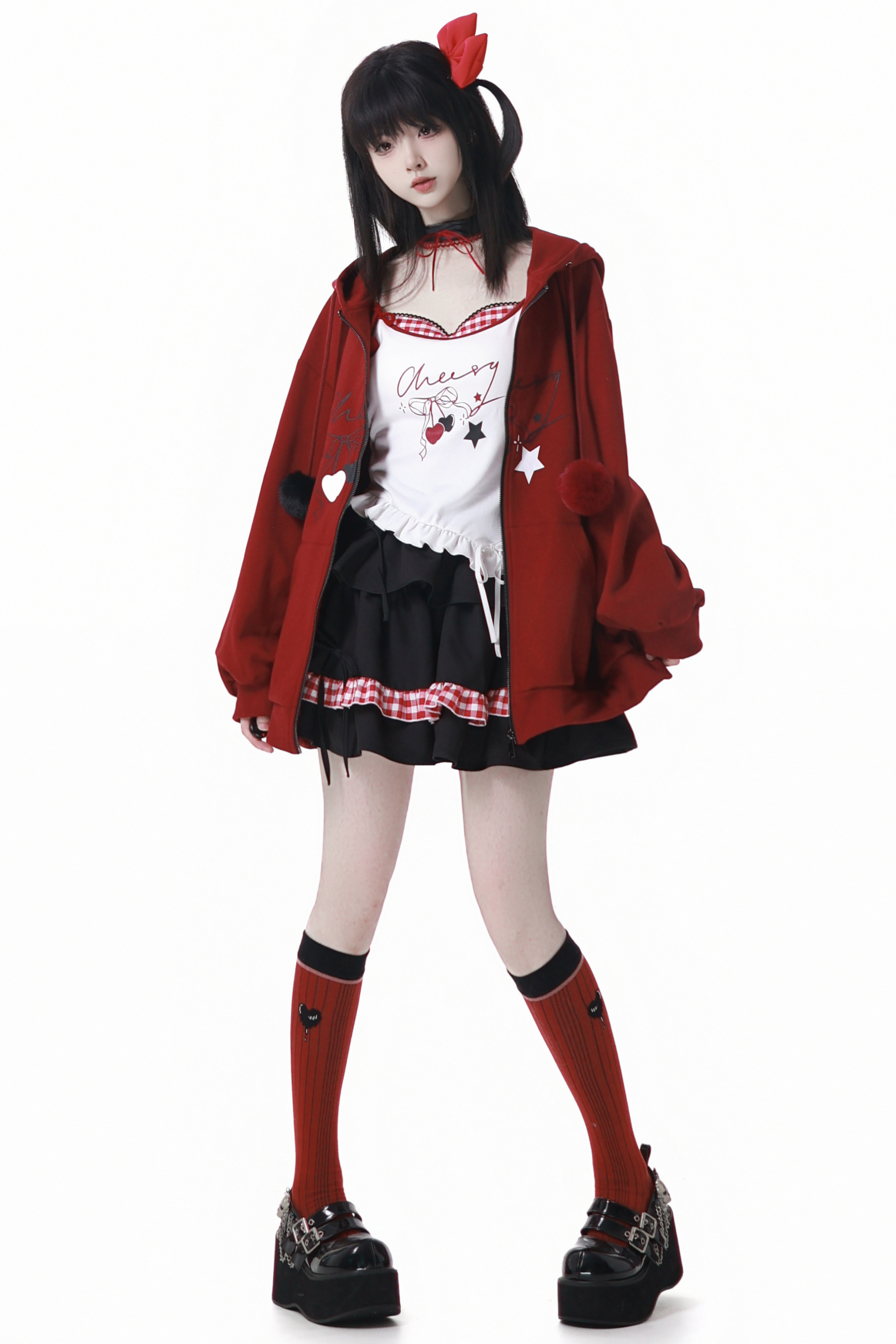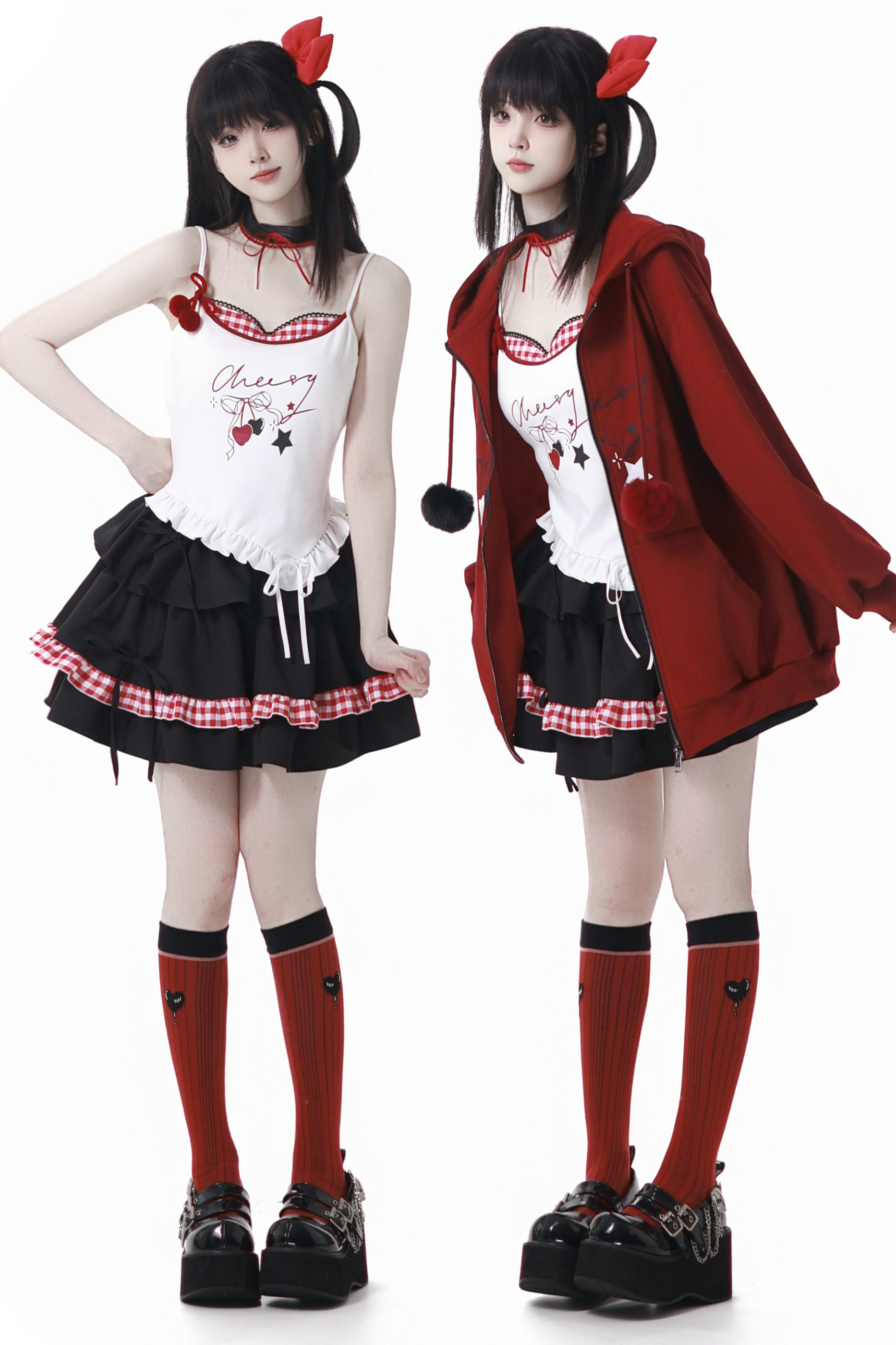 チェリーウィンドフードパーカー+キャミソール+スカート
