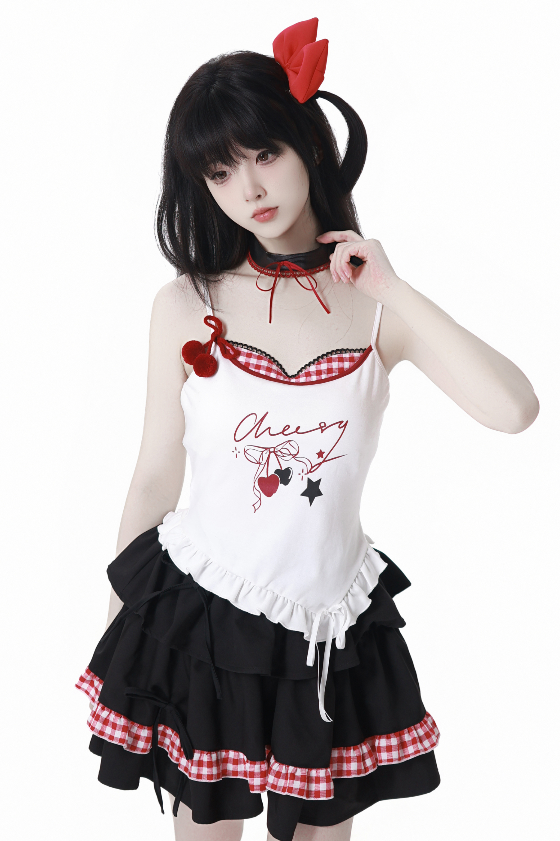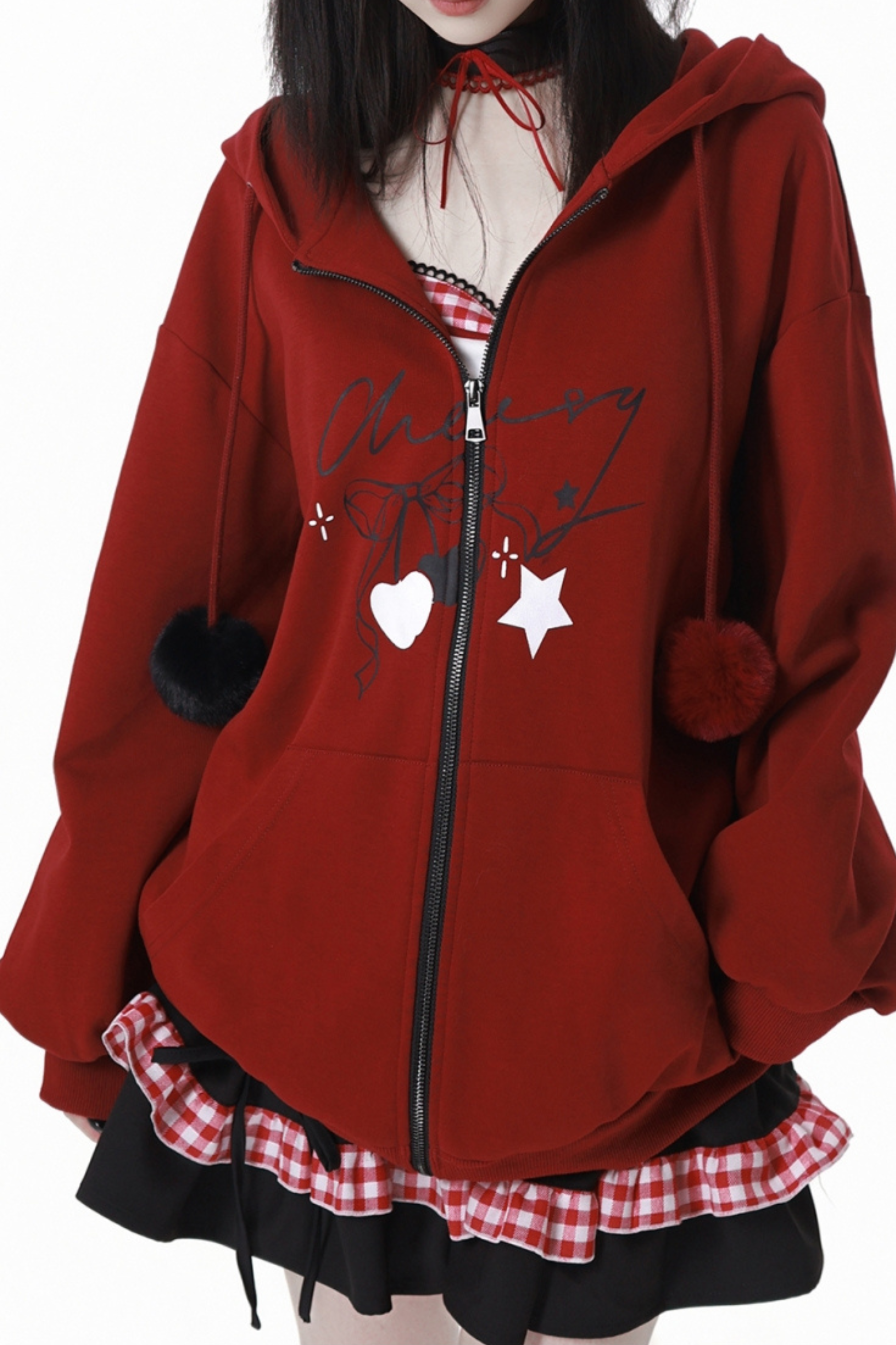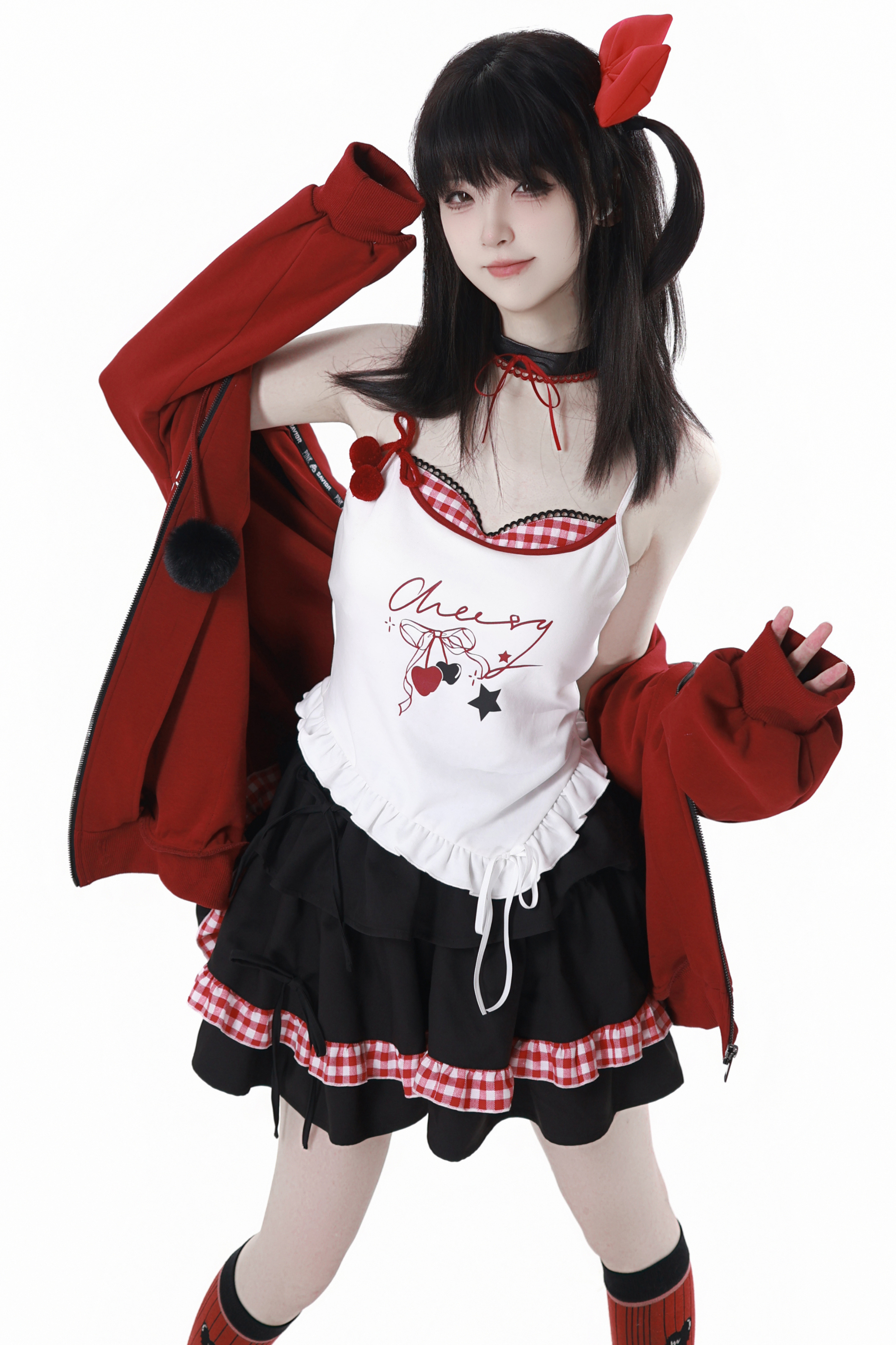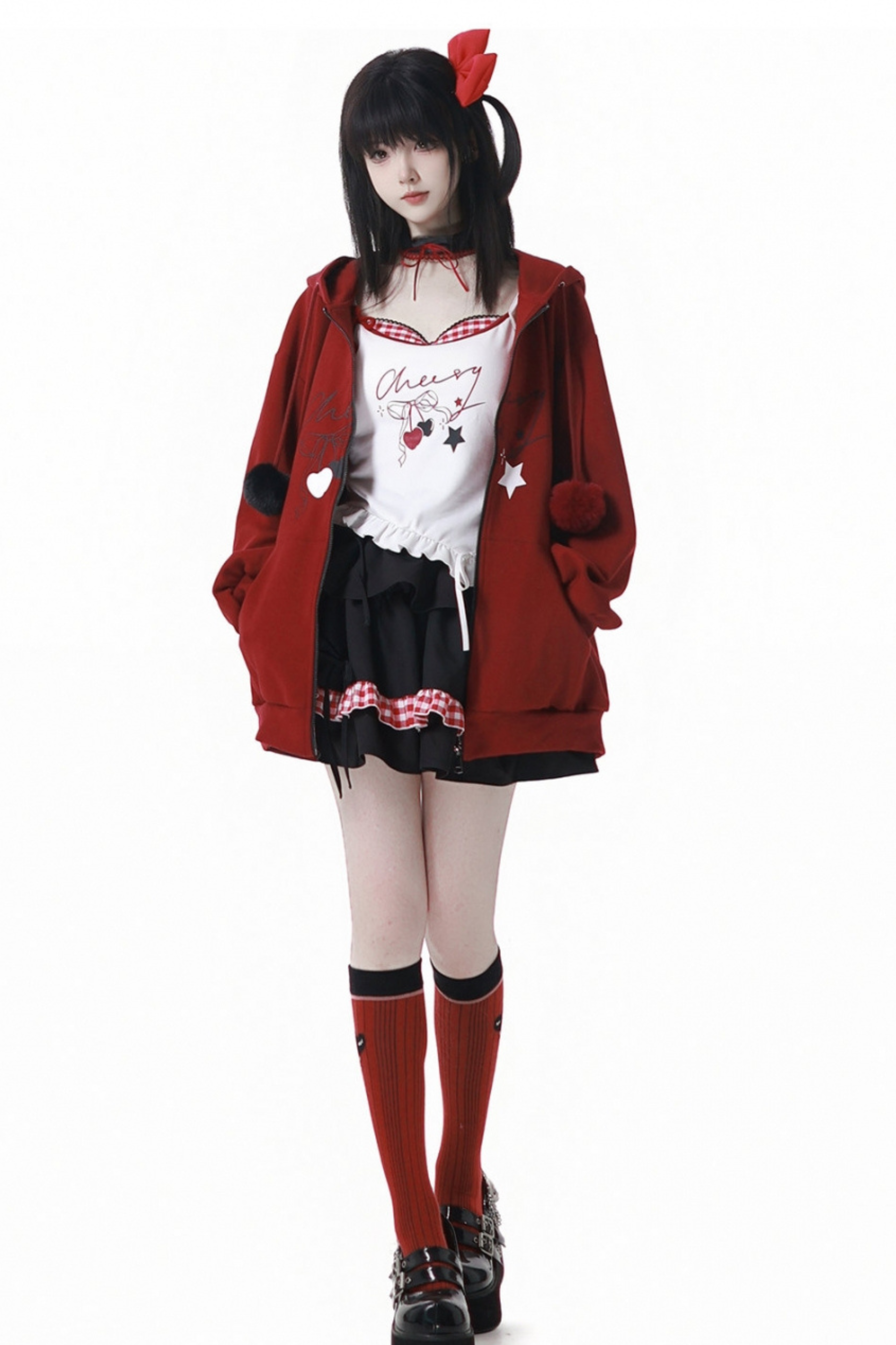 チェリーウィンドフードパーカー+キャミソール+スカート