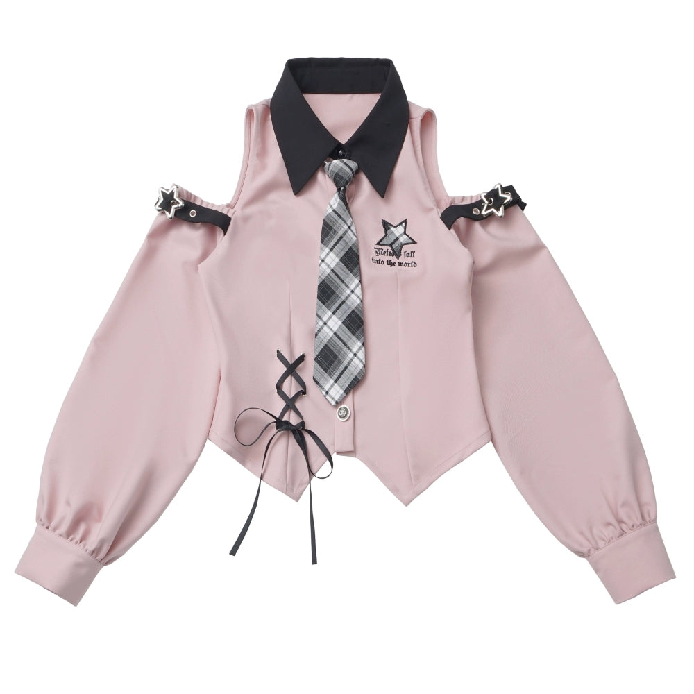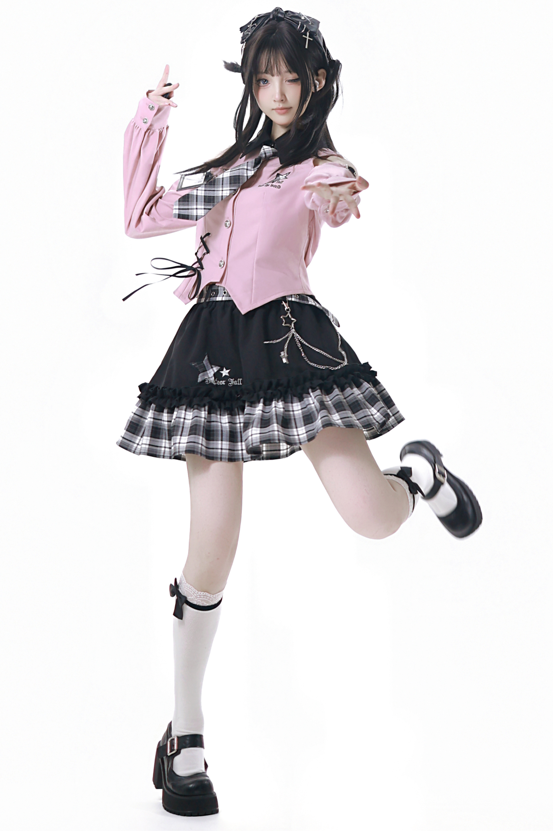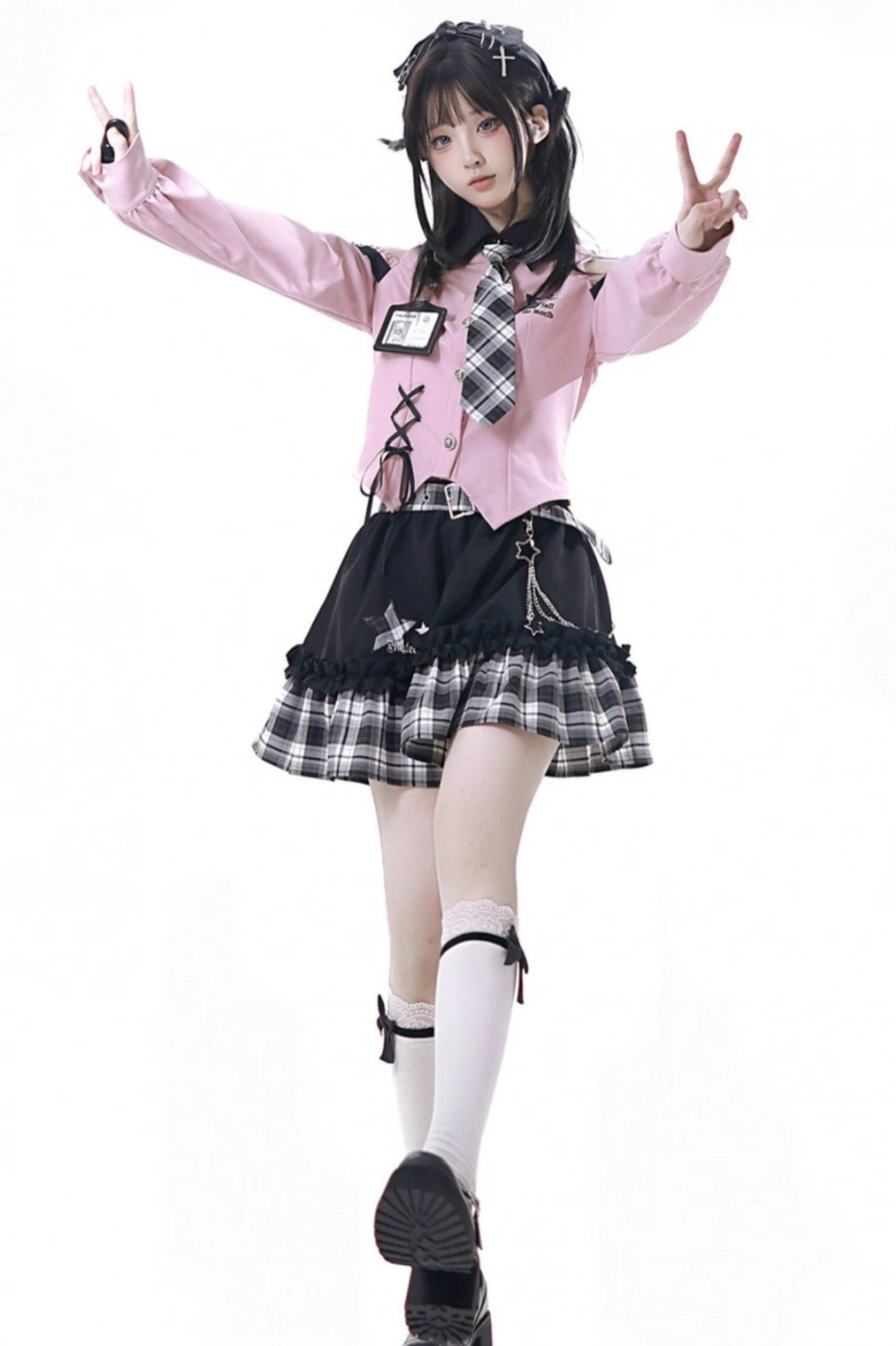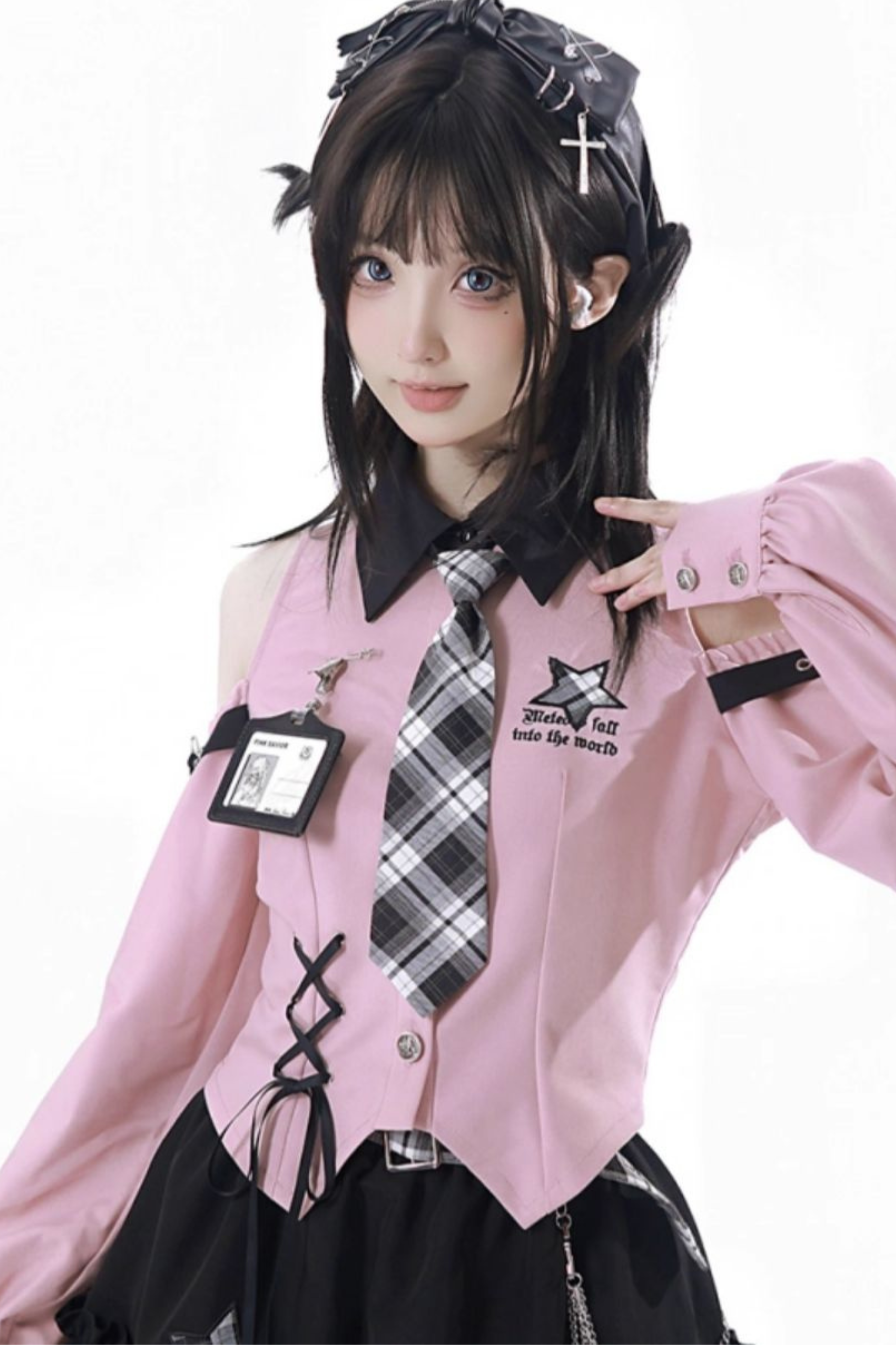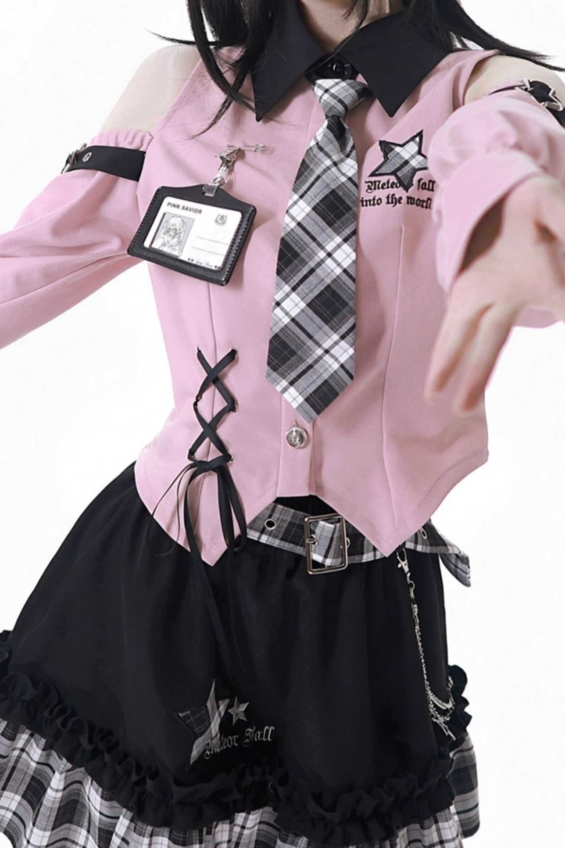 ❤オフショルダーシャツ+チェックスカート+バッジ❤