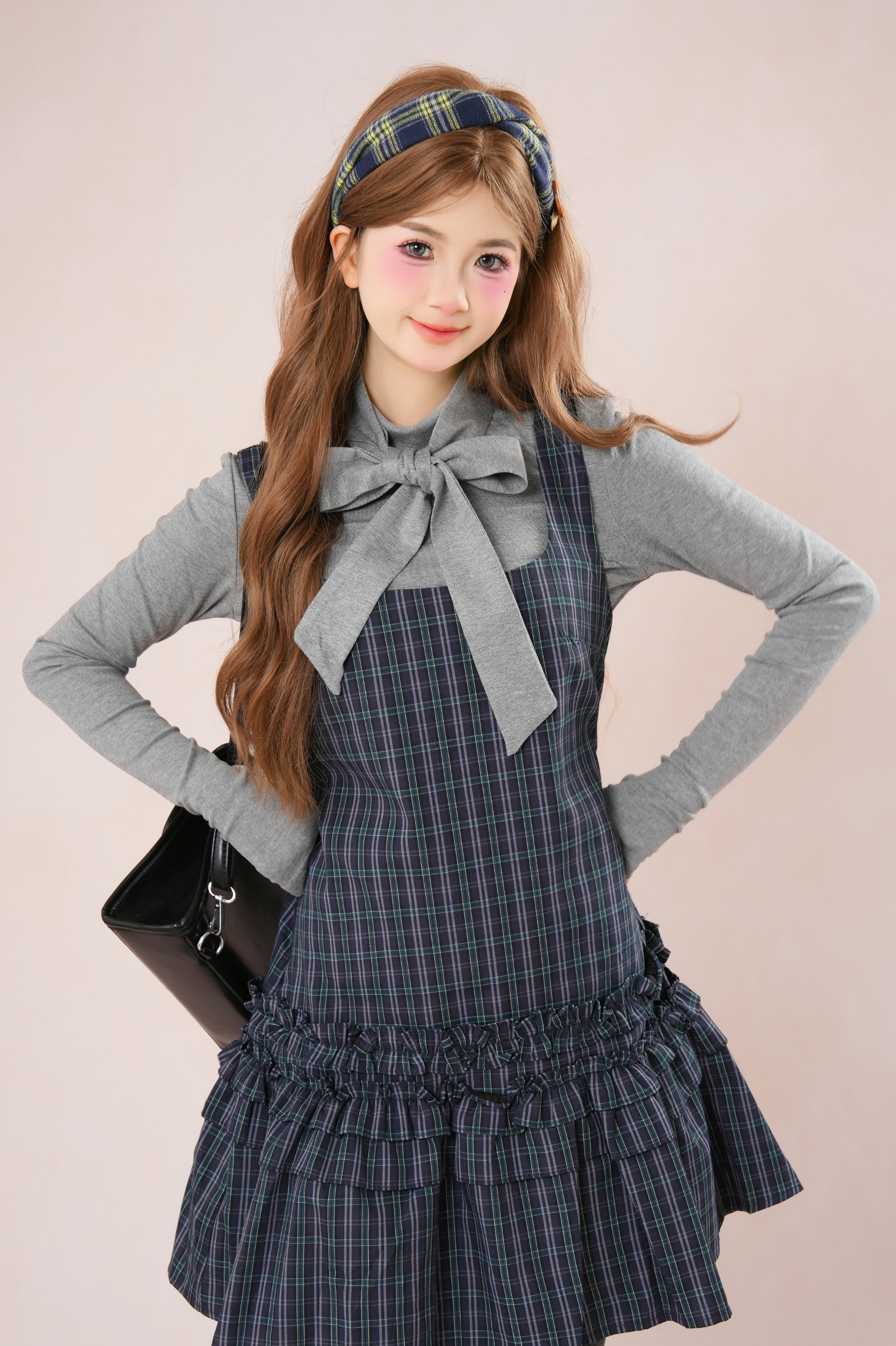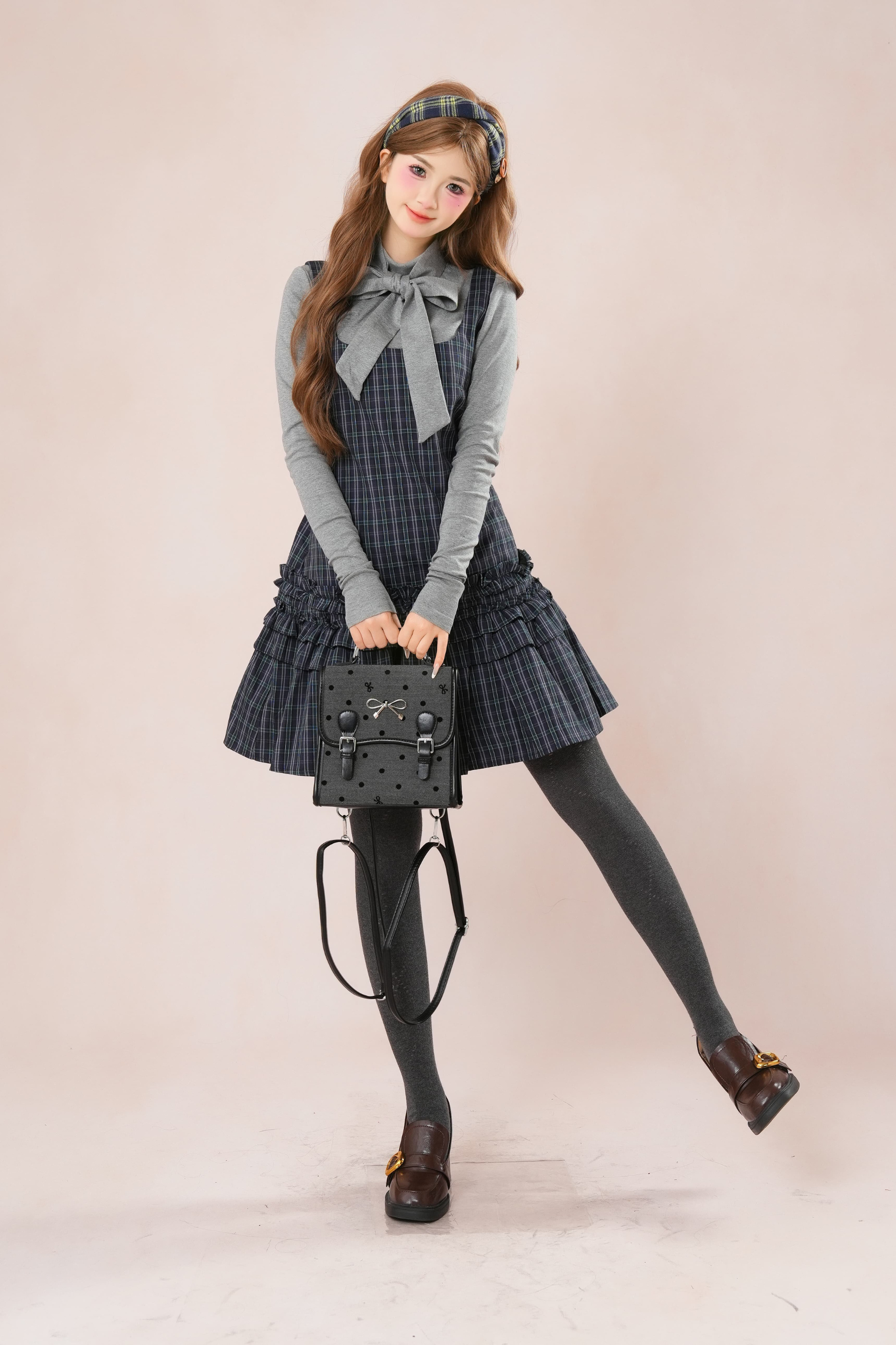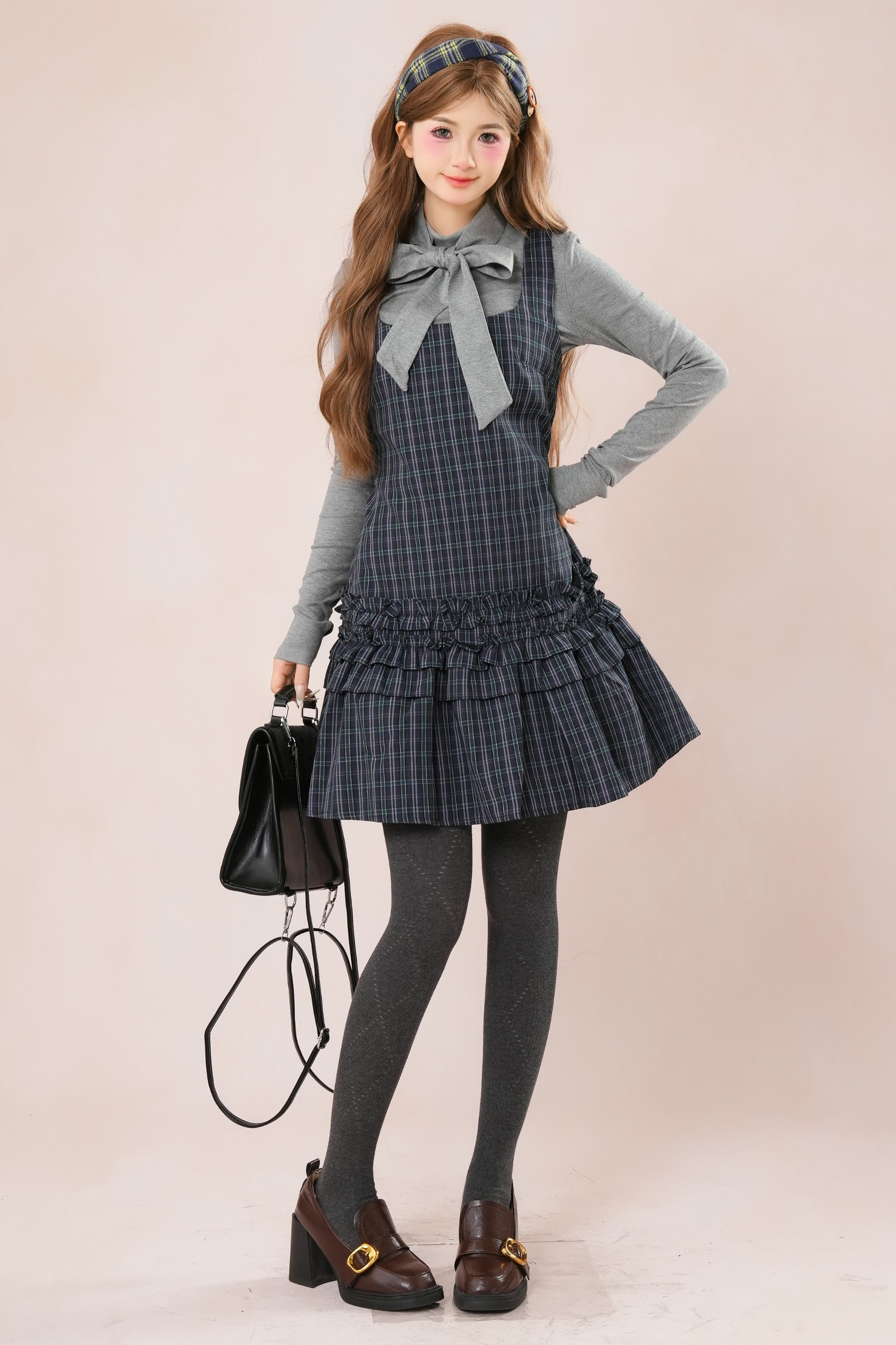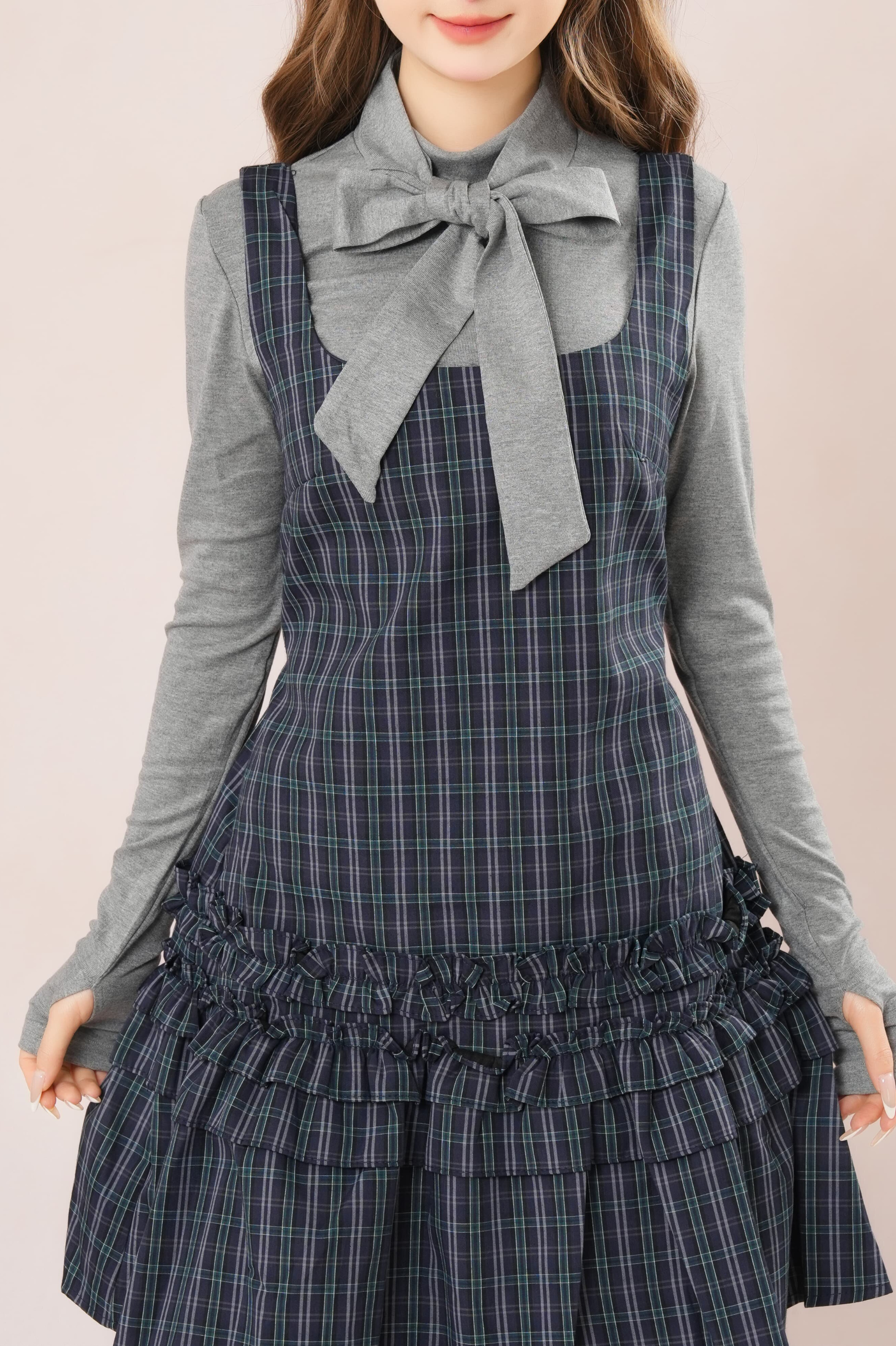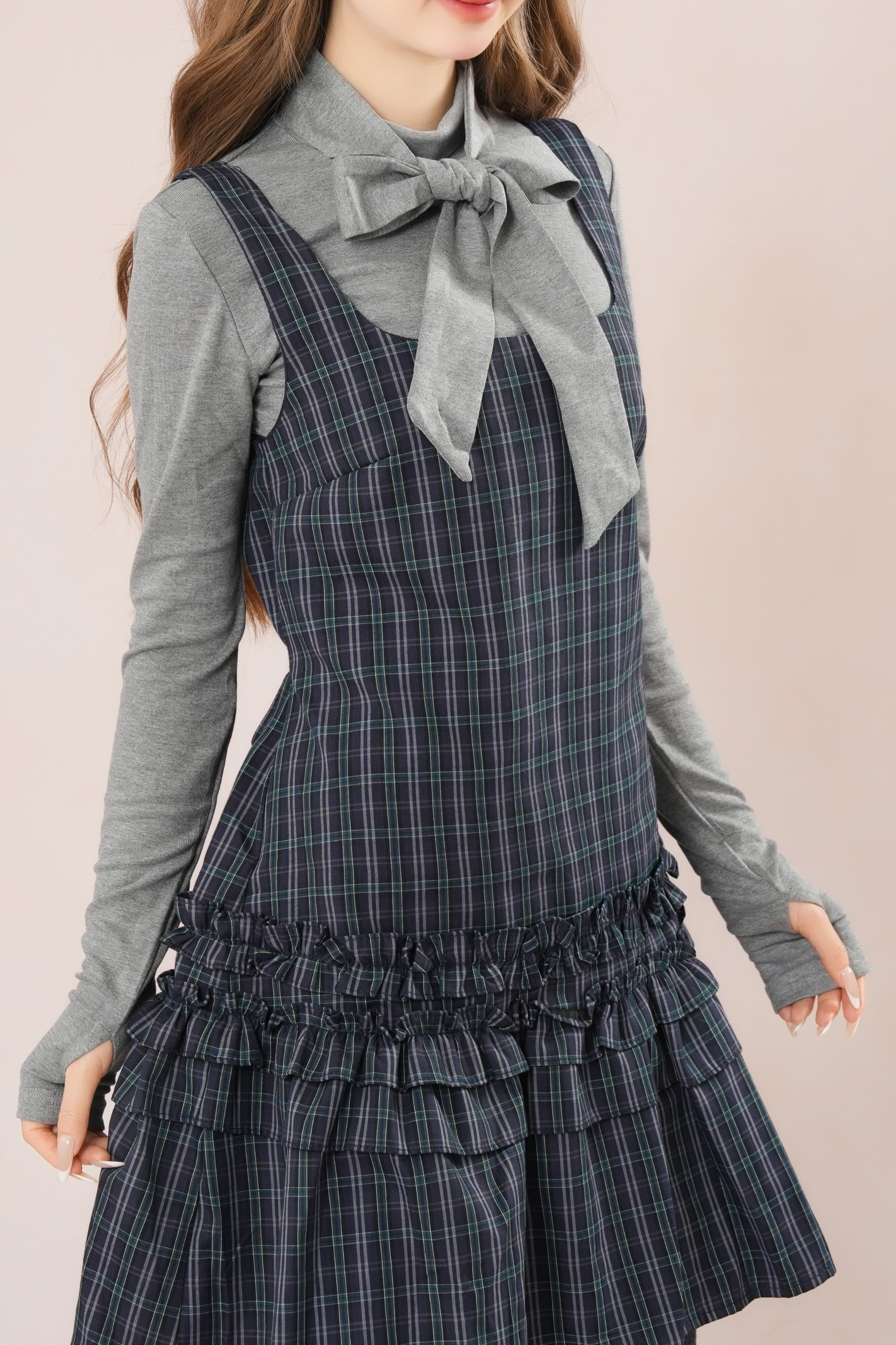 ダークフレンチフリルチェックノースリーブドレス+シャツ