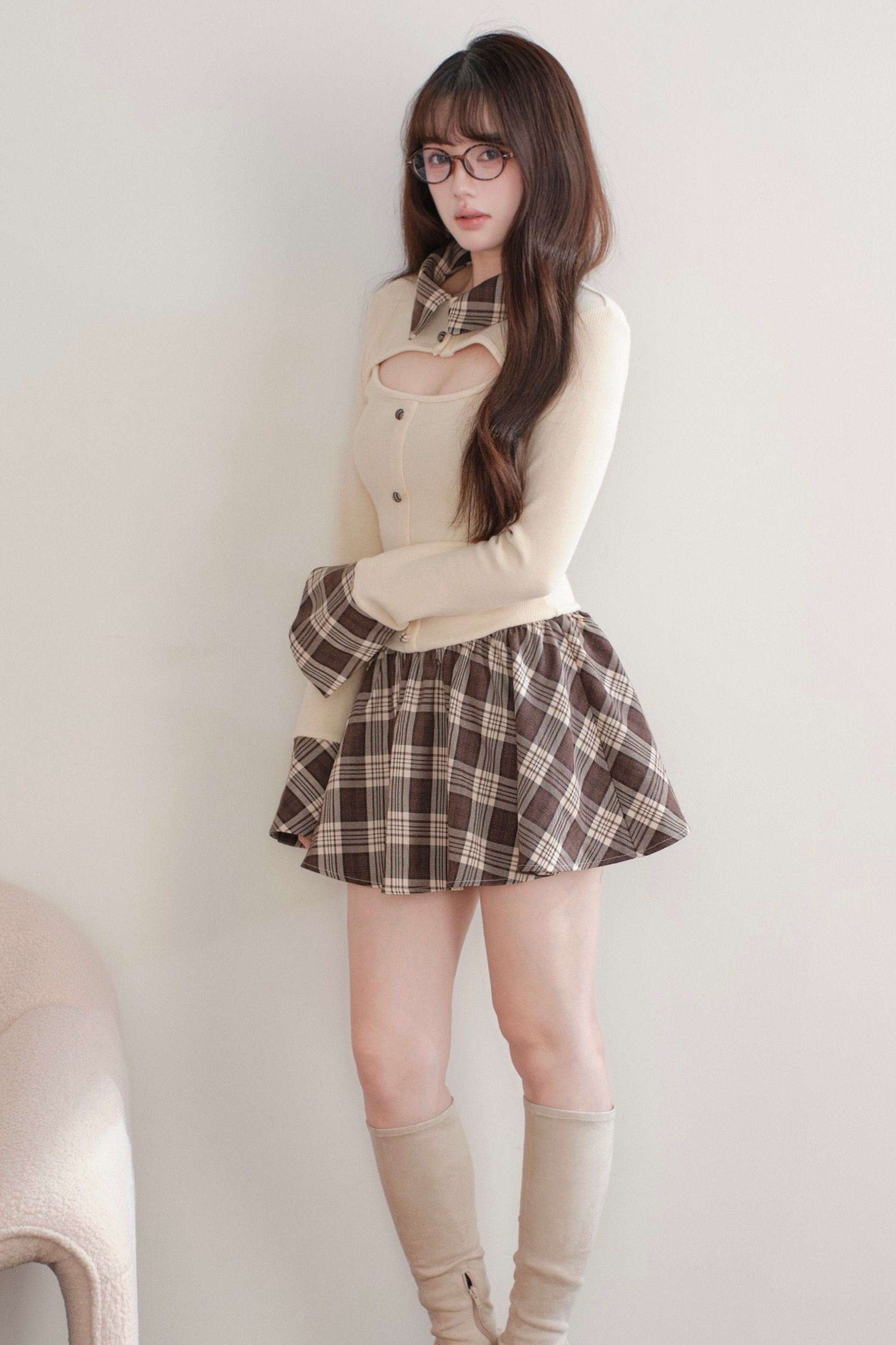 オープンネックチェックニットドレス