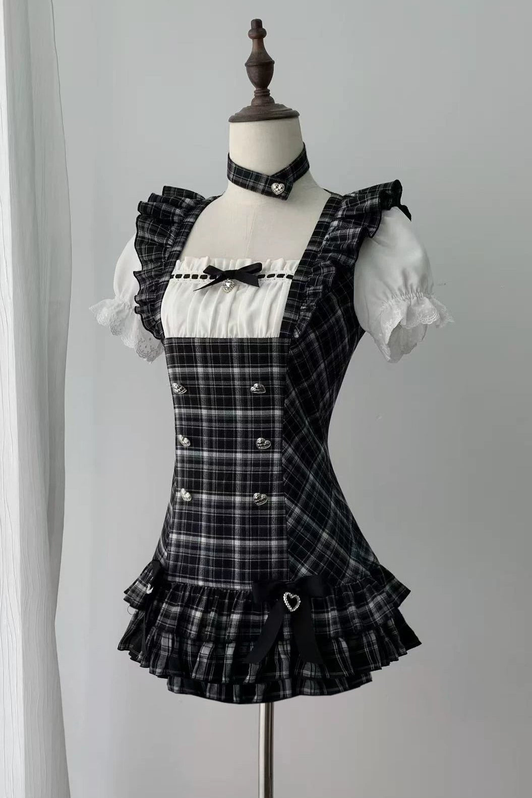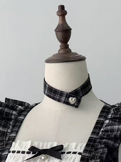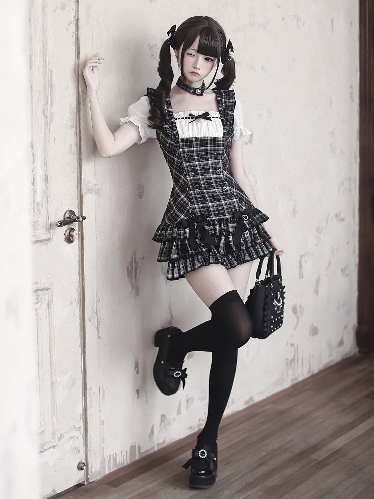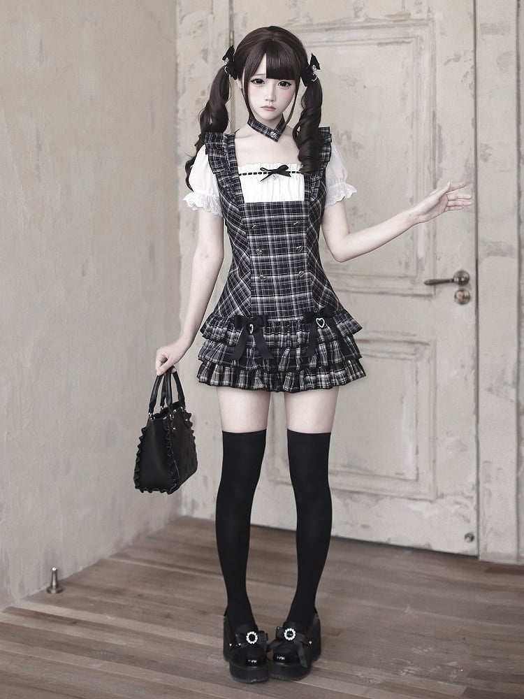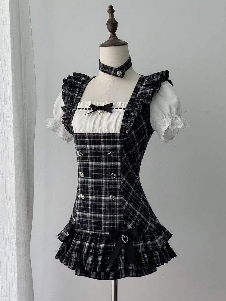 【4月29日予約締切】ブラックチェックフリルリボンパフスリーブミニドレスセットアップ+チョーカー