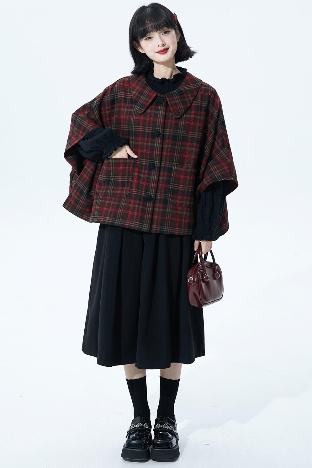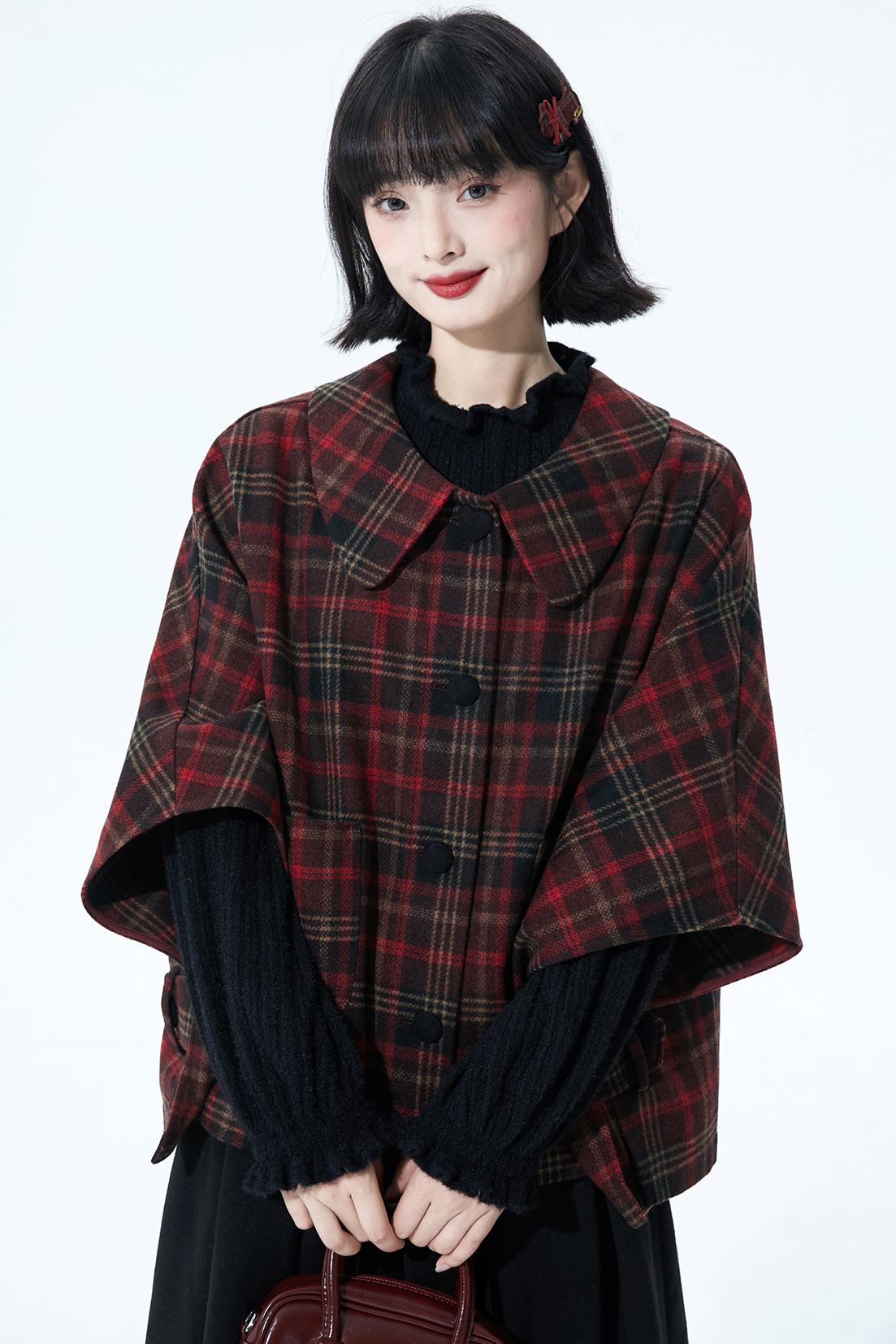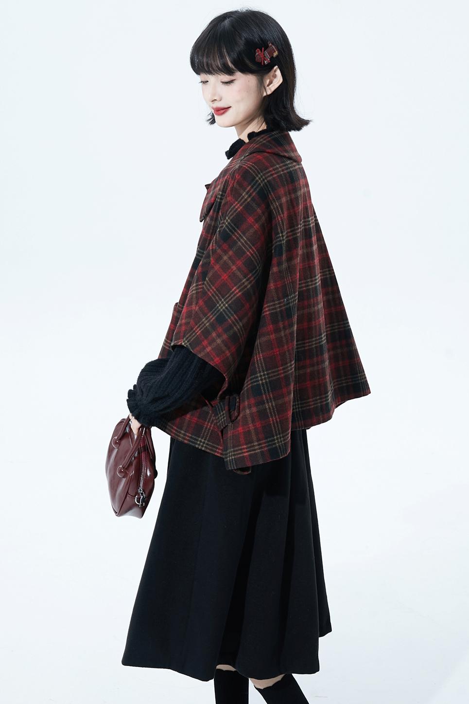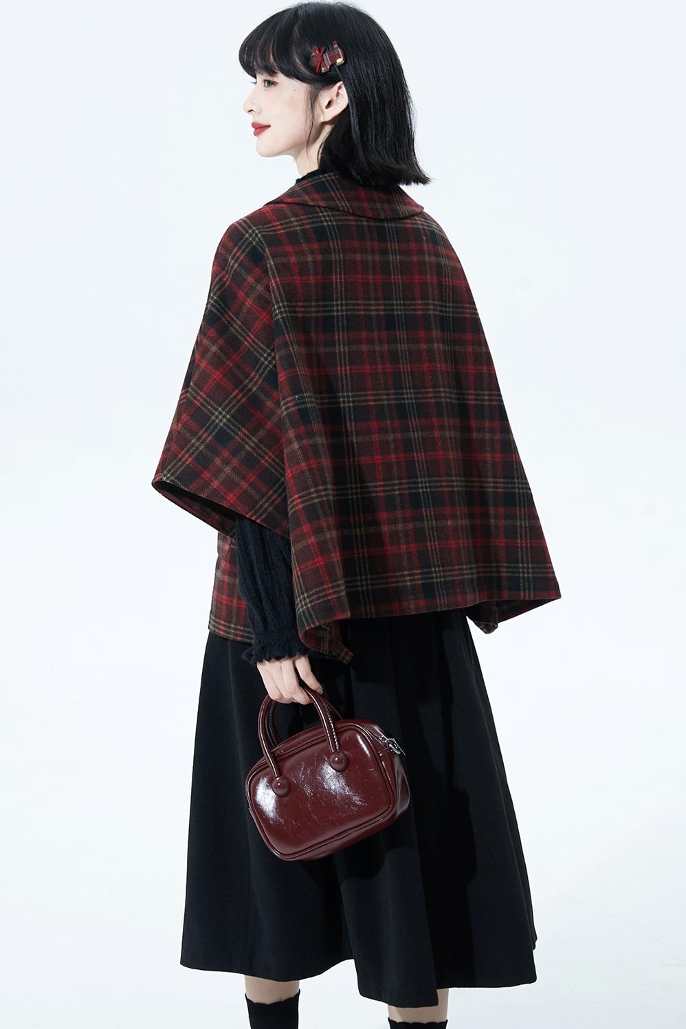 レッドブラウンチェックケープコート
