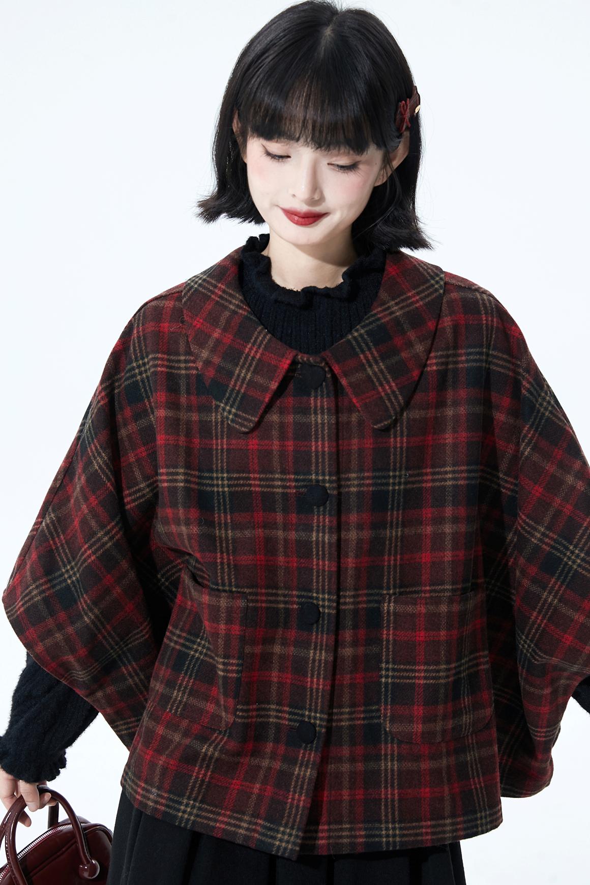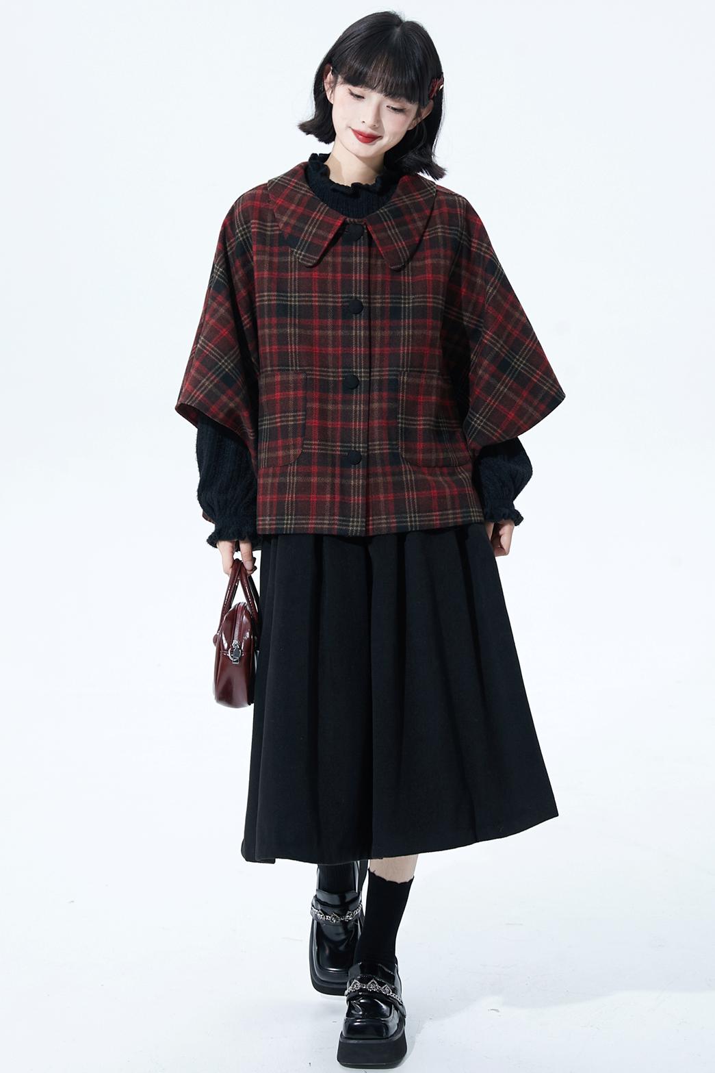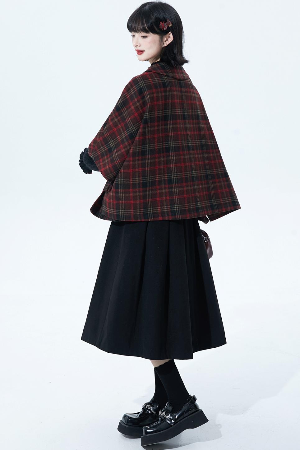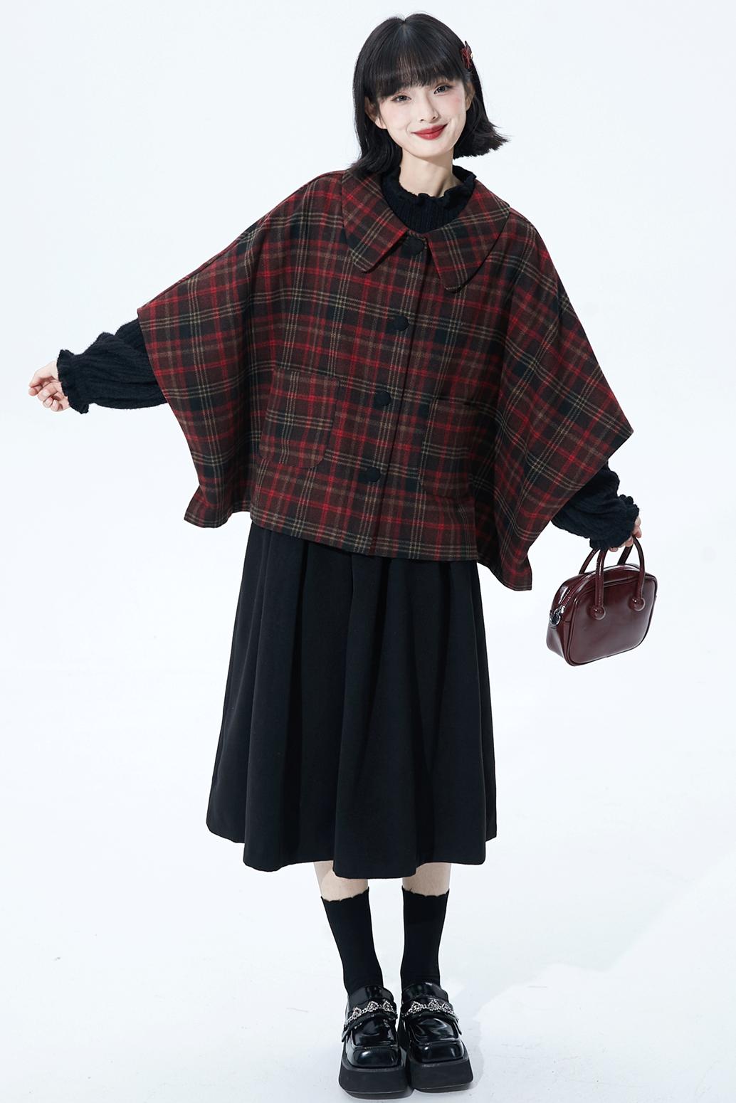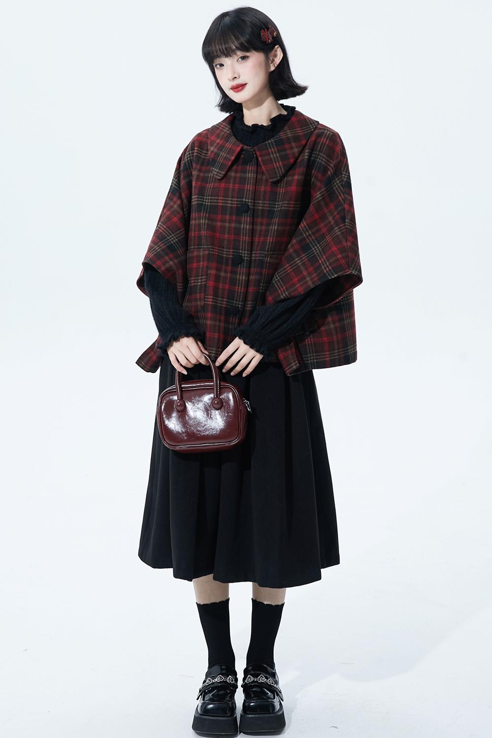 レッドブラウンチェックケープコート