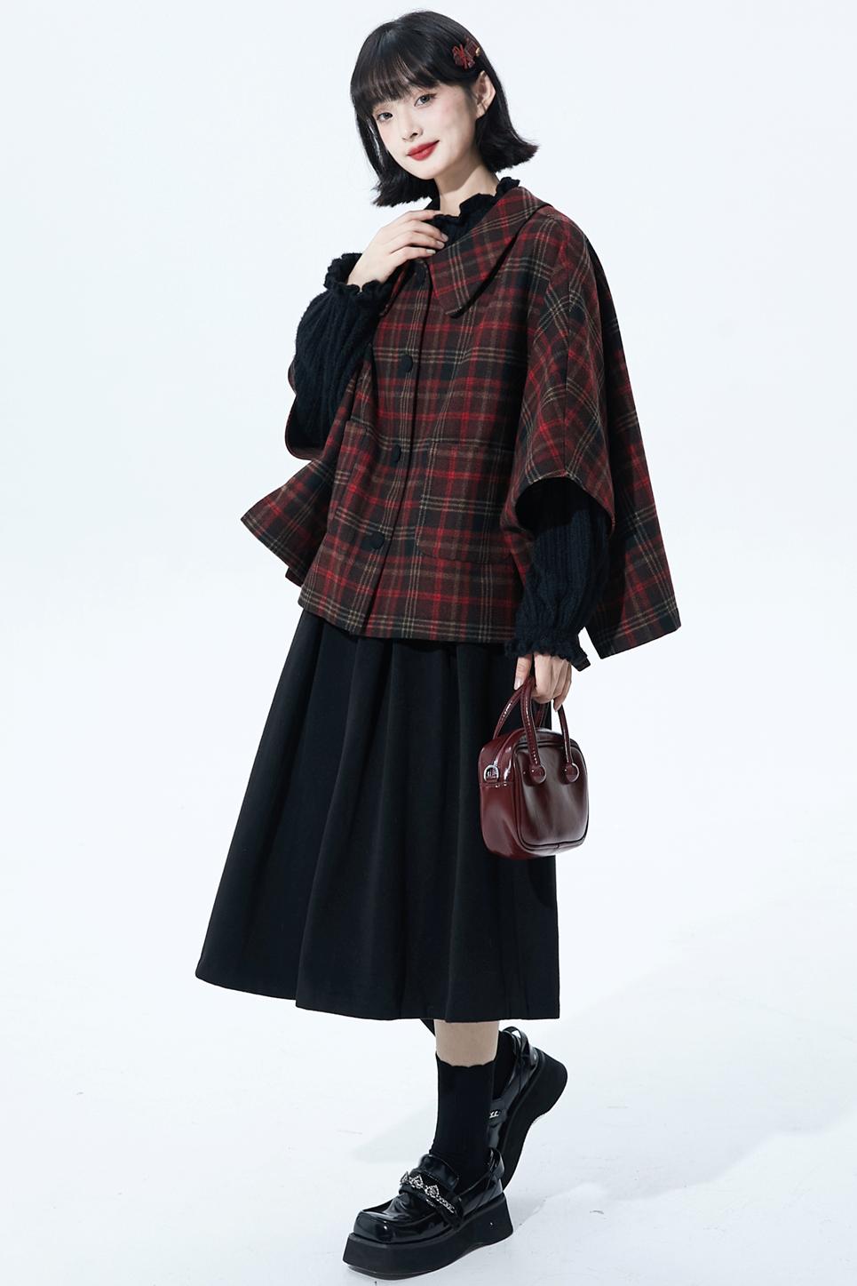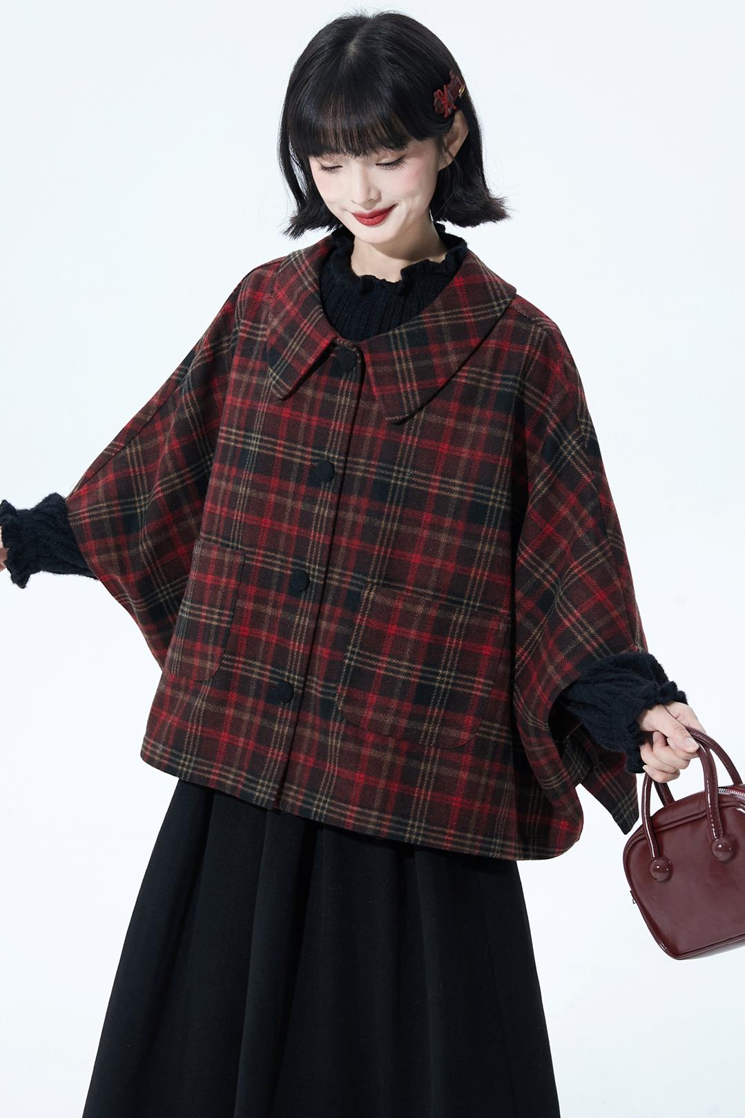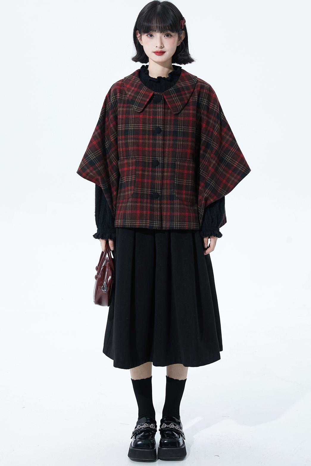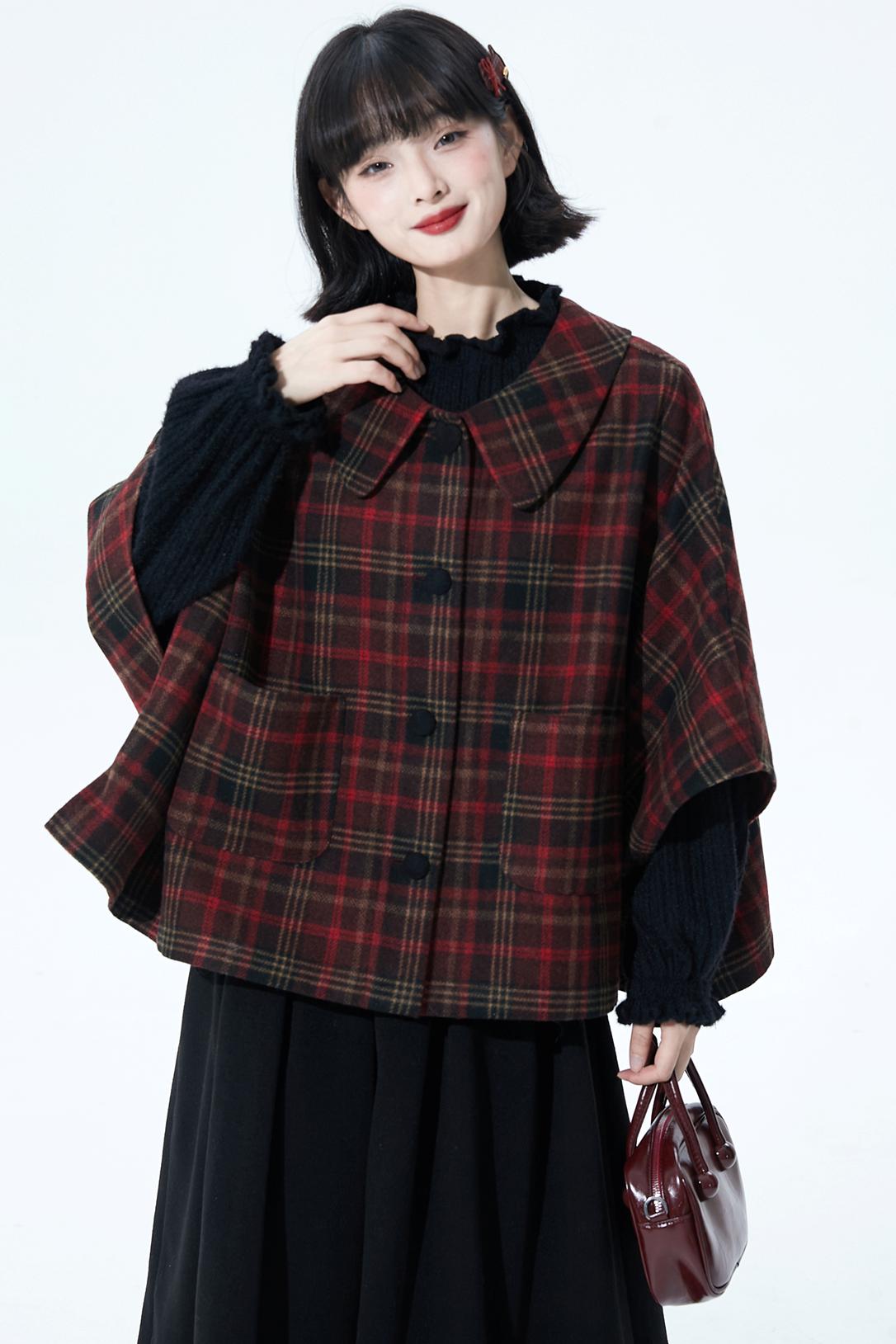 レッドブラウンチェックケープコート