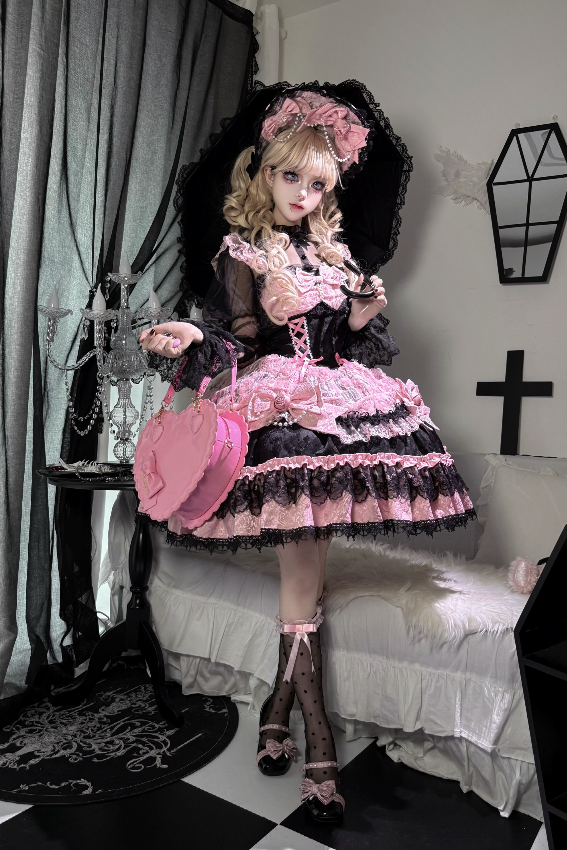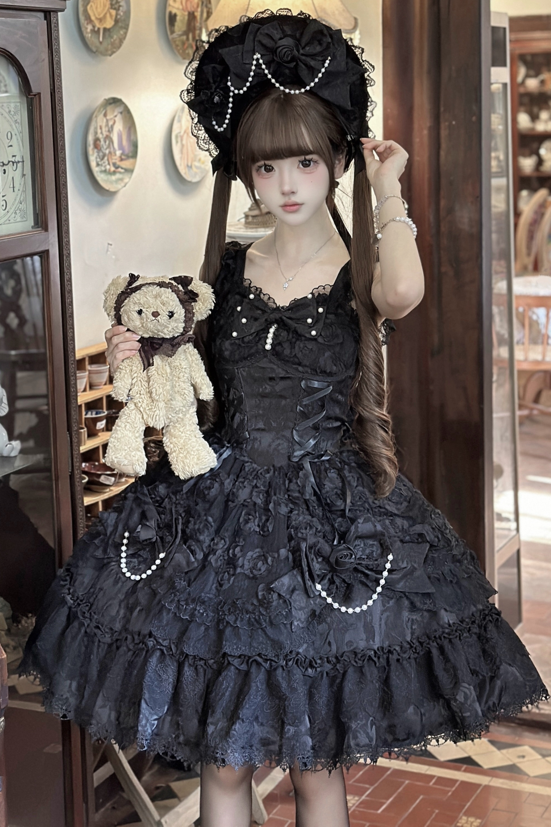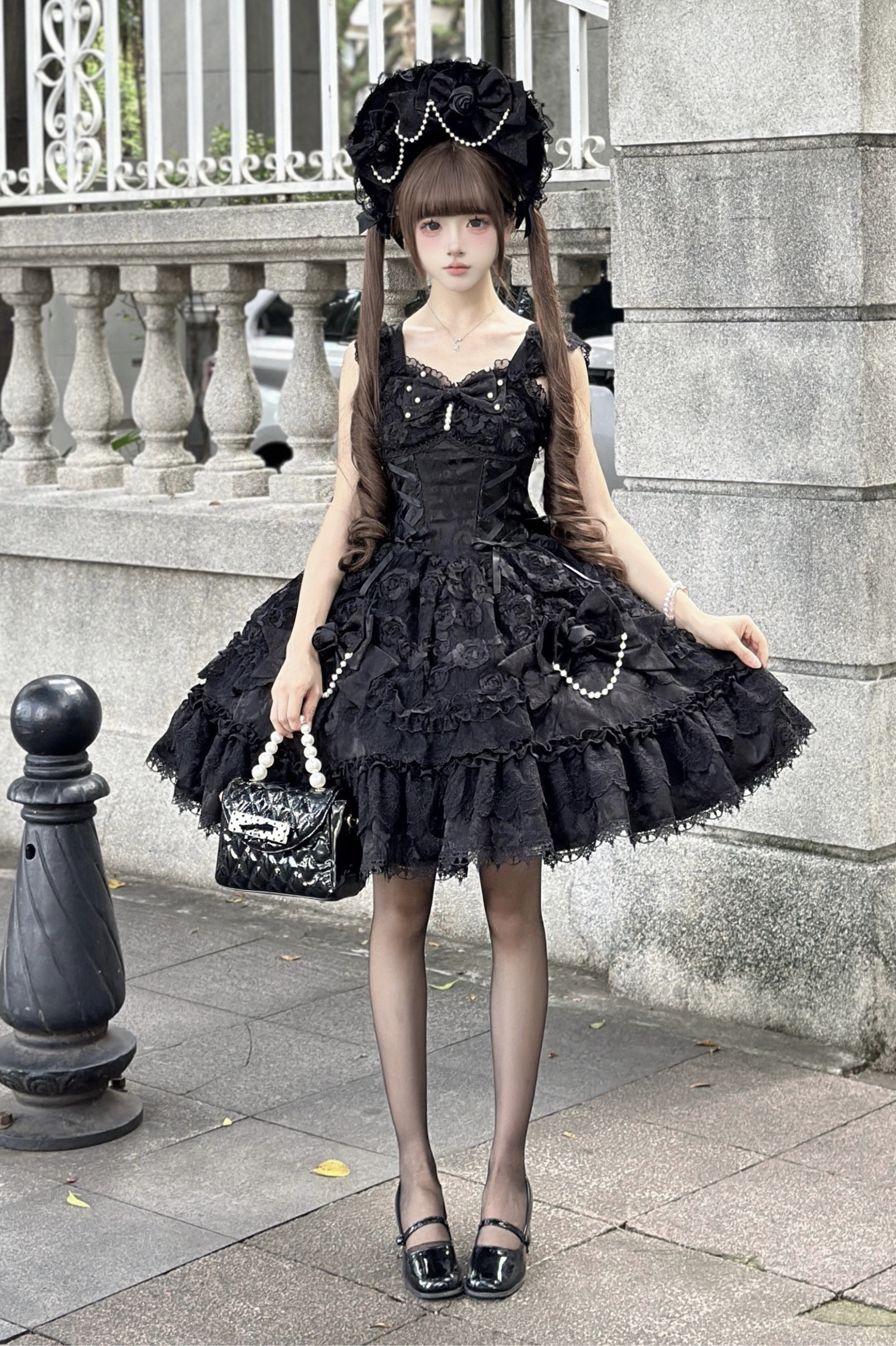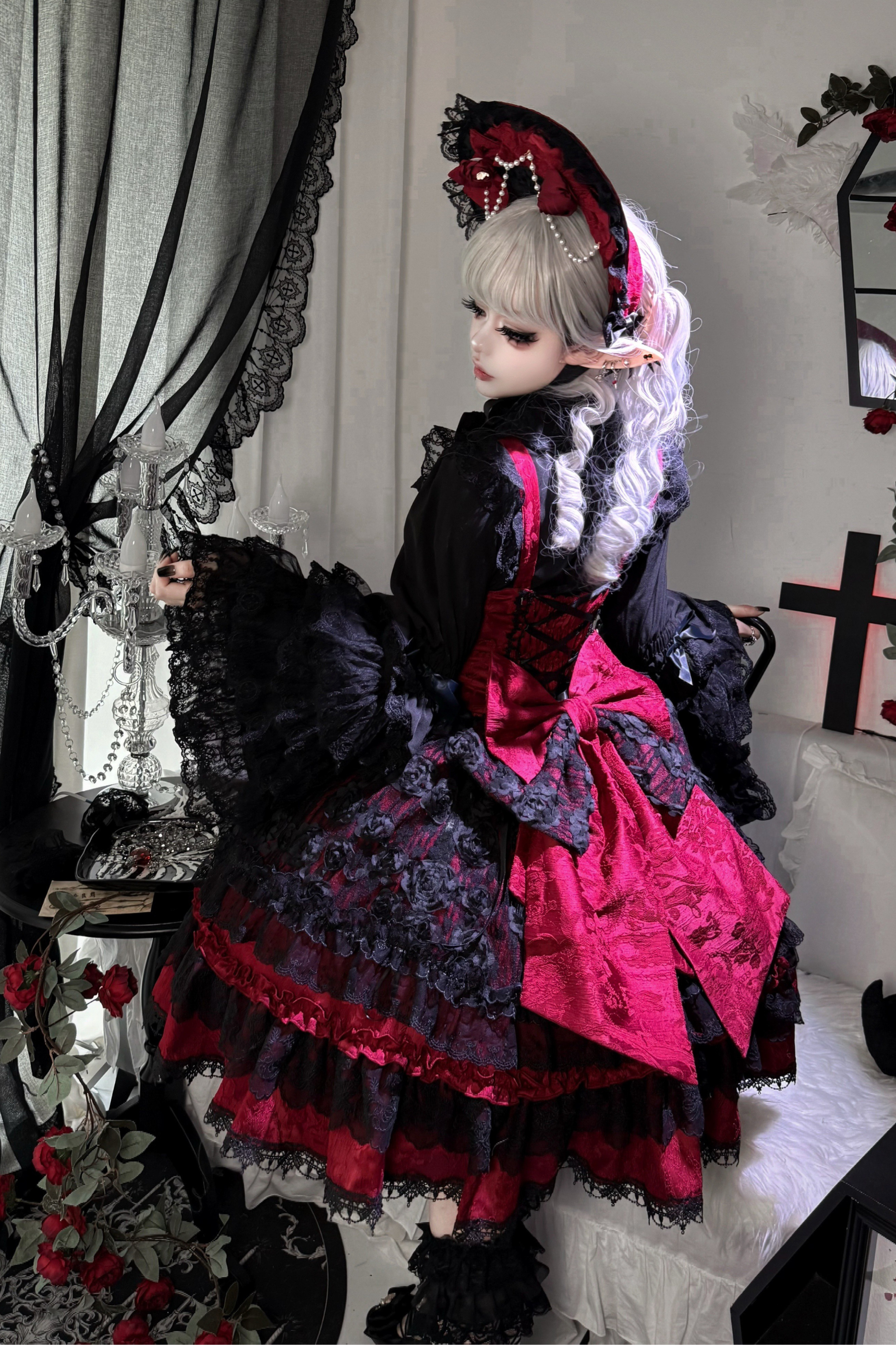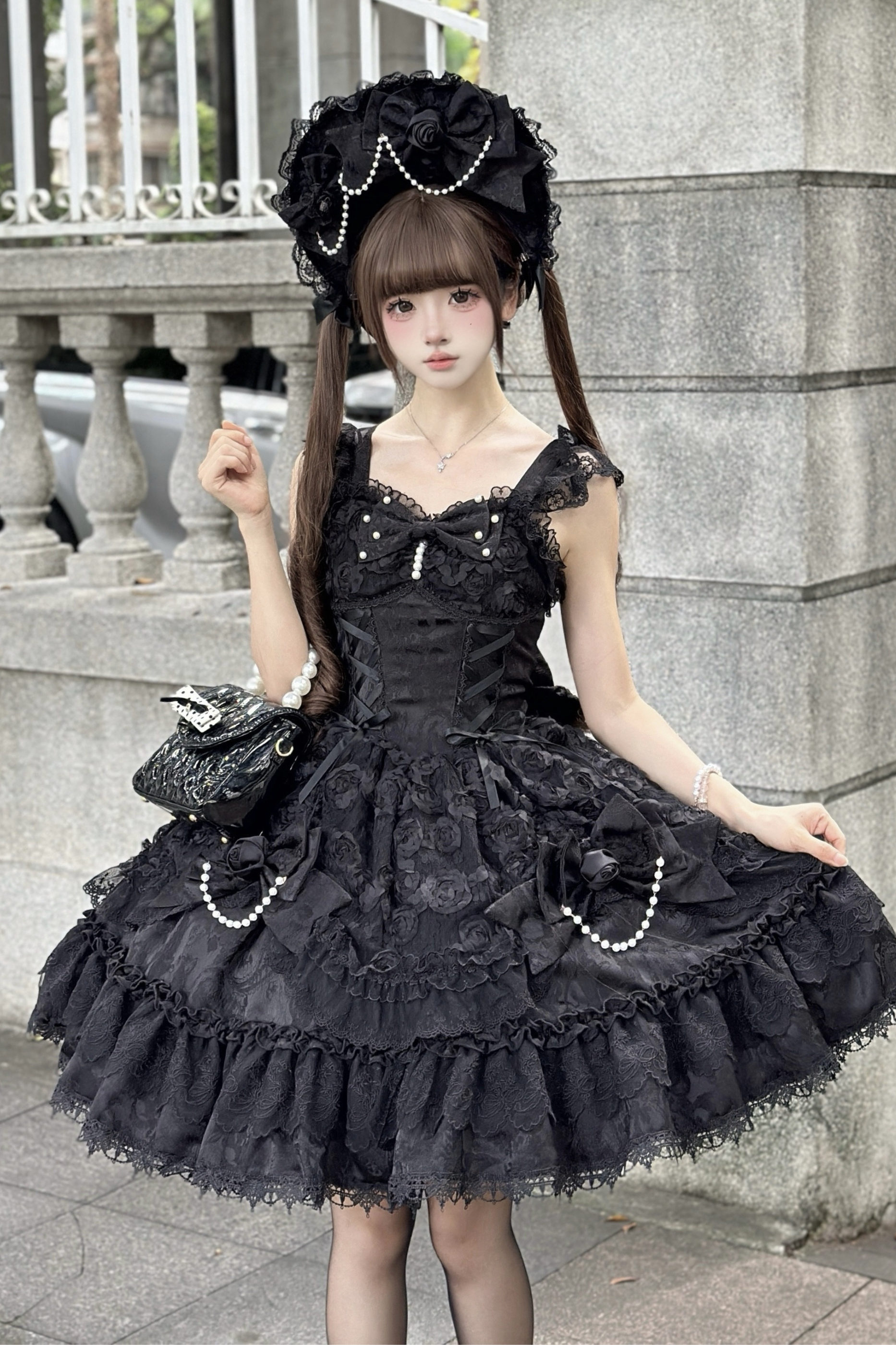 ローズフリルプリンセスジャンパースカート+バッグリボン+ボンネット