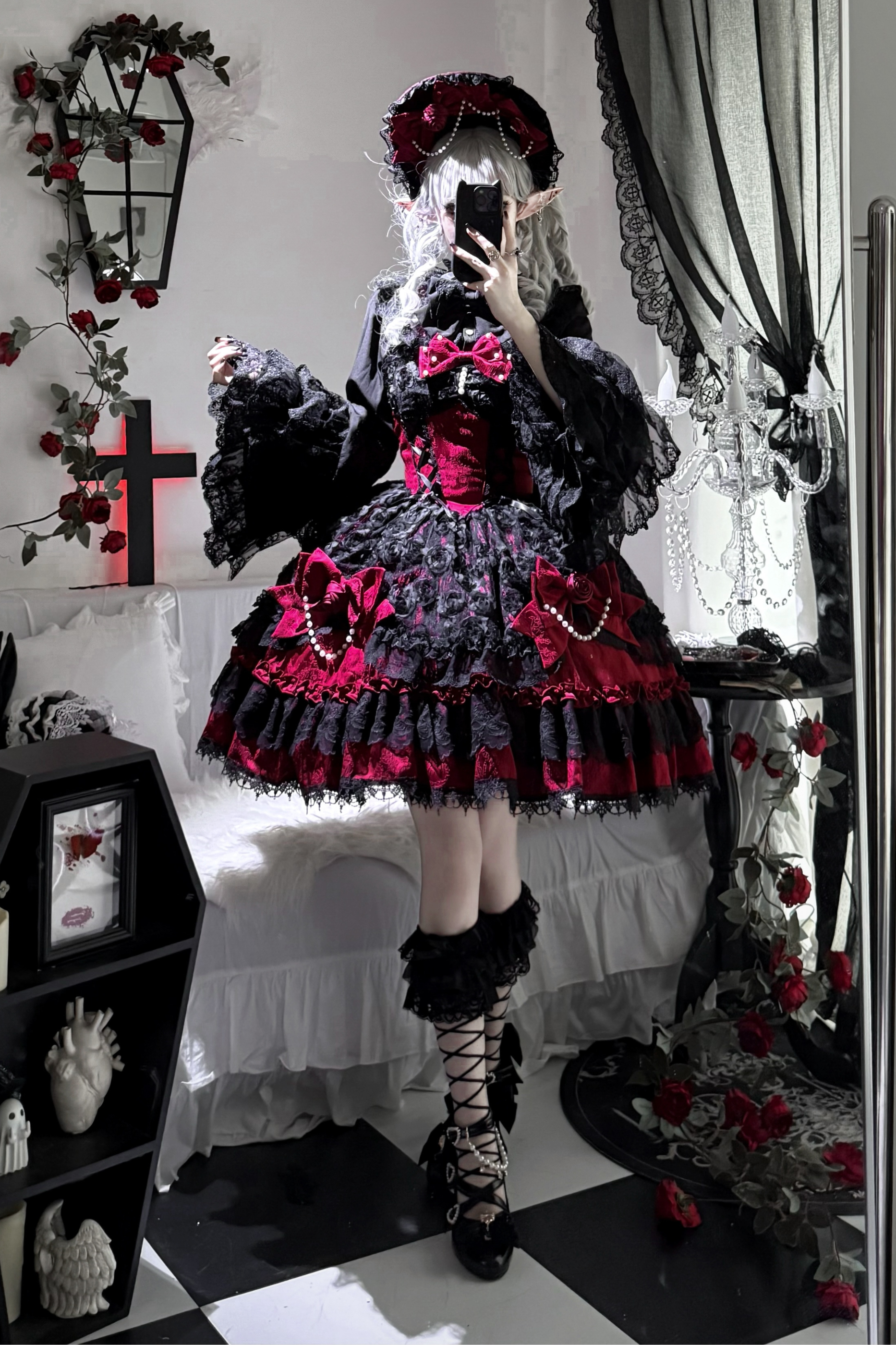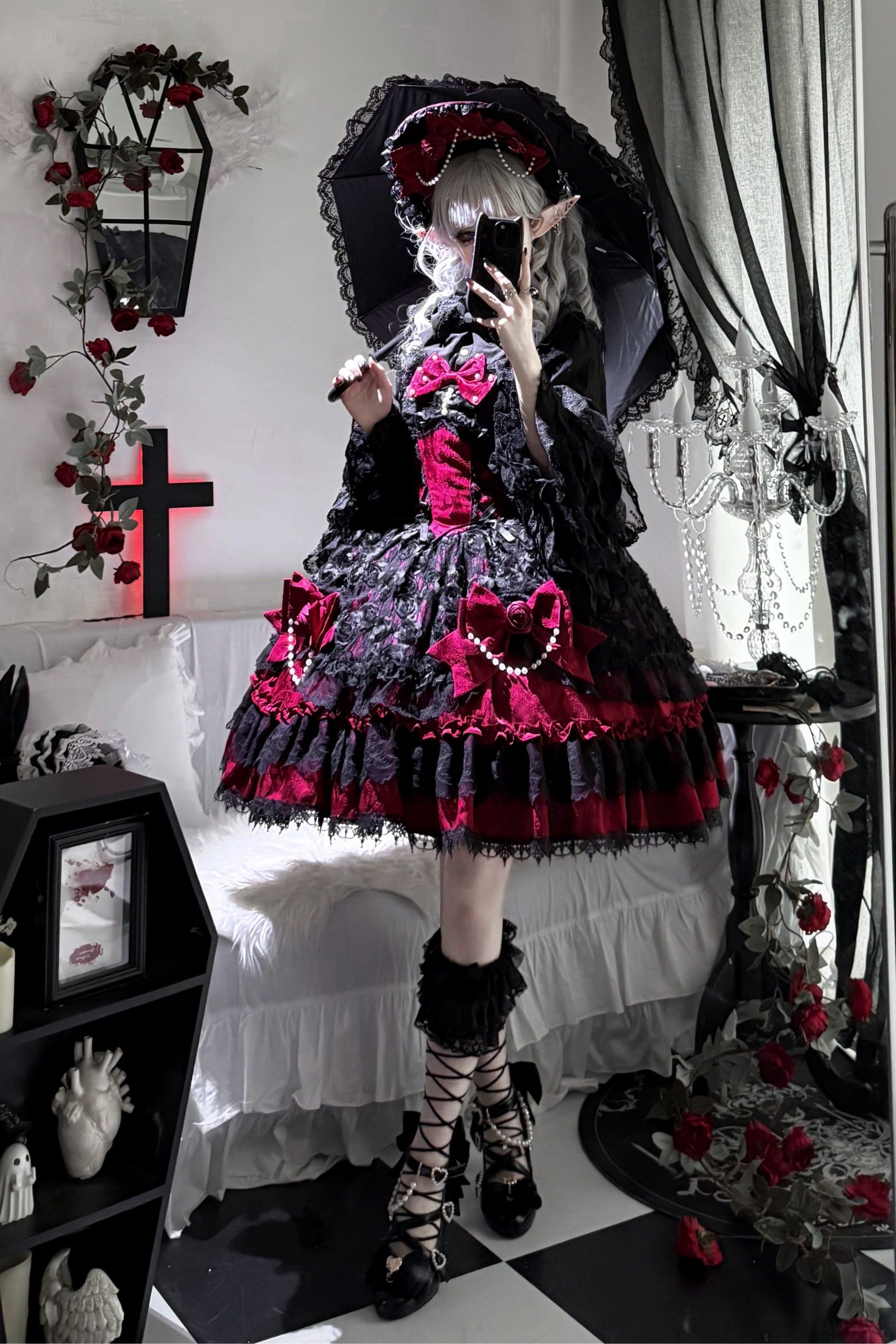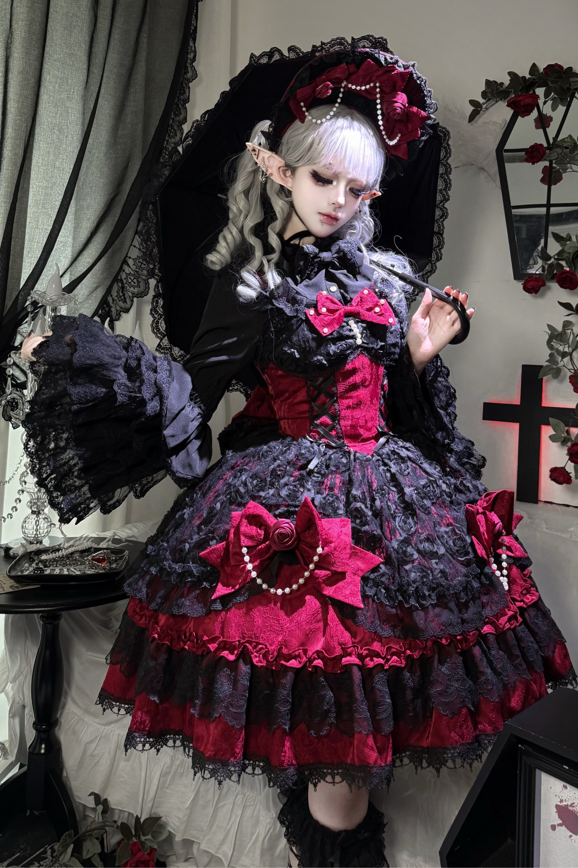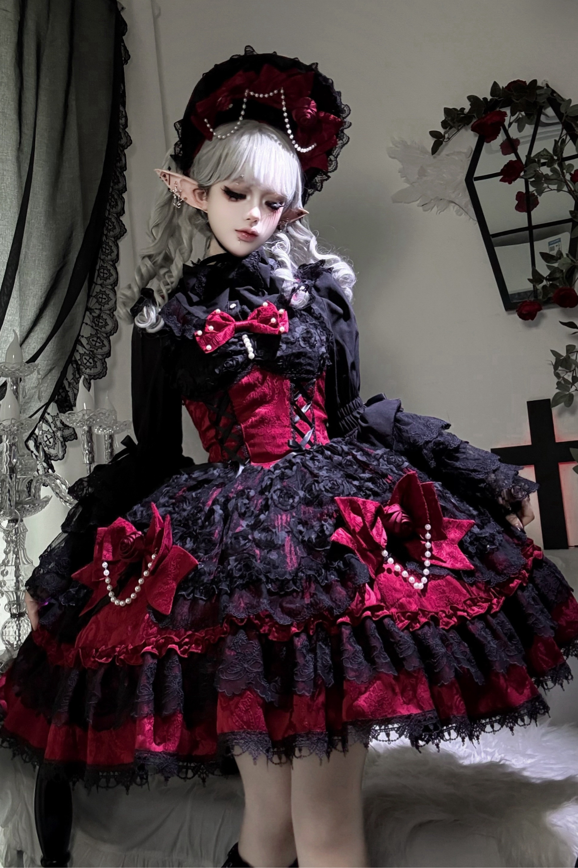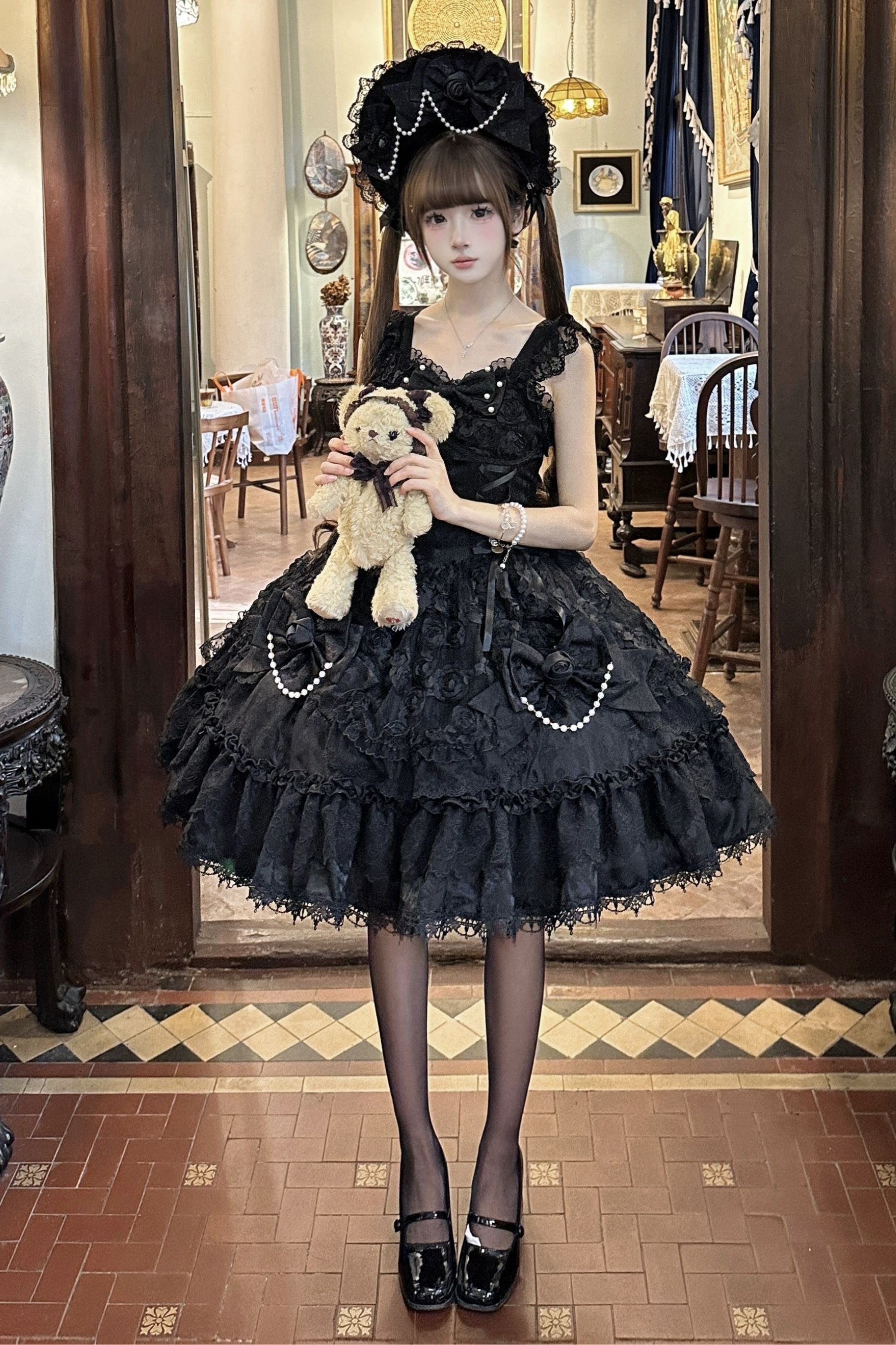 ローズフリルプリンセスジャンパースカート+バッグリボン+ボンネット