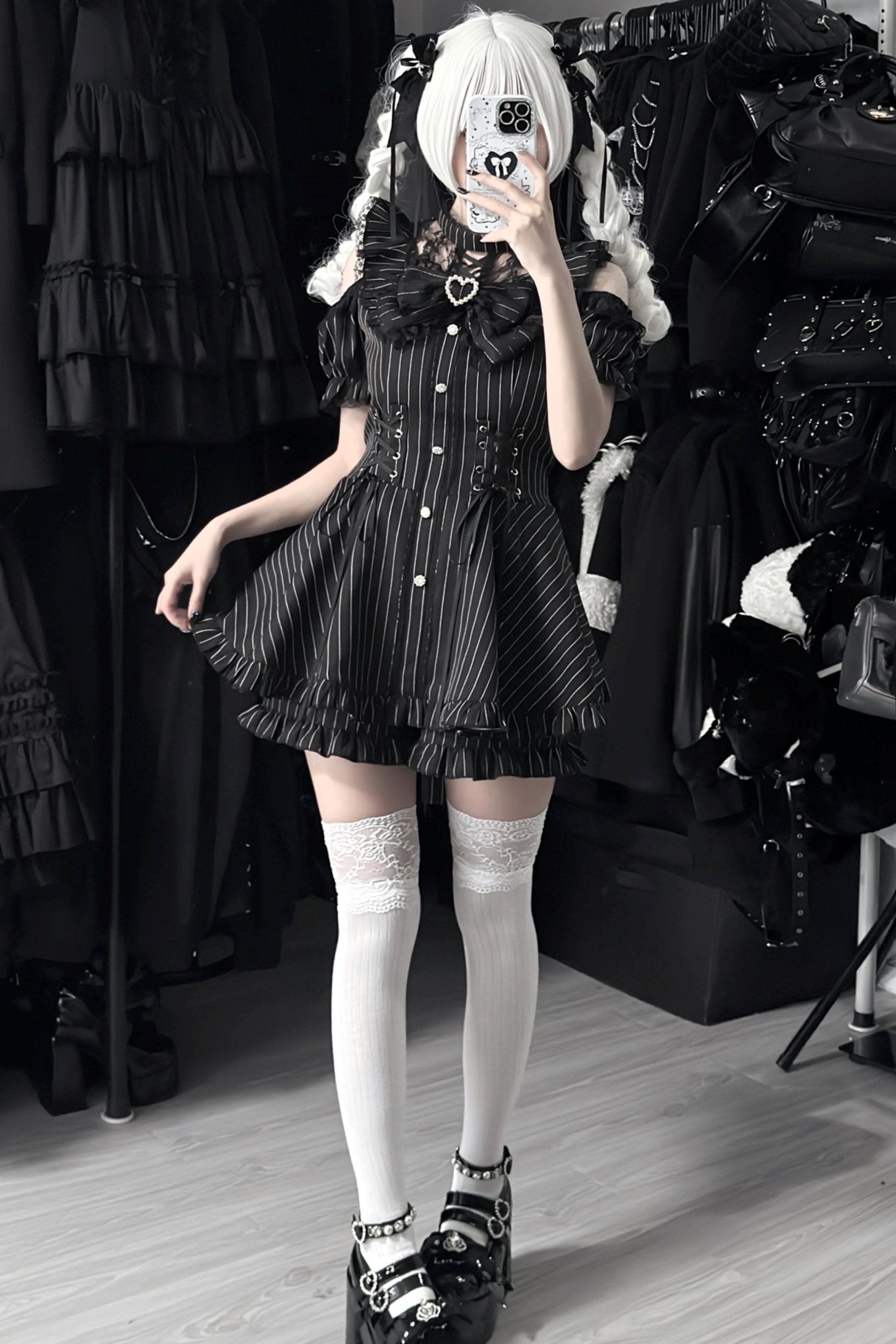 ブラック/ストライプゴシックレースリボンドレスセットアップ