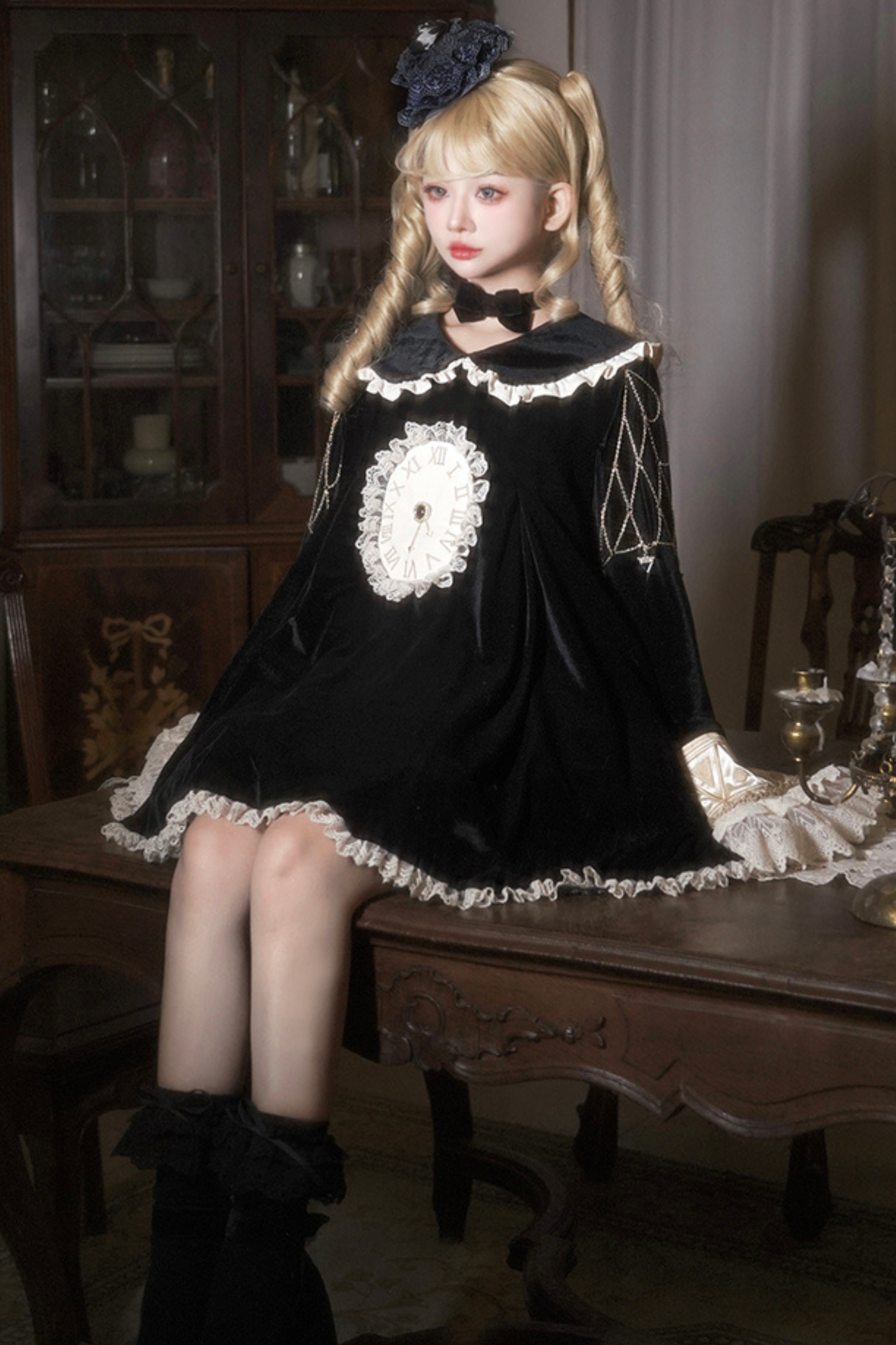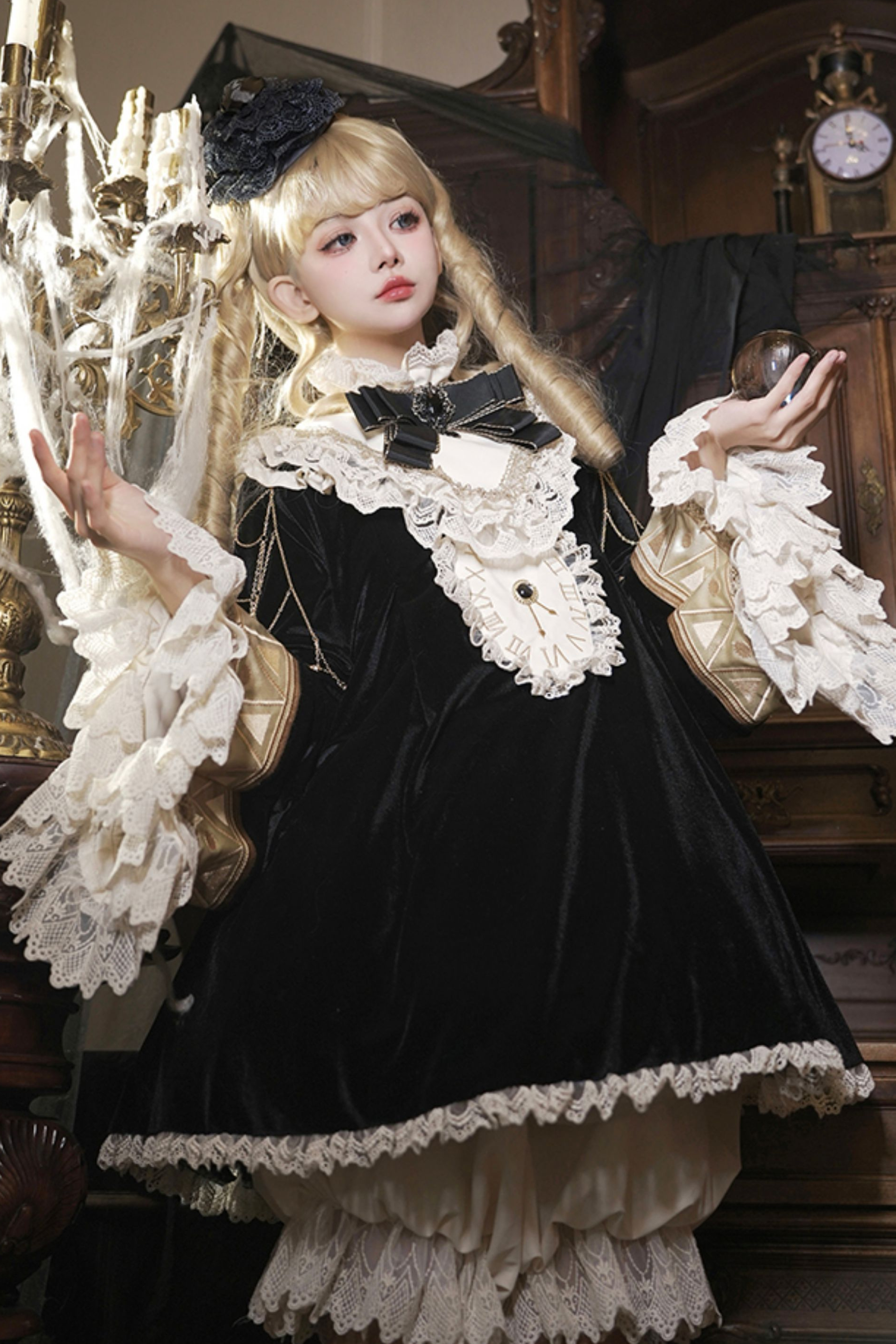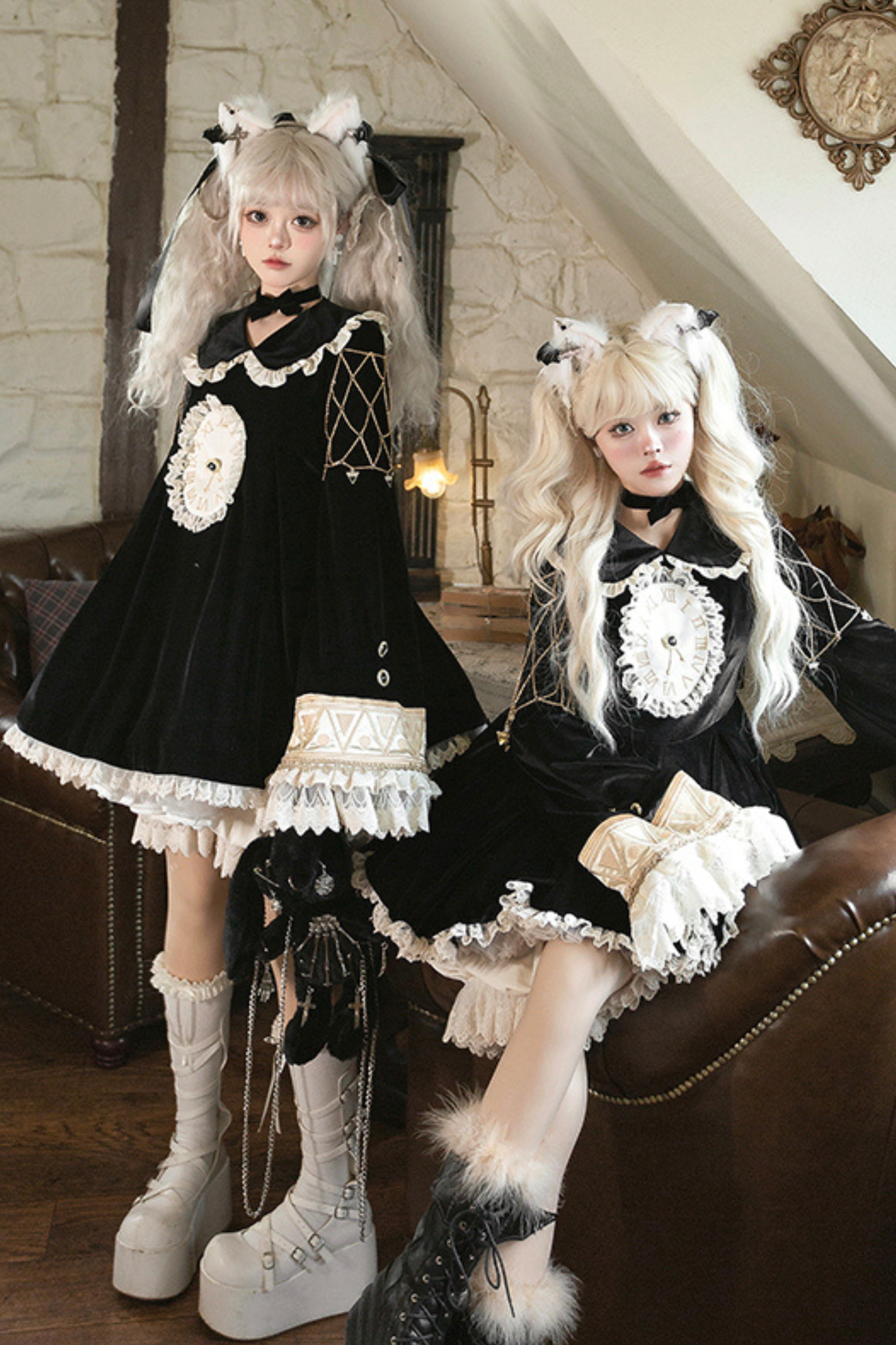 黒猫フリルクロックロリータドレス+パンプキンパンツ