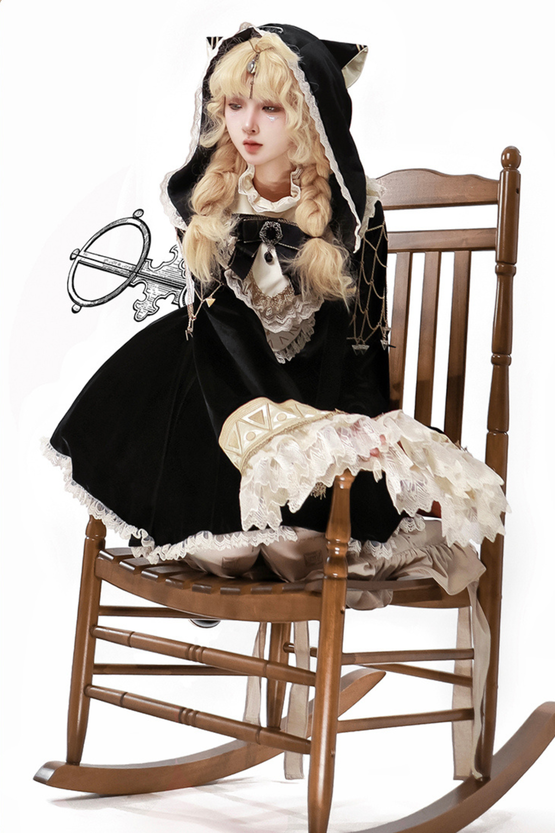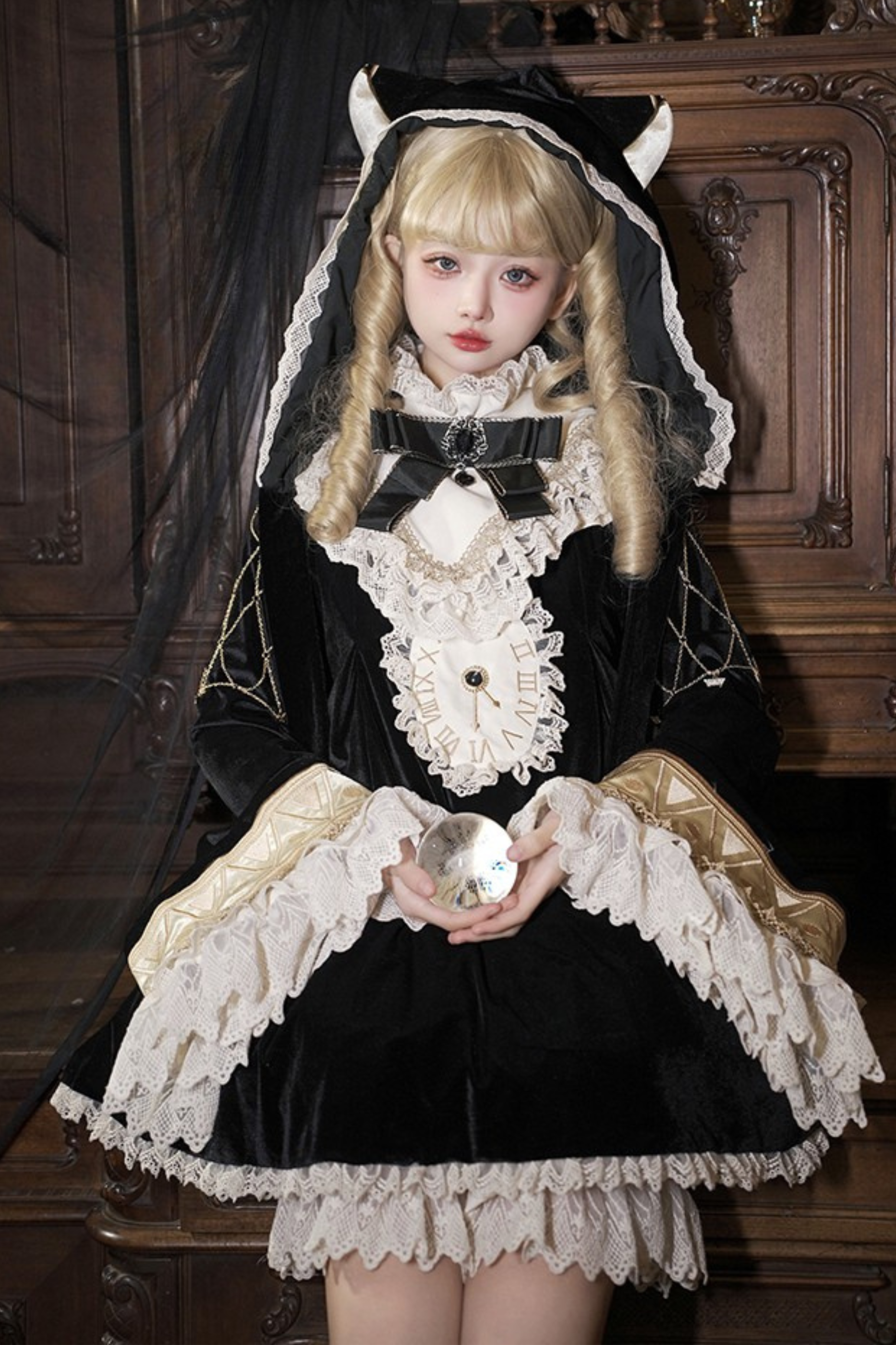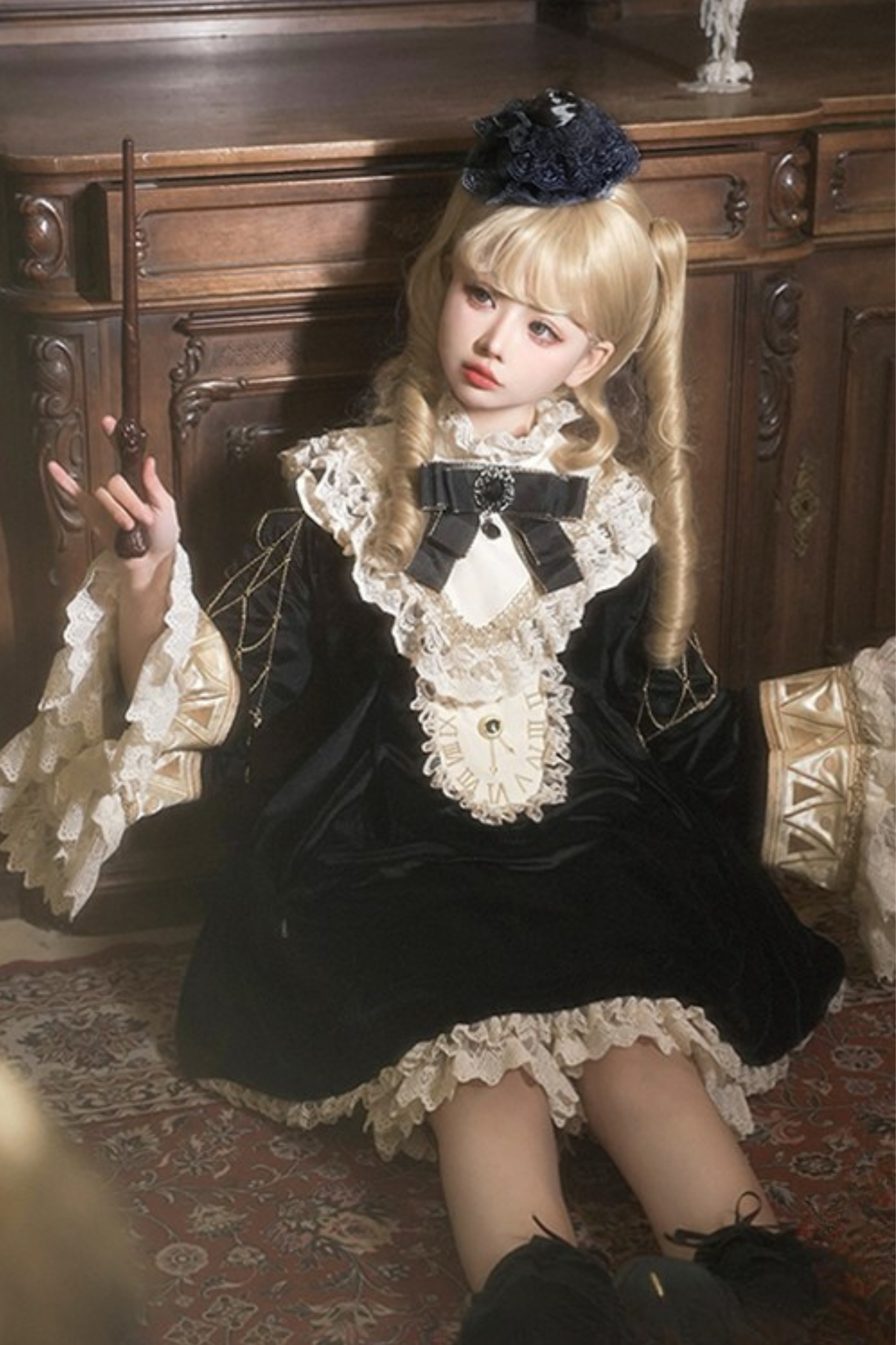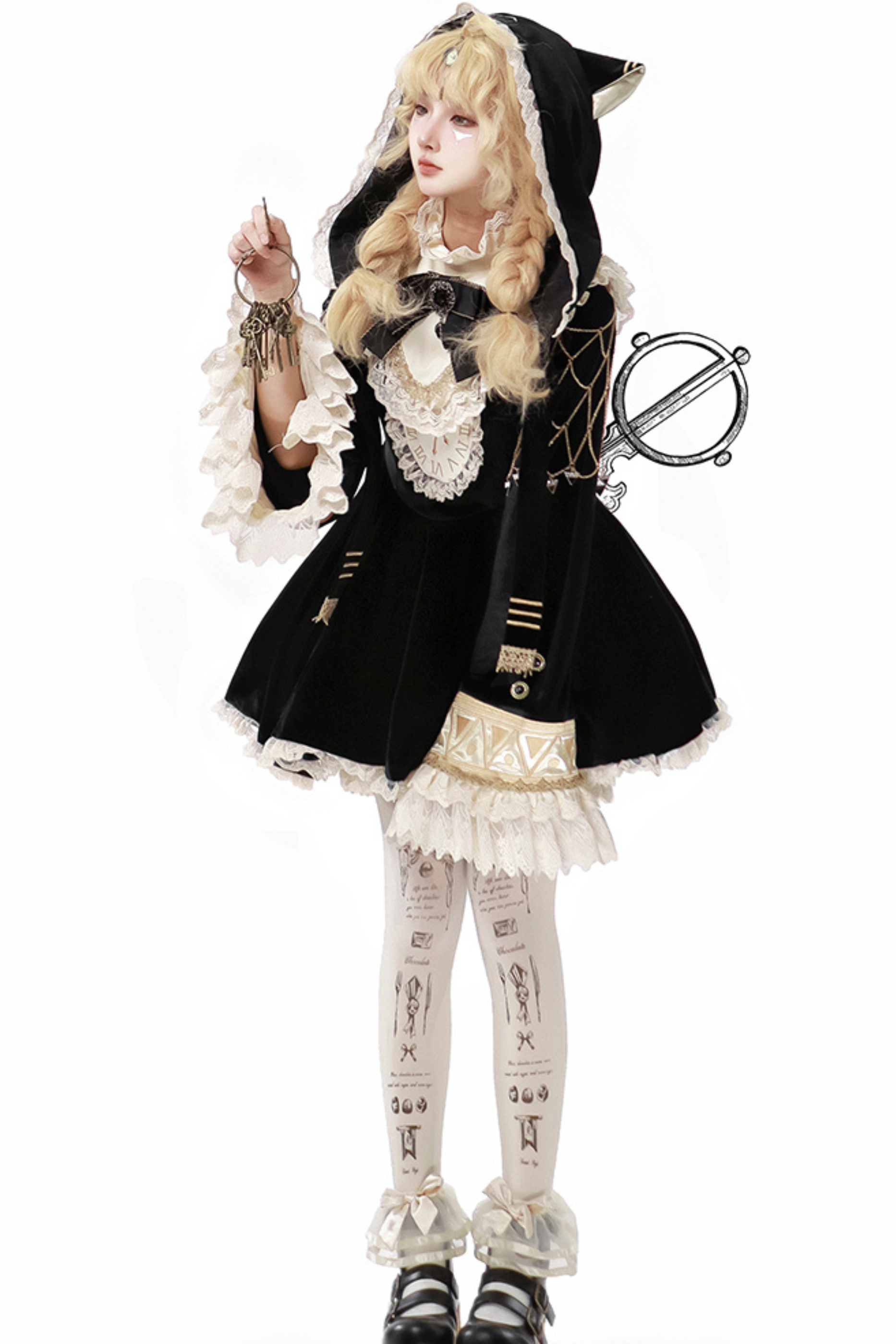 黒猫フリルクロックロリータドレス+パンプキンパンツ