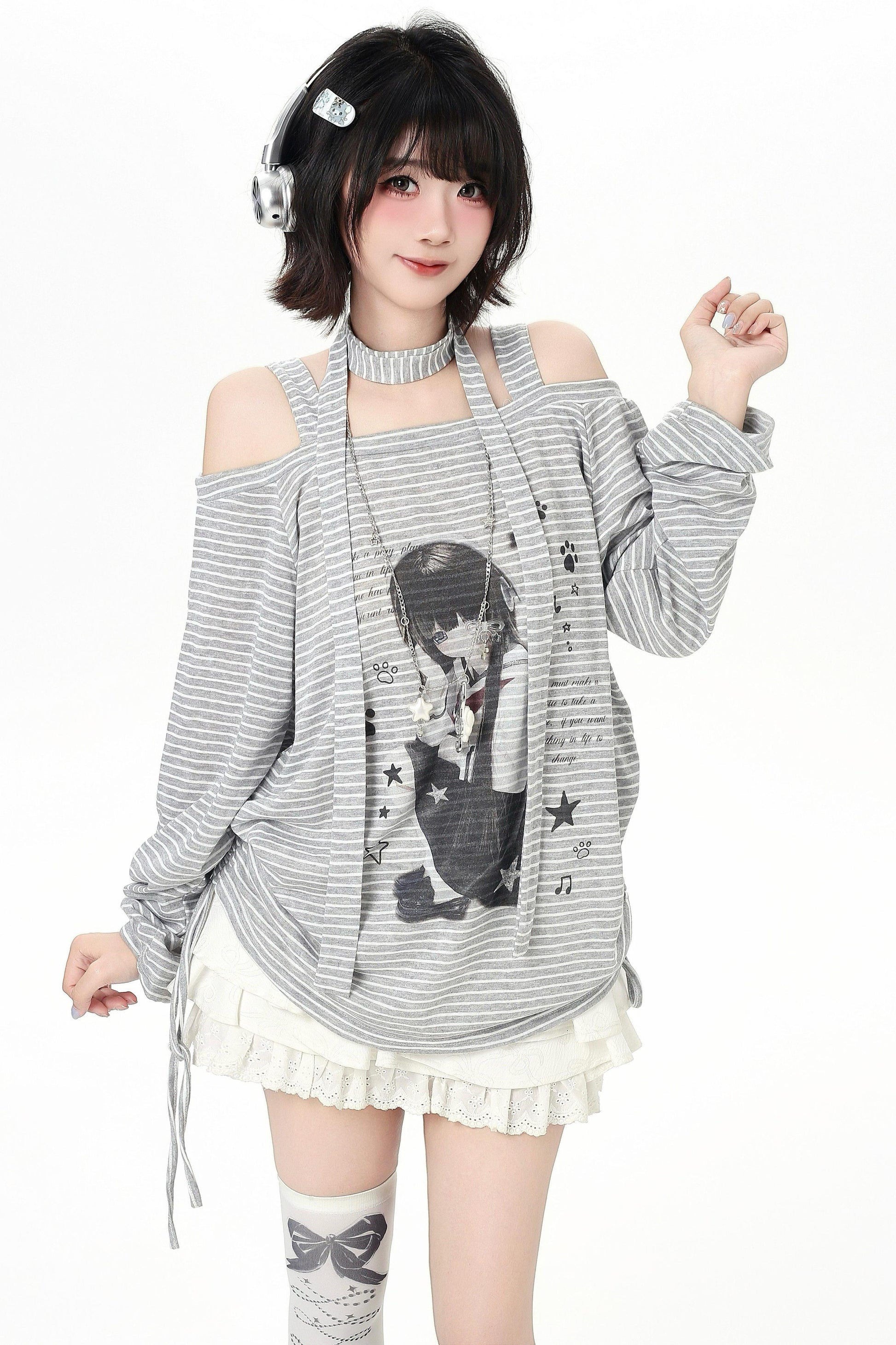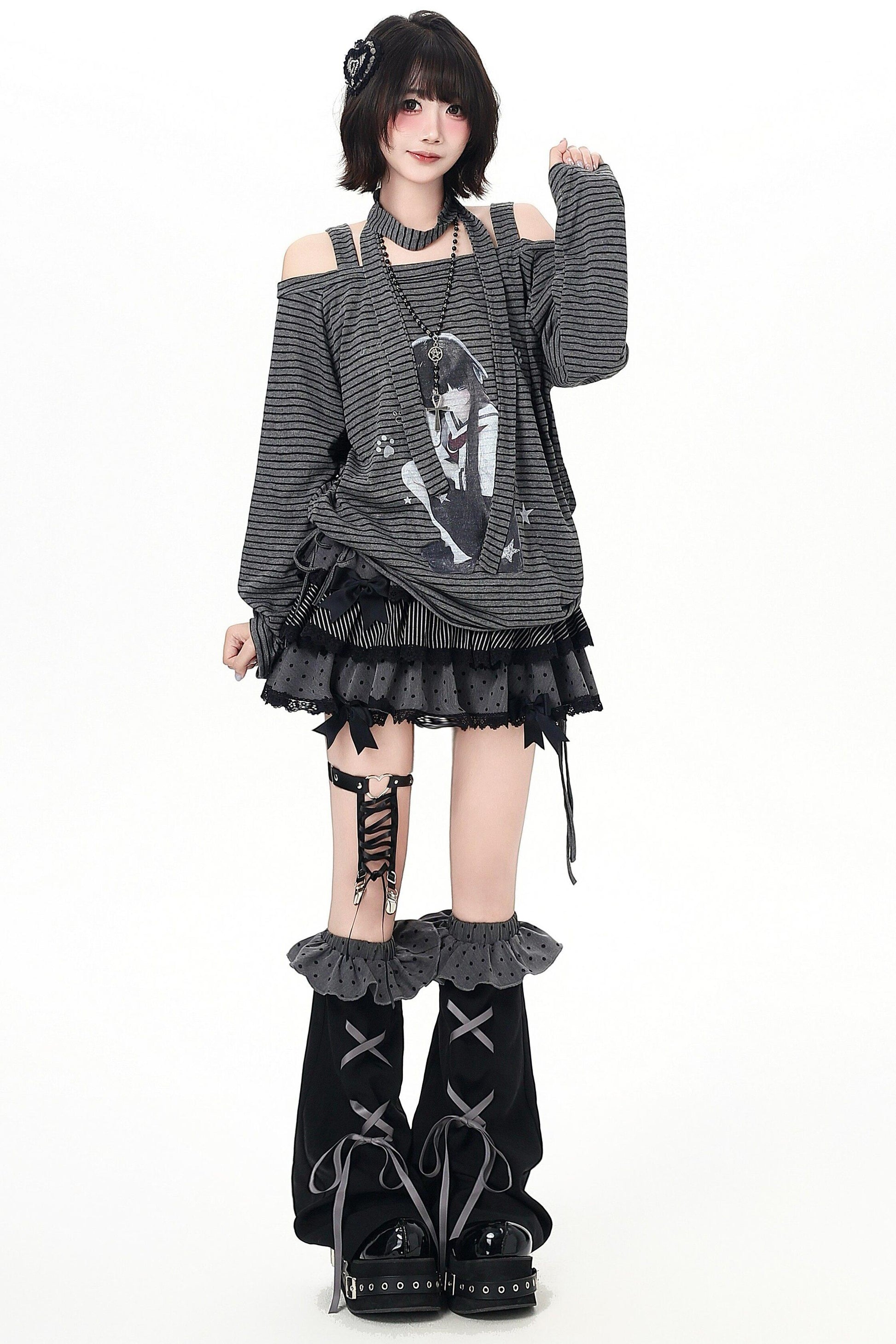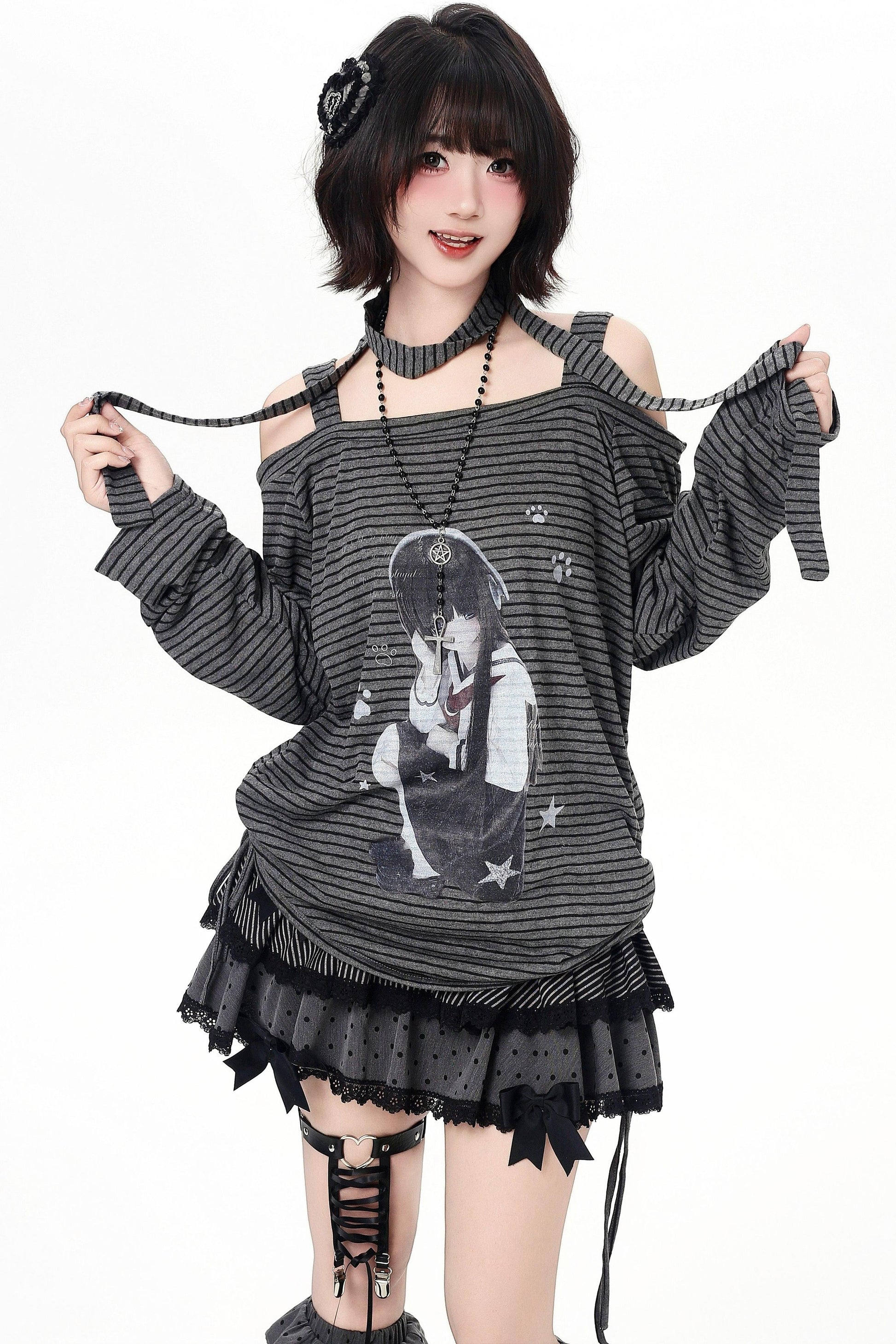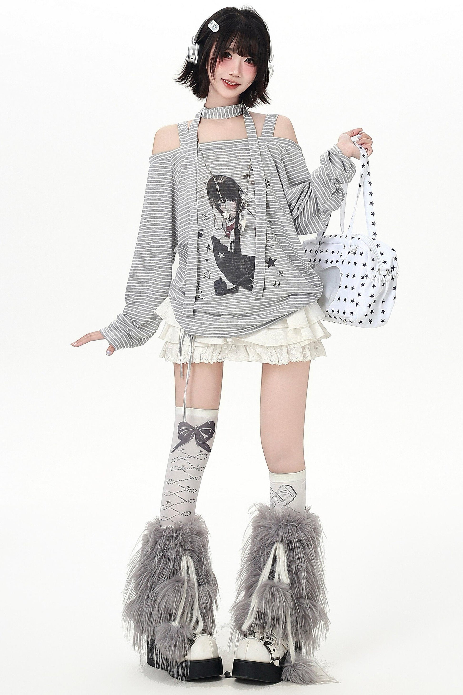 ストライプオフショルダードロストルーズロンT(ストール付き)
