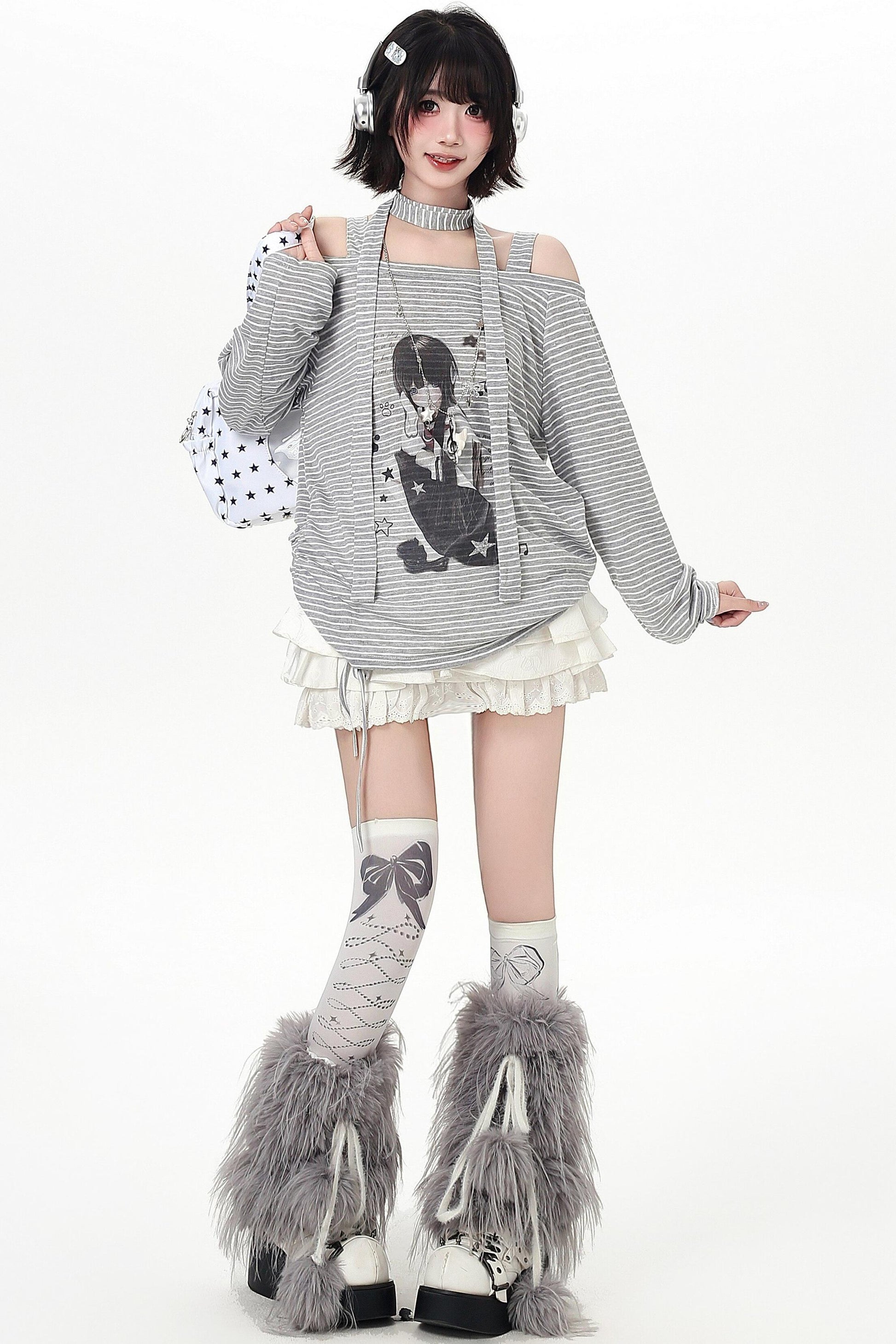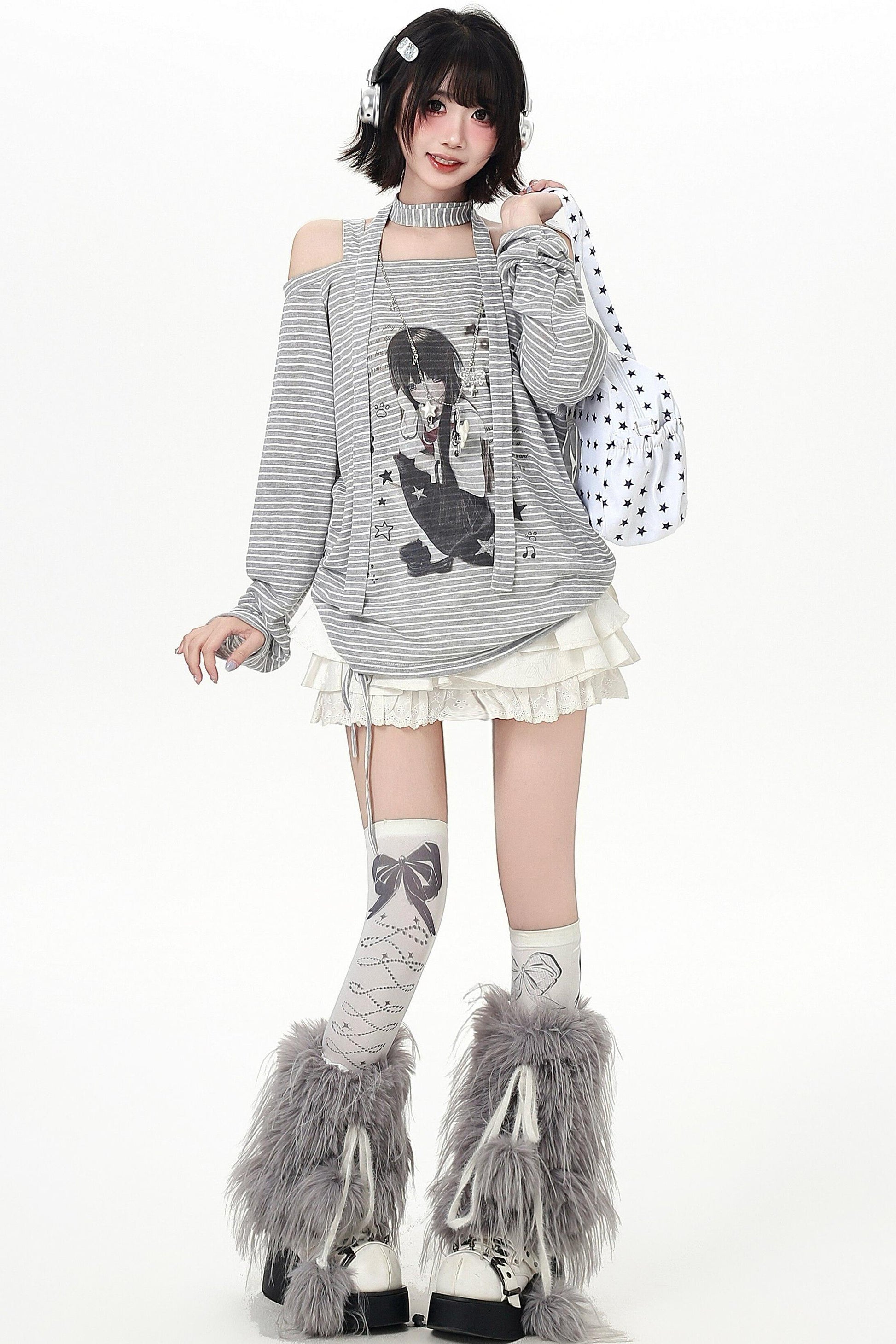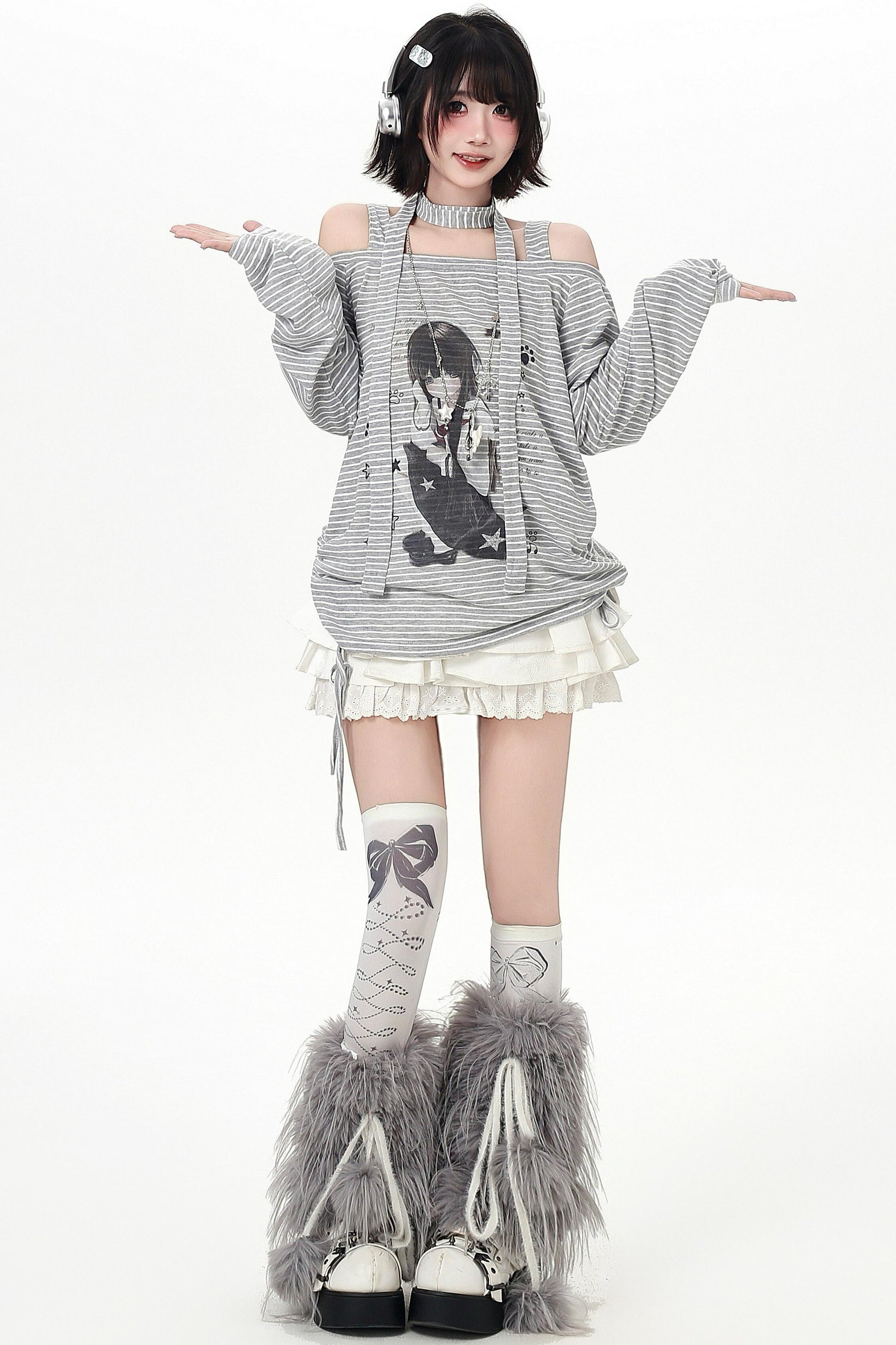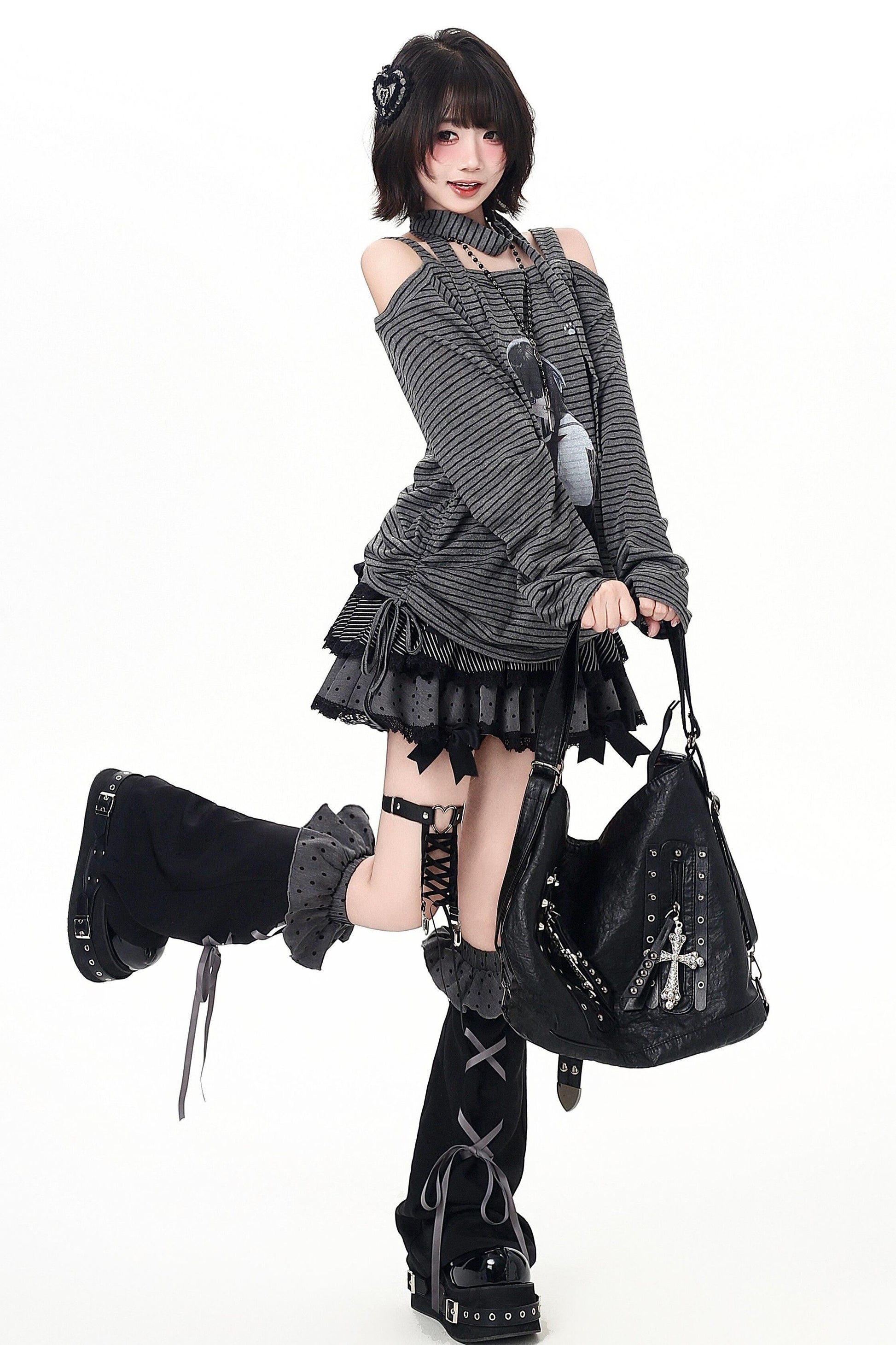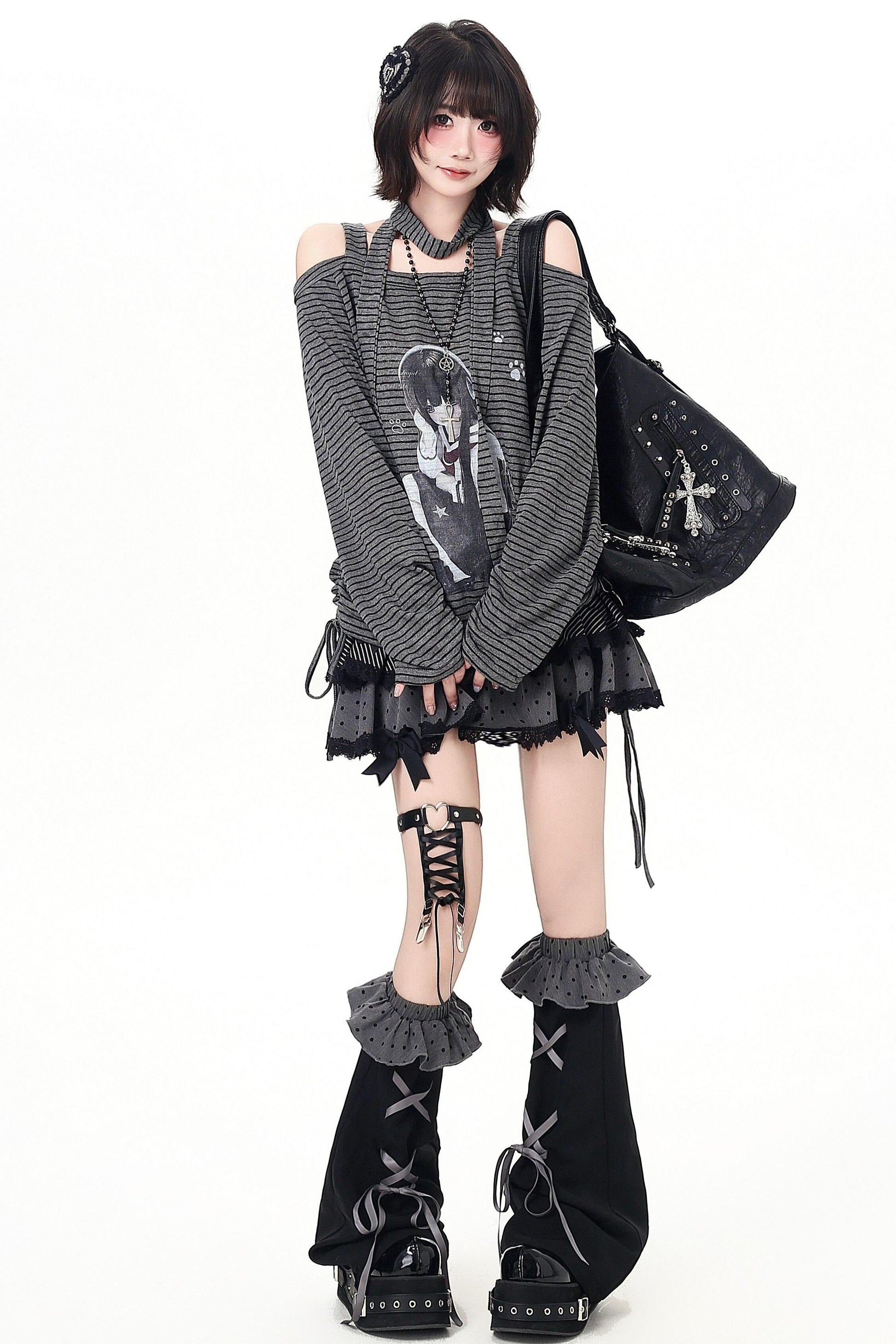 ストライプオフショルダードロストルーズロンT(ストール付き)
