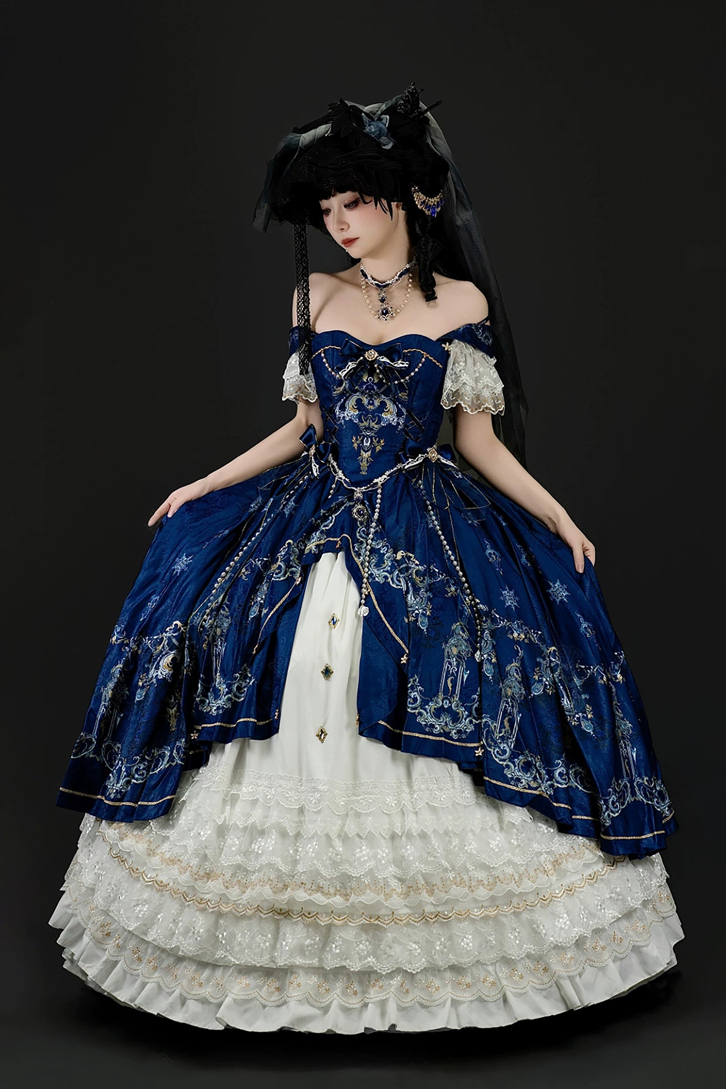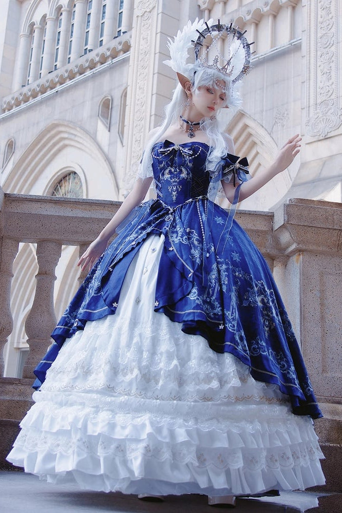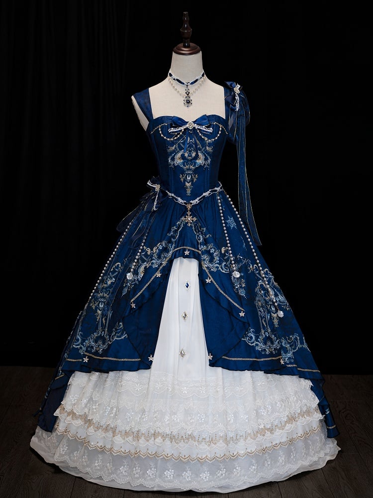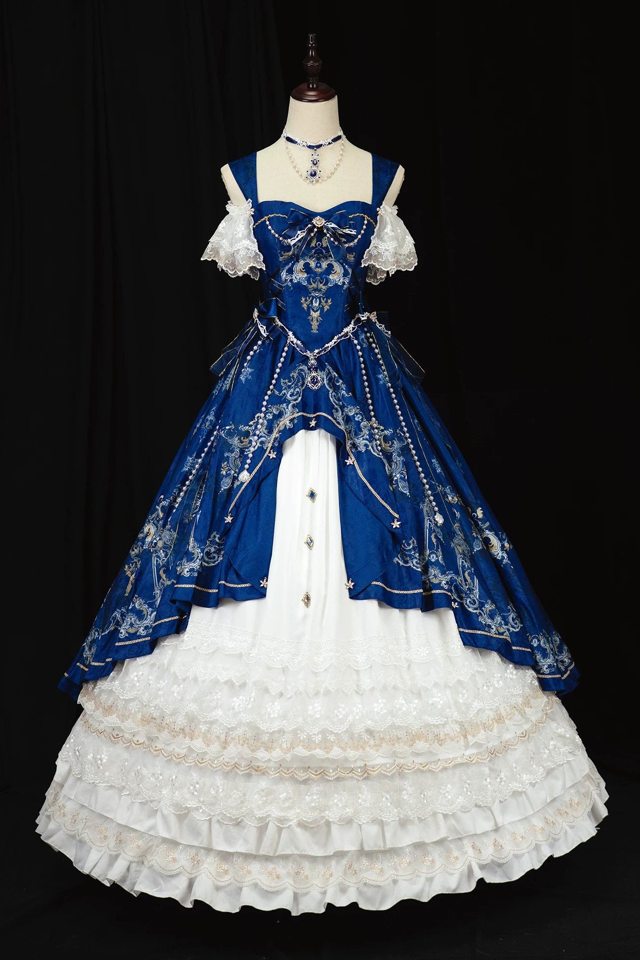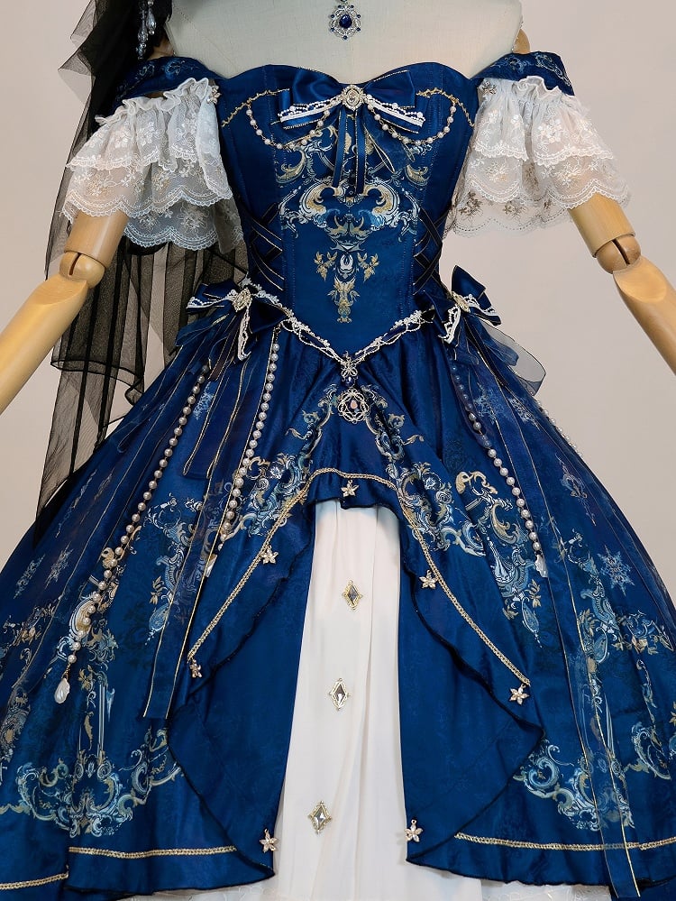 【5月3日予約締切】ダークブルーホワイトコルセットレースリボンロリータJKSプリンセスドレス+コンプリートセット