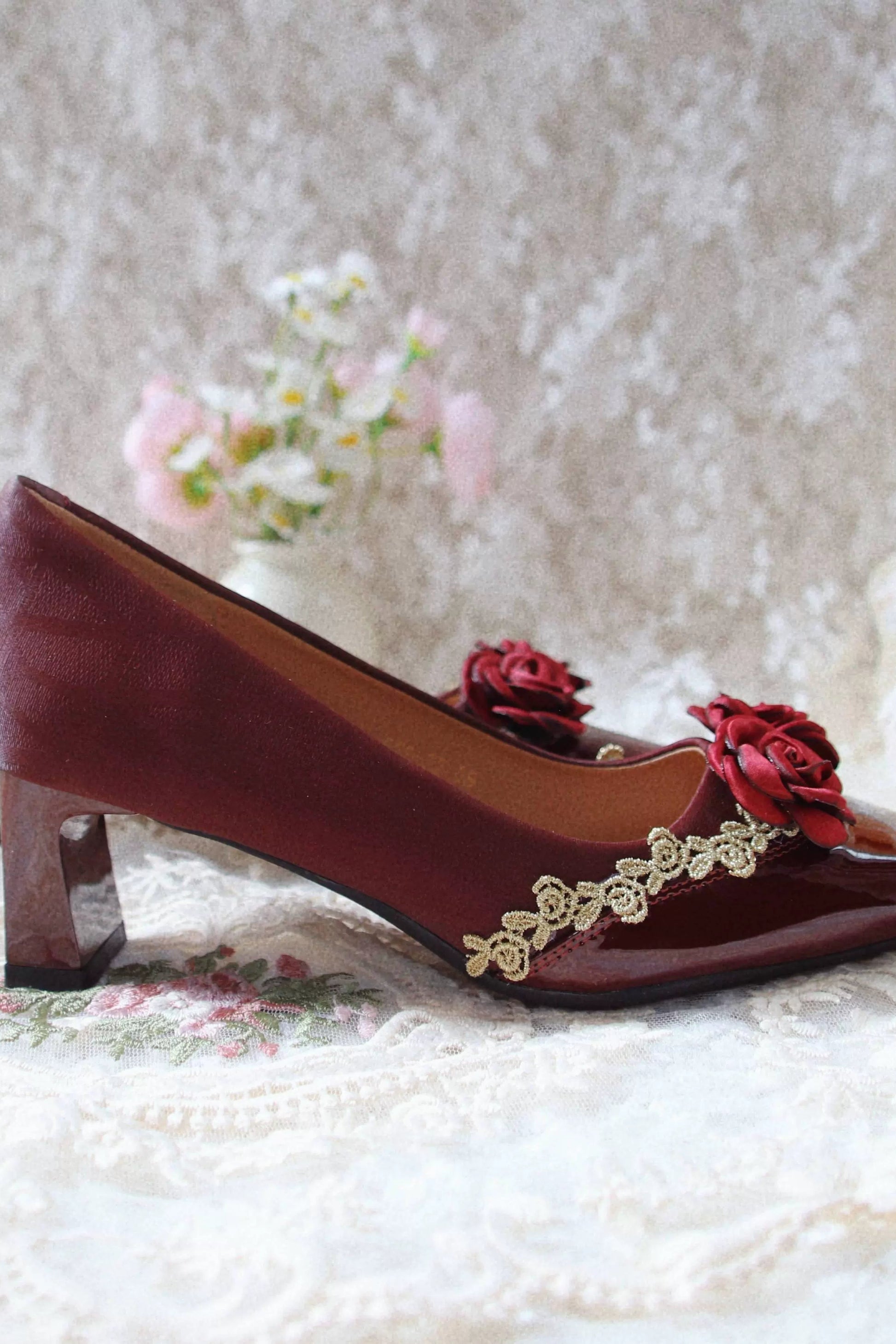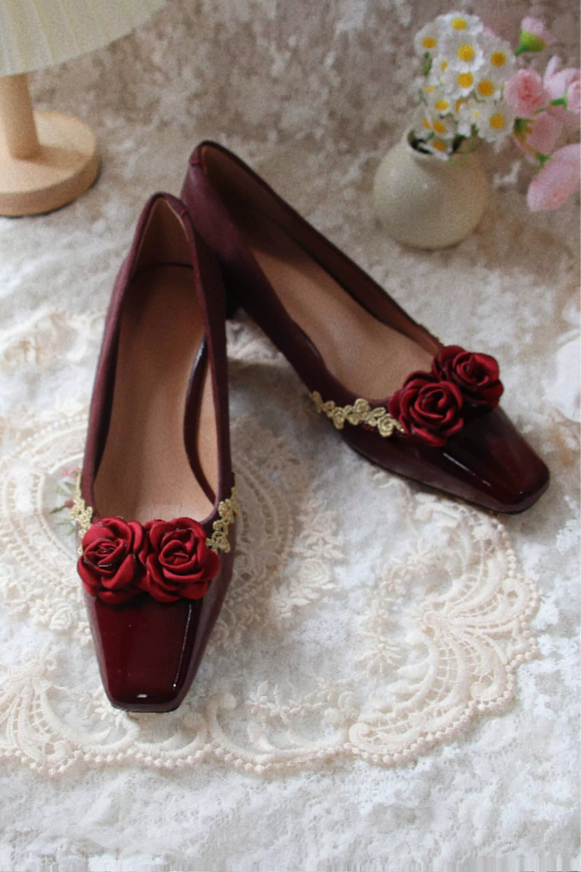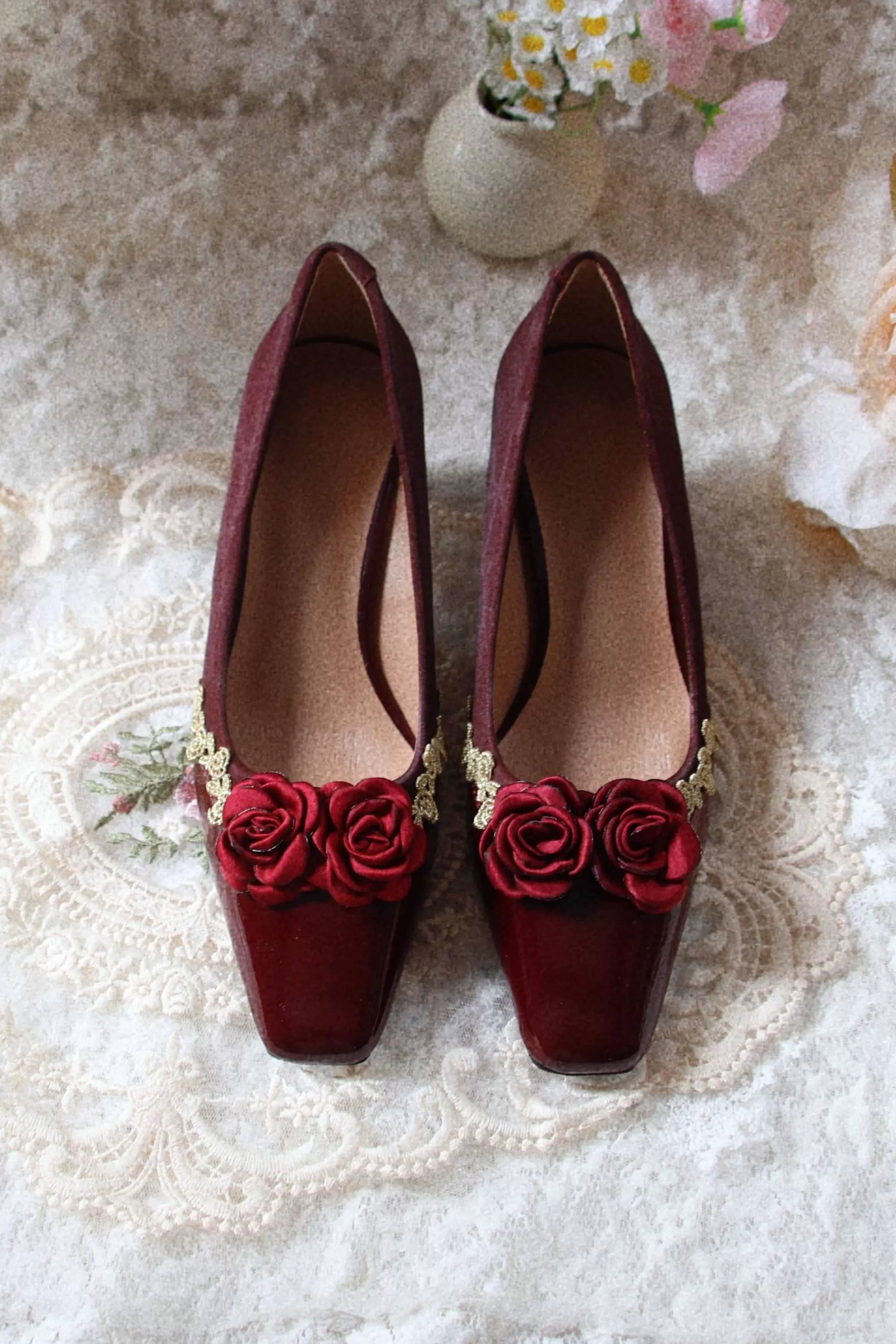 レトロスクエアトゥフレンチレザーステッチフラットヒール