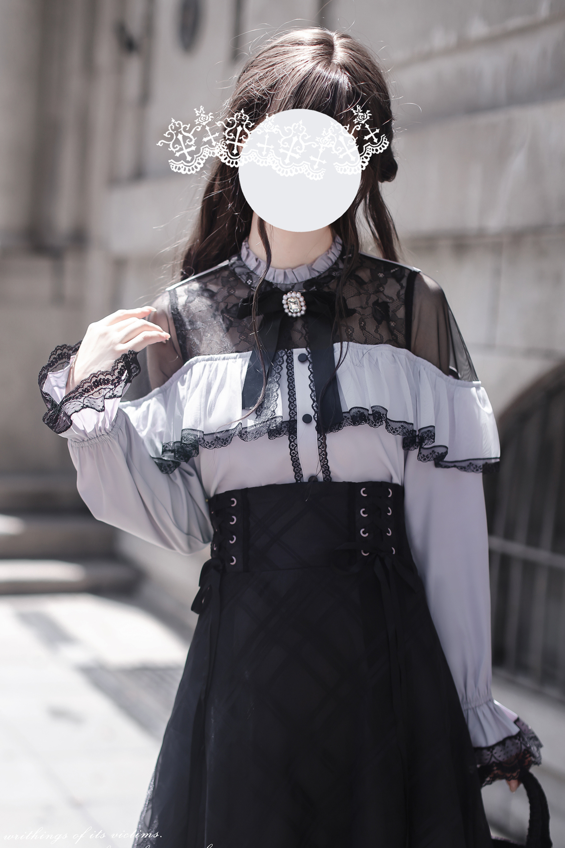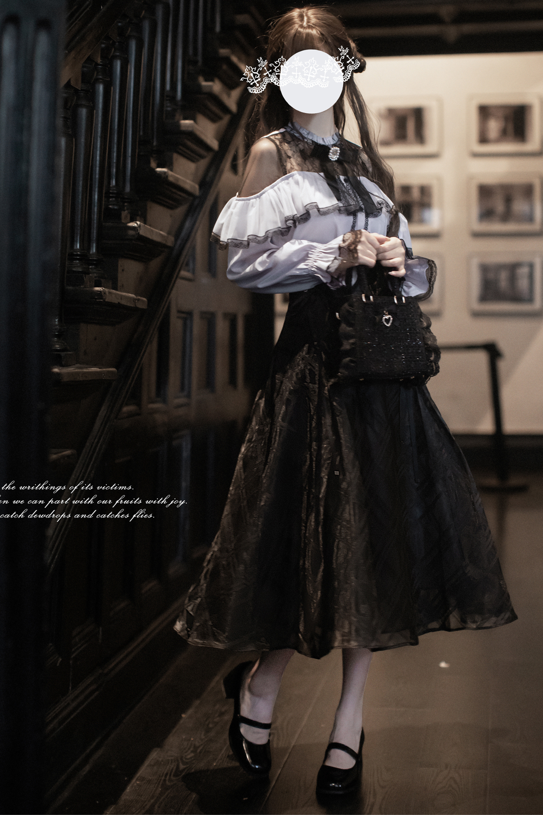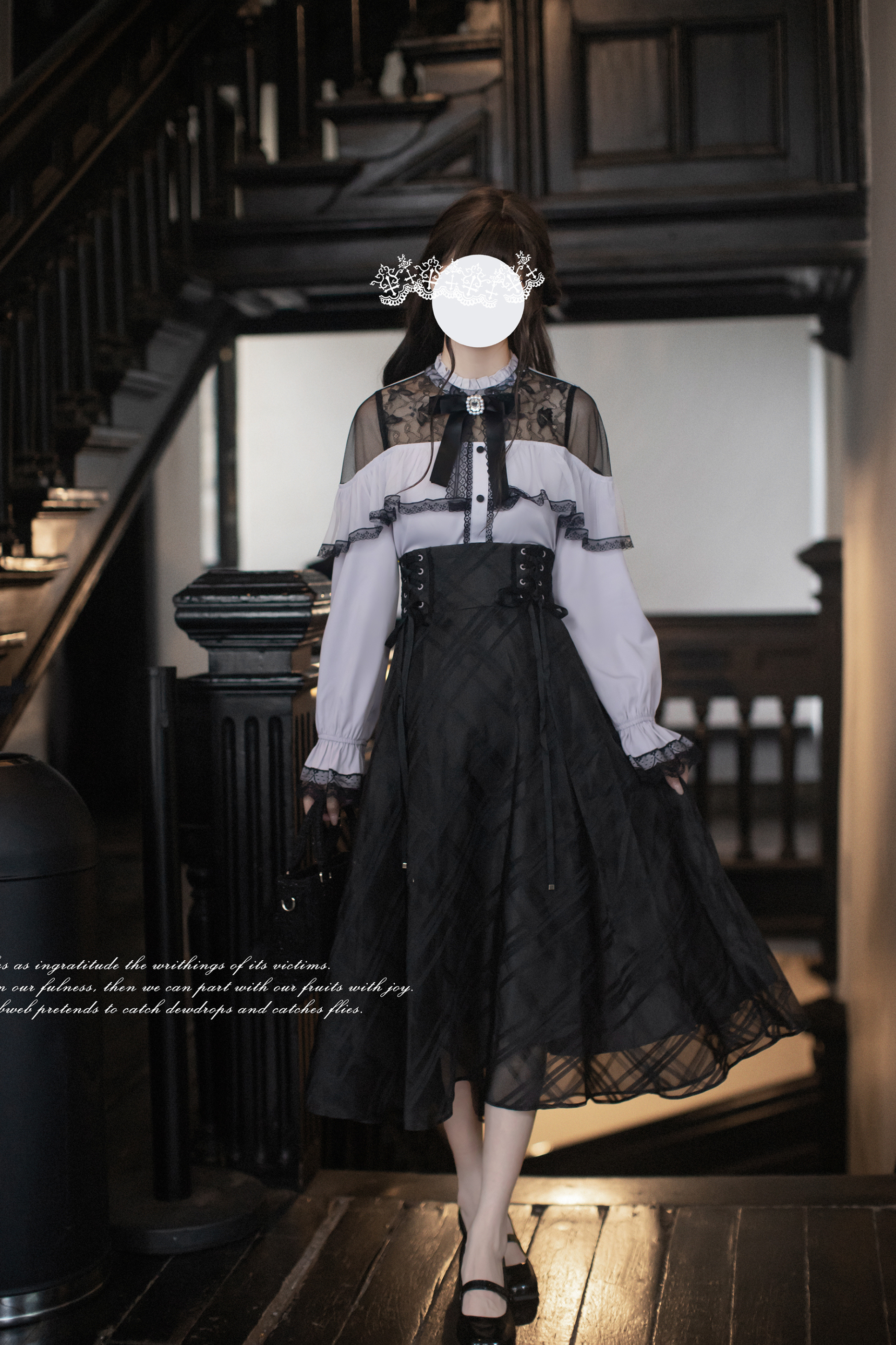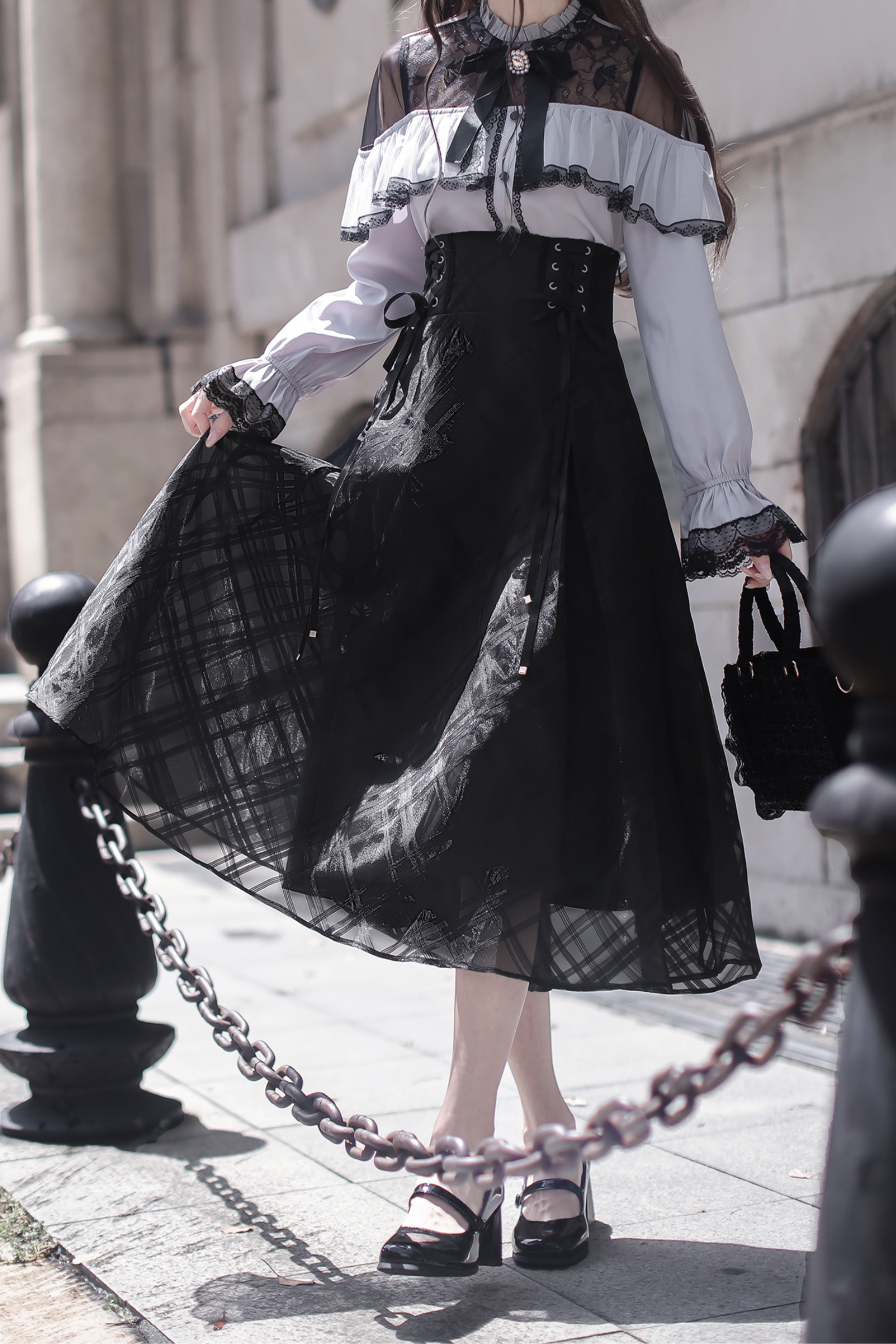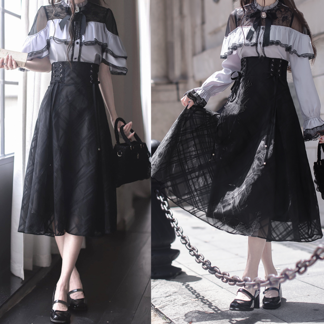 エレガントロングスカート+レースシャツ+リボン