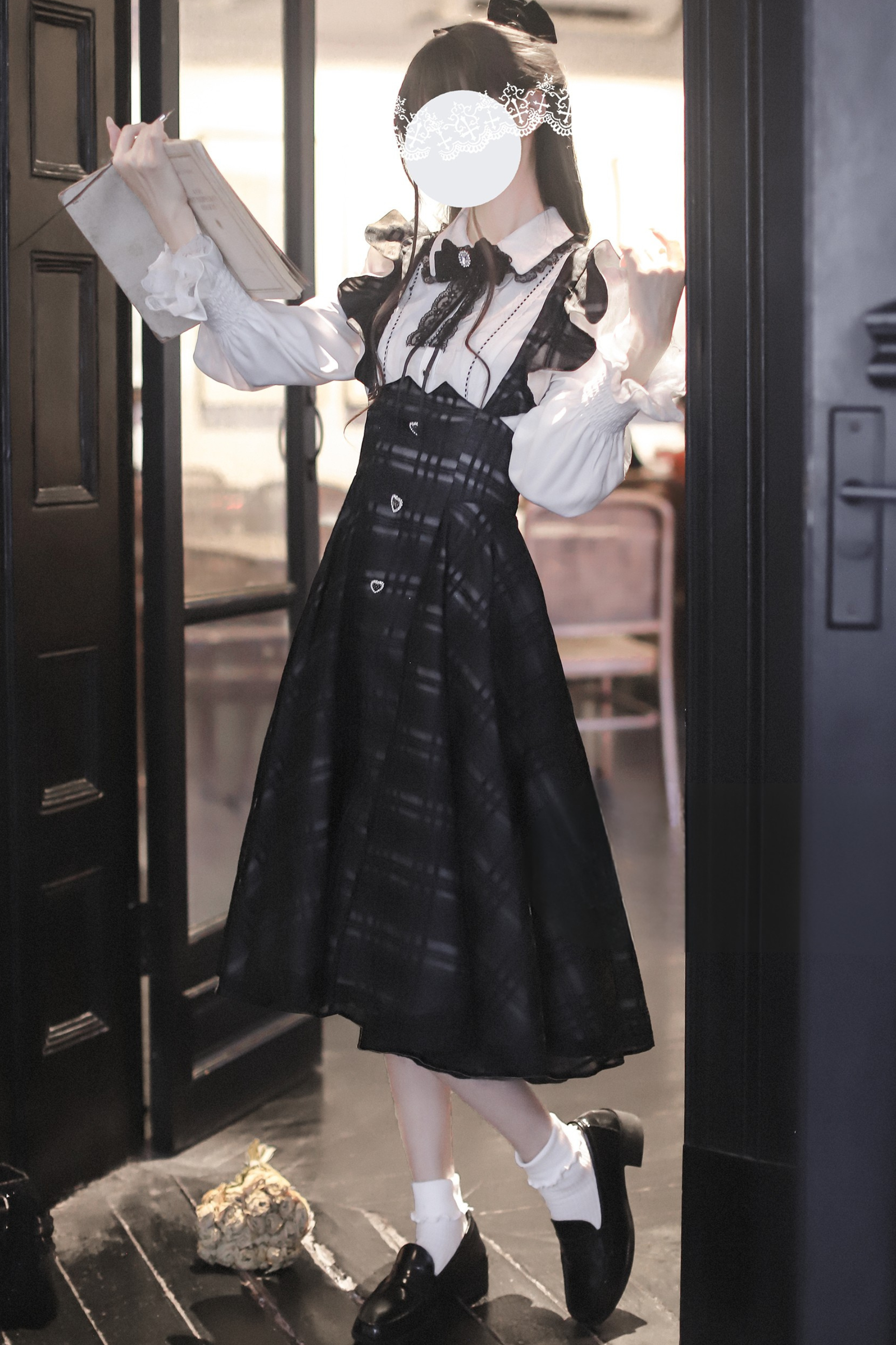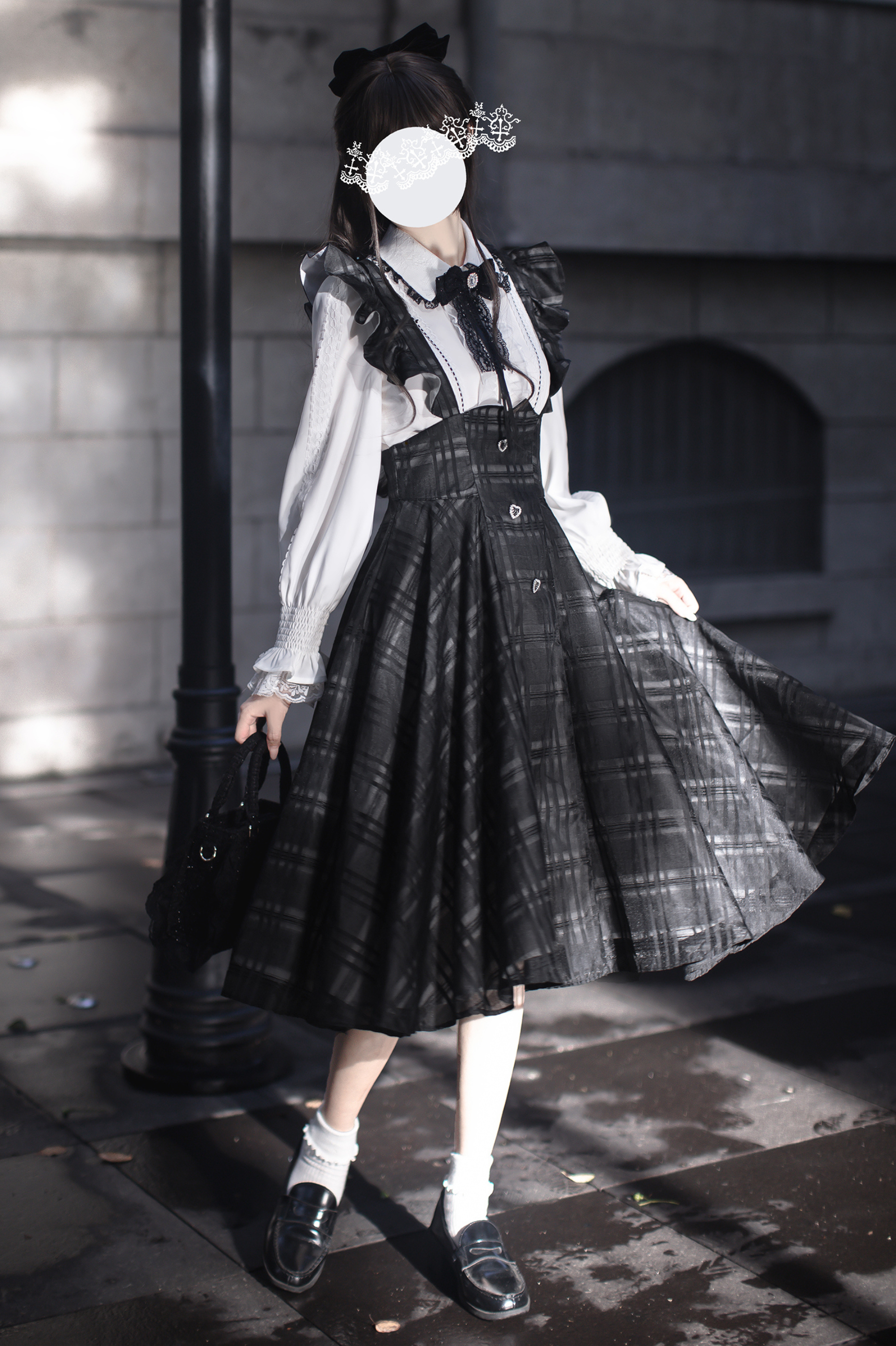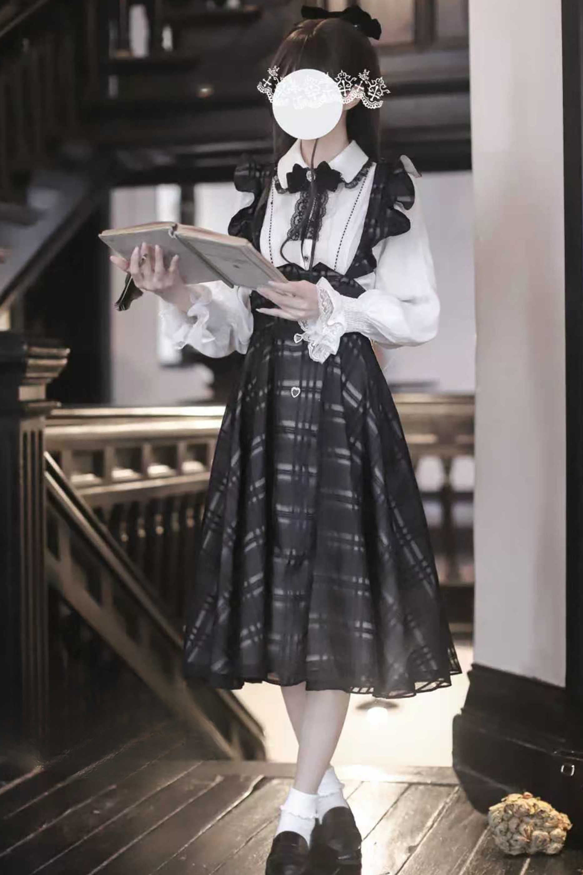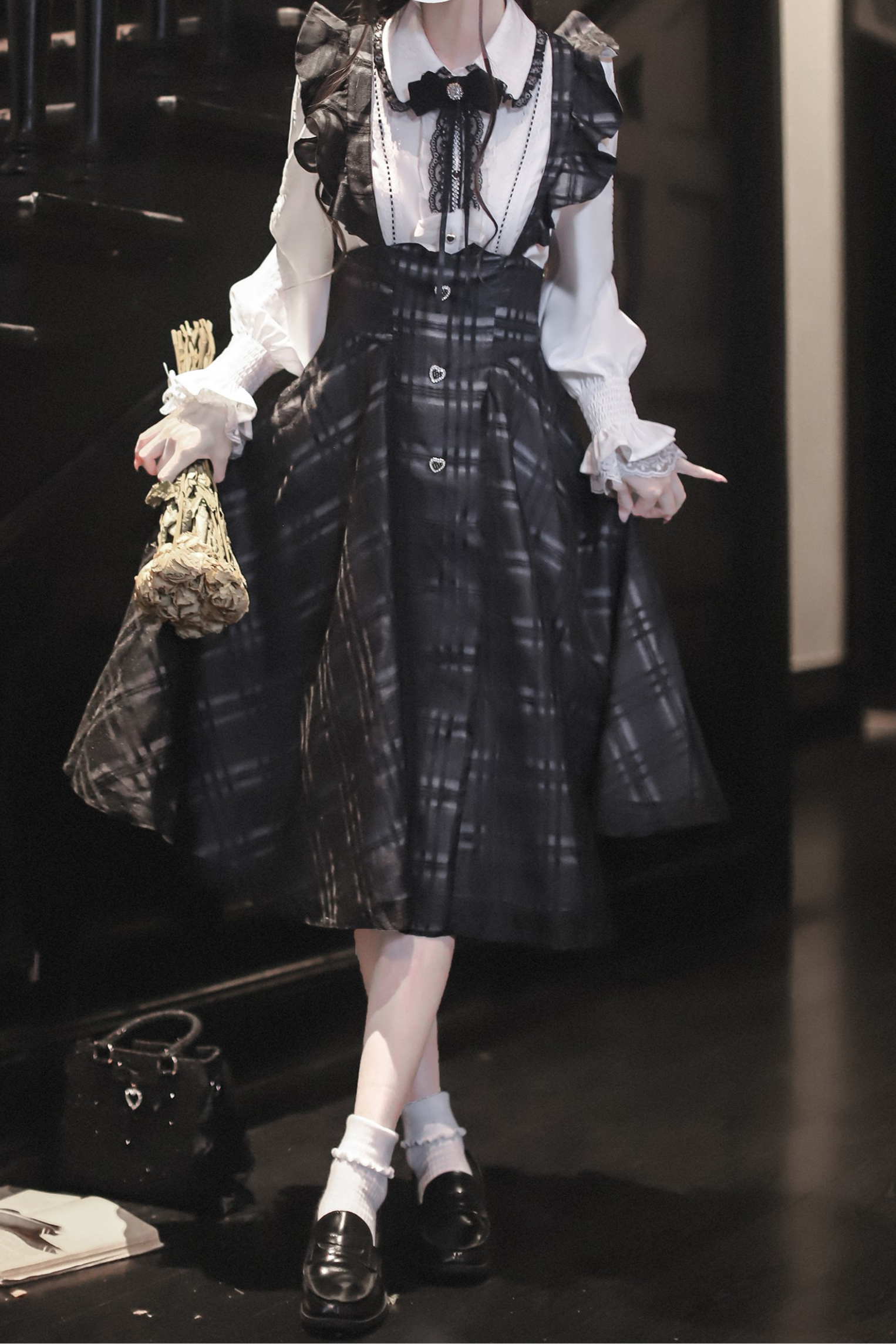 ❤エレガントロングチェックサススカート+シャツ+リボン❤