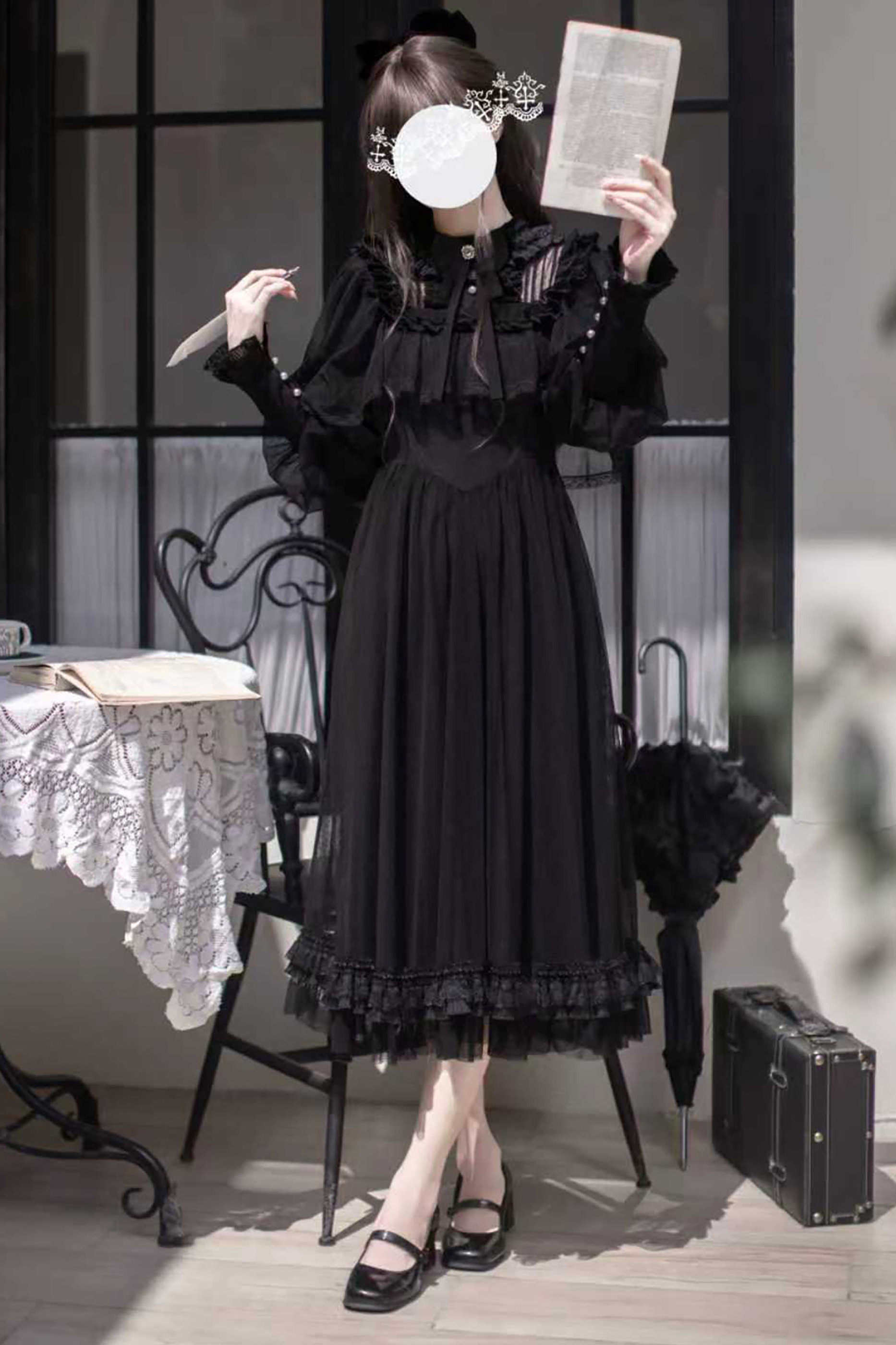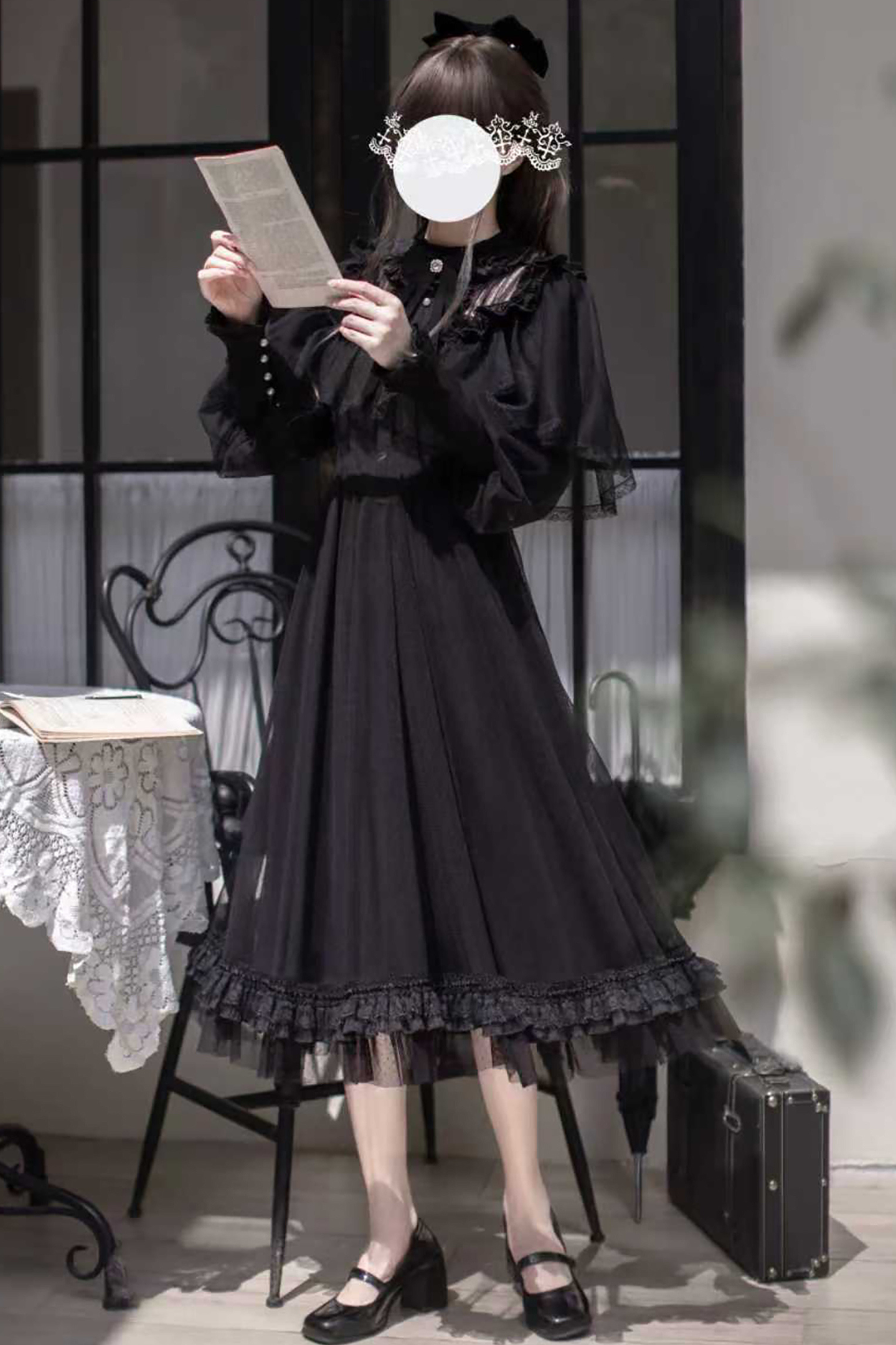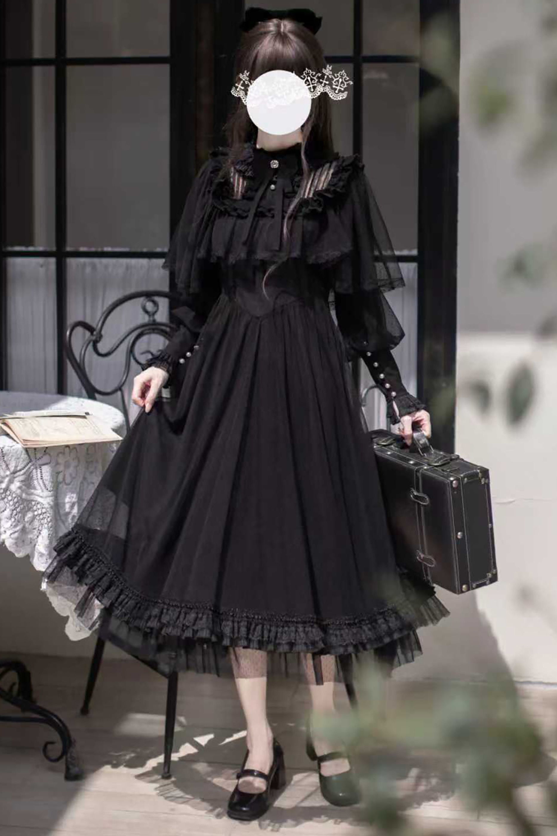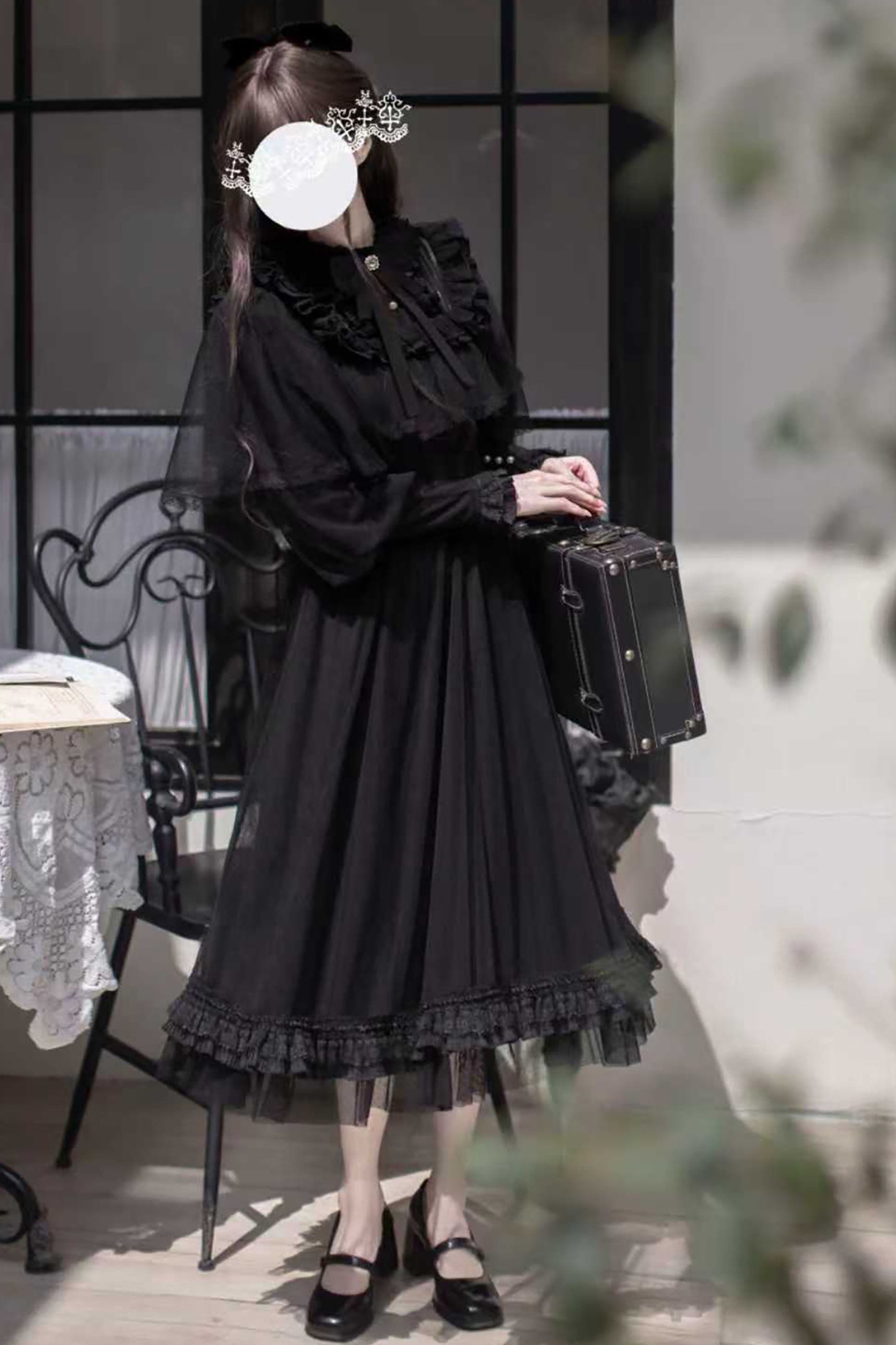 ❤ダークエレガントブラックドットガーゼショールドレス❤