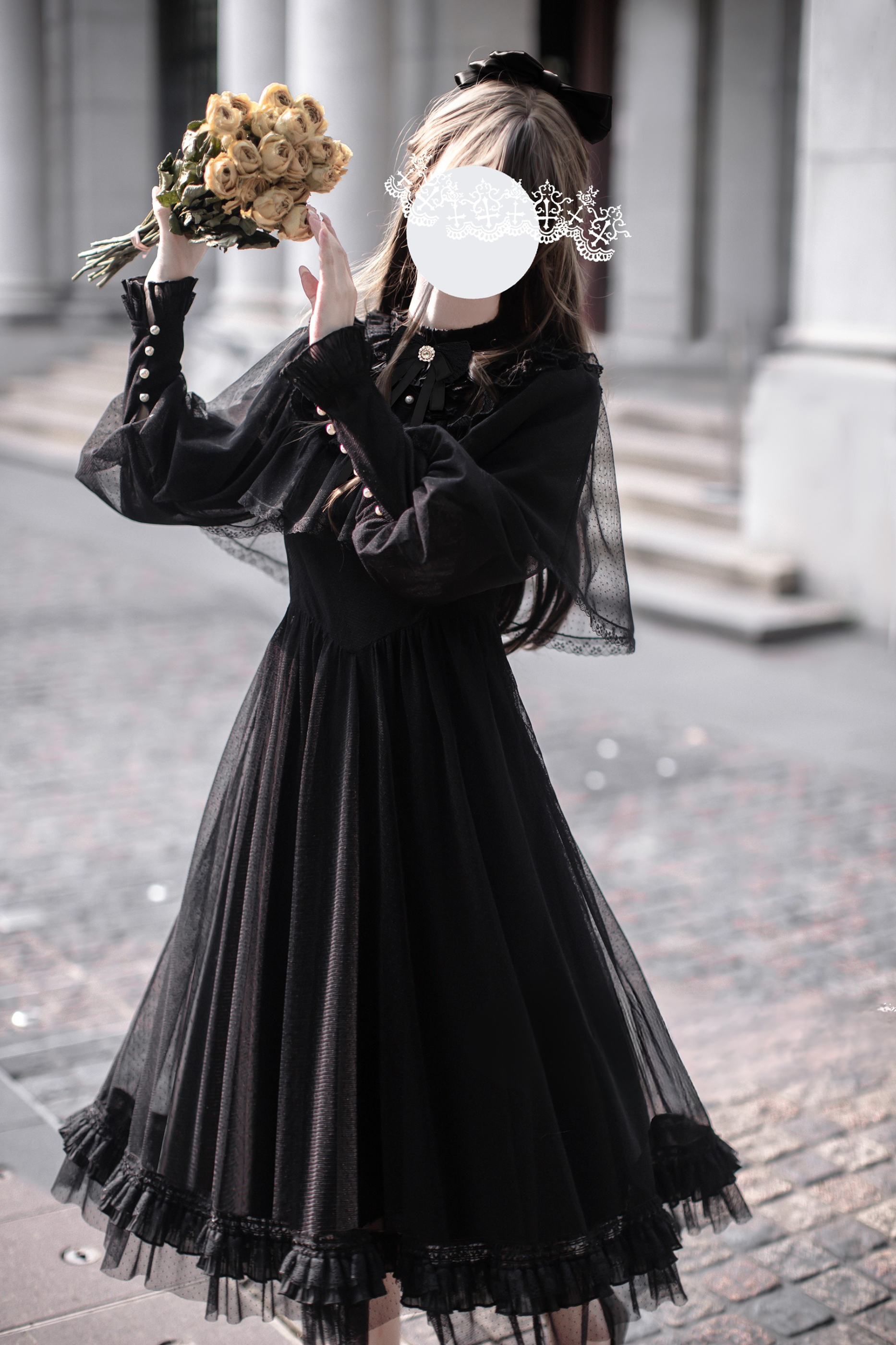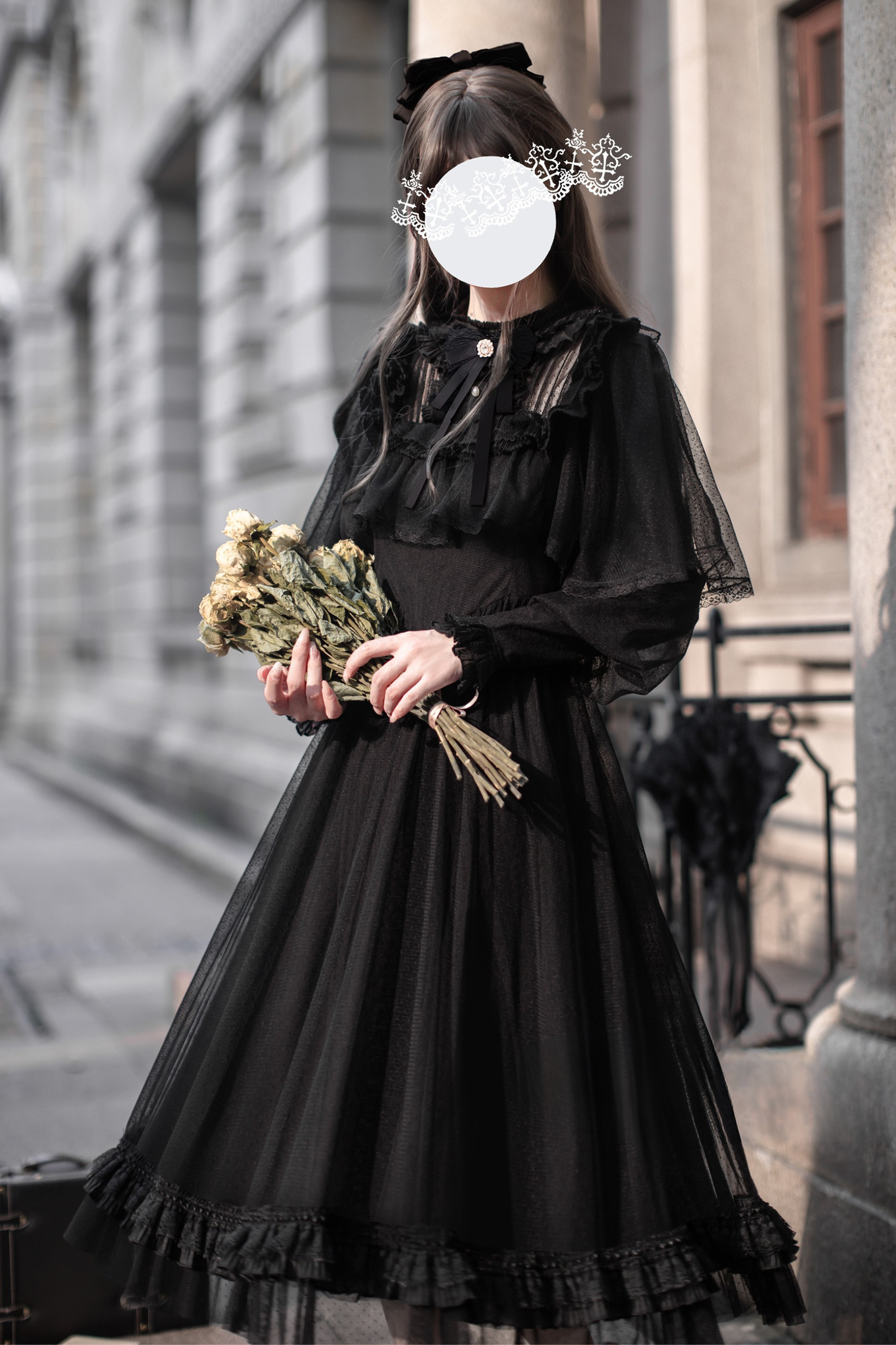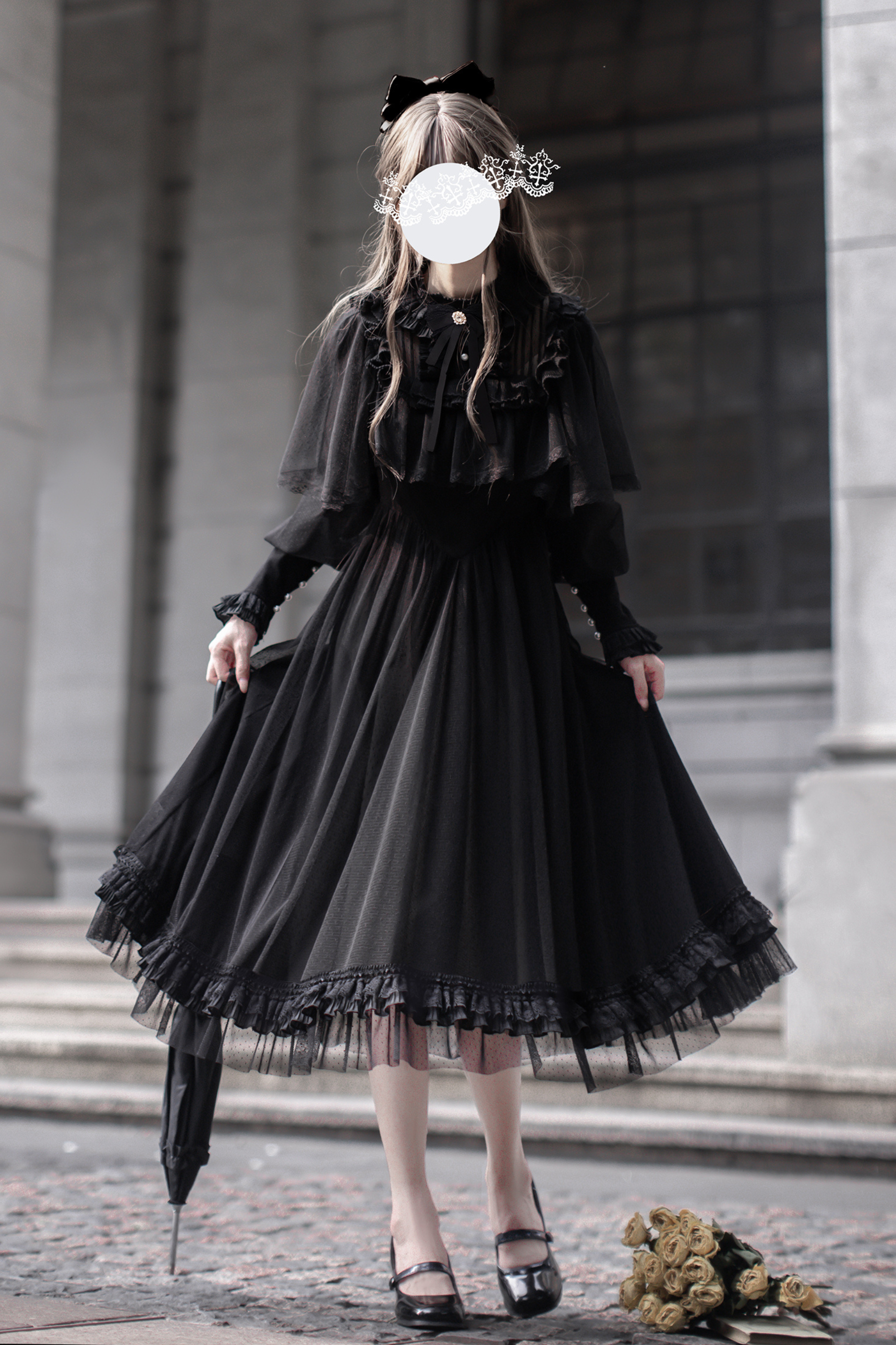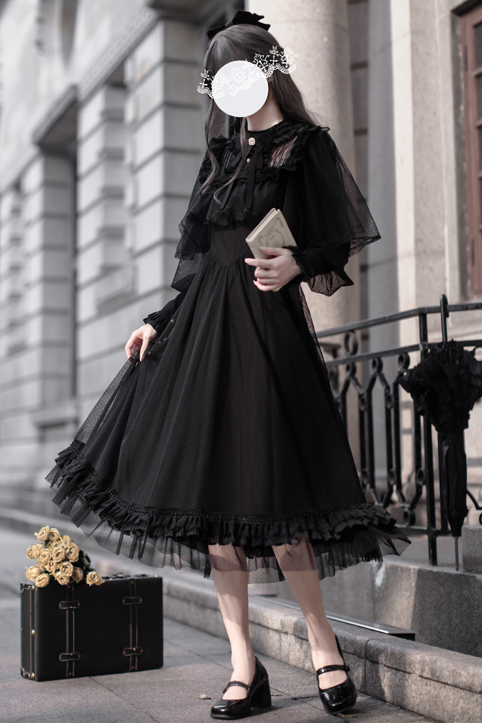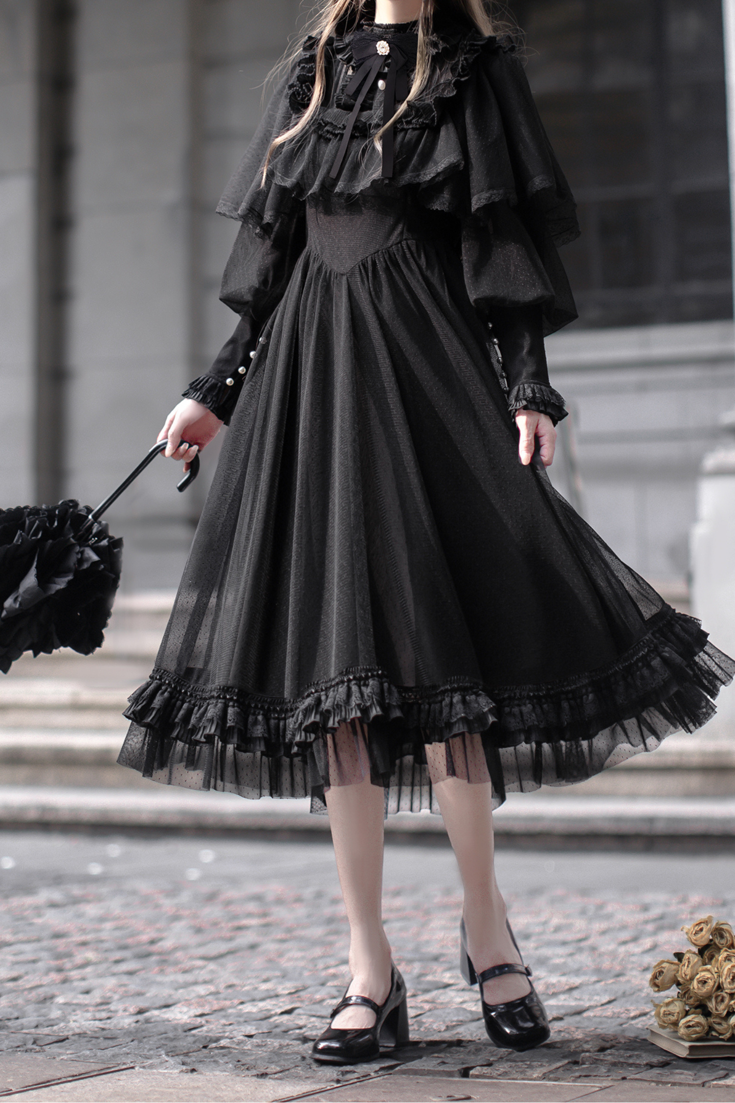 ❤ダークエレガントブラックドットガーゼショールドレス❤