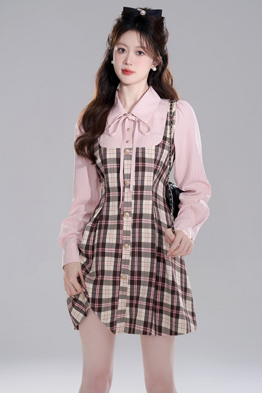 グレーレーススプライスプルオーバークロップトップ+チェックスカート