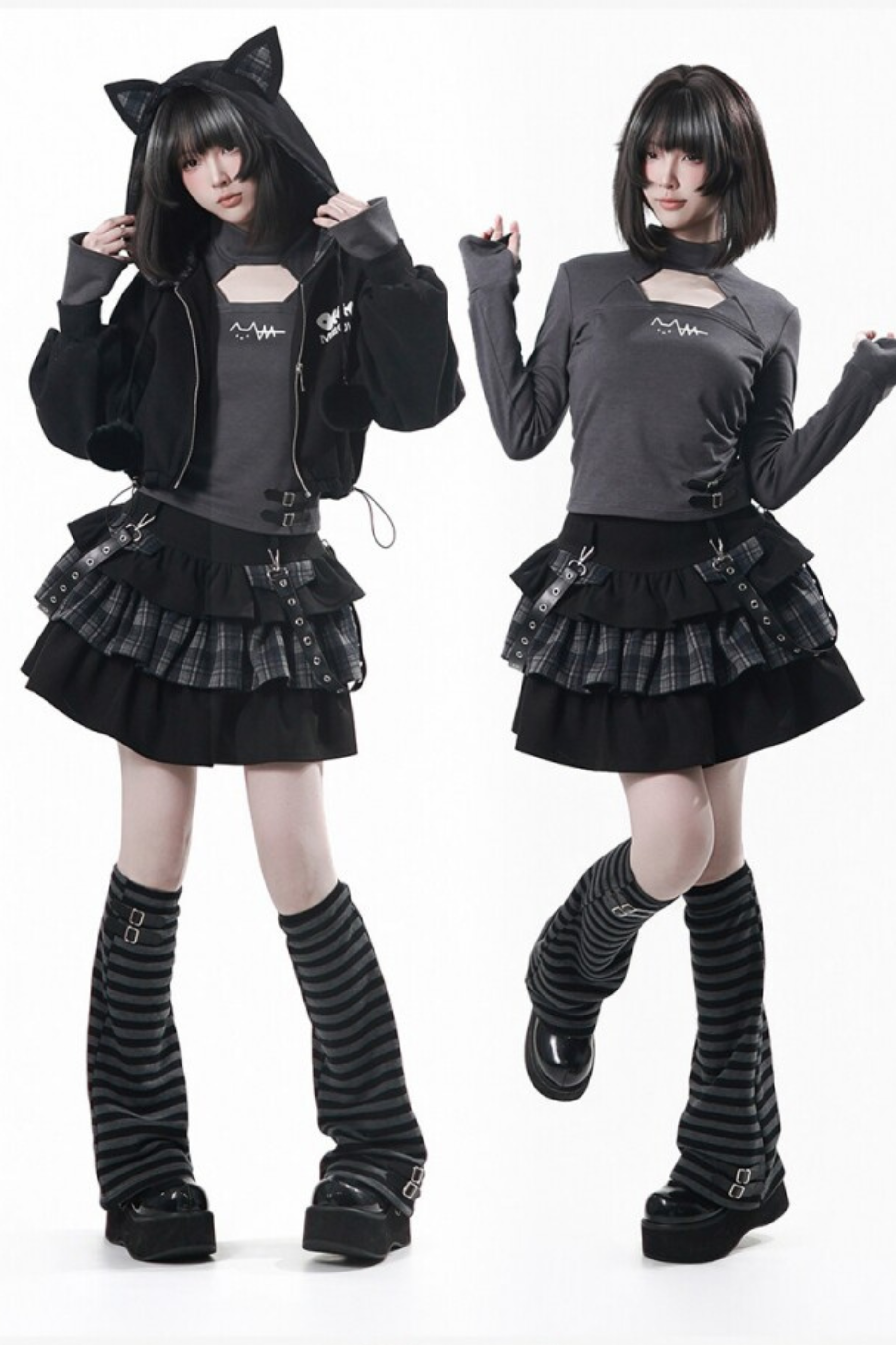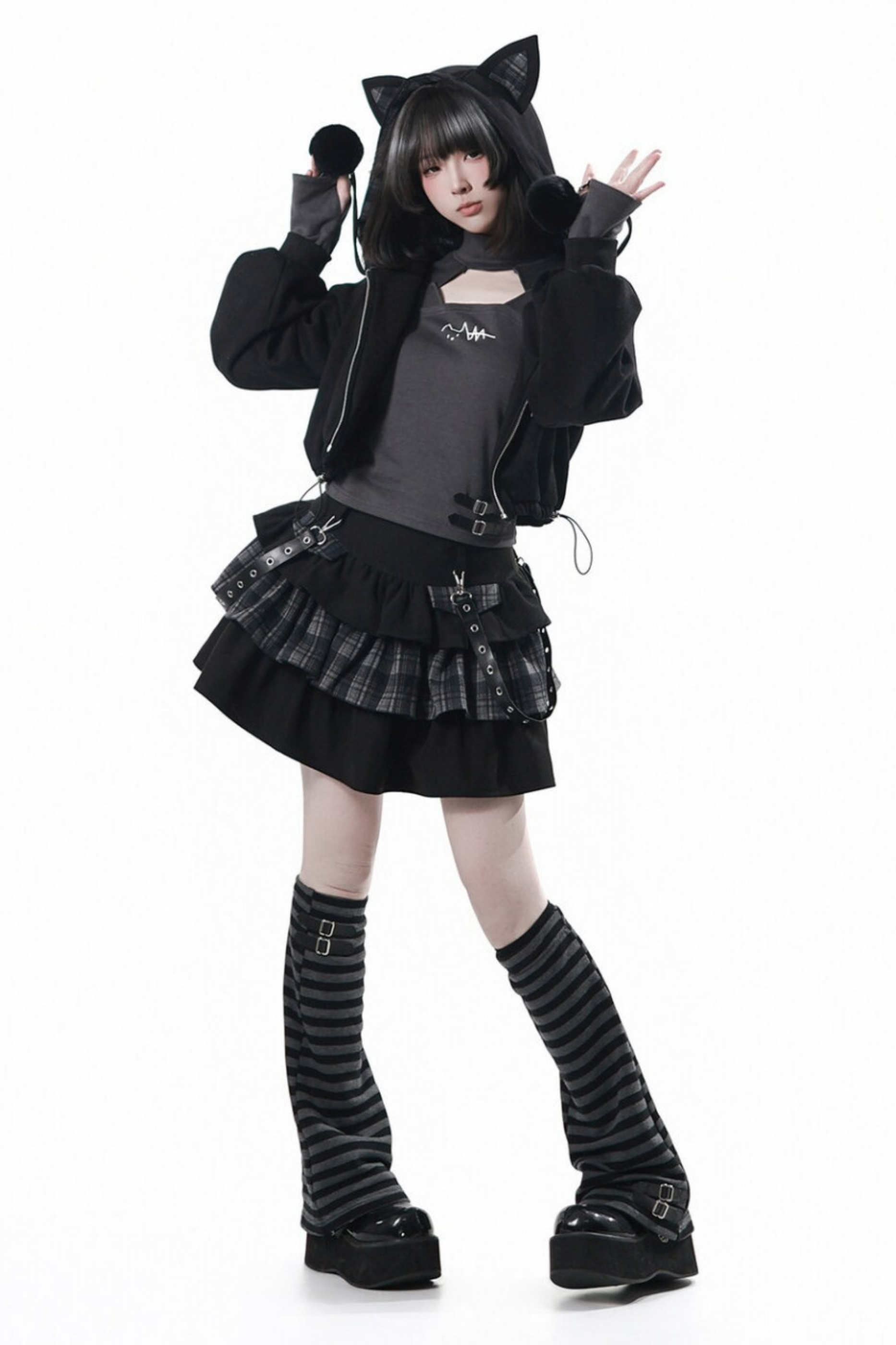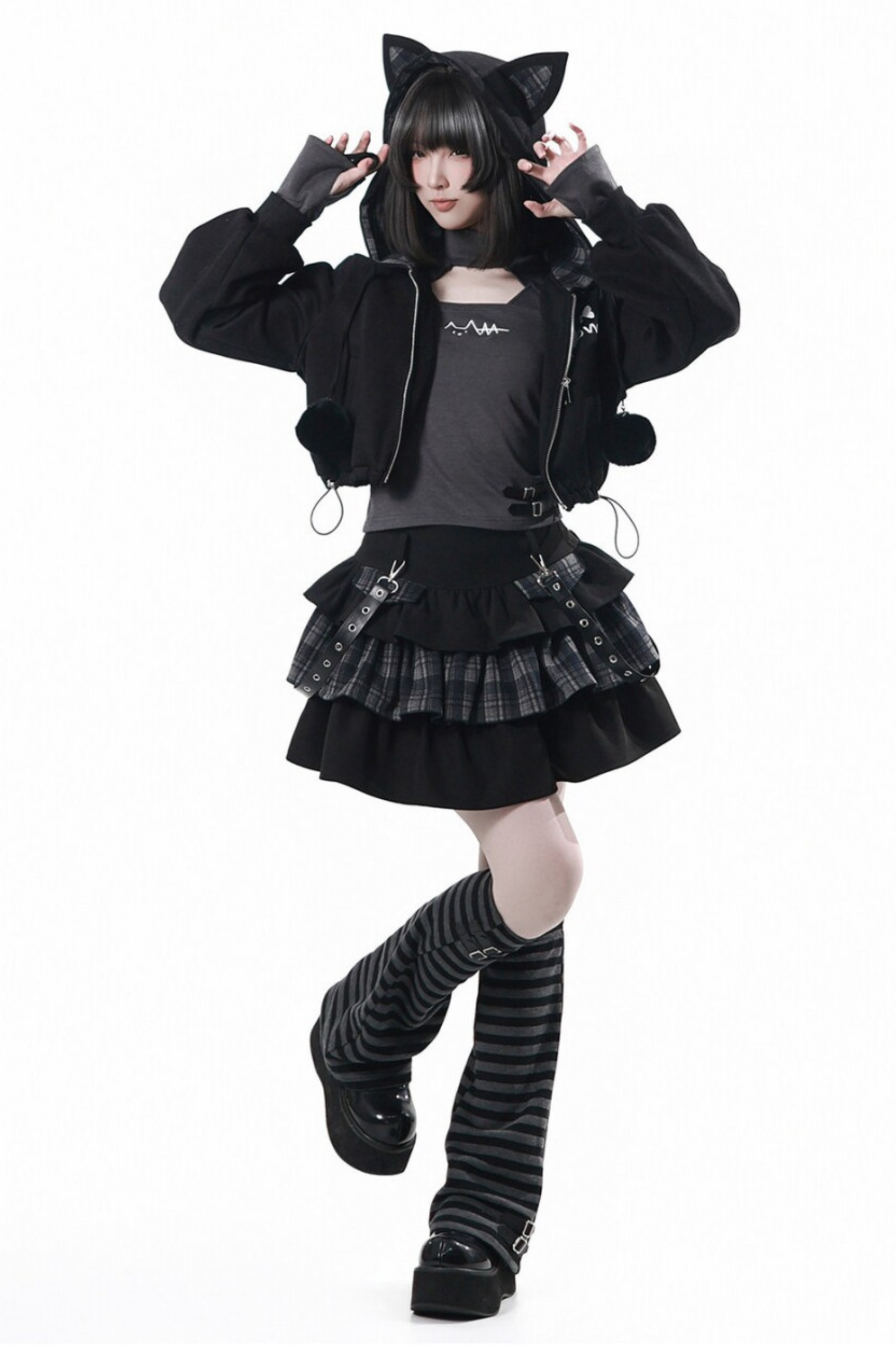 貓耳外套+蛋糕裙+上衣+條紋腿套