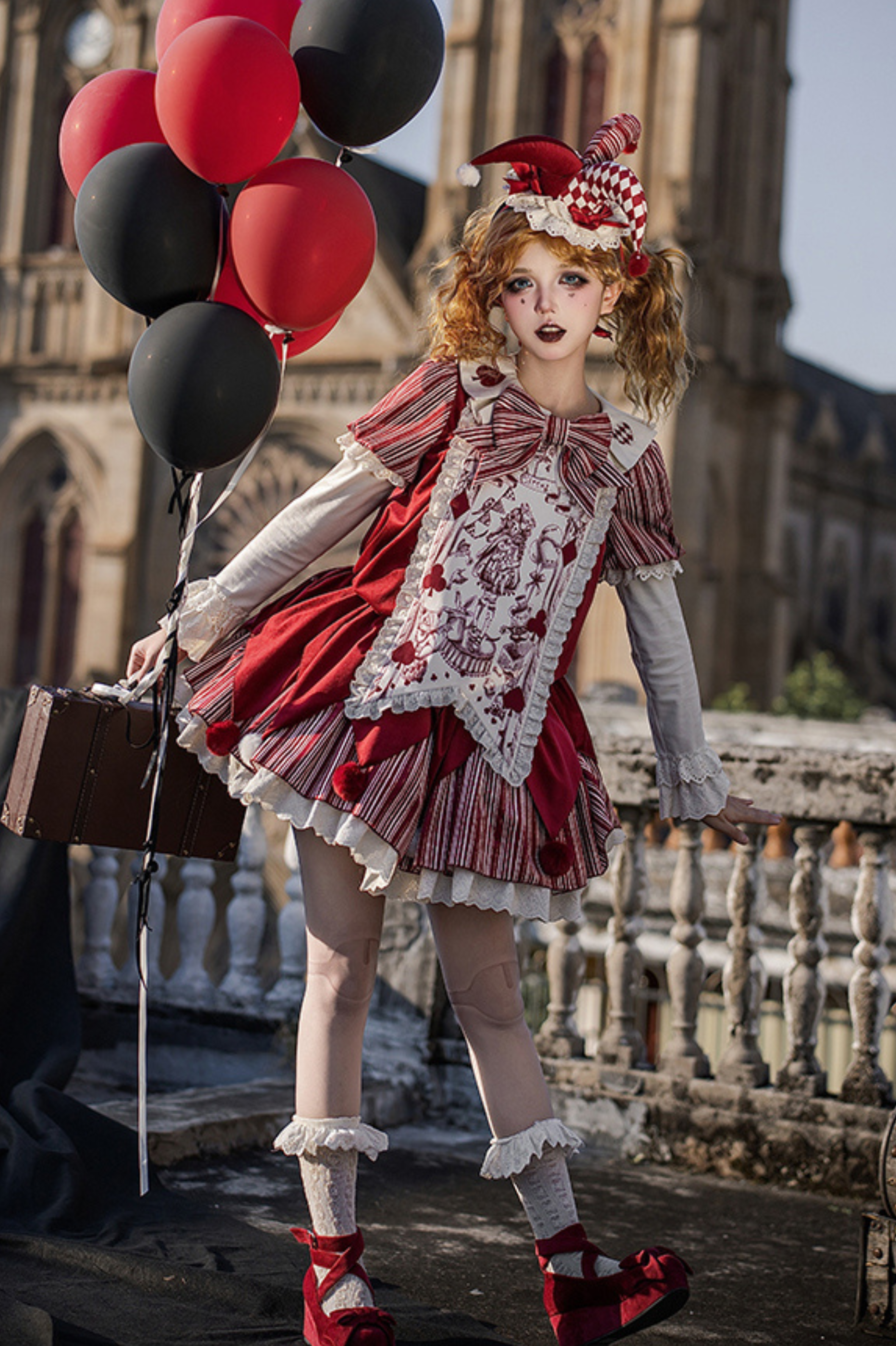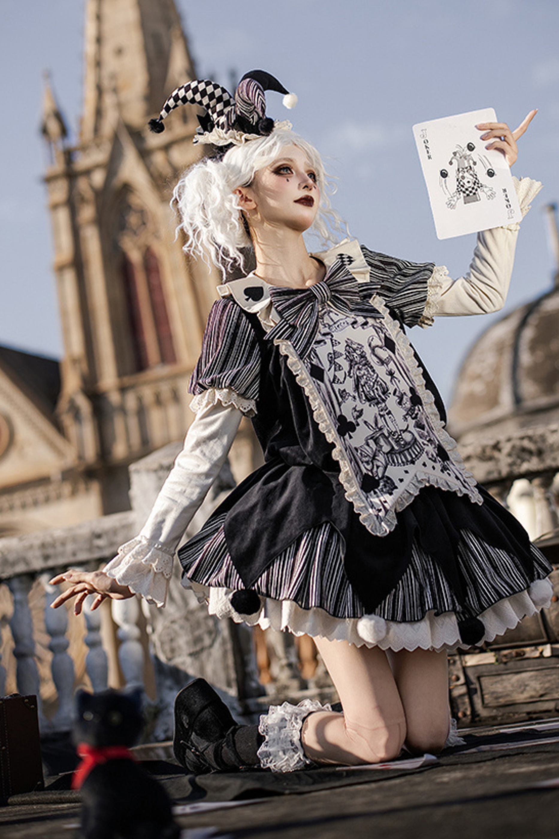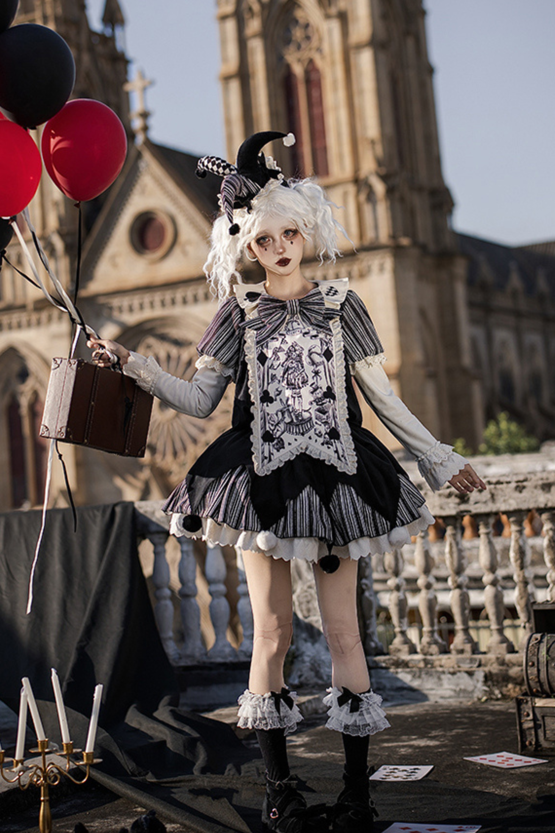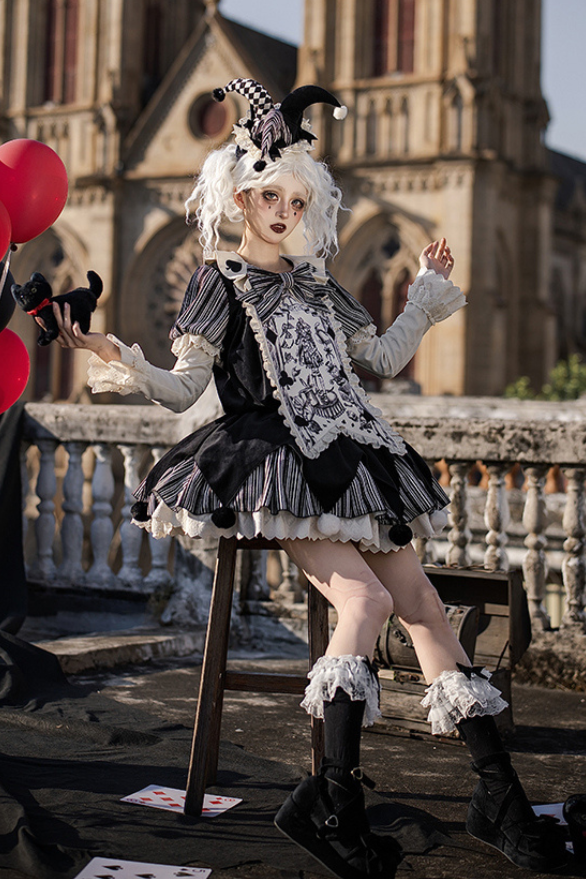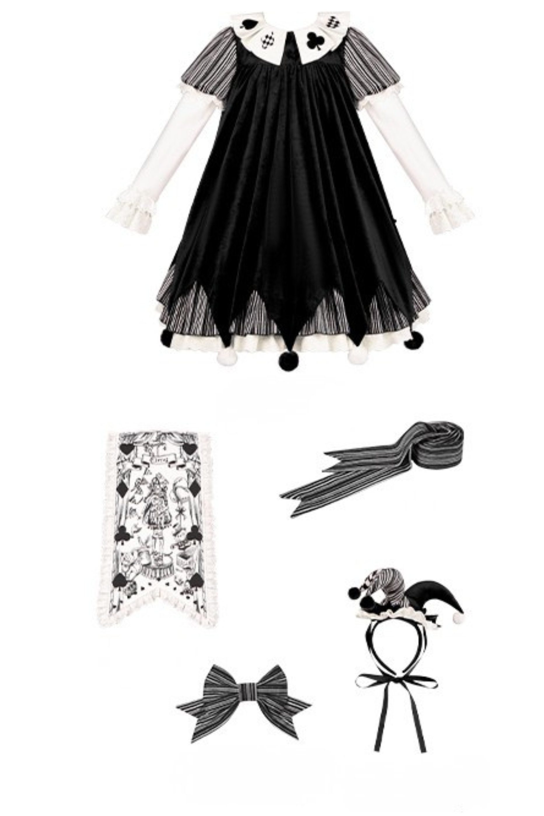 ドールサーカスピエロロリータドレス+カチューシャ+ベルト+リボン+カチューシャ+バッフル