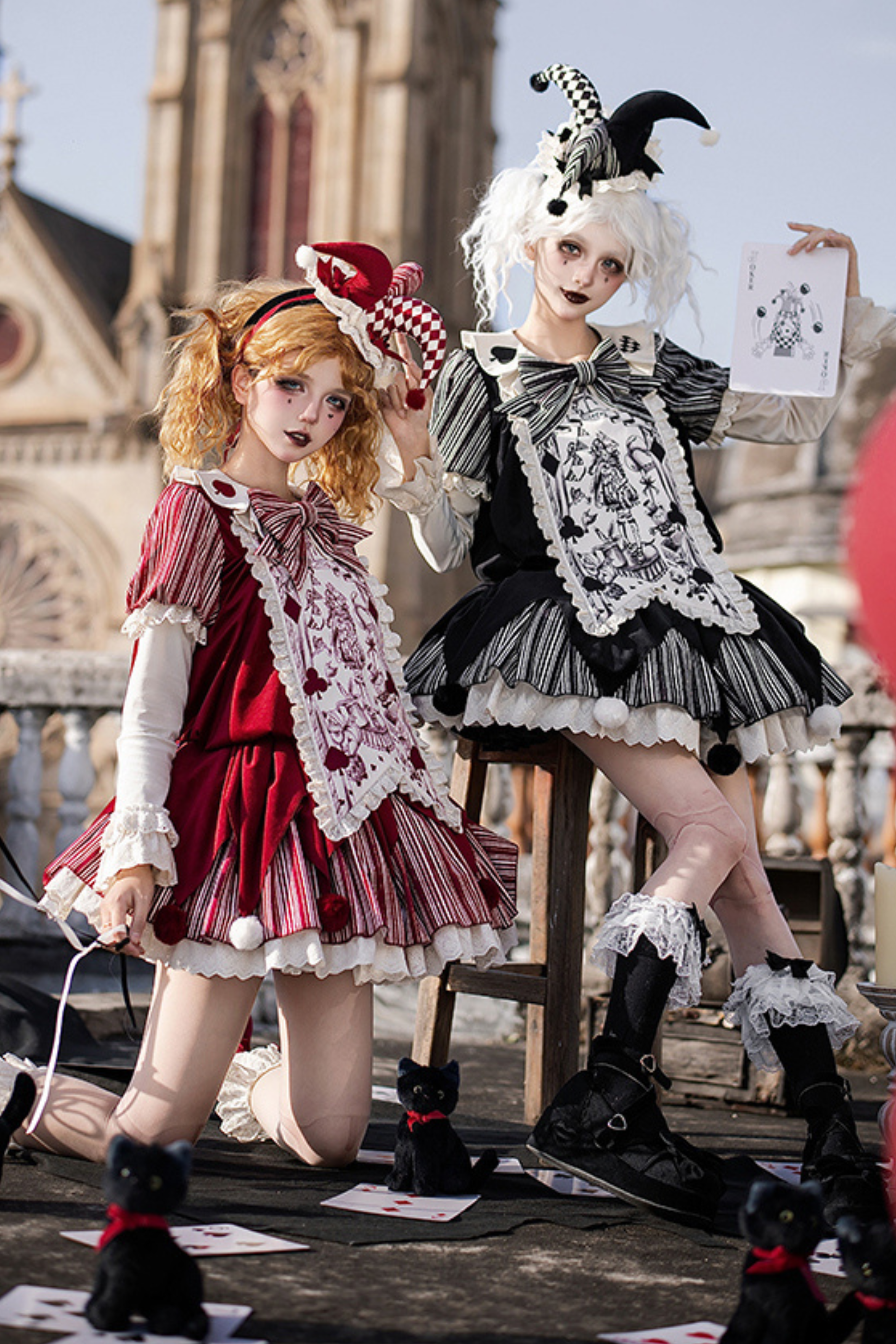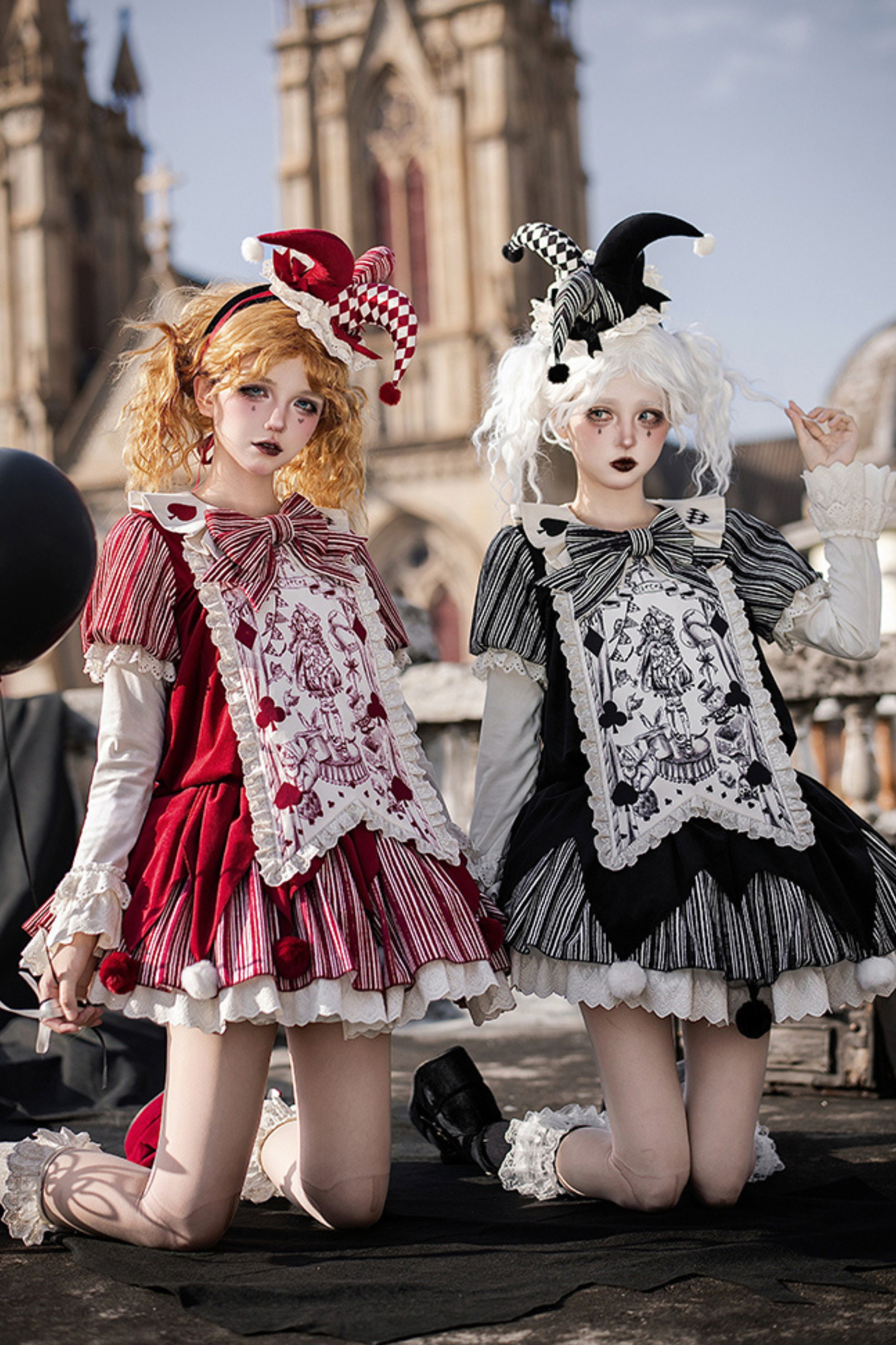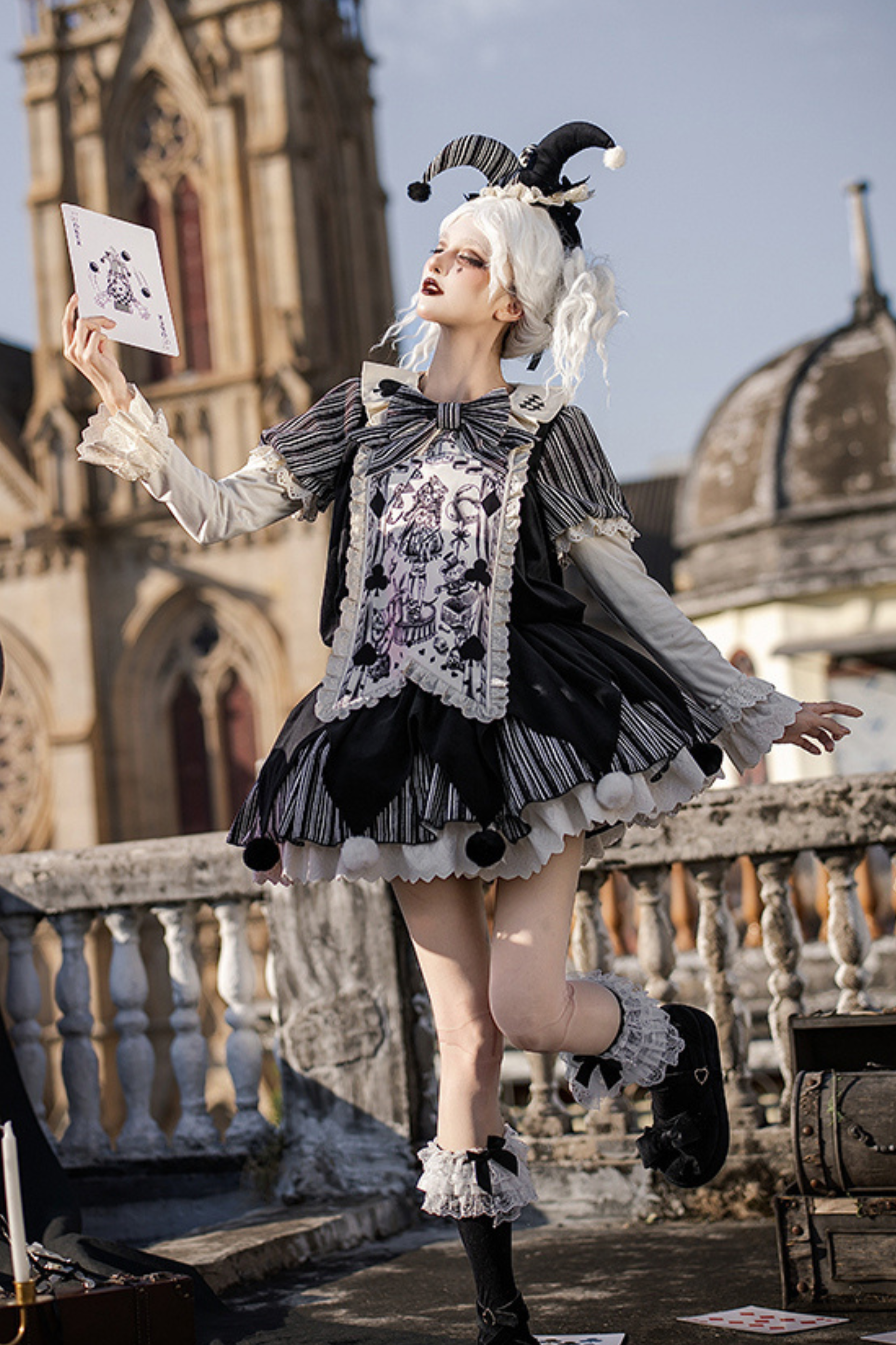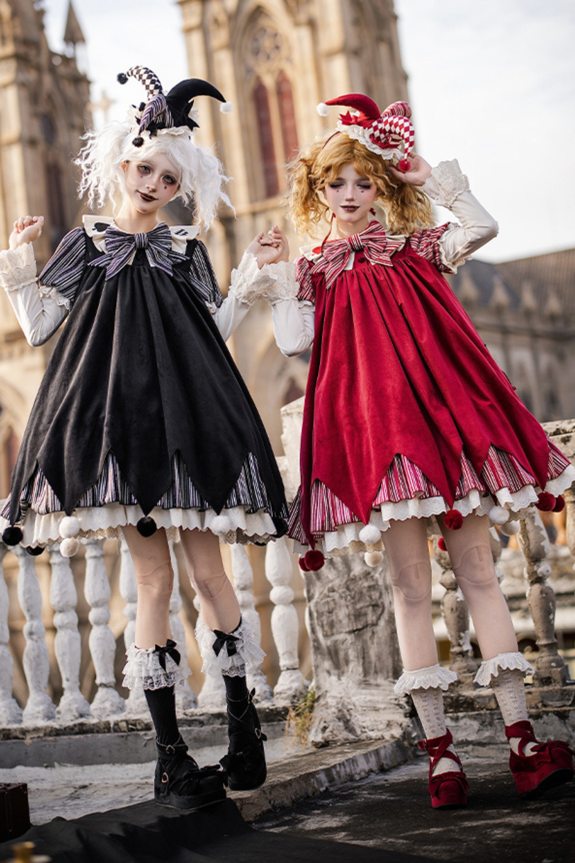 ドールサーカスピエロロリータドレス+カチューシャ+ベルト+リボン+カチューシャ+バッフル