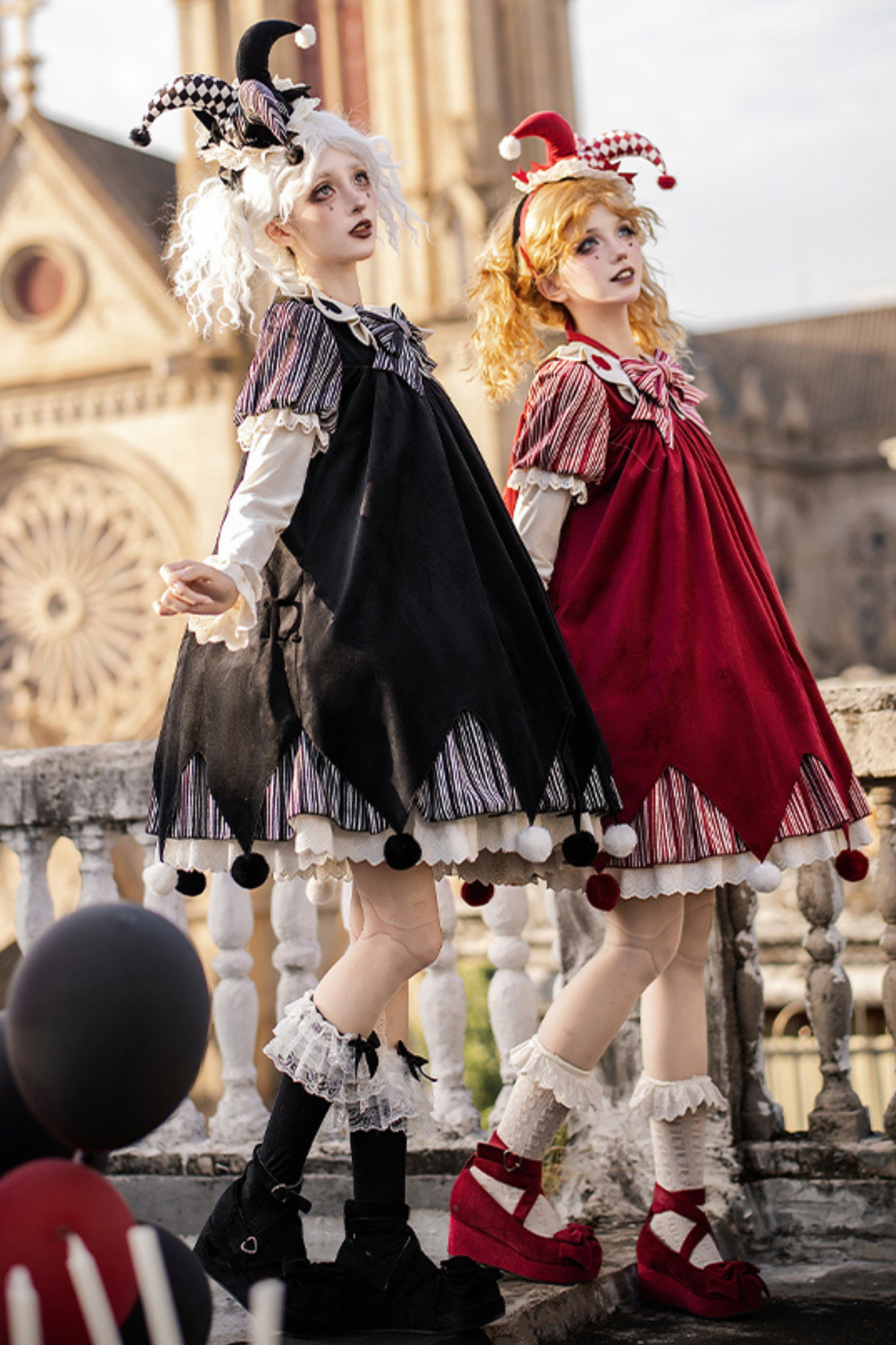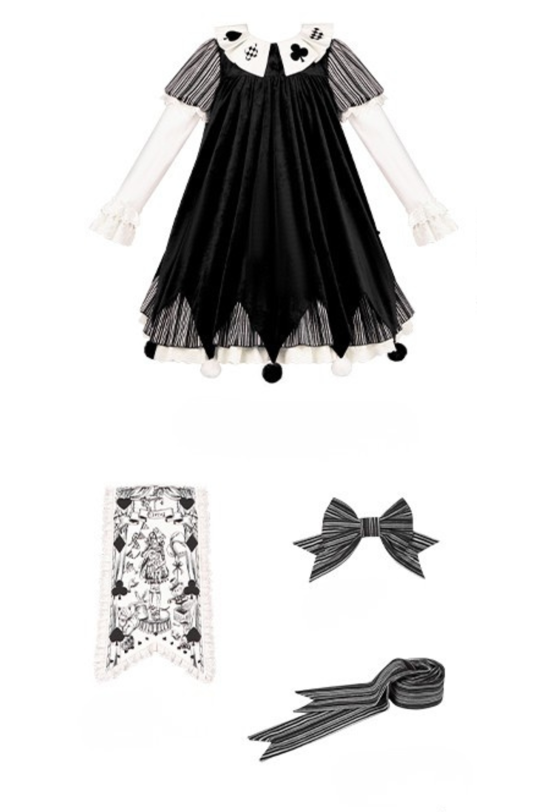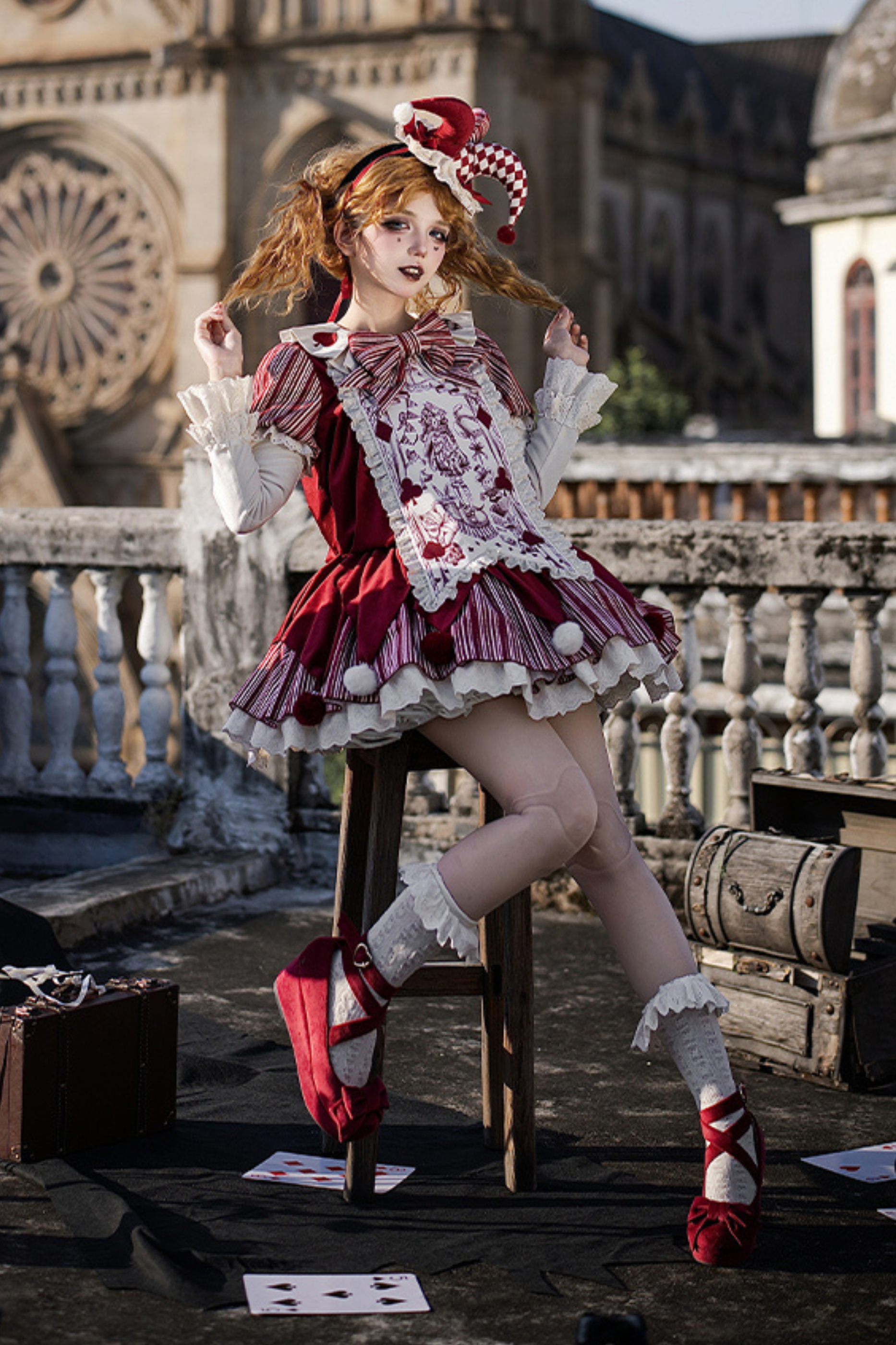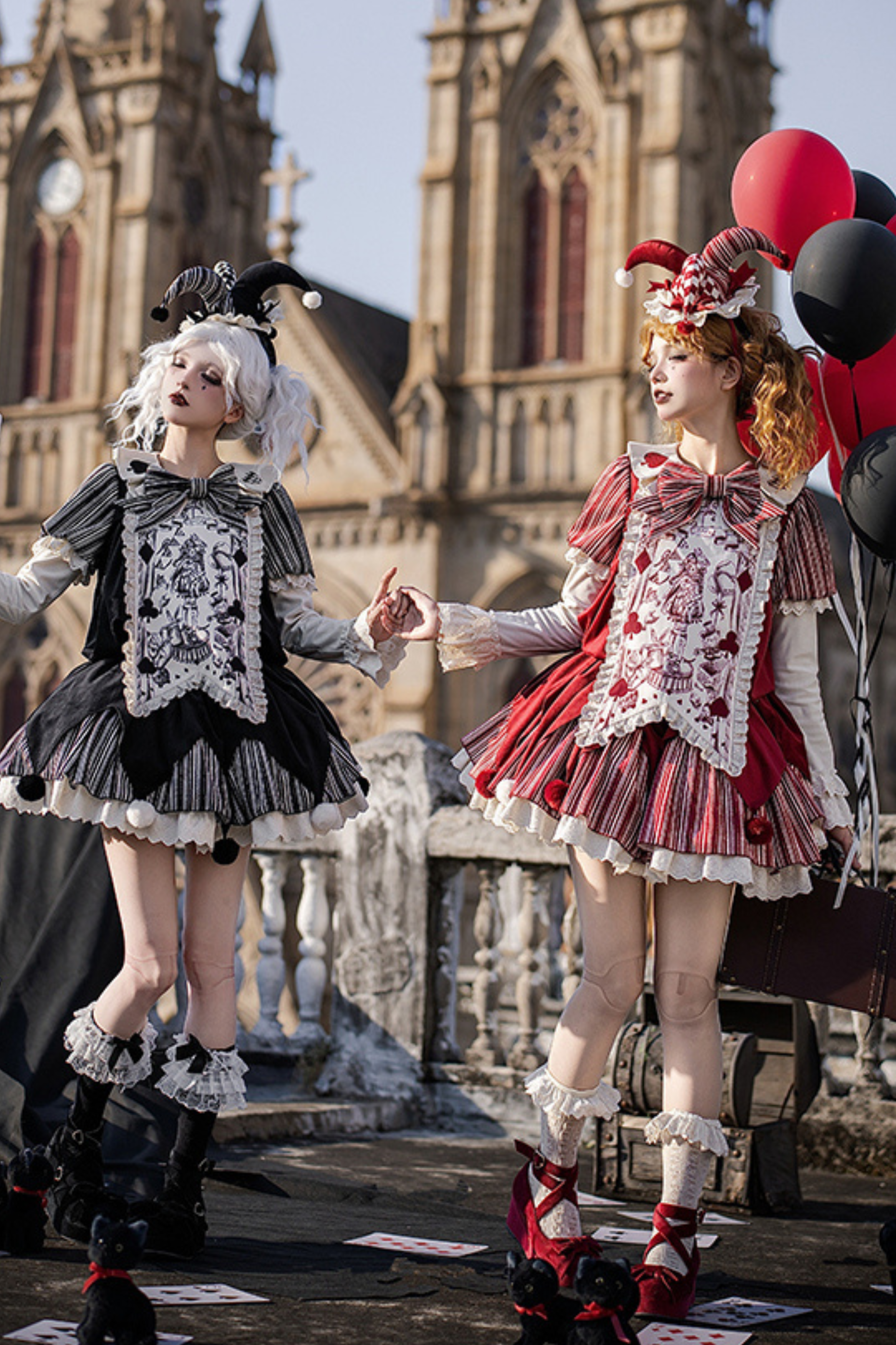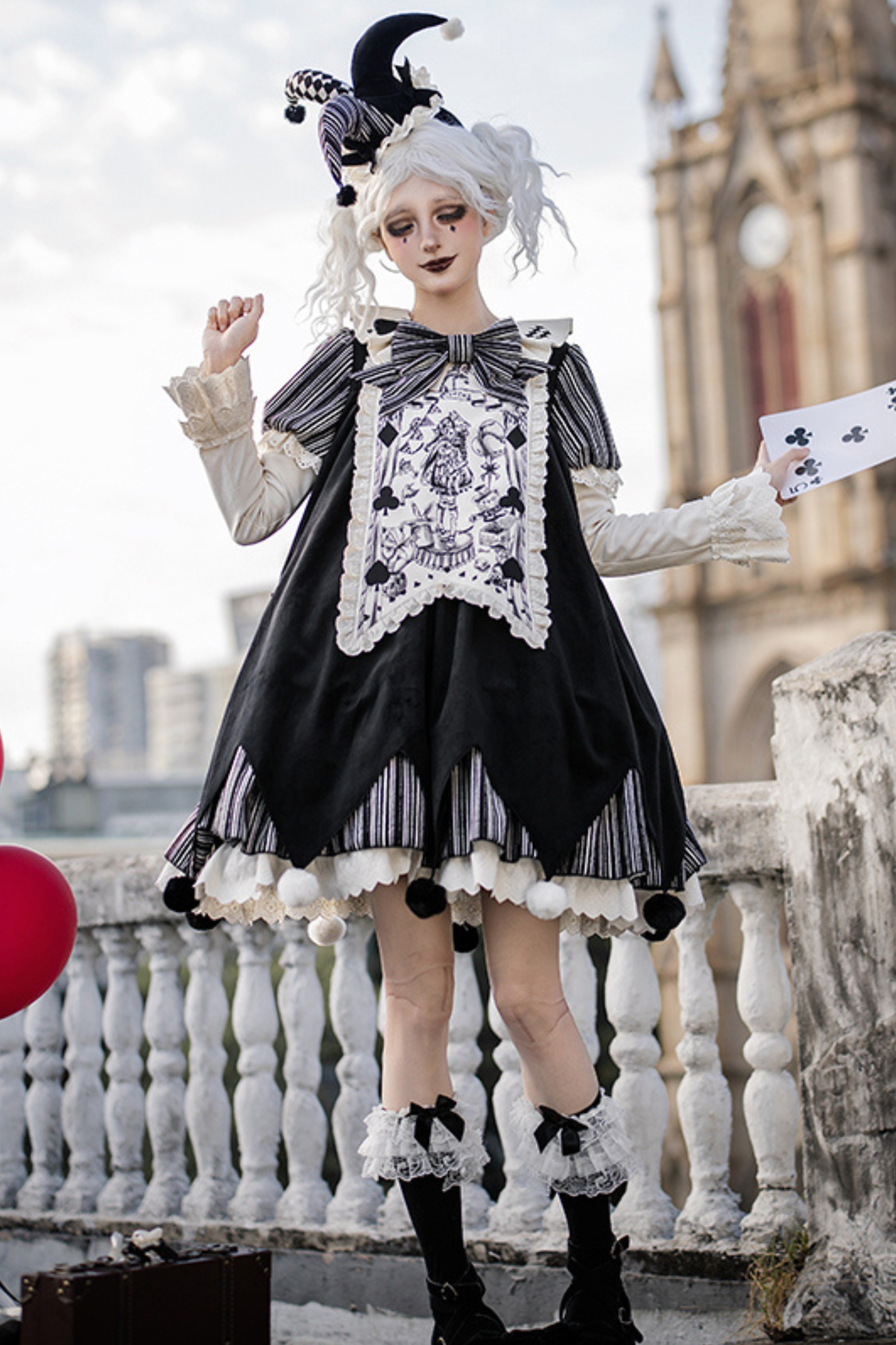 ドールサーカスピエロロリータドレス+カチューシャ+ベルト+リボン+カチューシャ+バッフル