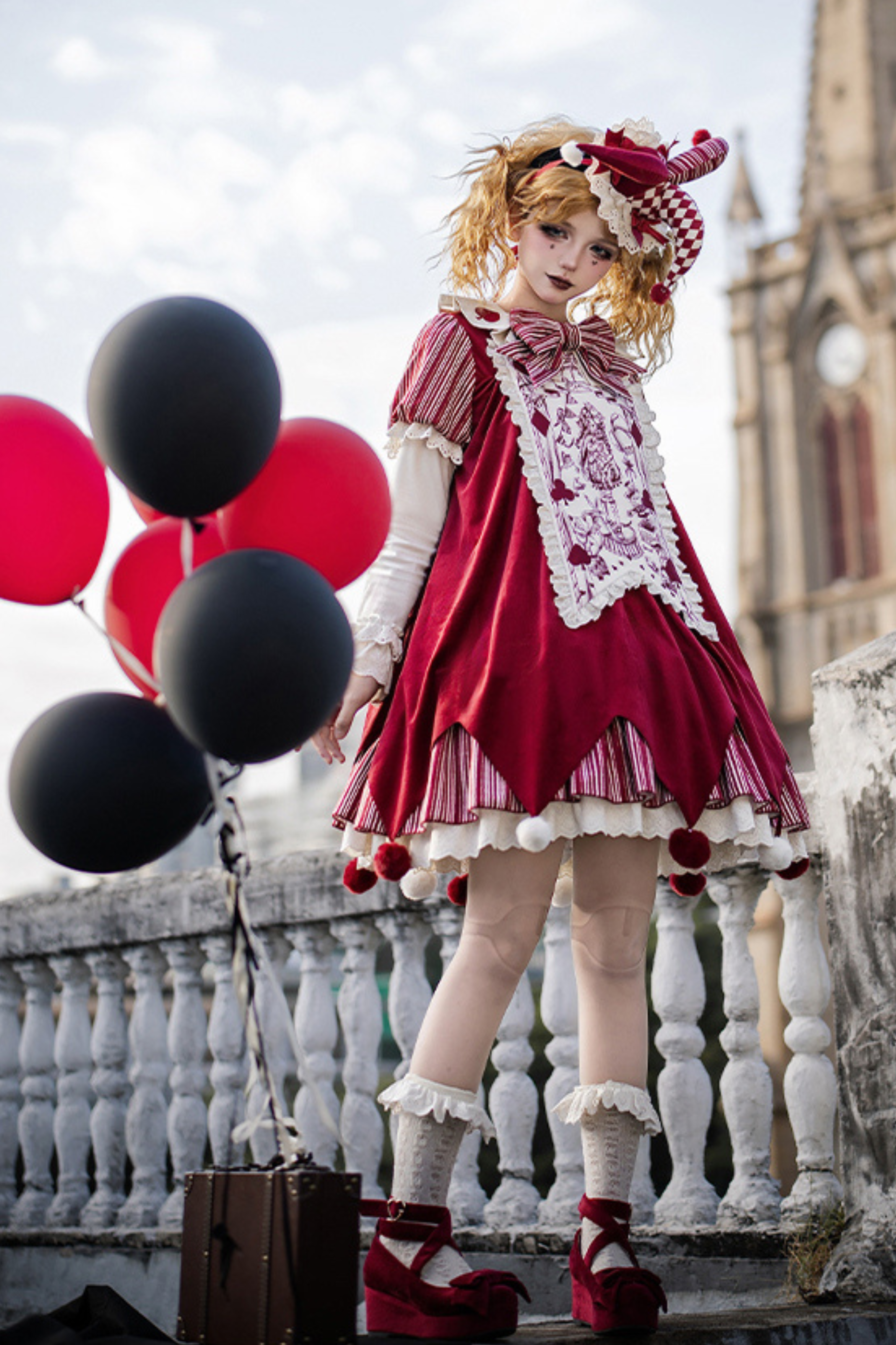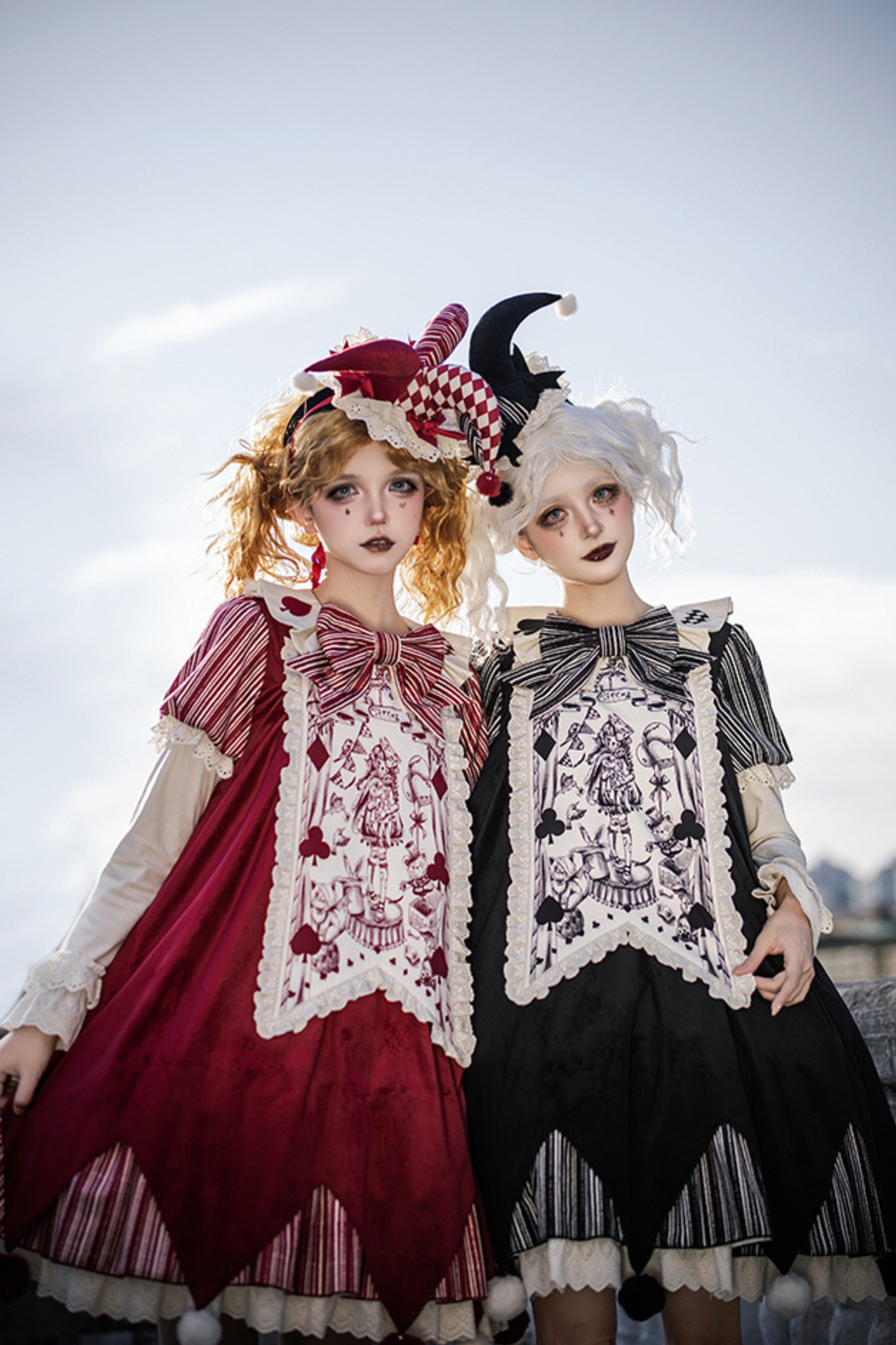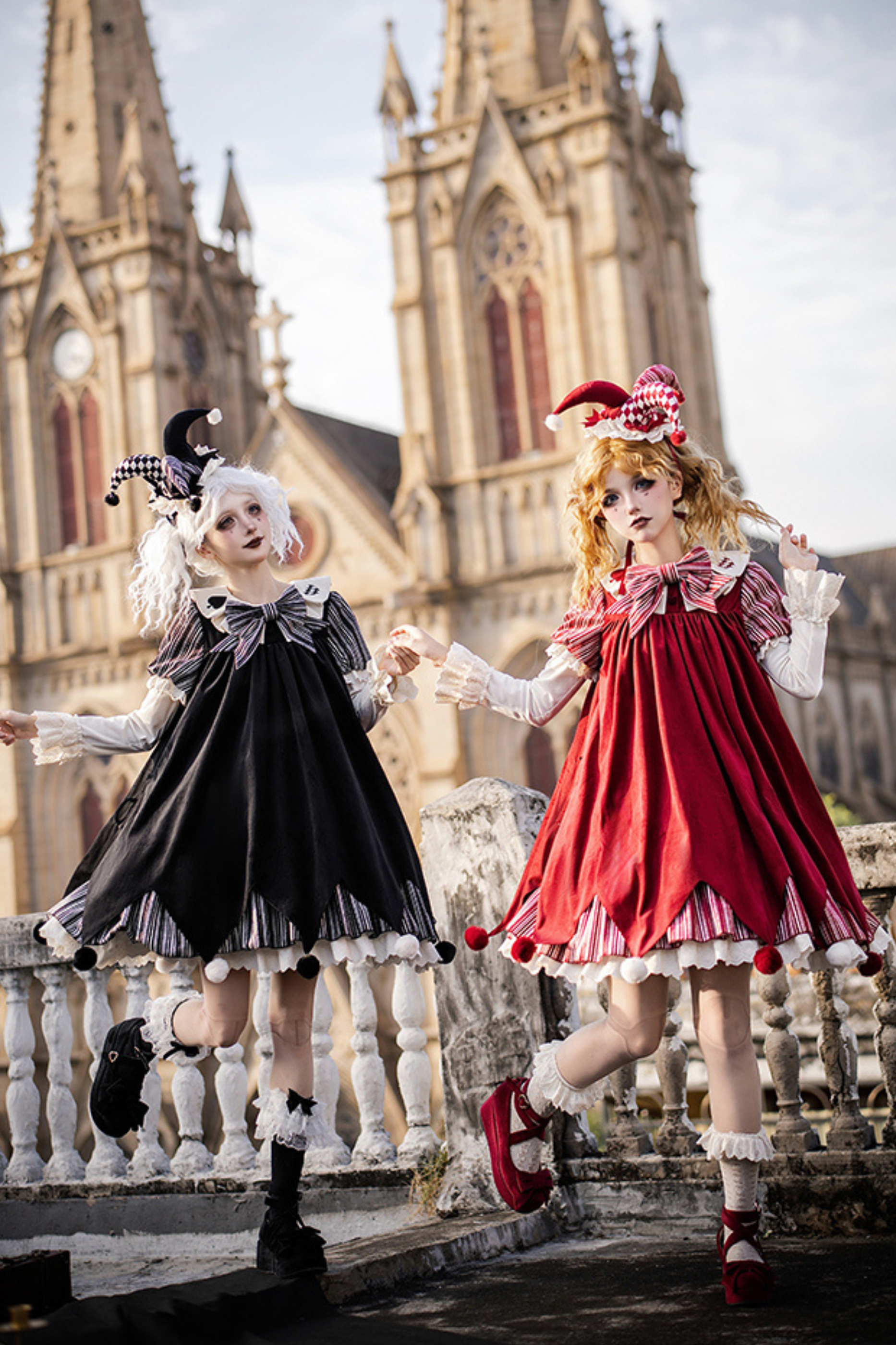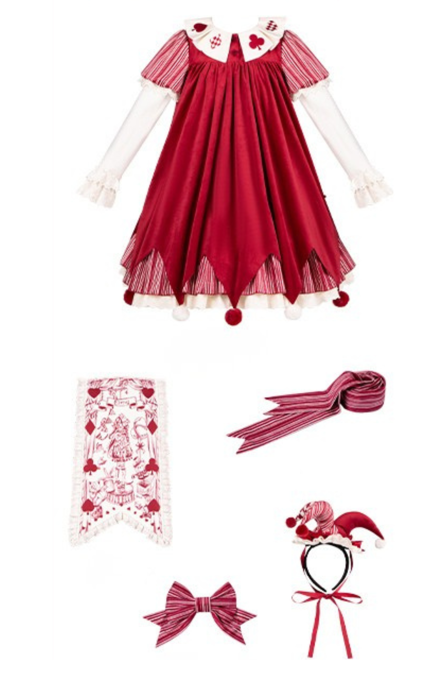 ドールサーカスピエロロリータドレス+カチューシャ+ベルト+リボン+カチューシャ+バッフル