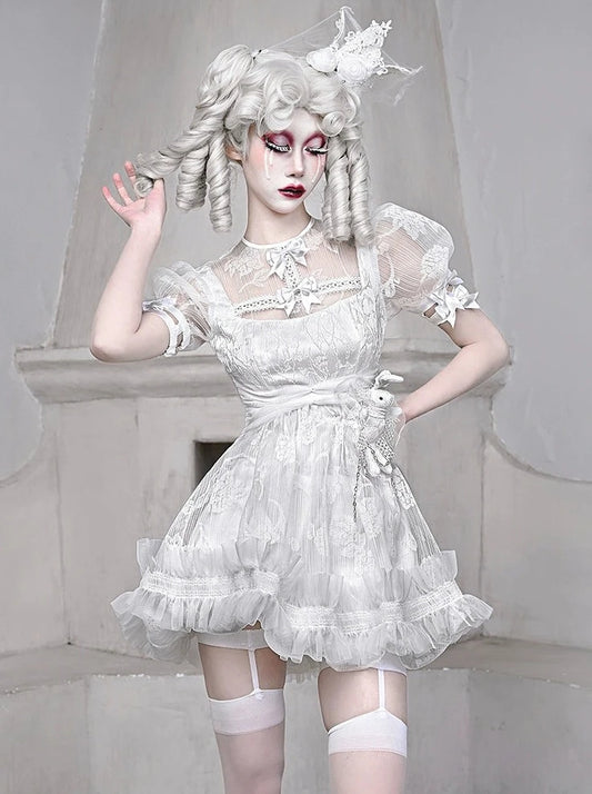 Blood Supply Original ◆ Sleeping Iris 白色哥特暗色雪纺网纱蓬蓬袖连衣裙夏装