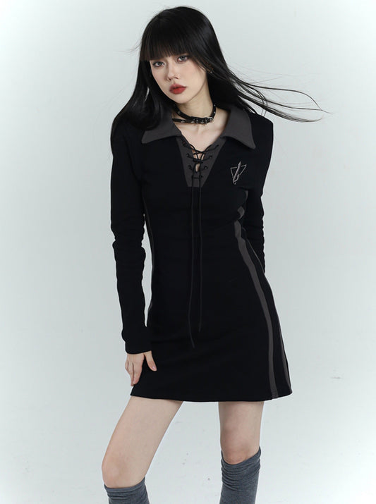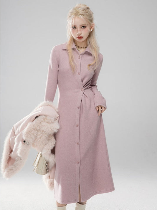 银粉色纯色 Dzire 修身翻领长款针织连衣裙