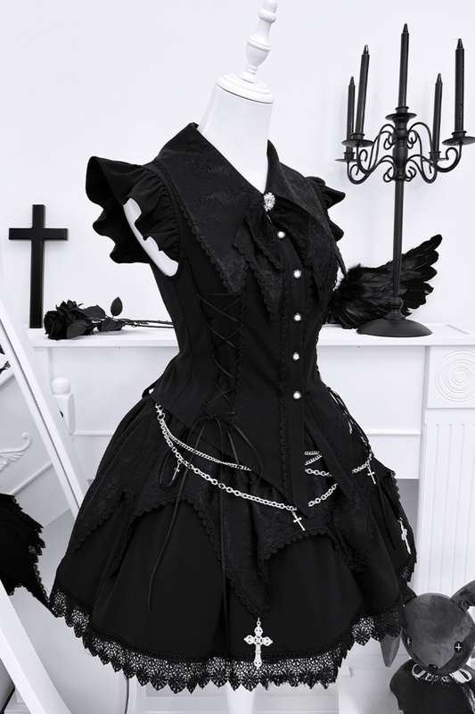 ダークゴシックサブカルチャーストラップセットアップ+リボン+チェーン