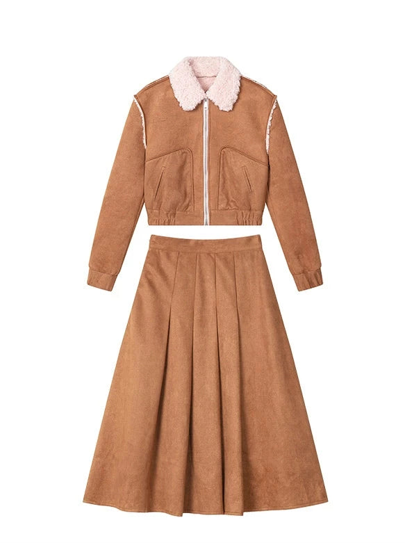 焦糖色珍妮套装羊羔毛短外套+裙子套装