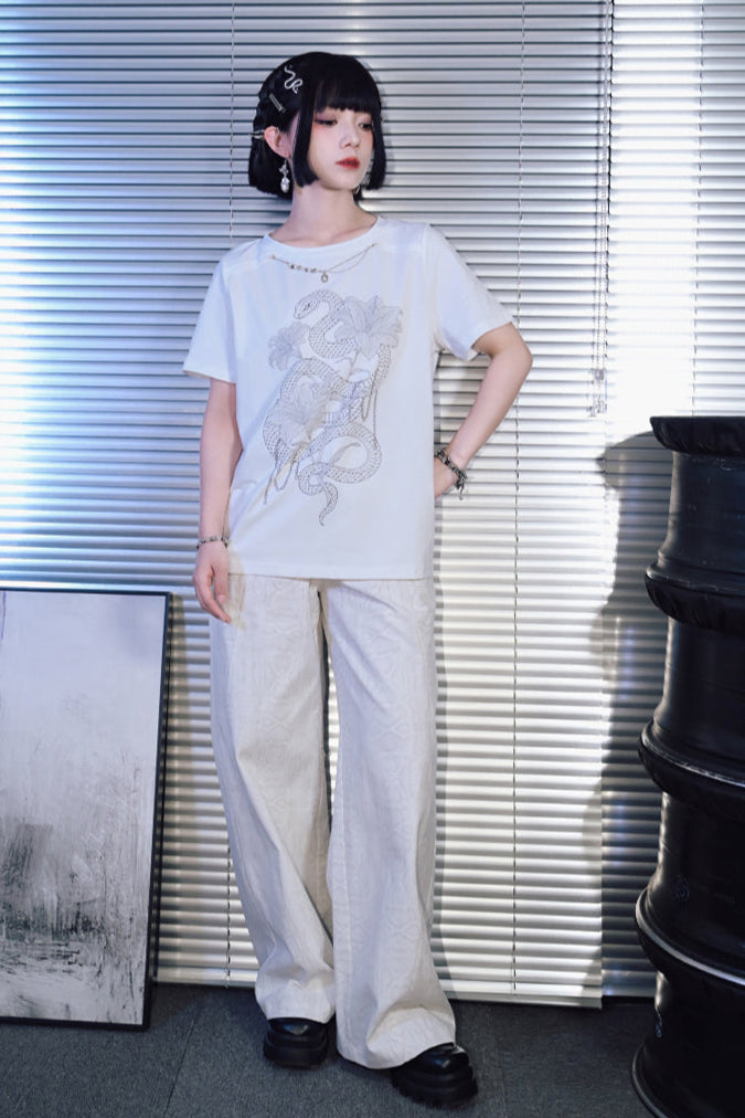 ❤チャイナデザインチェーンホワイトプリントTシャツ❤