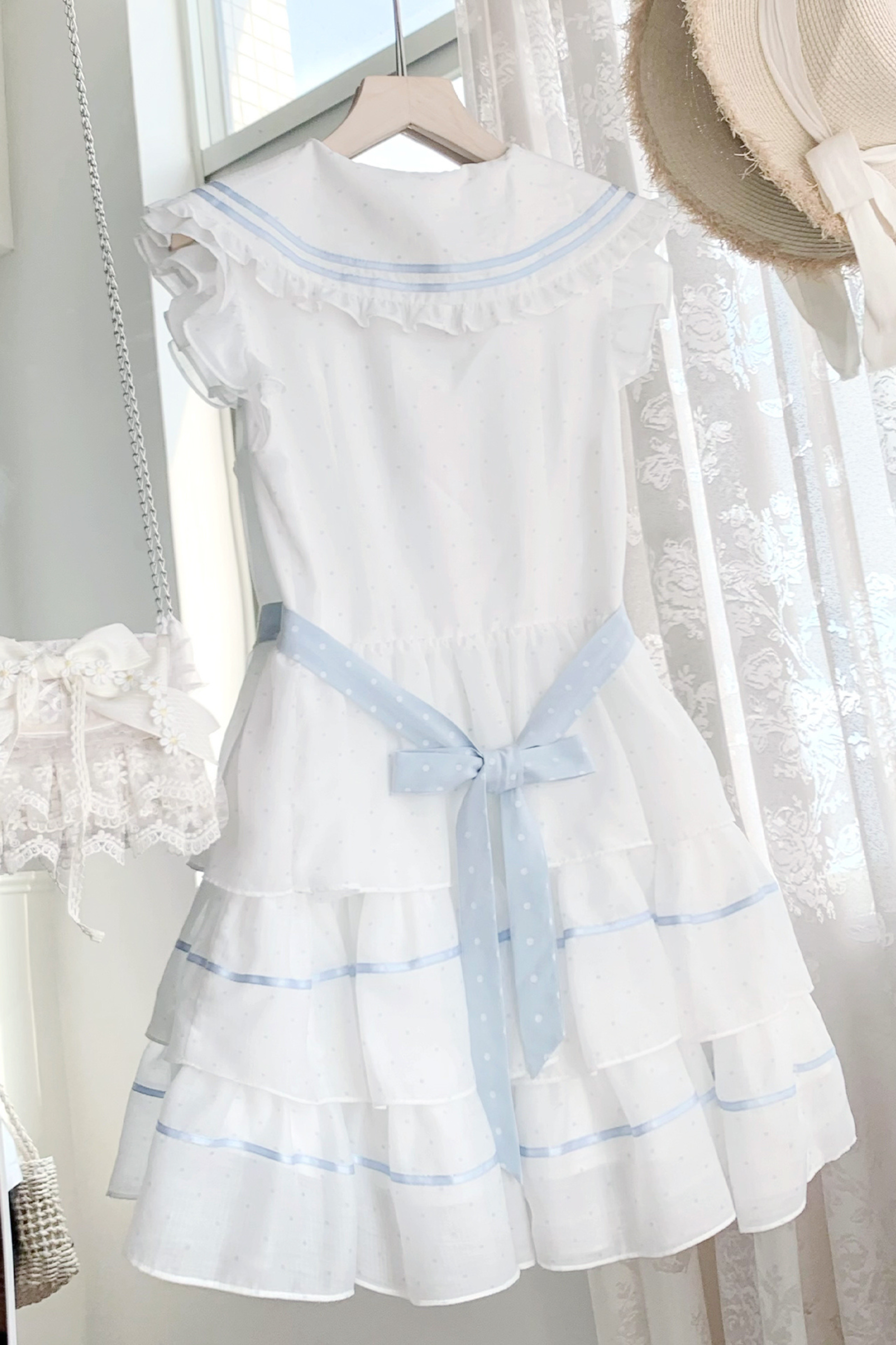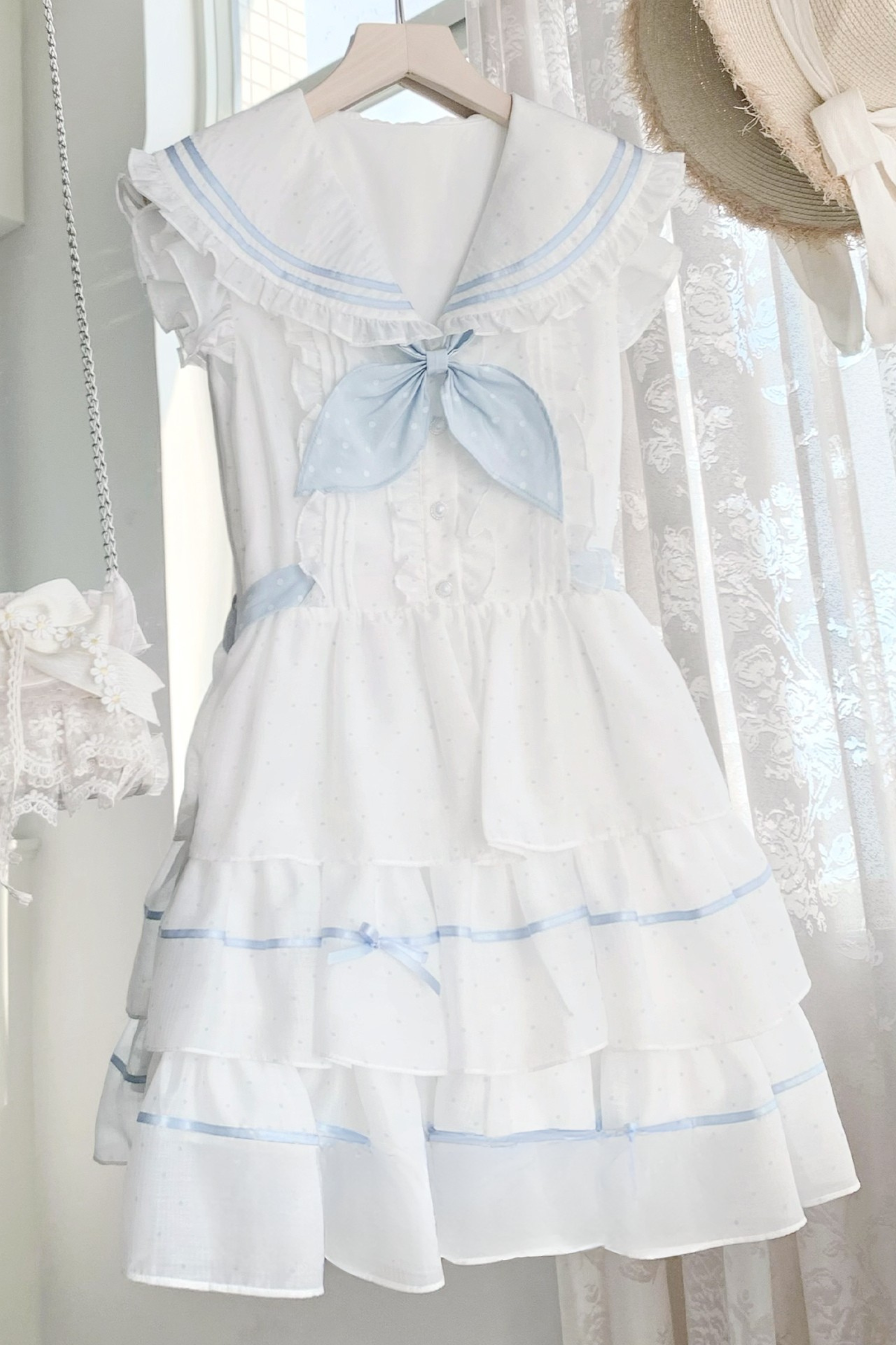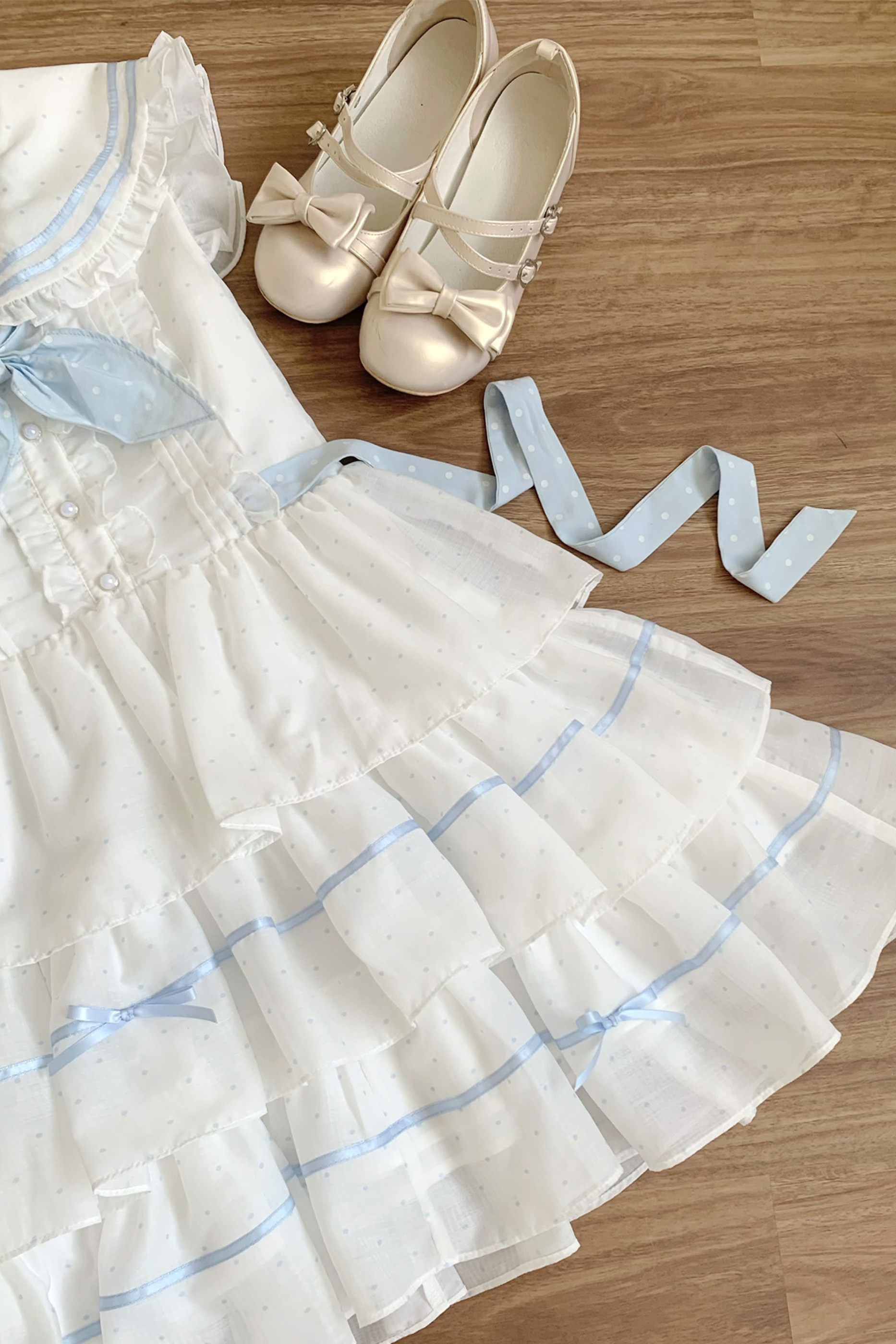 ドットノースリーブリボンセーラーワンピース