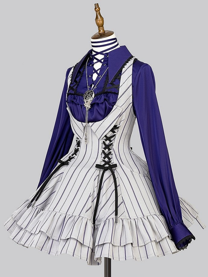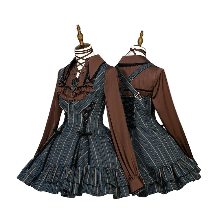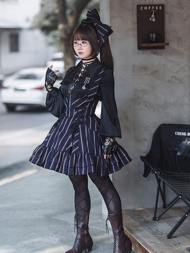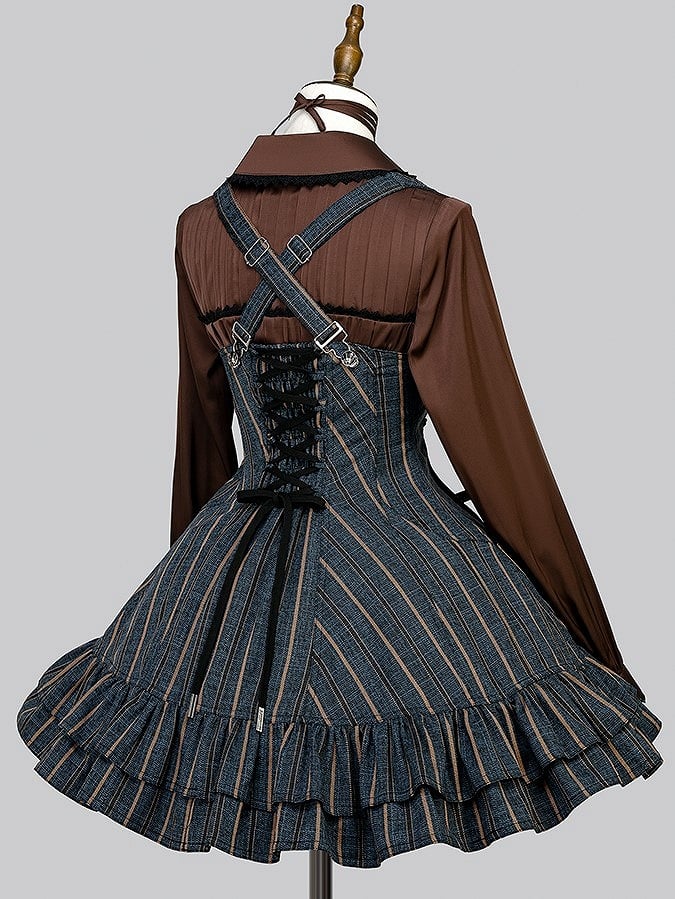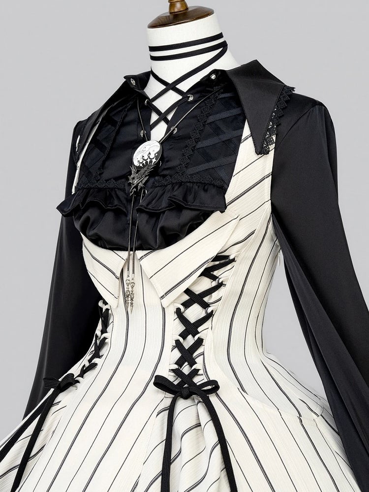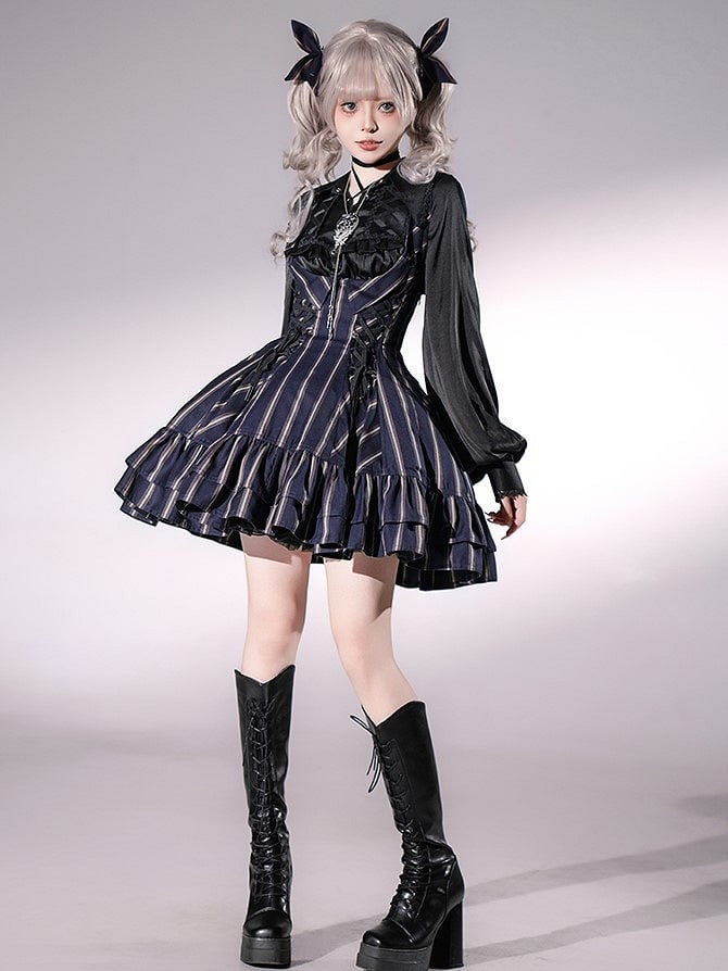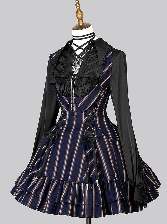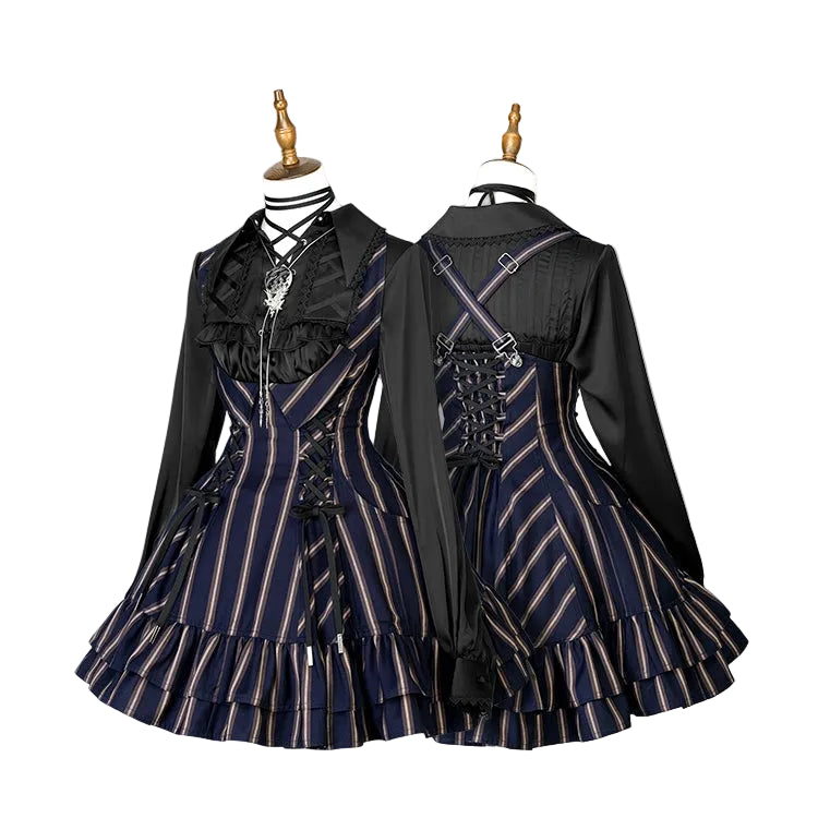 【12月29日予約締切】ゴシックロリータストライプバッククロスフリルサスドレス