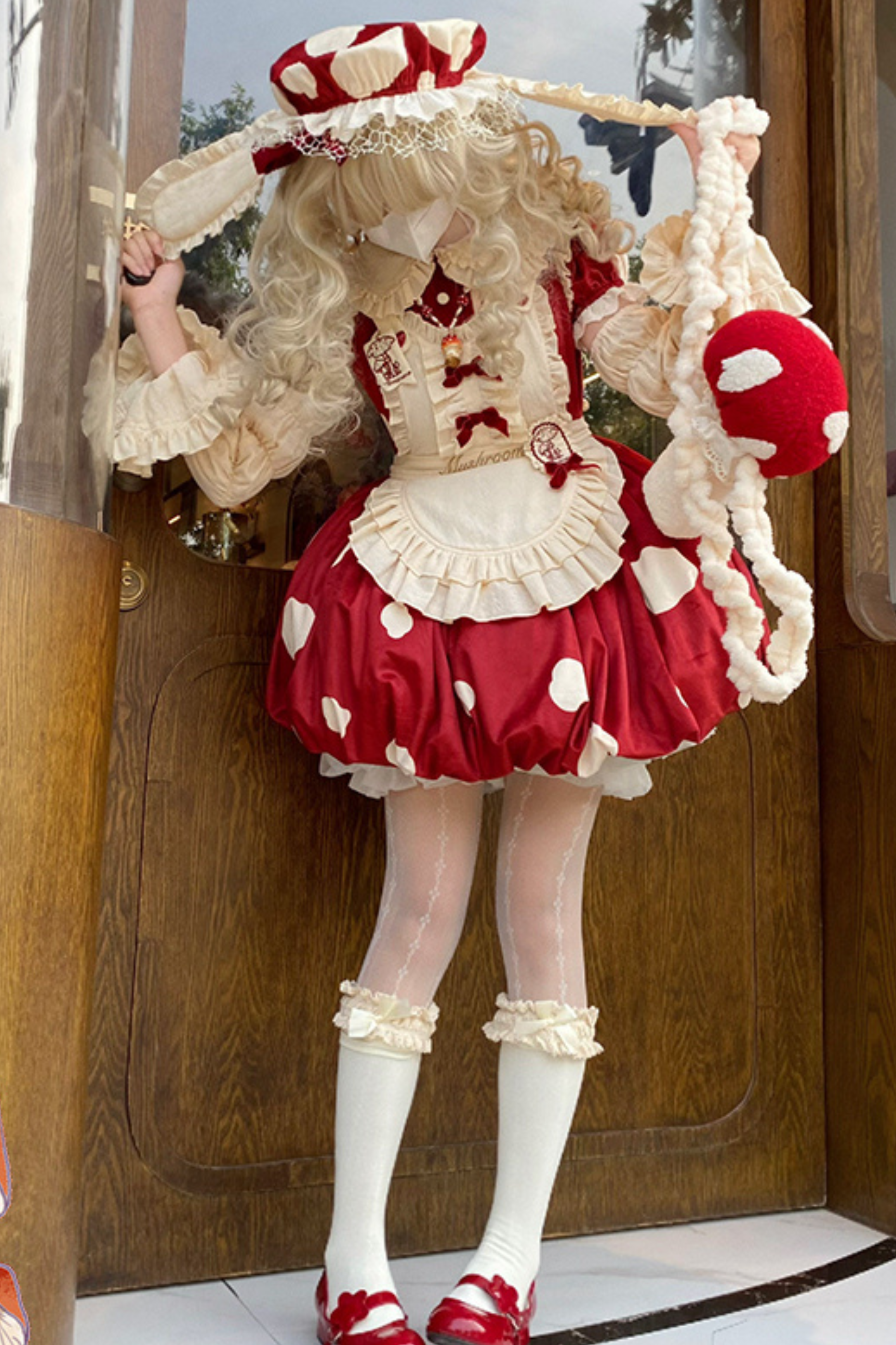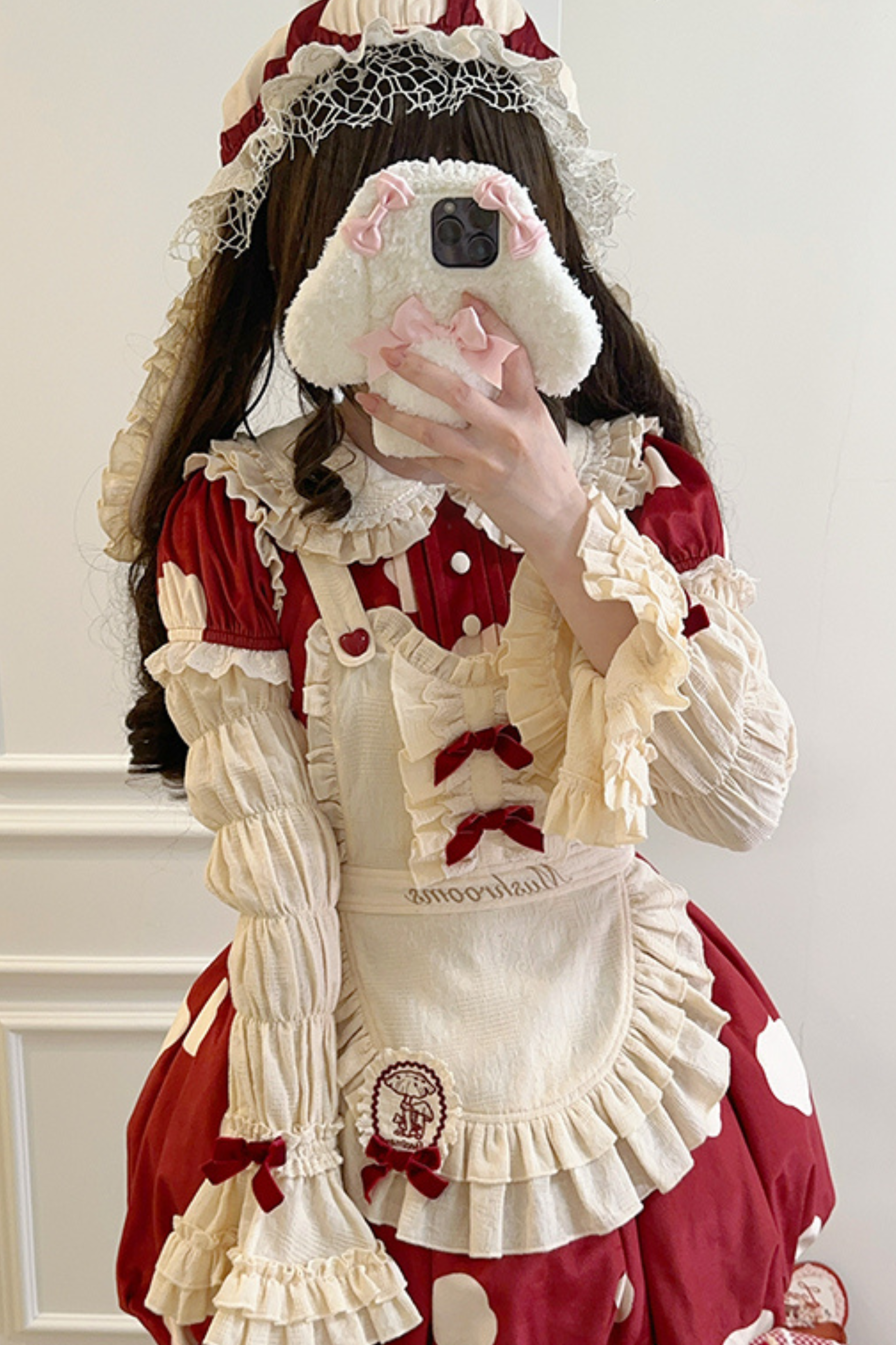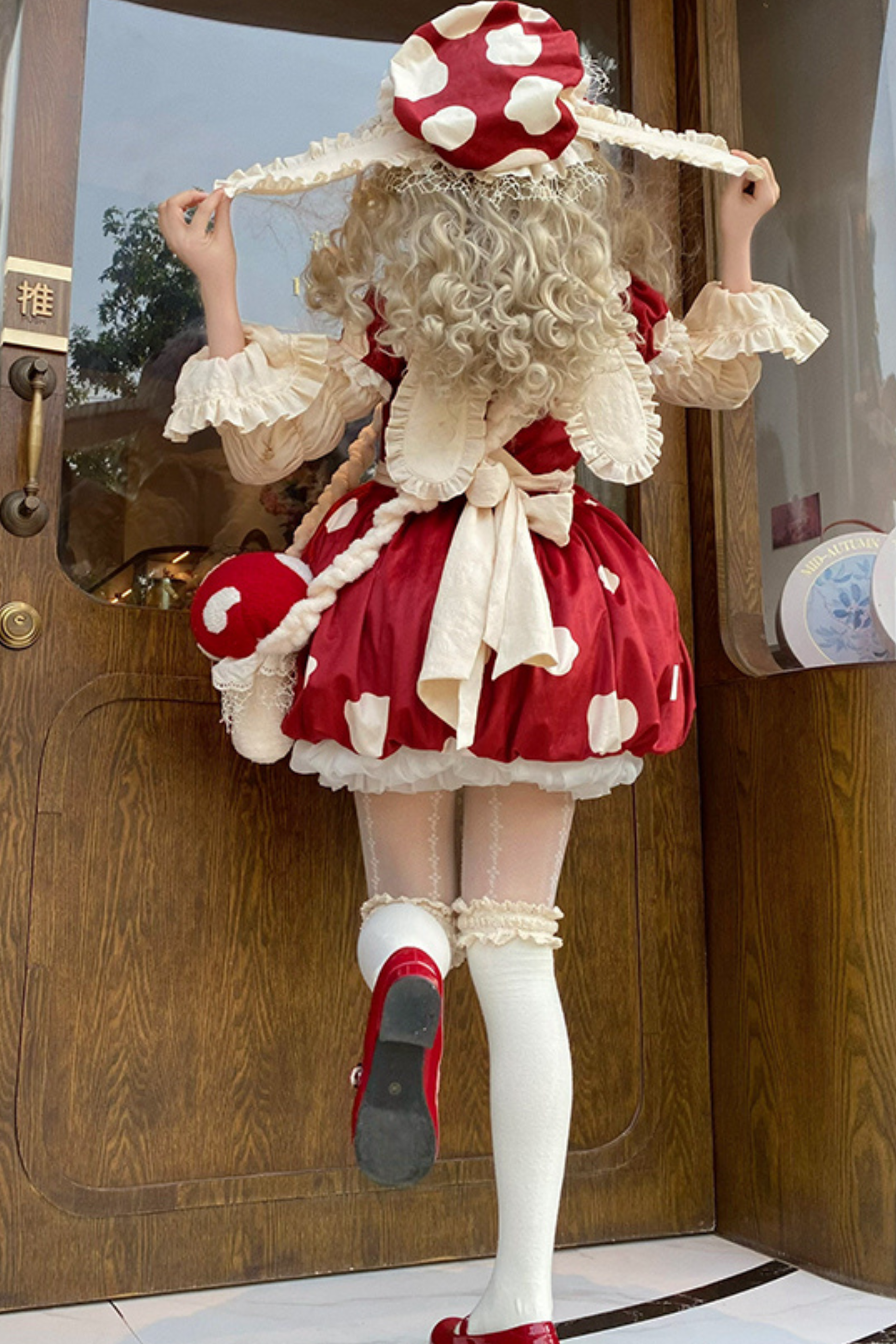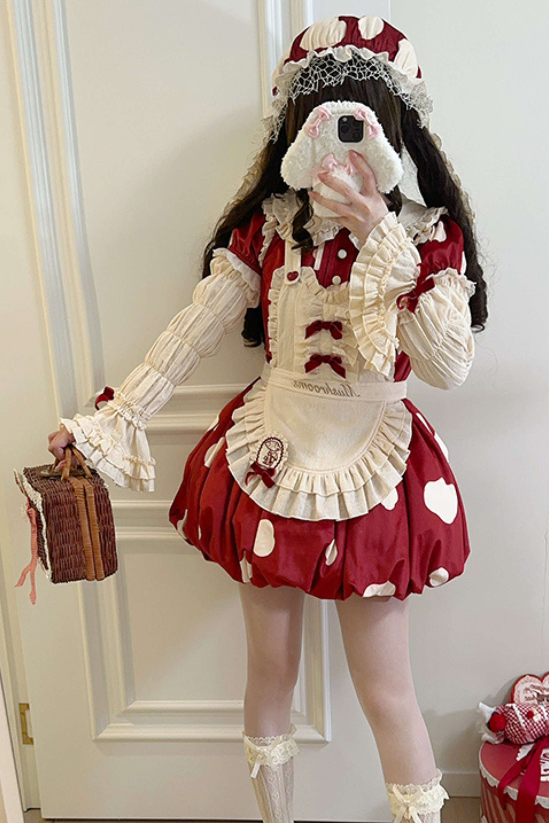 キノコドールワンピース+リボンフリルエプロン+フリルスリーブ+うさ耳ハット