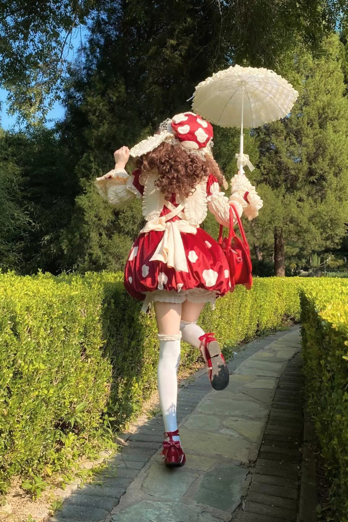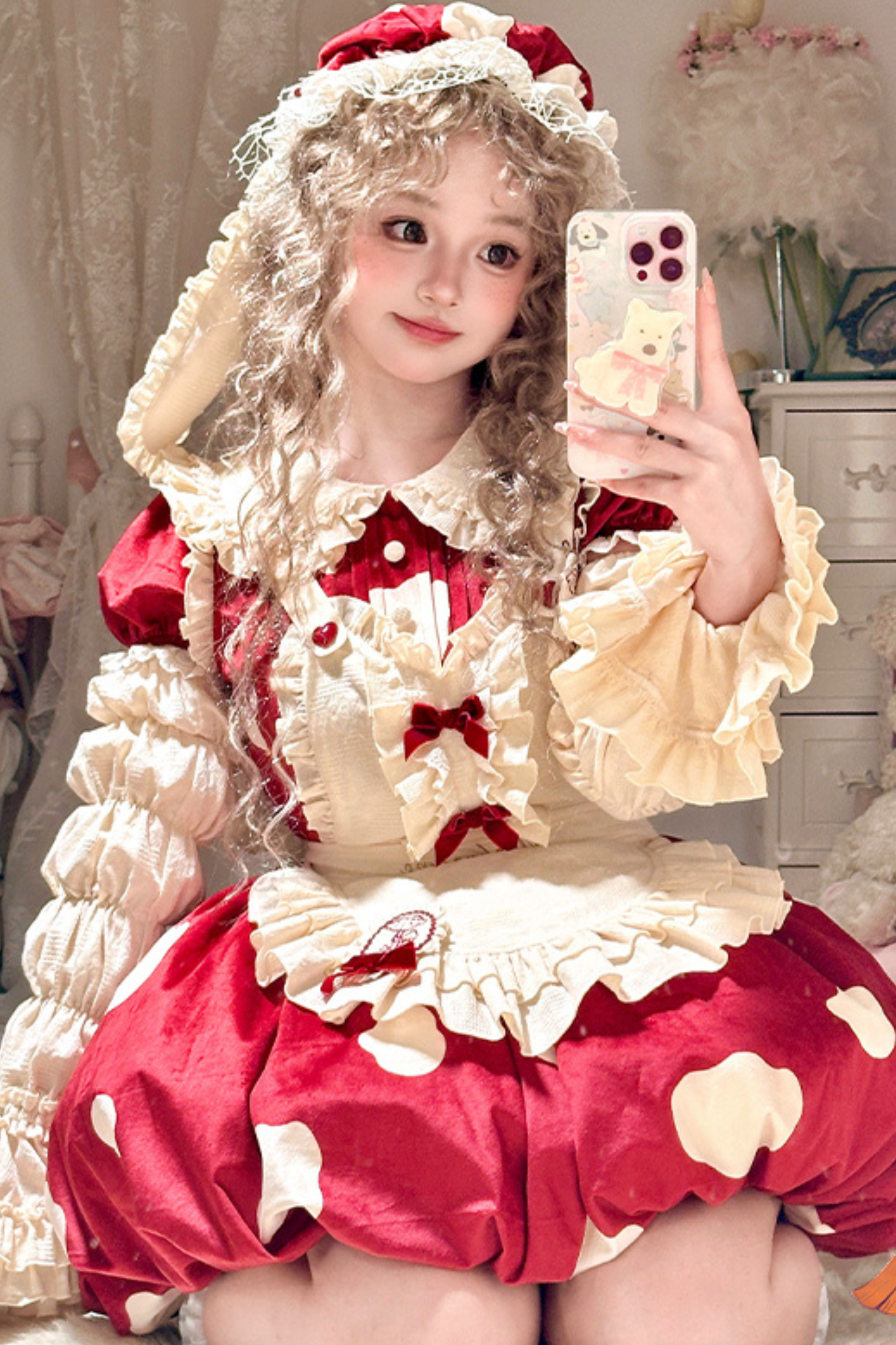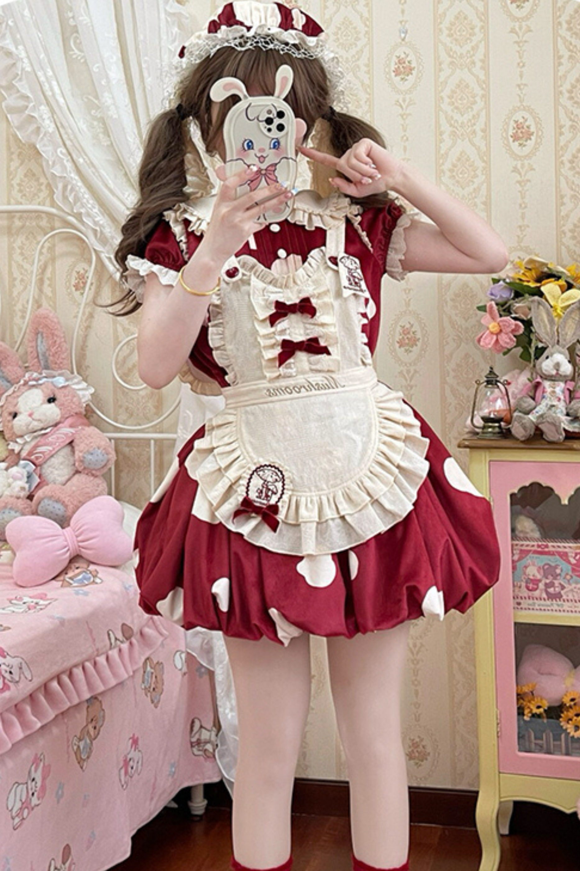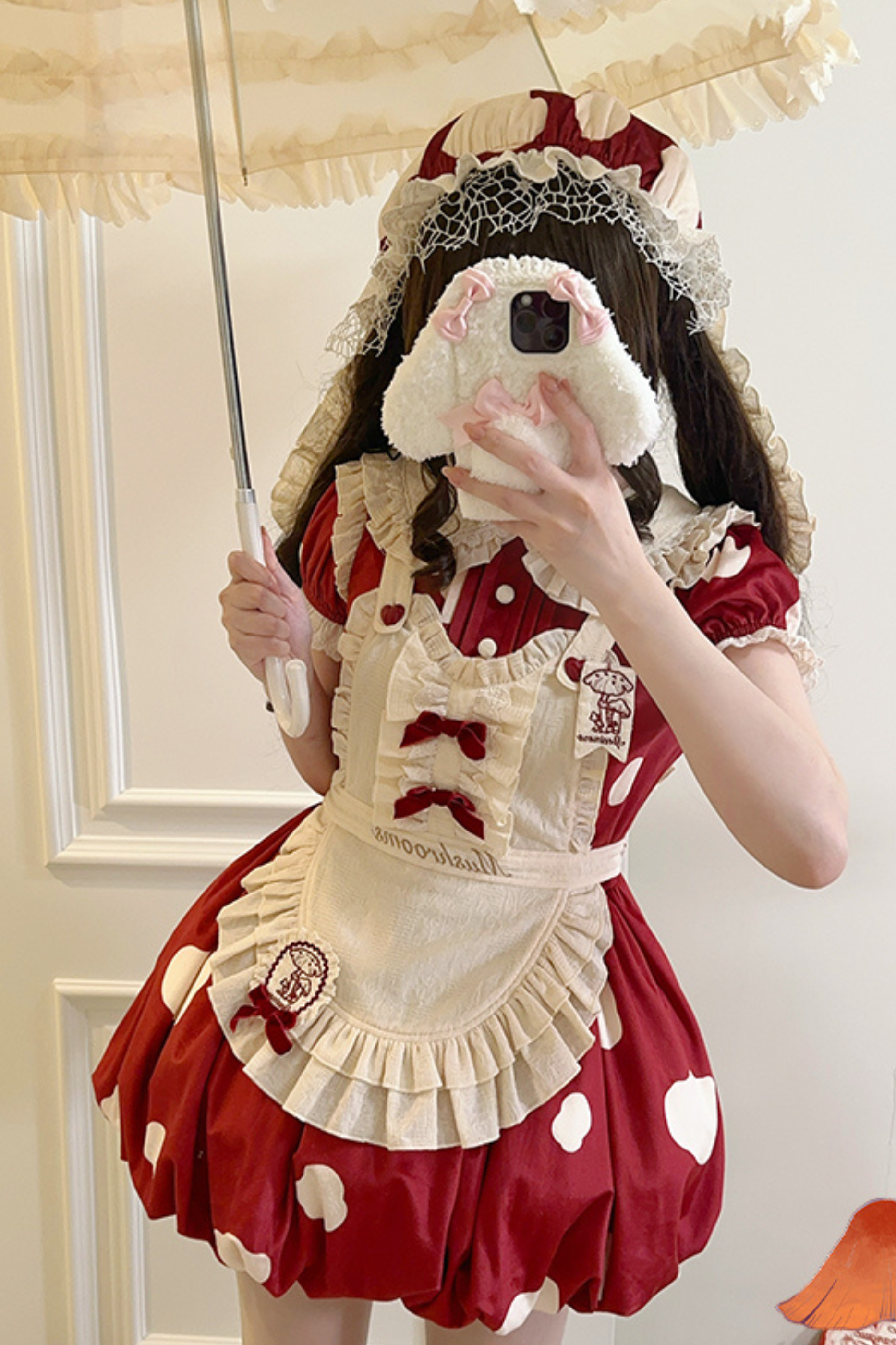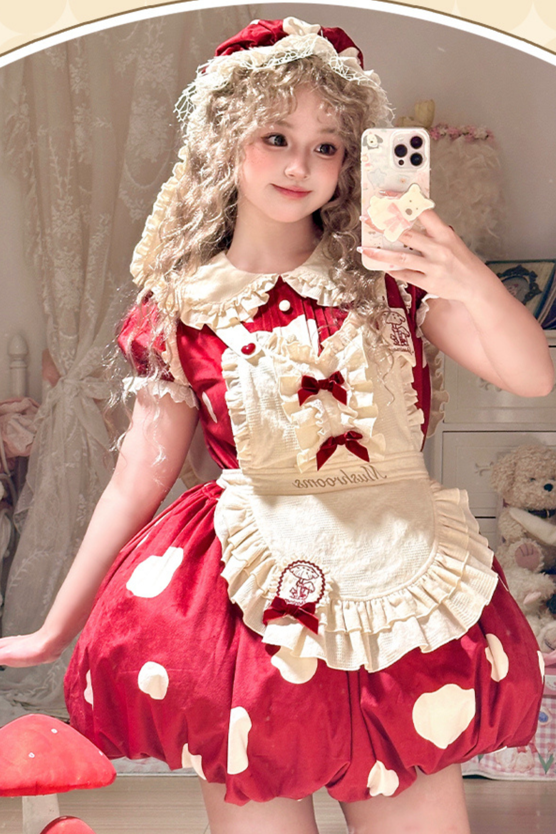 キノコドールワンピース+リボンフリルエプロン+フリルスリーブ+うさ耳ハット