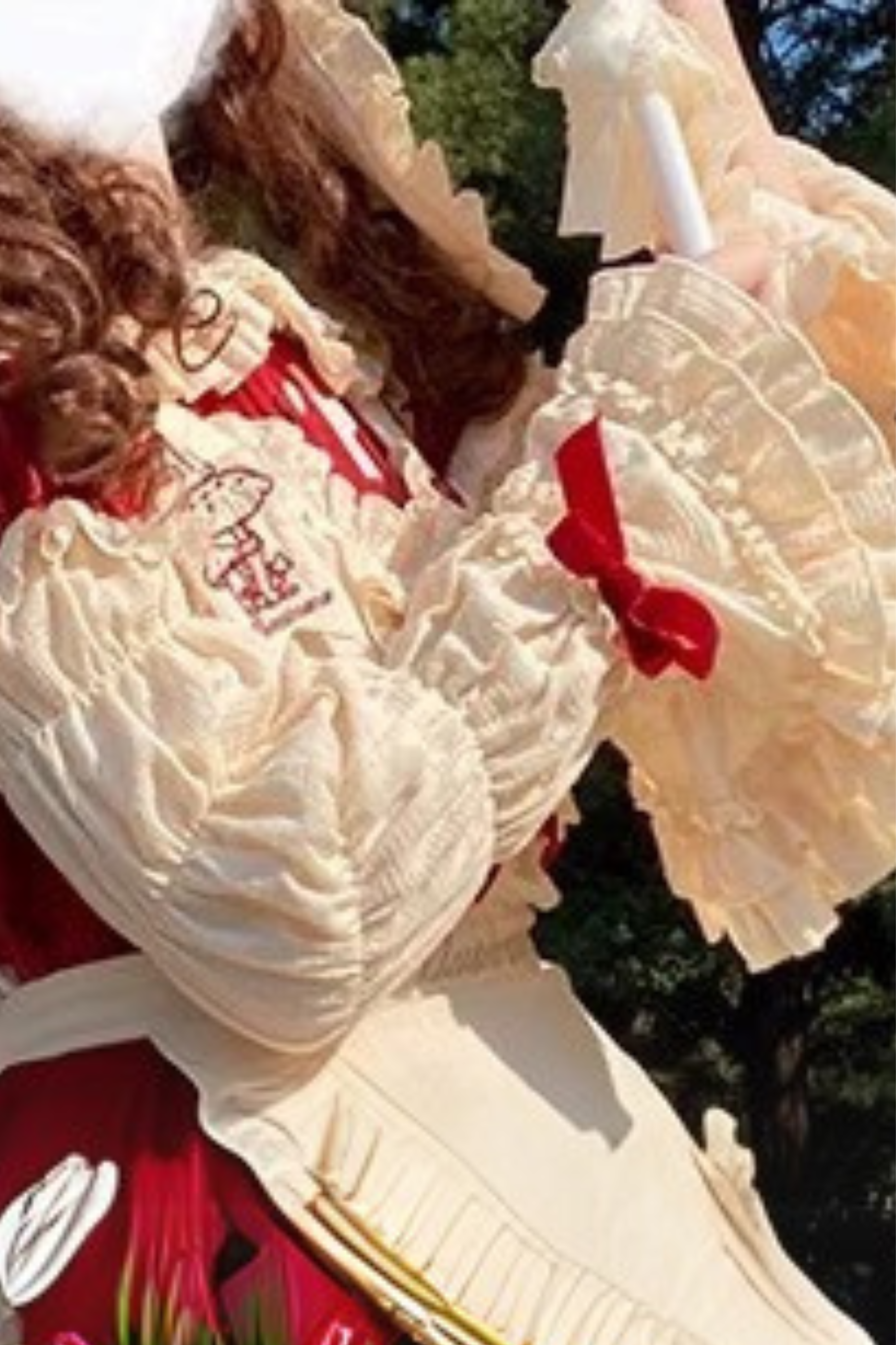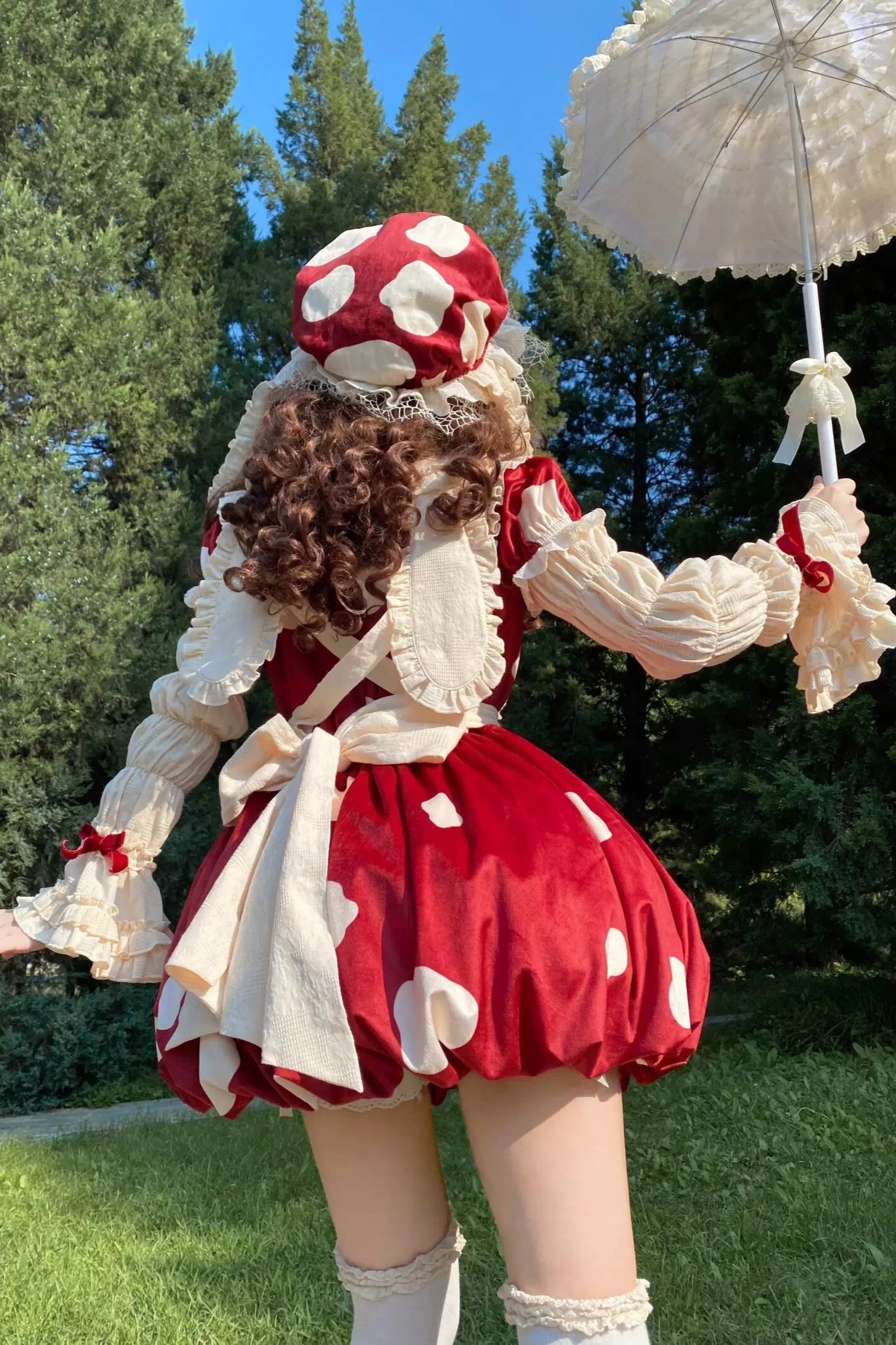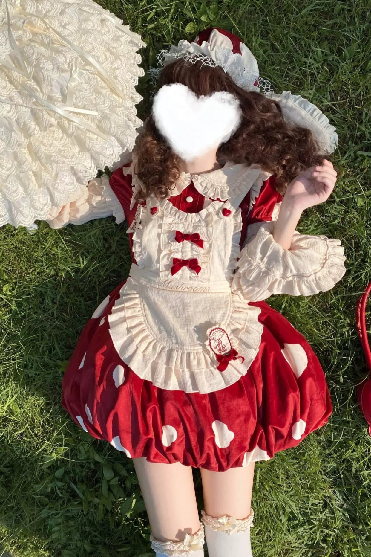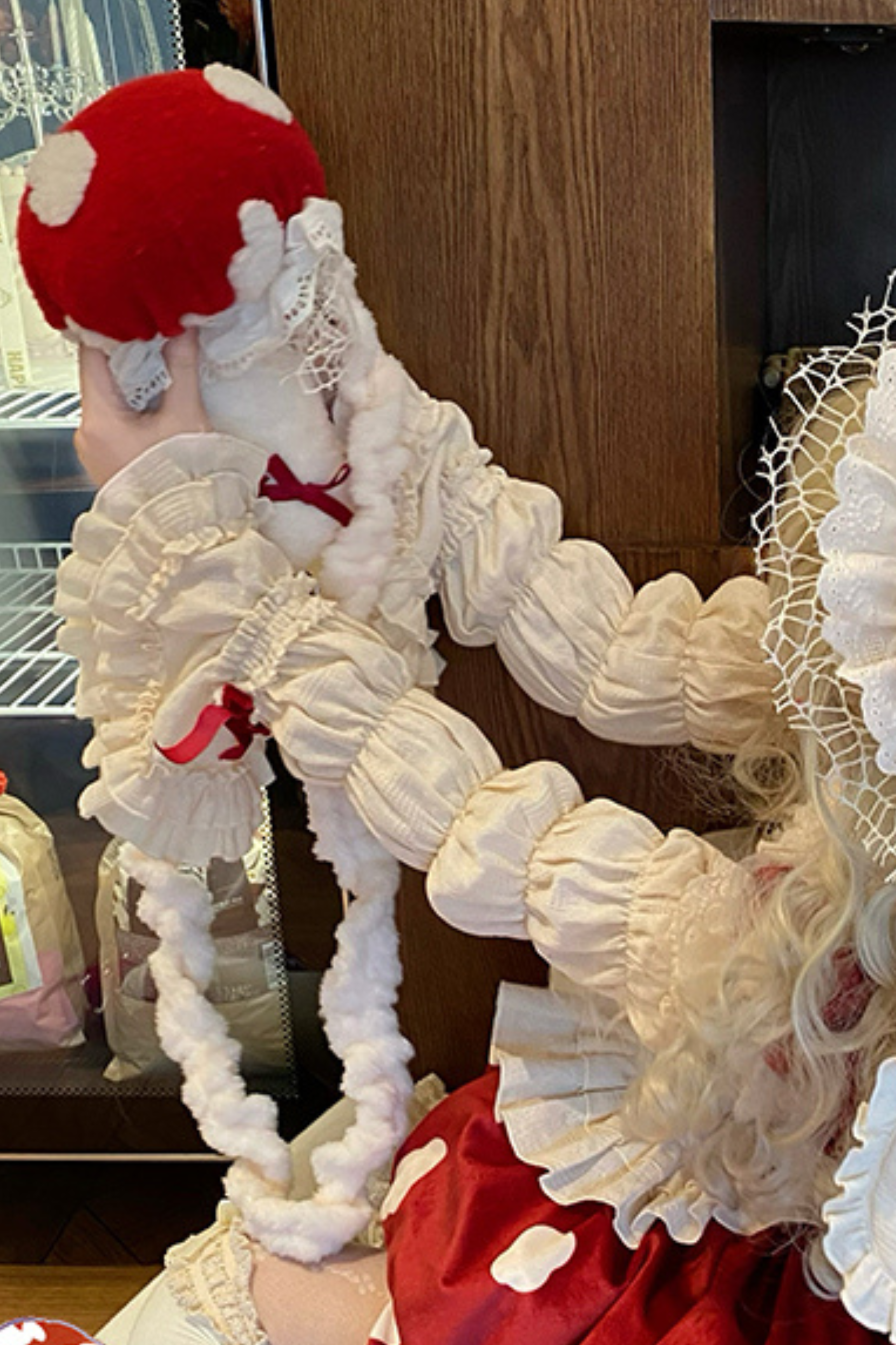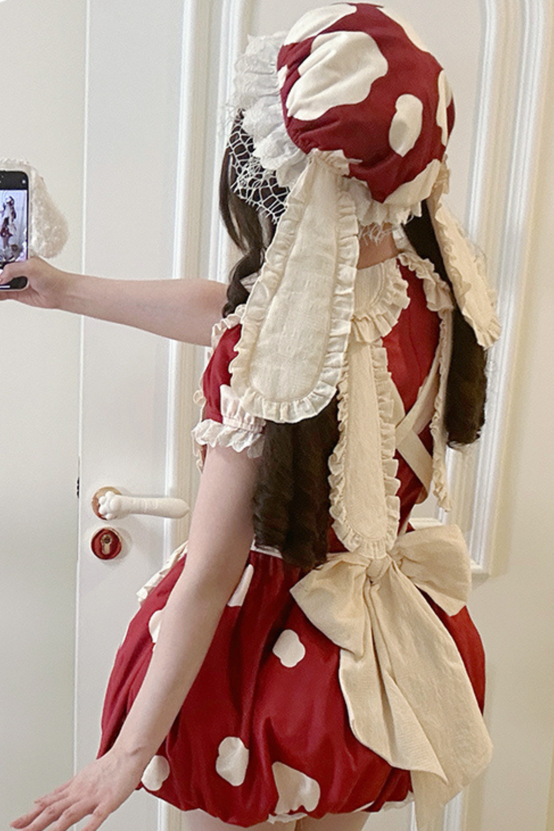 ❤︎キノコドールワンピース+リボンフリルエプロン+フリルスリーブ+うさ耳ハット❤︎