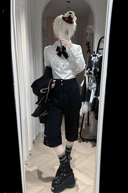 【5月8日予約締切】ヴィンテージホワイトレースラッフルハイカラープリンスシャツ+ブラックテーラードバミューダパンツ